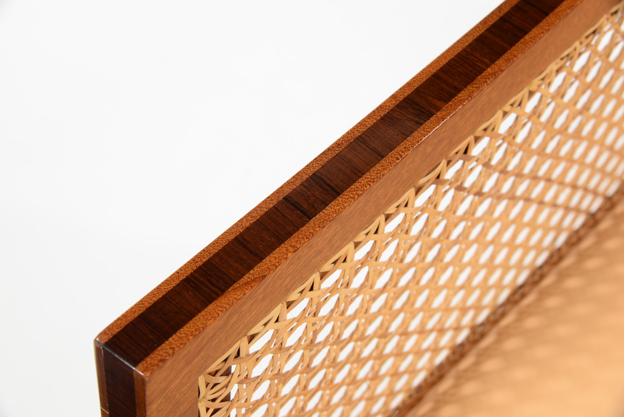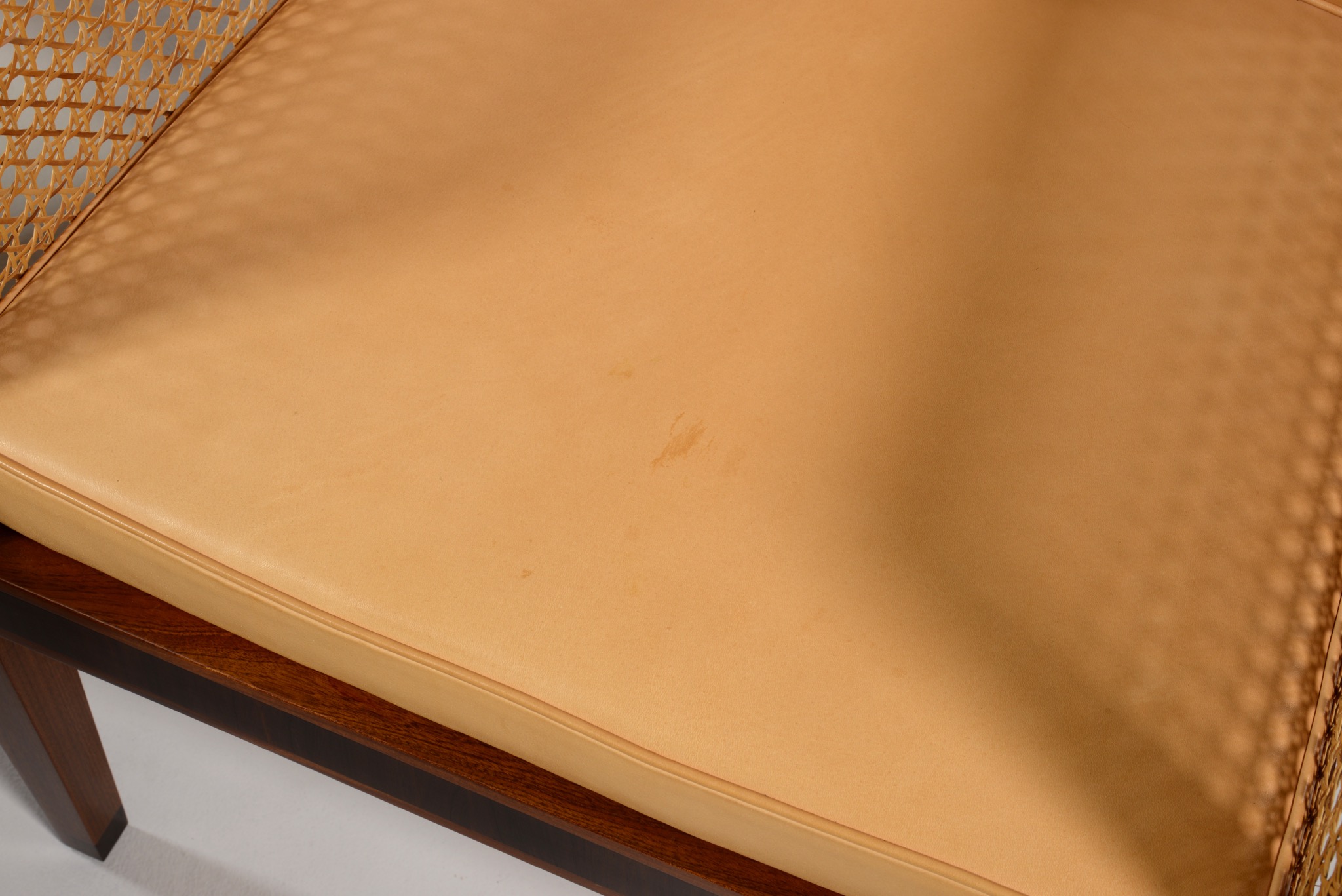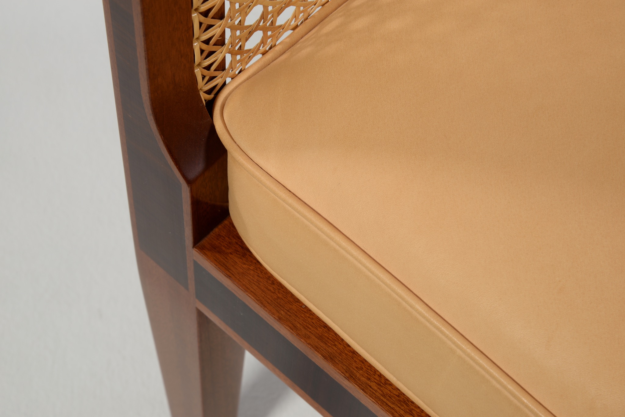 「デンマーク近代家具デザインの父」と称される、デザイナーでプロフェッサーを務めた、Kaare Klint/コーア・クリントによる "イングリッシュチェア/ベルジュールチェア” 一対です。1932年にデザインされたモデルで、18世紀英国のシェラトン様式にこのルーツが見られます。こちらはルド・ラスムッセン工房によって2015年に作られたもので、同工房最終期のプロダクトとなります。現在、ルド・ラスムッセン工房はカール・ハンセン&サン社によって併合されました。マホガニーのフレームにはアクセントとしてローズウッド材が象眼されています。上質なヌメ皮革を用いたクッションが備わり、手編みによる籐張りにて座る人の体重を支えます。ヌメ皮革は多少使われていますが、さらに使い込む事で深い色合いを増すでしょう。こちらは一対での販売となります。
