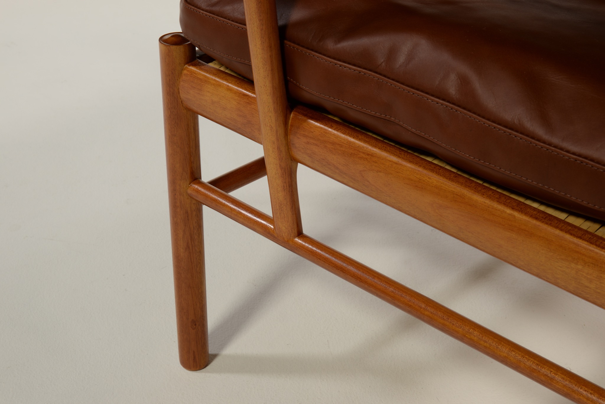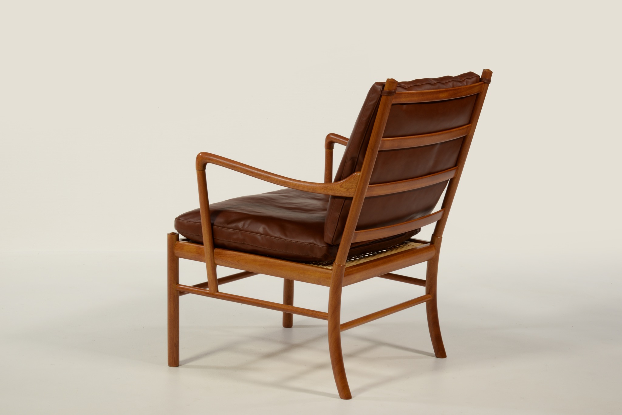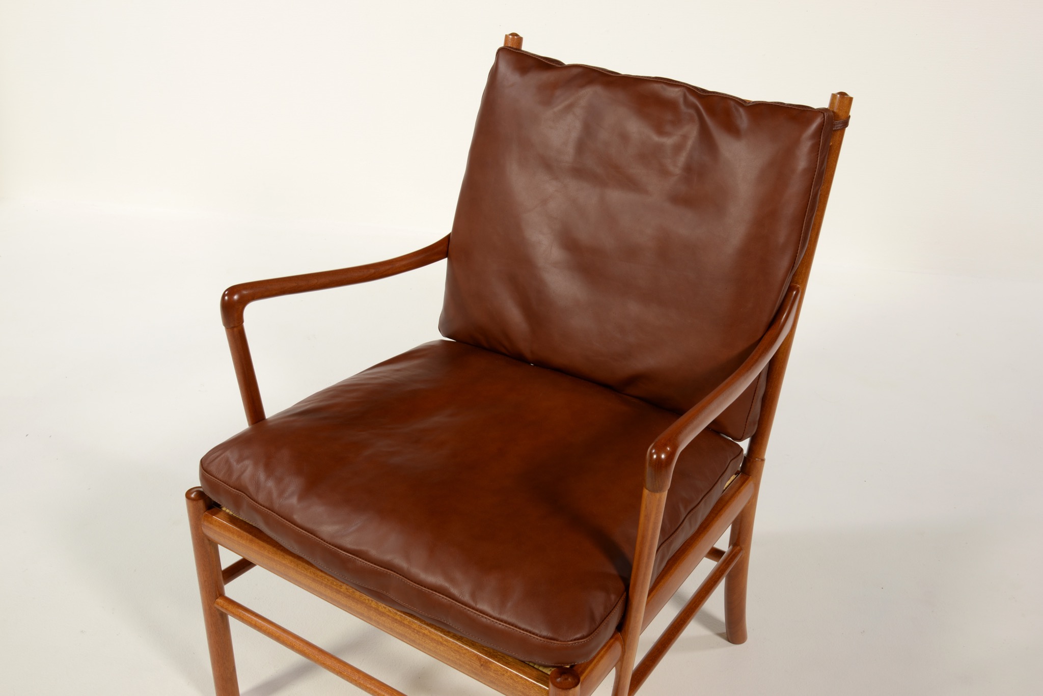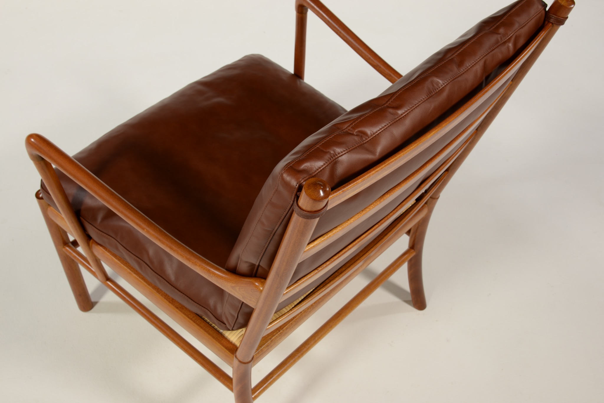 デンマークの家具デザイナーで、王立アカデミー家具科の教授を務めたOle Wanscher/オーレ・ヴァンシャーによるコロニアルチェアです。1970年代頃に作られたものでしょう。ホンジュラス産と思しきマホガニー材を用いたタイプで、材の持つ奥ゆかしい光沢が魅力です。クッションの皮革は張り替え、内部の緩衝材も羽毛で作り替えました。クッションの形状は座っていくうちに馴染むでしょう。座面下の籐張りに傷みが見られたため、部分的な補修を施しました。