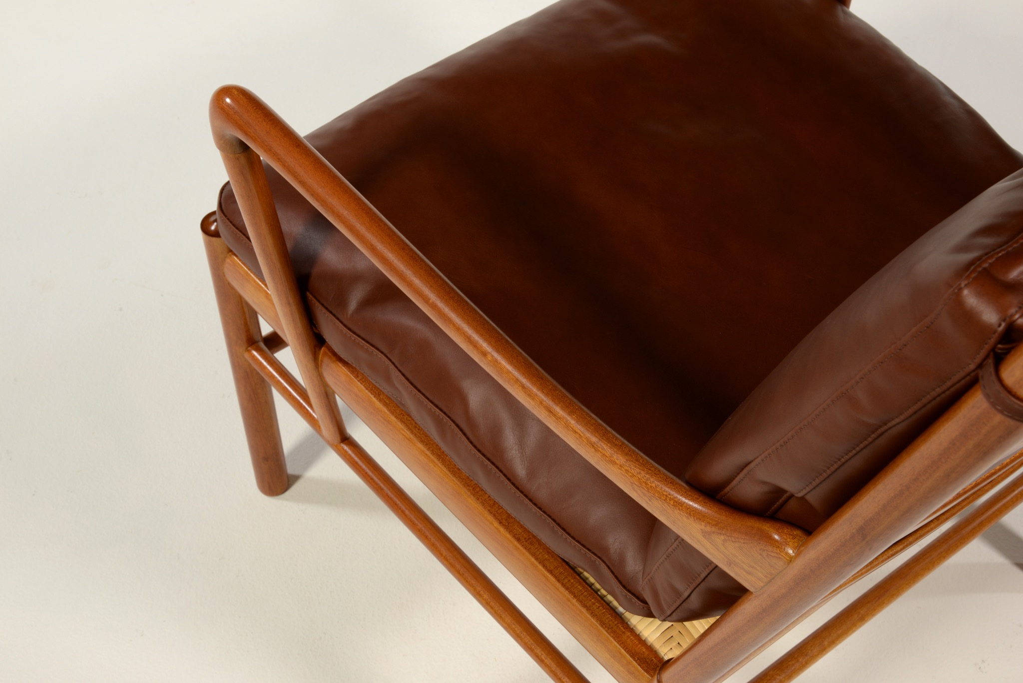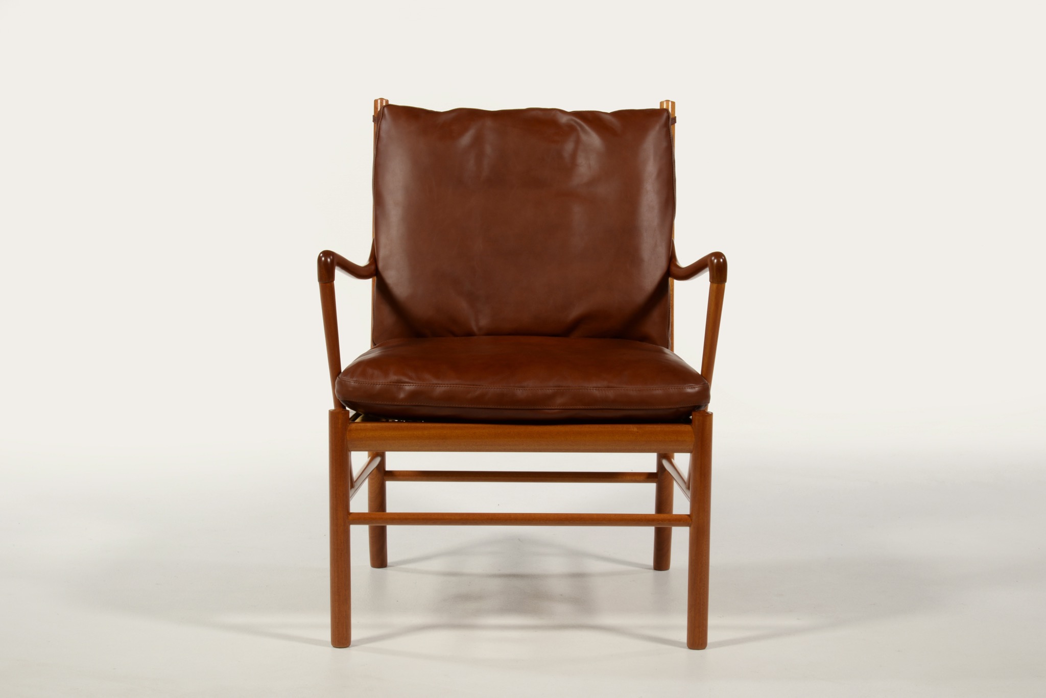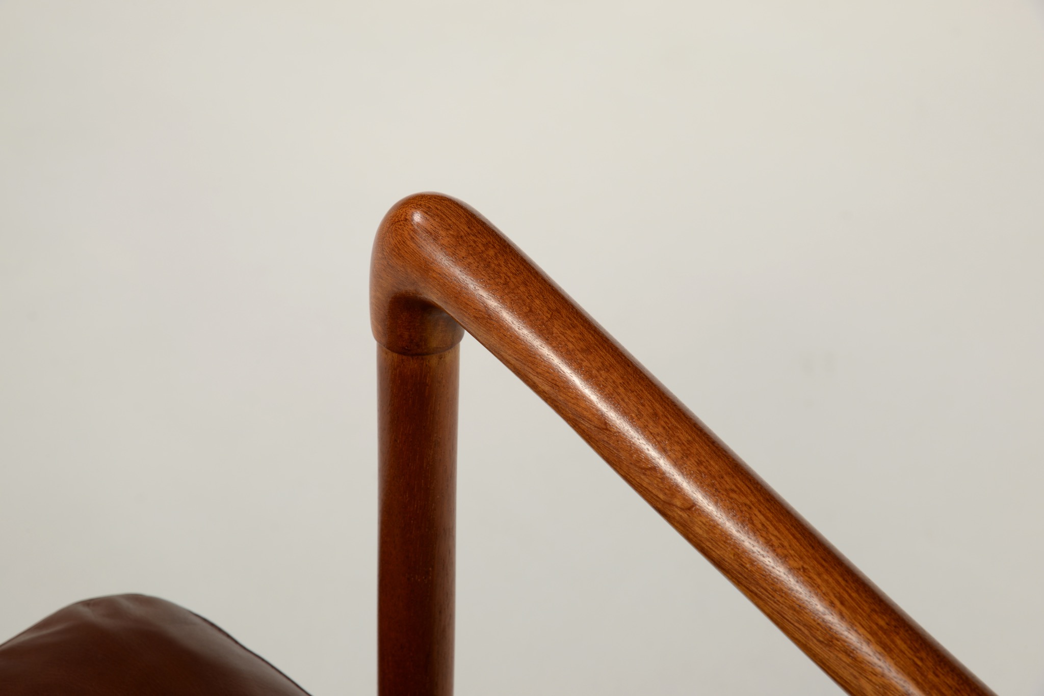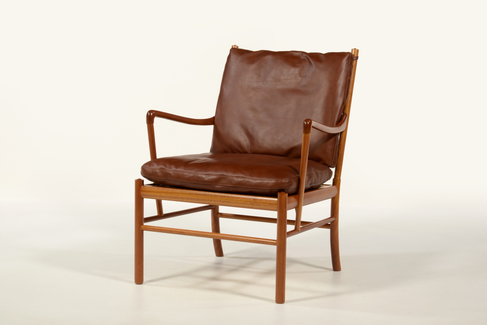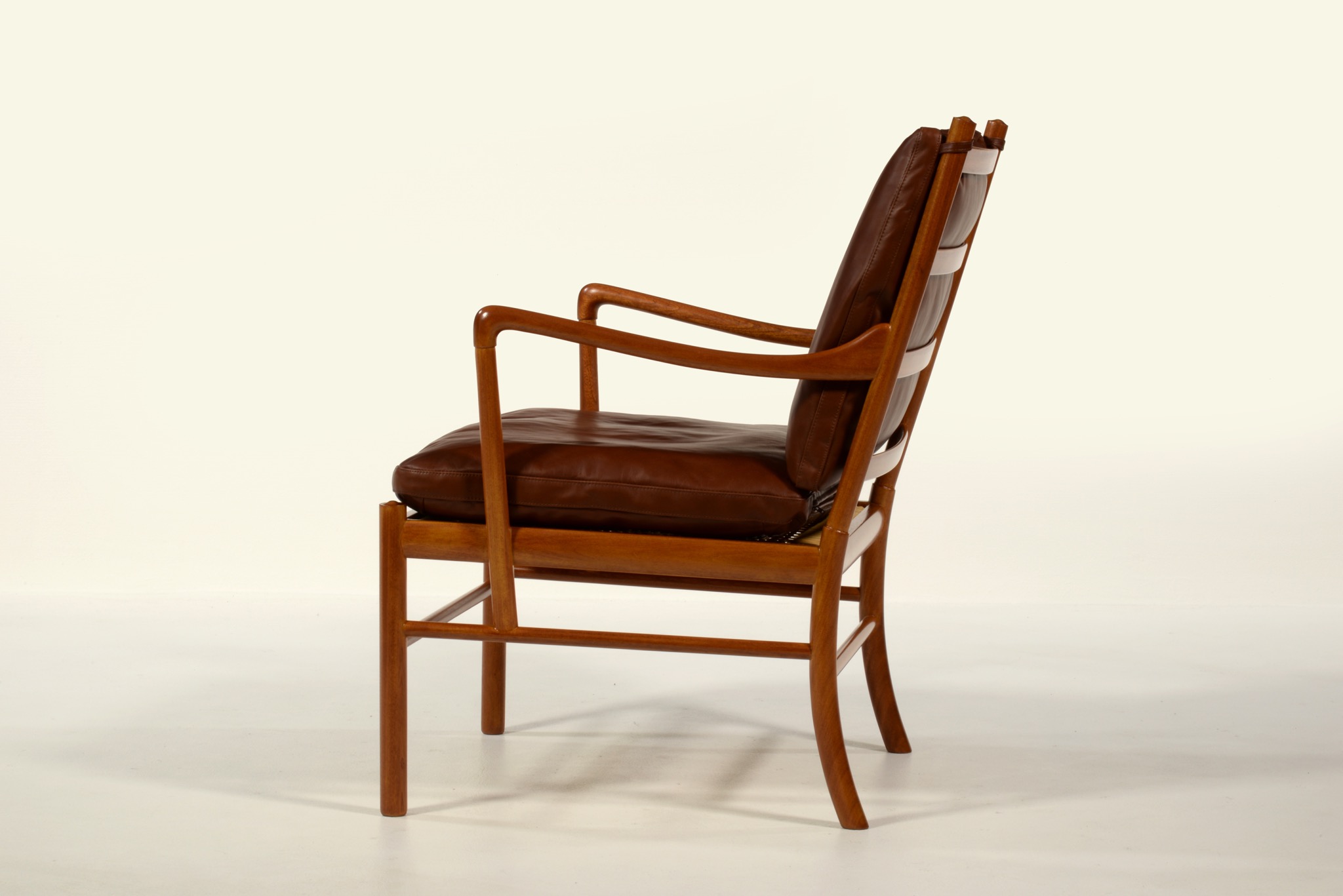 デンマークの家具デザイナーで、王立アカデミー家具科の教授を務めたOle Wanscher/オーレ・ヴァンシャーによるコロニアルチェアです。1970年代頃に作られたものでしょう。ホンジュラス産と思しきマホガニー材を用いたタイプで、材の持つ奥ゆかしい光沢が魅力です。クッションの皮革は張り替え、内部の緩衝材も羽毛で作り替えました。クッションの形状は座っていくうちに馴染むでしょう。座面下の籐張りに傷みが見られたため、部分的な補修を施しました。
