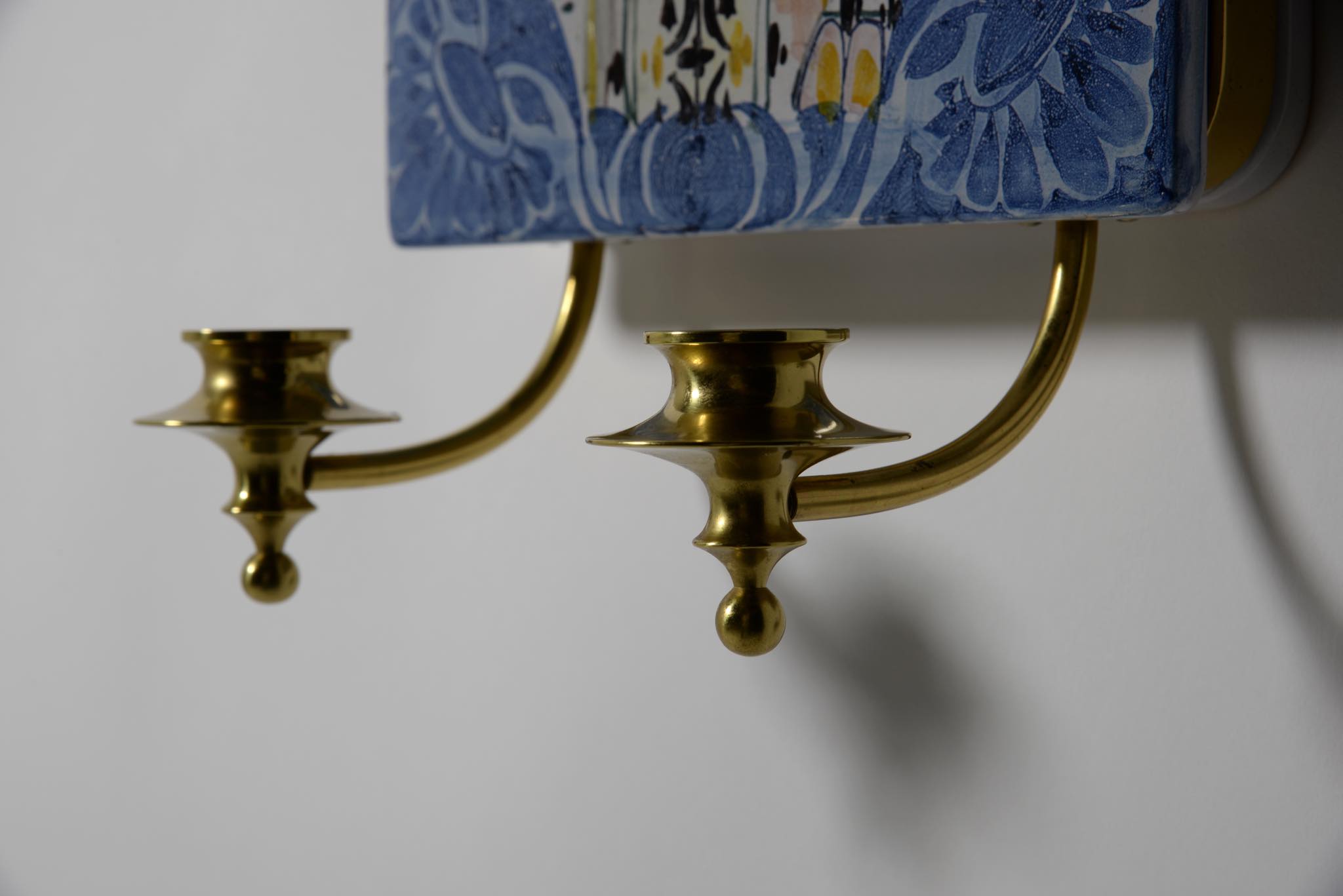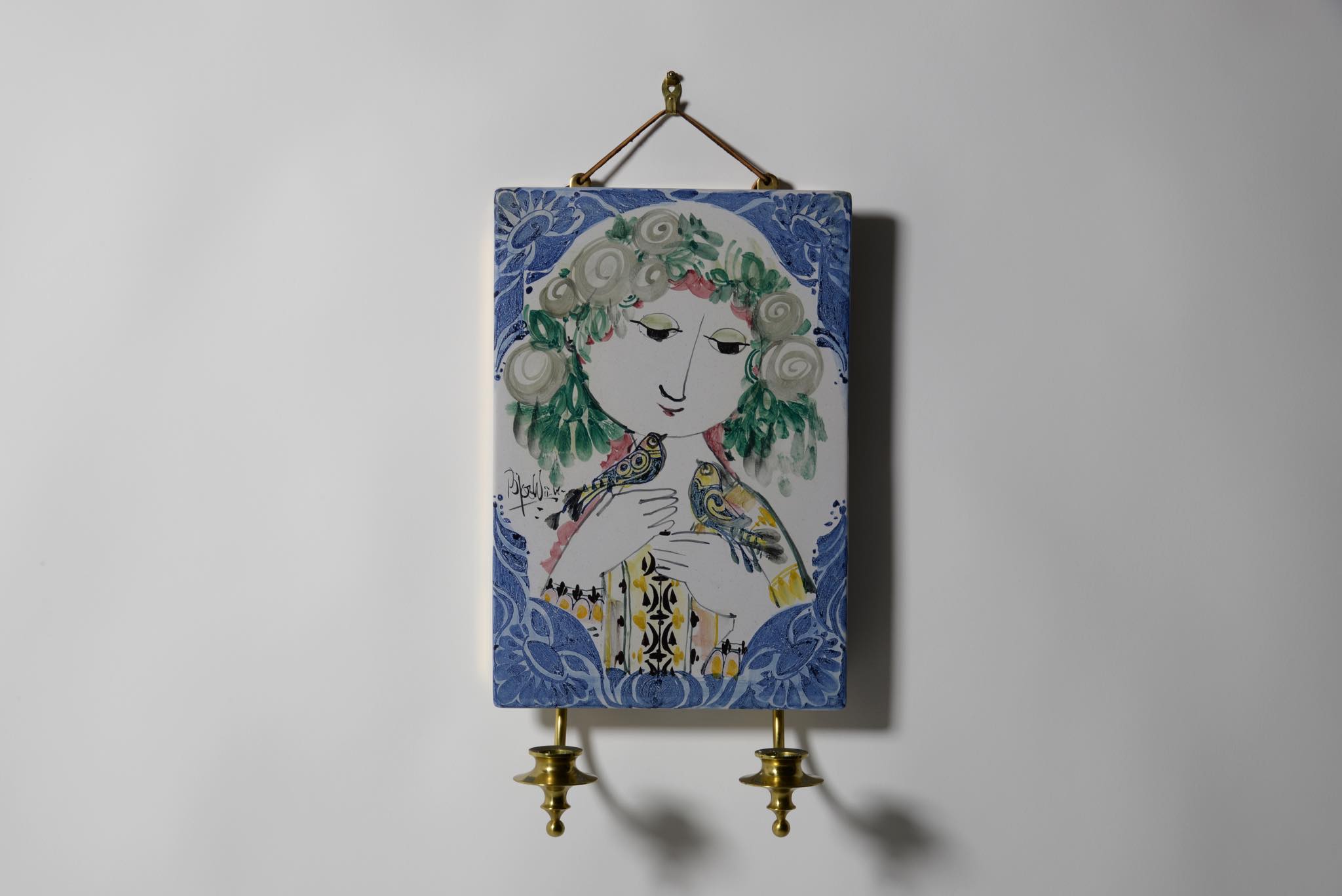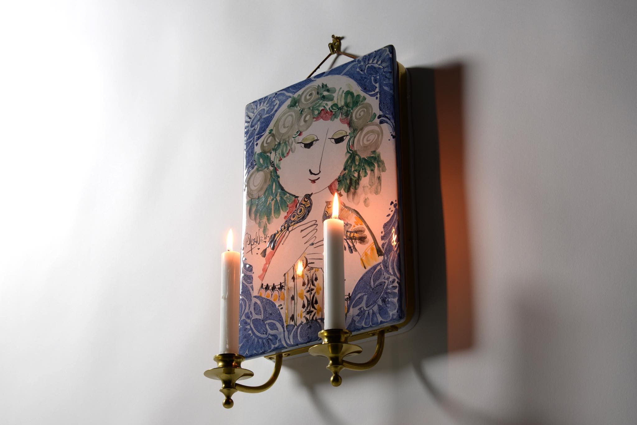 デンマークのアーティスト、Bjørn Wiinblad/ビョルン・ヴィンブラッドによるスコンス(壁掛けのキャンドルホルダー)です。陶板に小鳥と戯れる女性が描かれており、真鍮のキャンドルホルダーが対で備わります。陶板にはマチがあり、そのマチの部分に真鍮の帯が巻かれ、キャンドルホルダーをビスで取り付ける構造です。壁にしっかりとしたフックを取り付ける必要があります。キャンドルはIKEAのものがジャストサイズで炎も安定しているようです。火の元には十分ご注意ください。