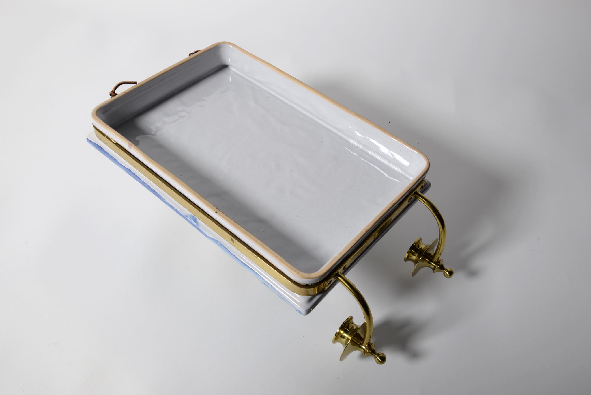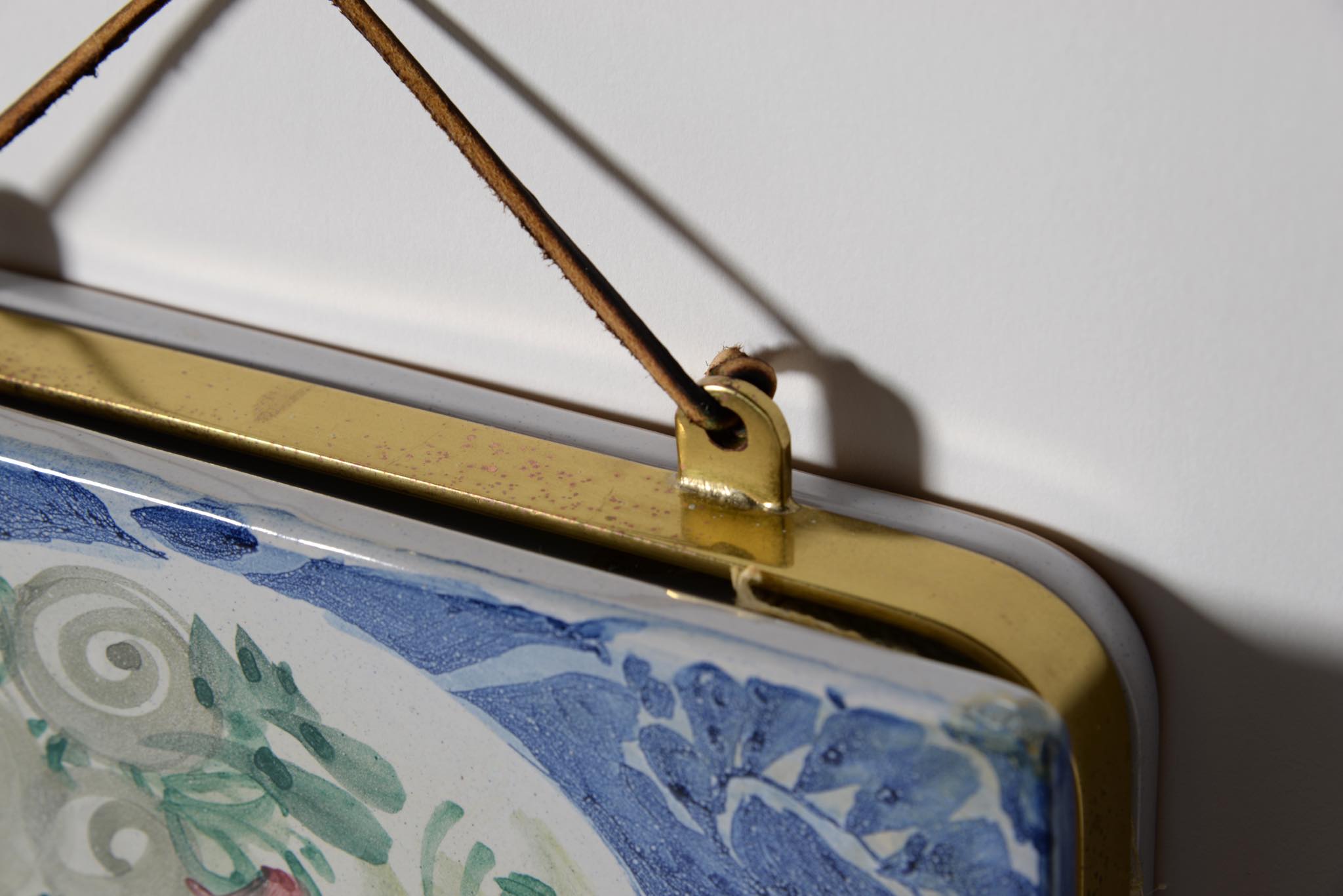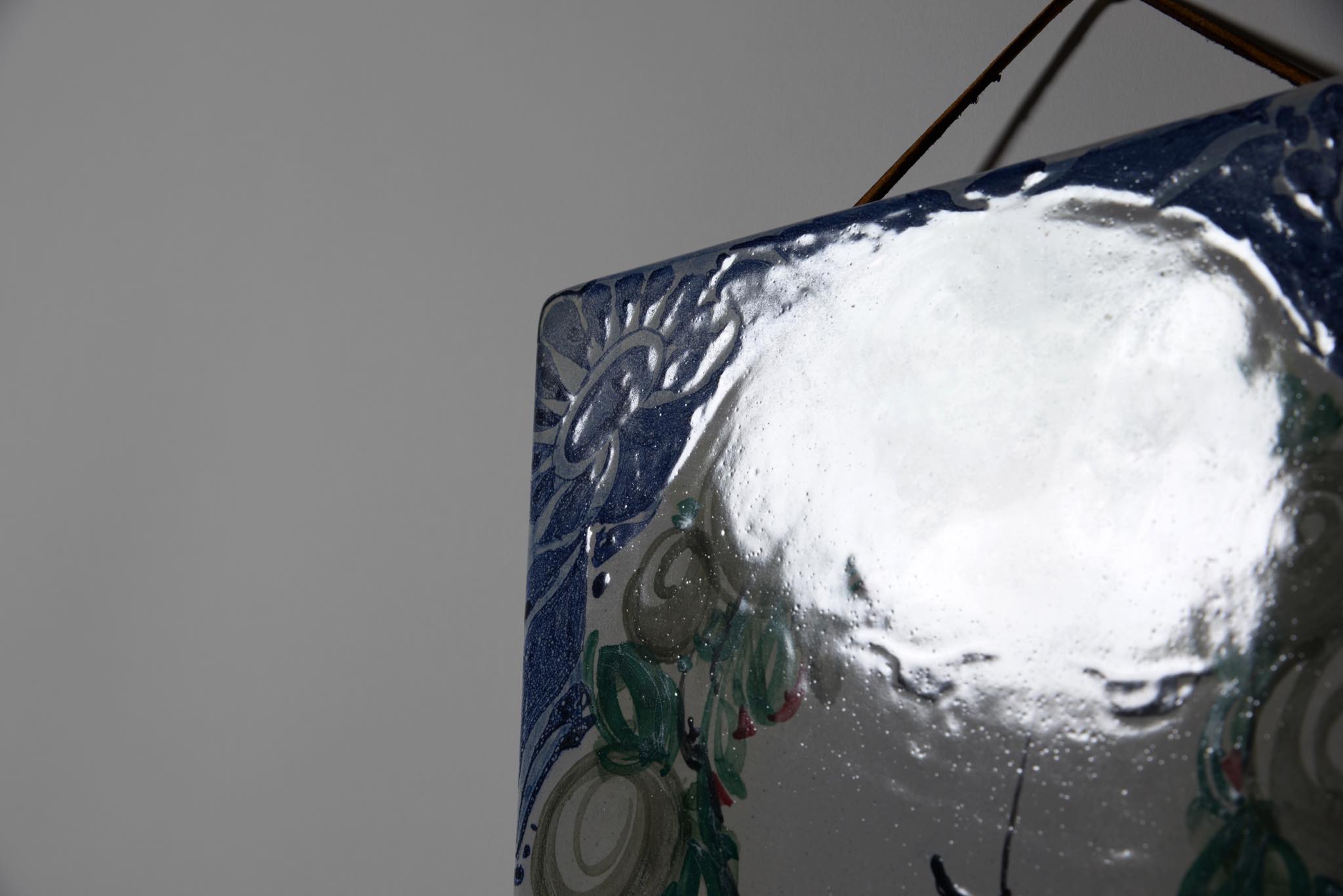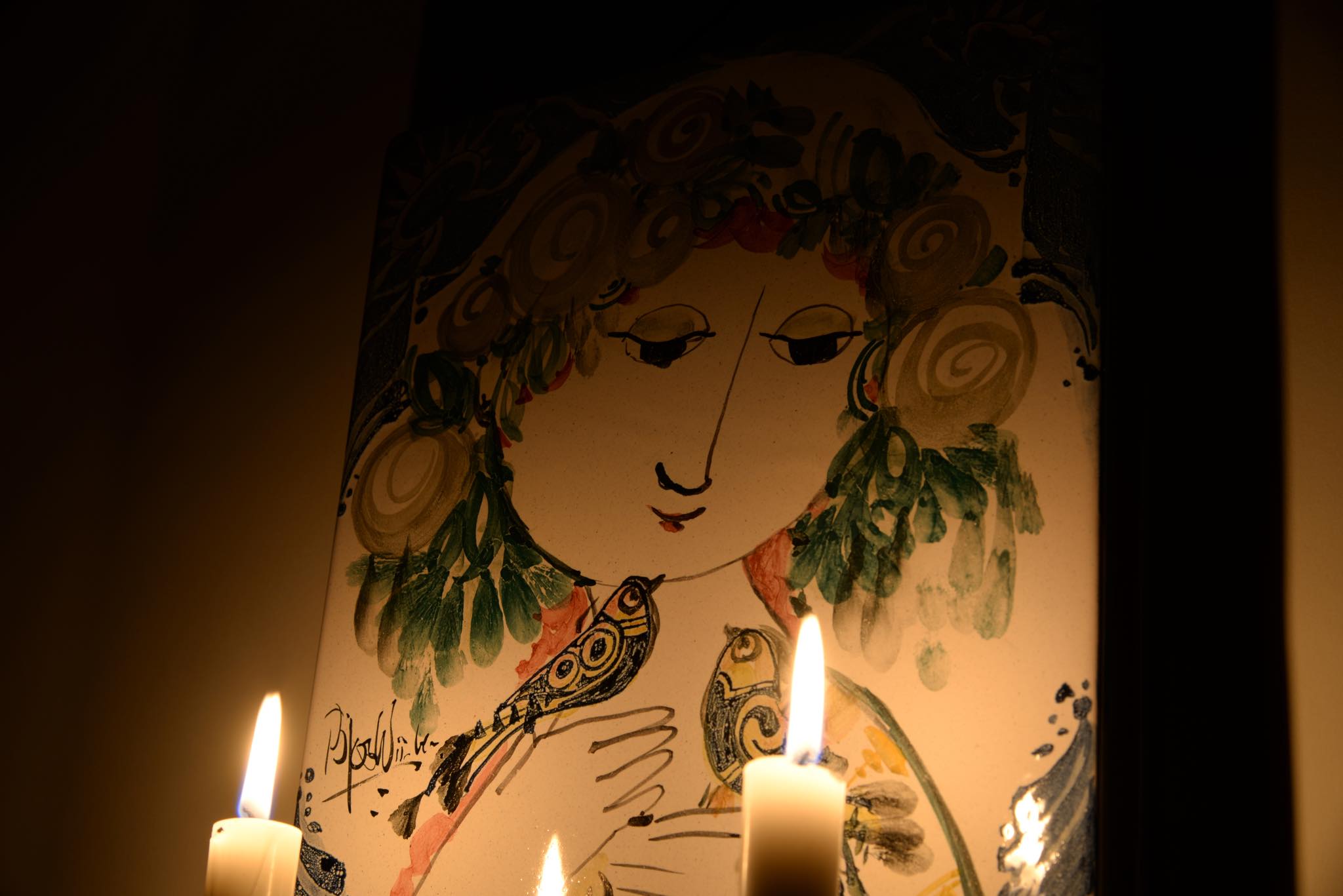 デンマークのアーティスト、Bjørn Wiinblad/ビョルン・ヴィンブラッドによるスコンス(壁掛けのキャンドルホルダー)です。陶板に小鳥と戯れる女性が描かれており、真鍮のキャンドルホルダーが対で備わります。陶板にはマチがあり、そのマチの部分に真鍮の帯が巻かれ、キャンドルホルダーをビスで取り付ける構造です。壁にしっかりとしたフックを取り付ける必要があります。キャンドルはIKEAのものがジャストサイズで炎も安定しているようです。火の元には十分ご注意ください。