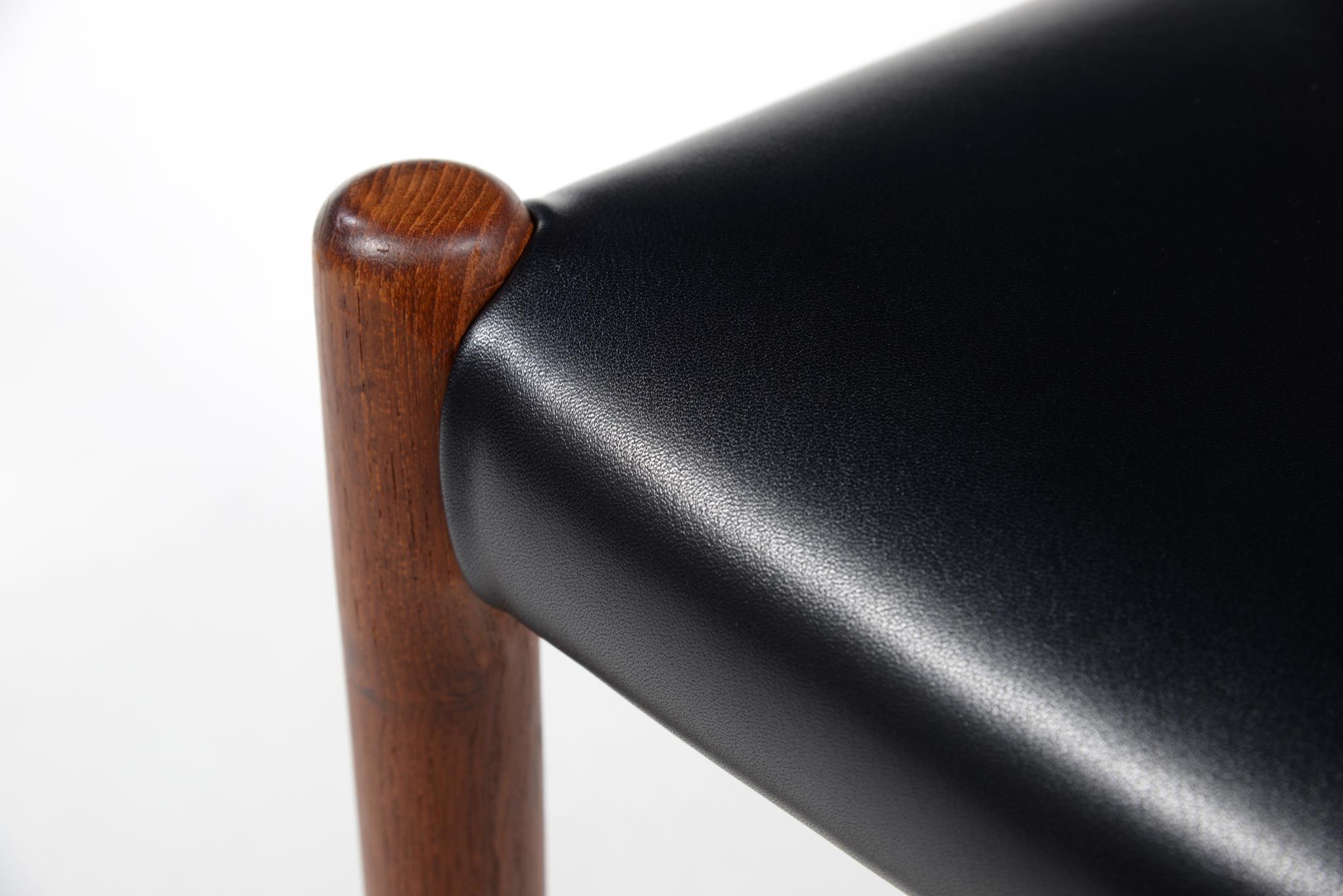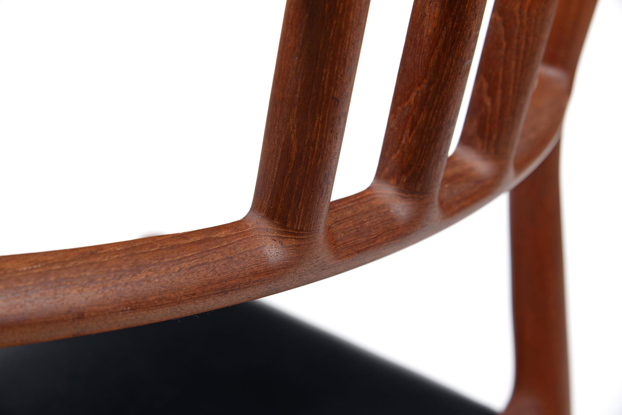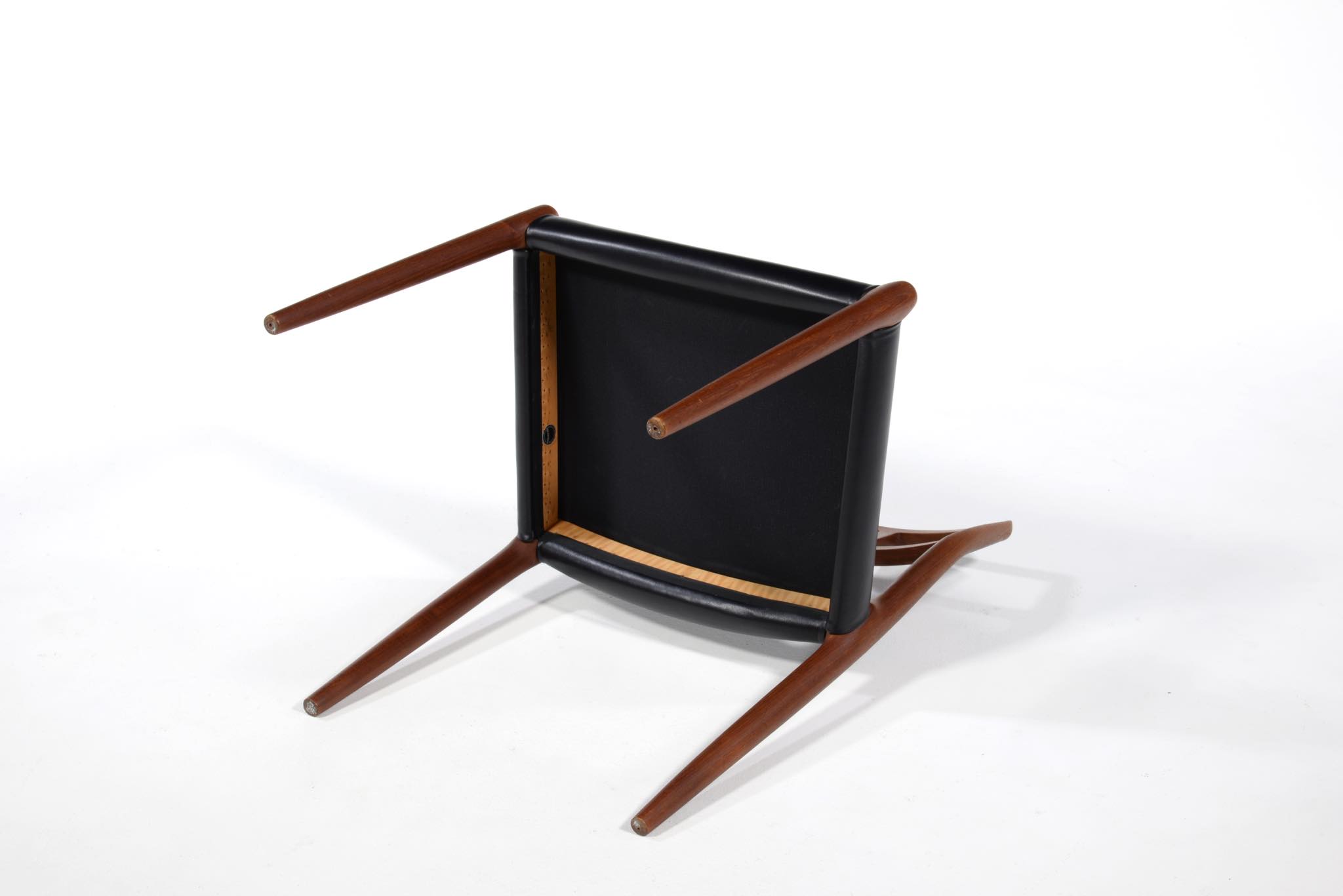 デンマークの家具工房、J.L. Møller/J.L.モラーによるダイニングチェア "Model.79" チーク材のモデルです。創業者のN.O. Moller/ニルス・オット・モラーによってデザインされ、こちらは1960年代頃に作られたヴィンテージ品となります。天然木が用いられていたこの当時の製作品は材そのものに強度があったため、現行モデルに比べ細く作られているようです。こちらの椅子にはタイ国原産と思しき木目の美しいチーク材が使われています。座面は黒色皮革にて新たに張り替えました。経年したチークの風合いが美しい椅子です。