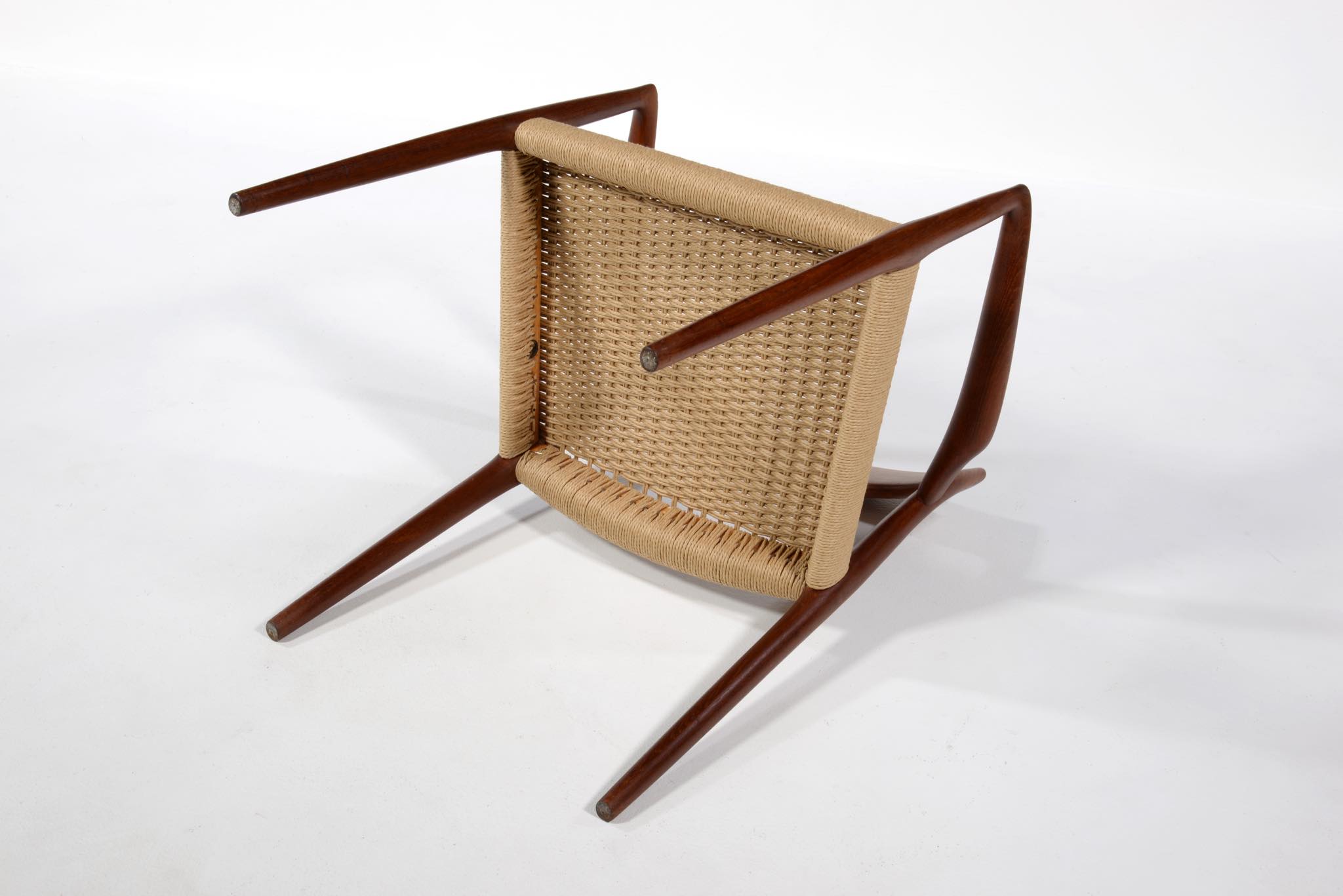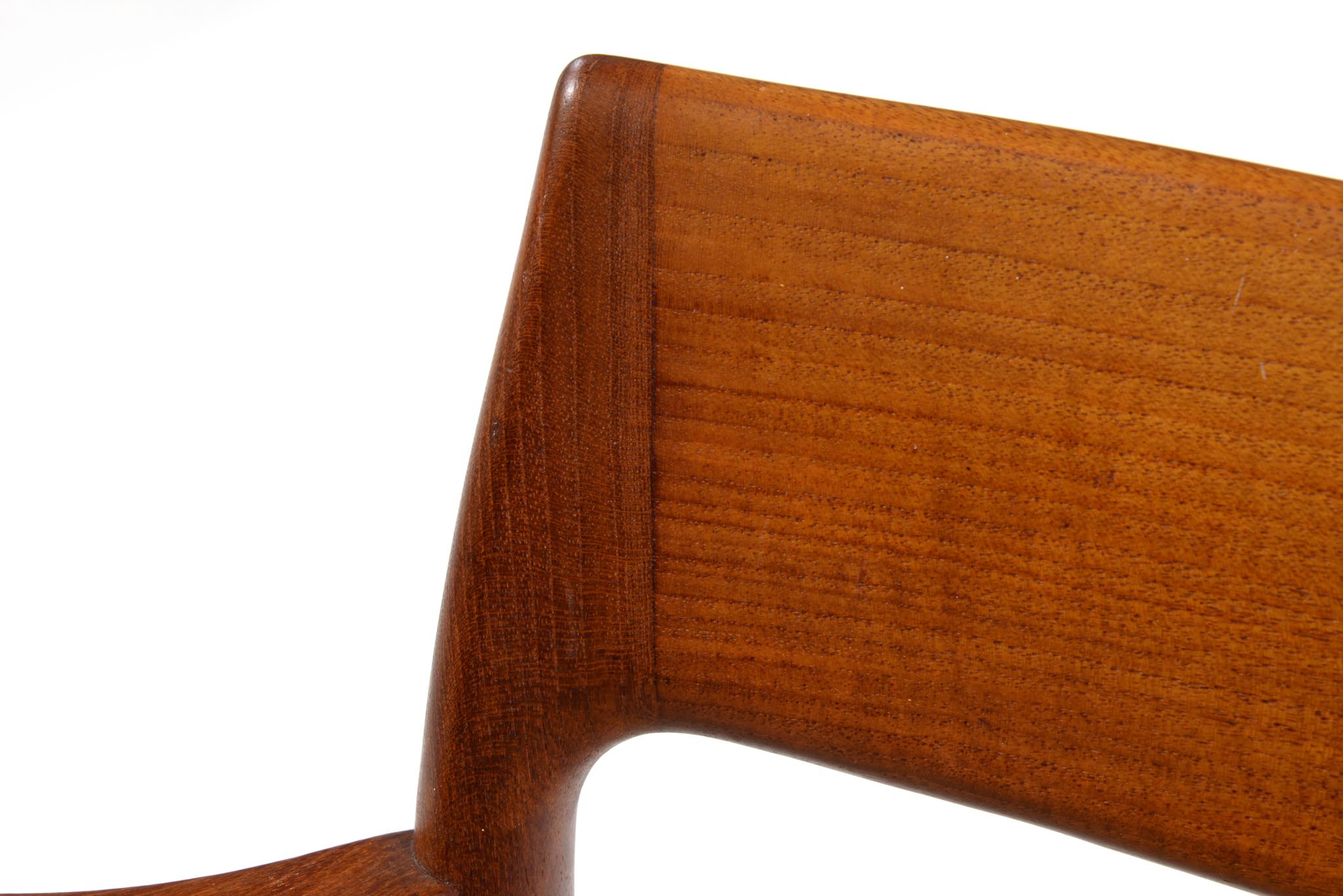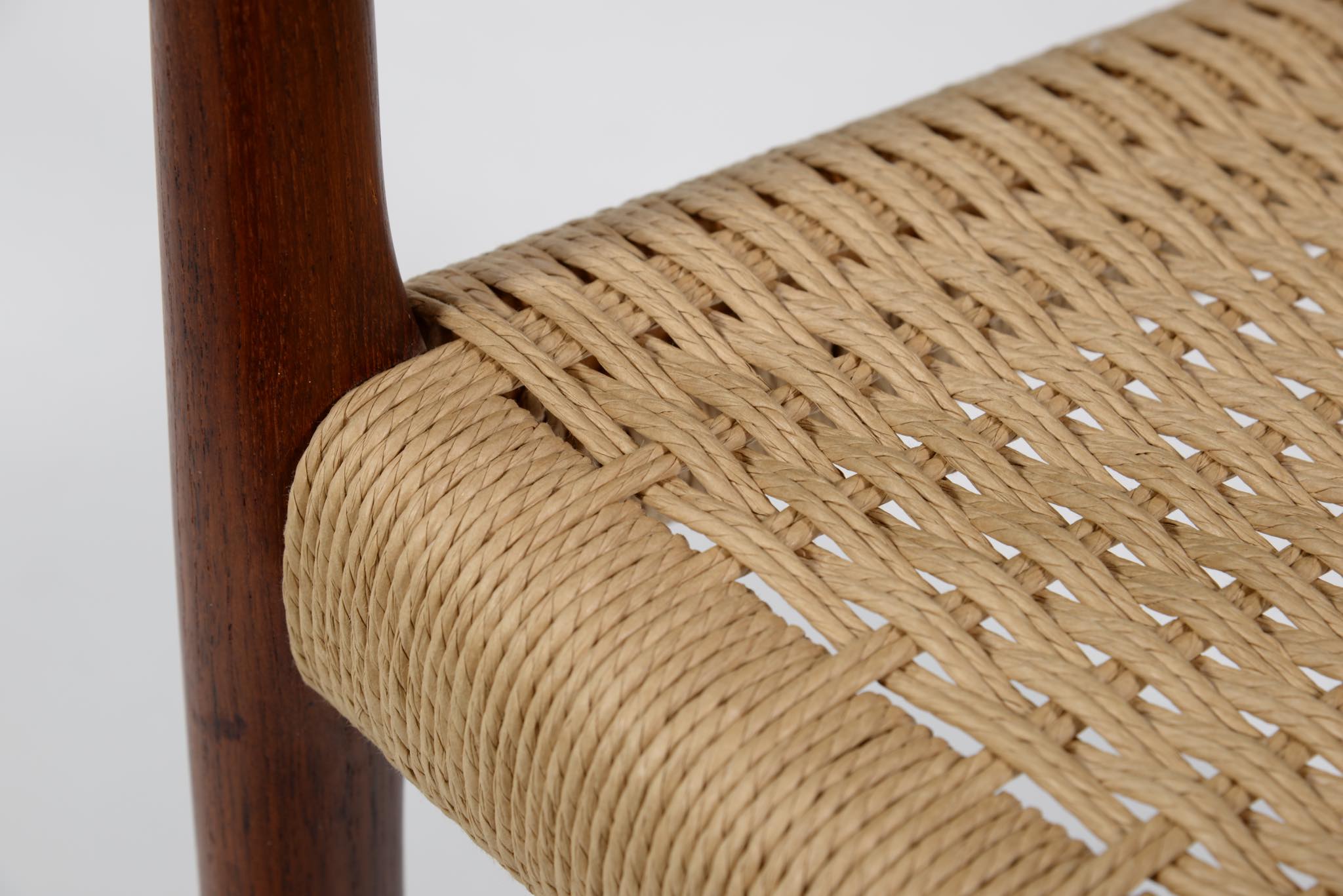 N.O. Møller/ニルス・モラーによるアーム付きダイニングチェアです。1960年代頃に作られたものでしょう。タイ原産と思しき、年輪の詰まった良質なチーク材を用いており、特有のシャープなデザインが特徴です。ペーパーコードは新たに張り替えました。