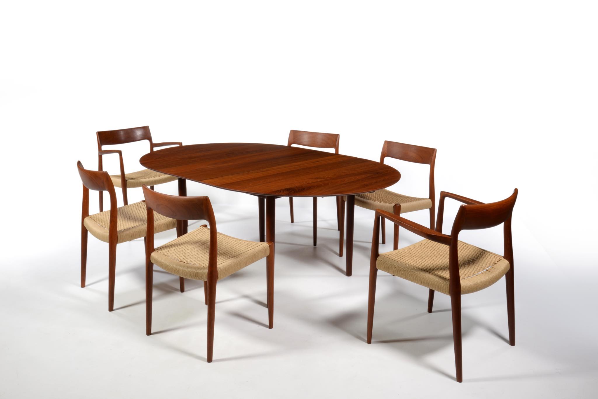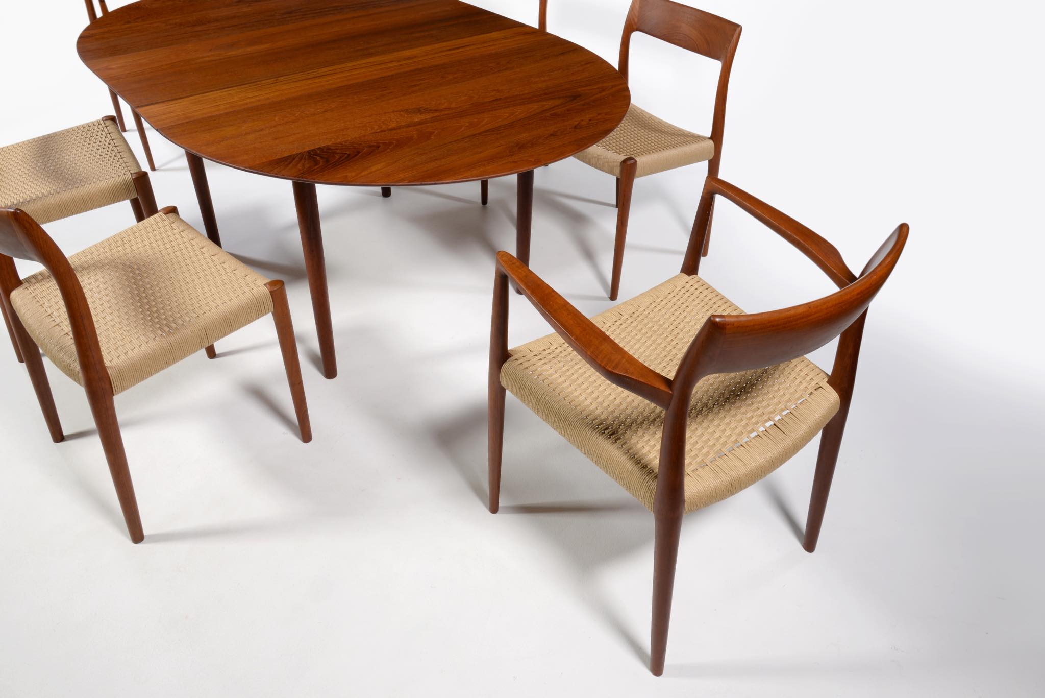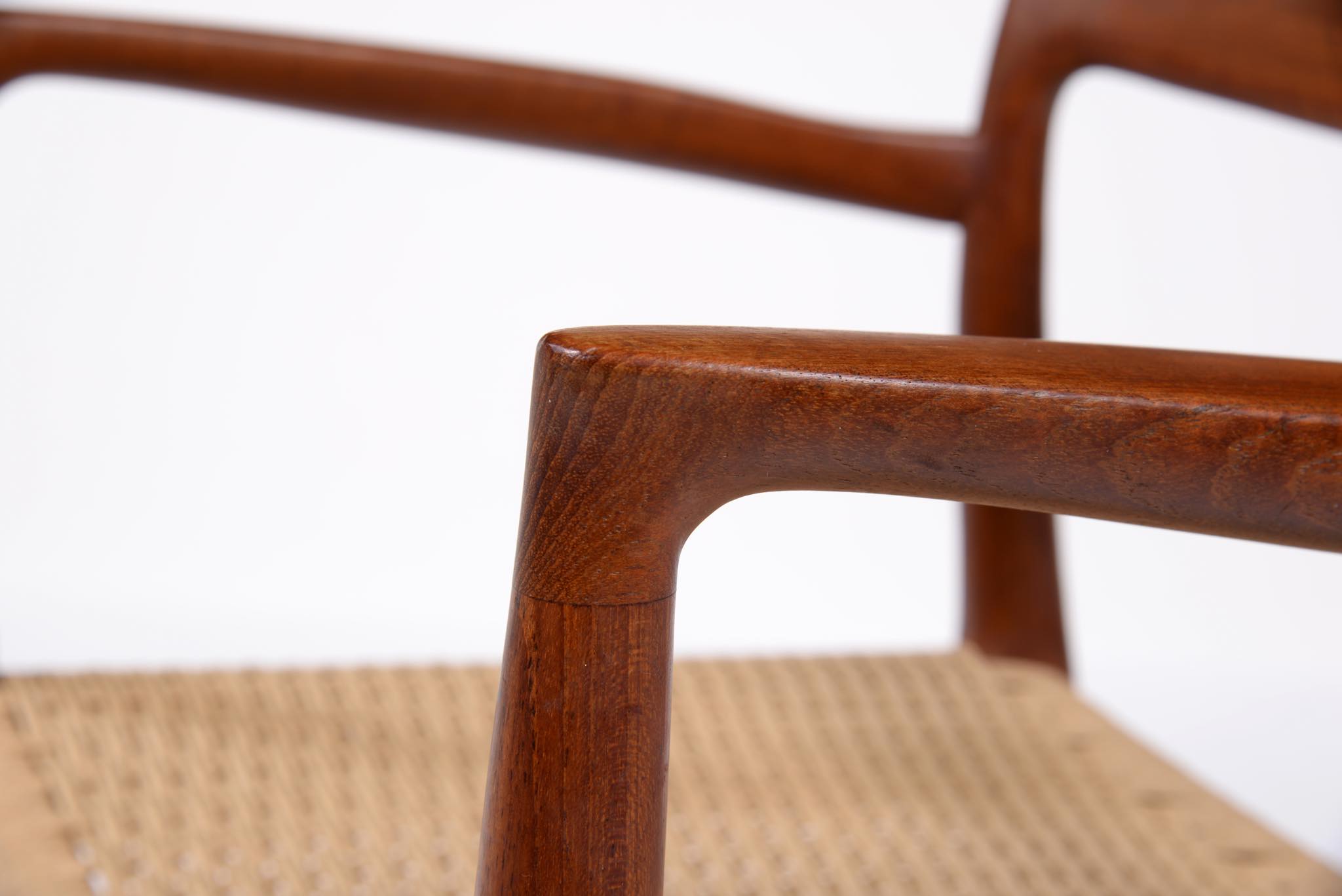 N.O. Møller/ニルス・モラーによるアーム付きダイニングチェアです。1960年代頃に作られたものでしょう。タイ原産と思しき、年輪の詰まった良質なチーク材を用いており、特有のシャープなデザインが特徴です。ペーパーコードは新たに張り替えました。