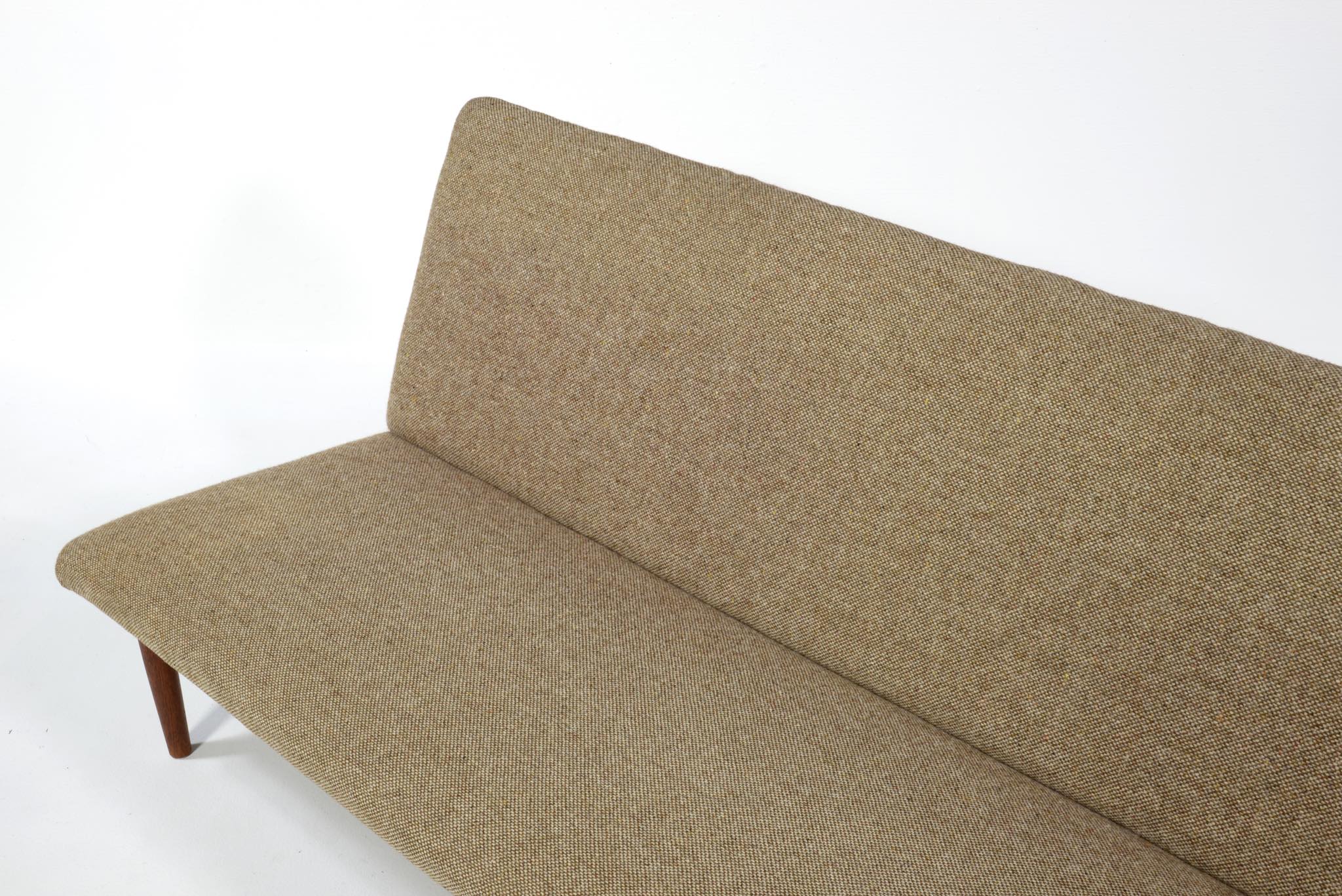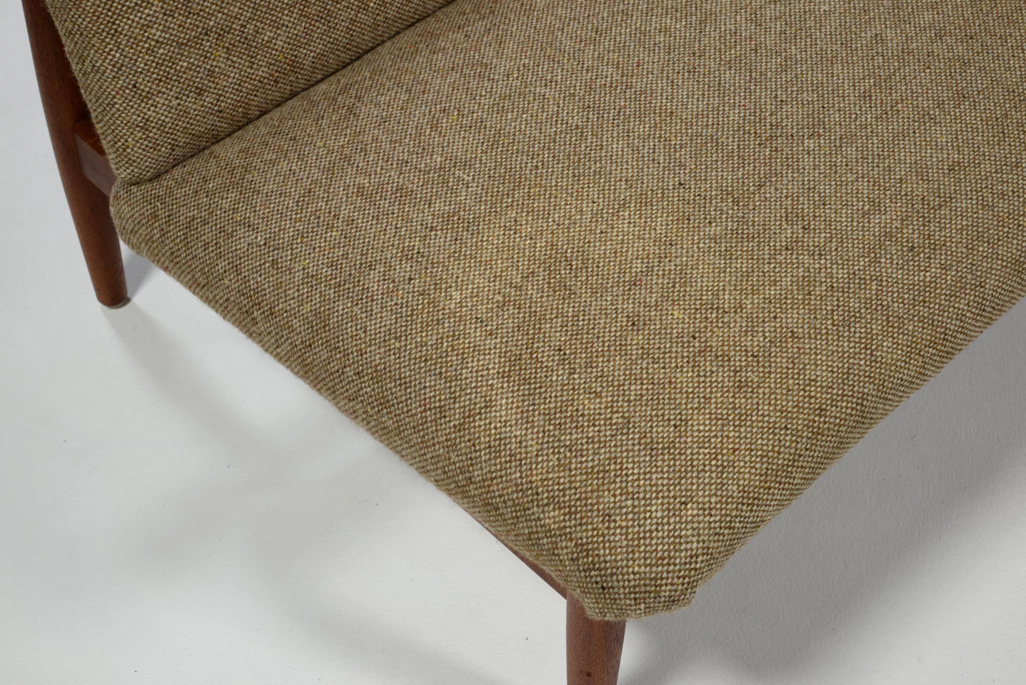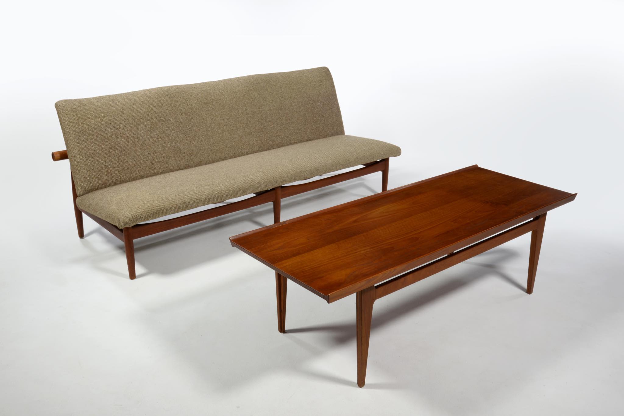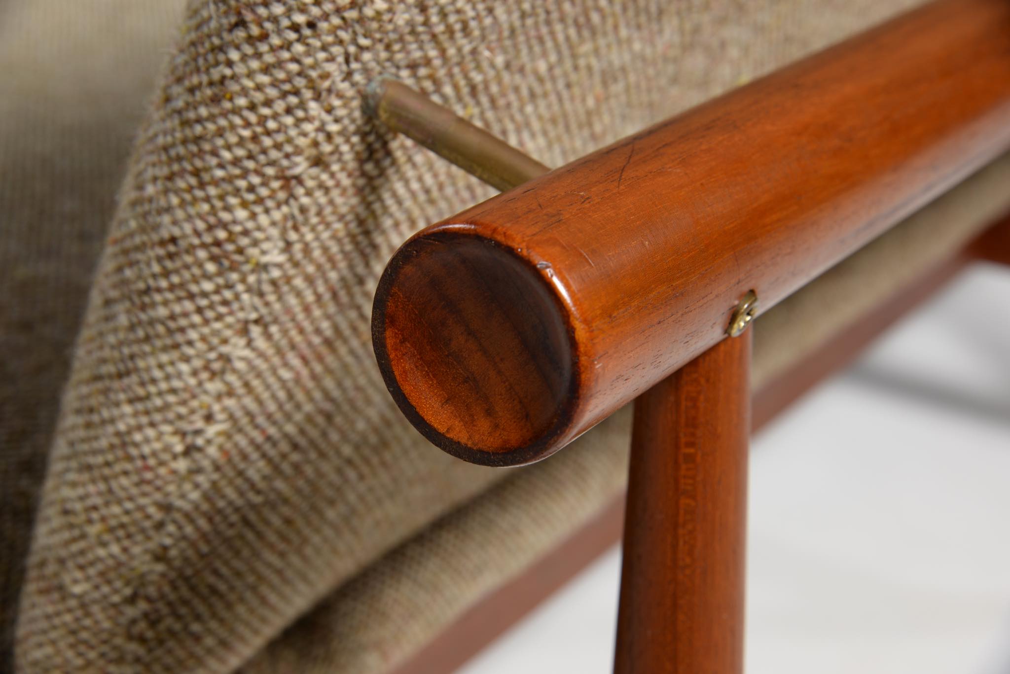 デンマークを代表するデザイナーのFinn Juhl/フィン・ユールによってデザインされたソファシリーズ ”Series137" の3人掛けソファです。厳島神社の鳥居にインスピレーションを受けデザインされた事から、通称 "ジャパンソファ" とも称されています。アームを排除し、腰の位置を低く設計した佇まいは、当時としては新様式だったのでしょう。フレームはチーク材、ファブリックはデンマークで張られていた状態です。座面の一部に薄い染みが見られ、背の背後のフレームの先端に僅かに削れた箇所がありますが、全体的に綺麗な状態です。詳しくはお問い合わせください。