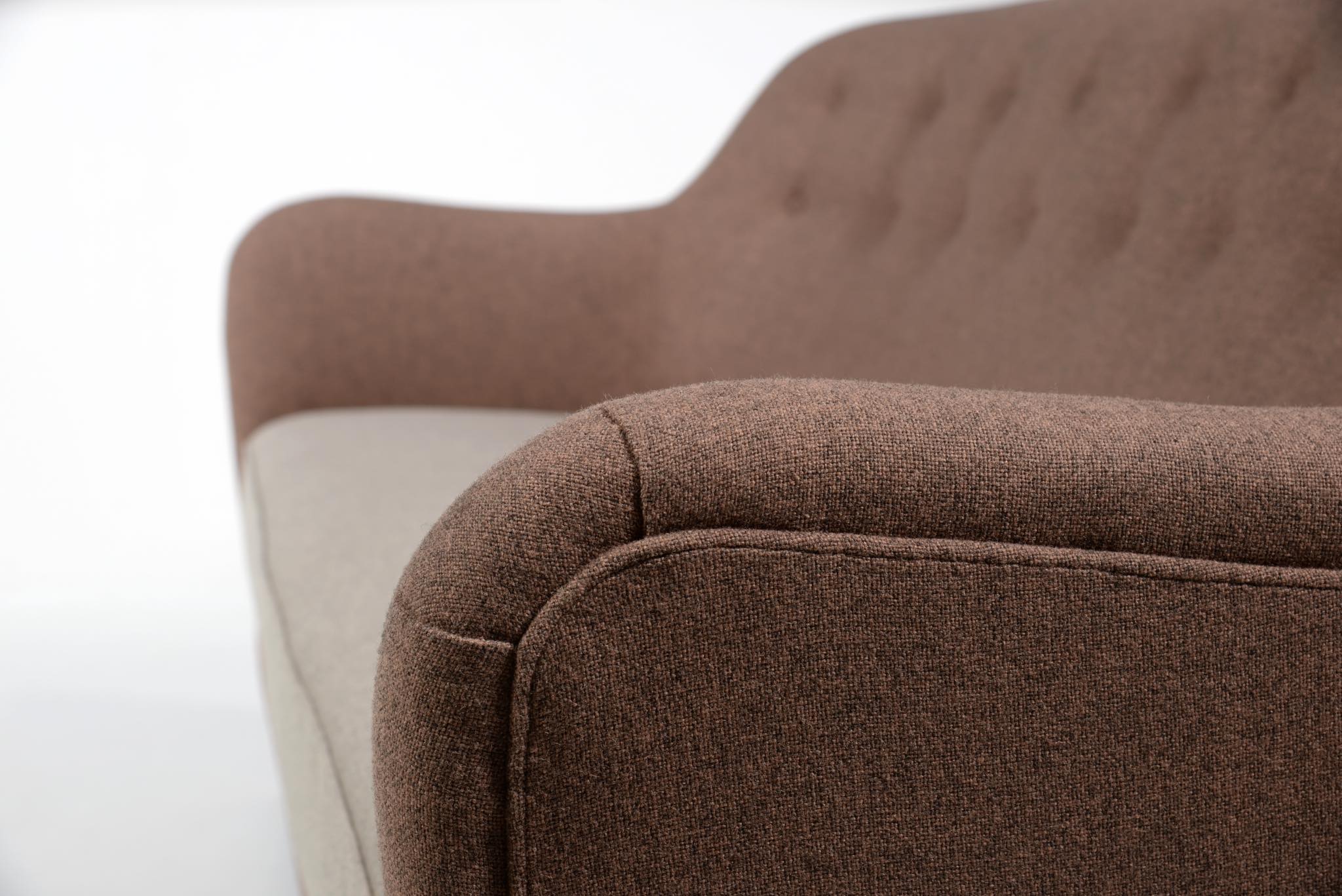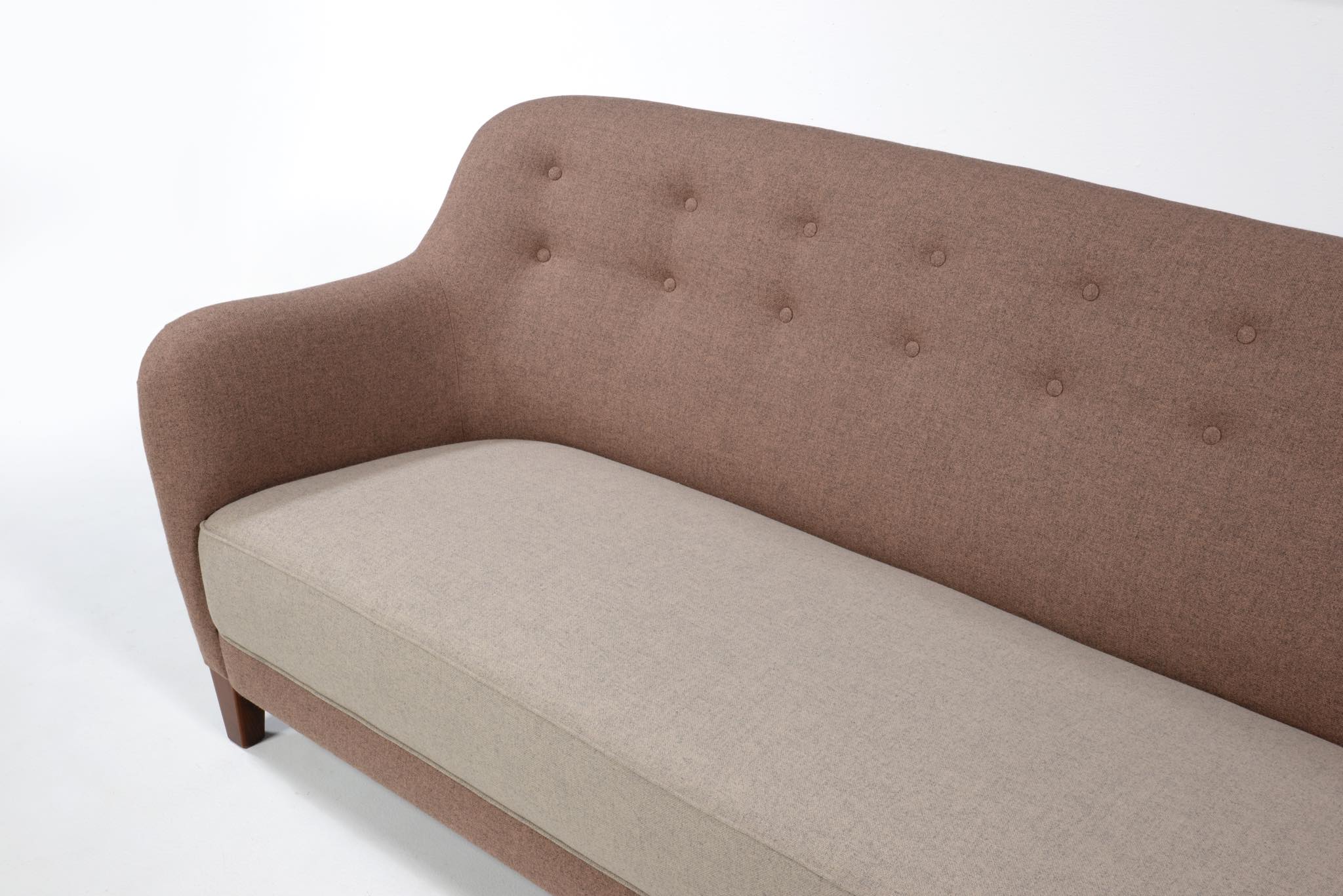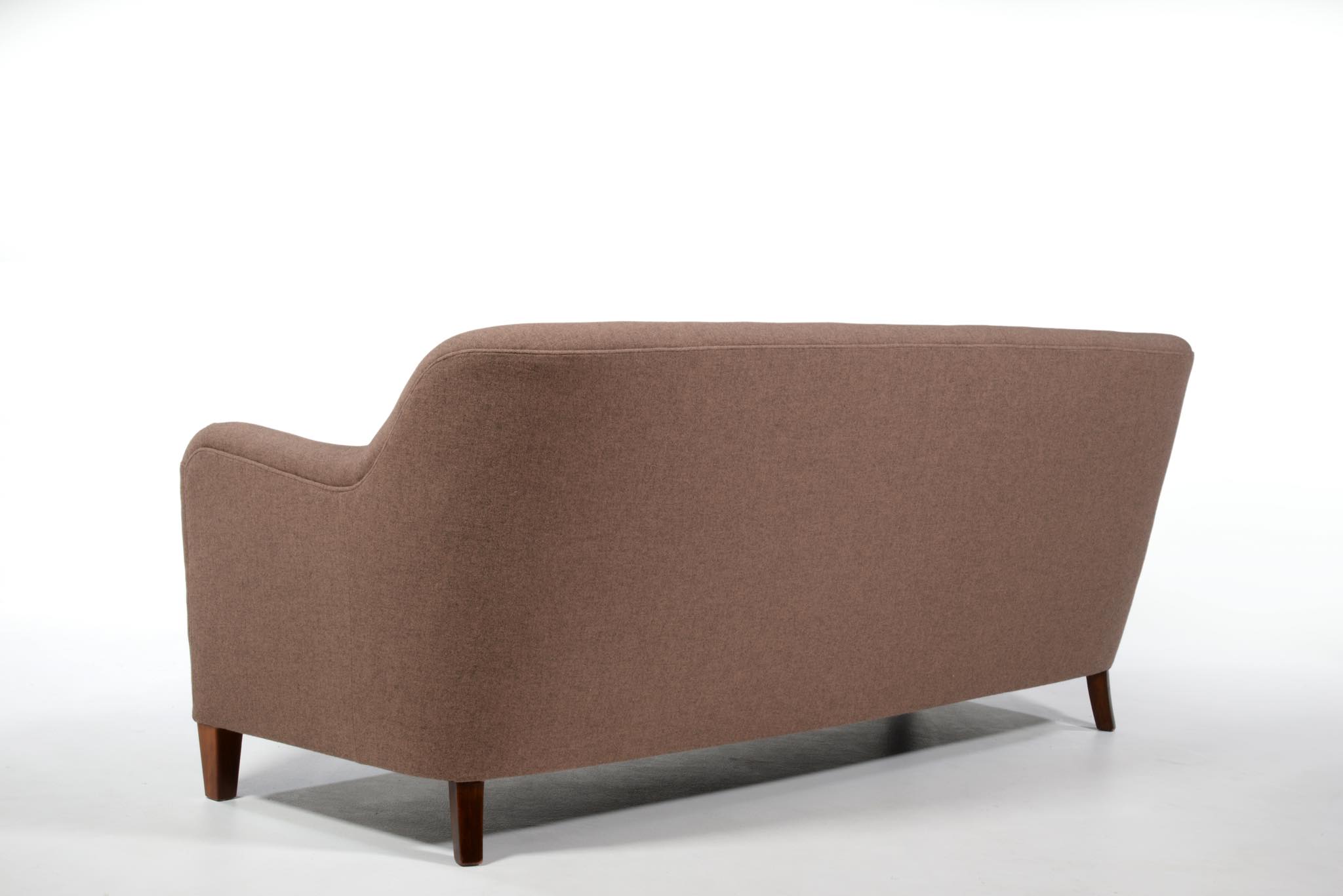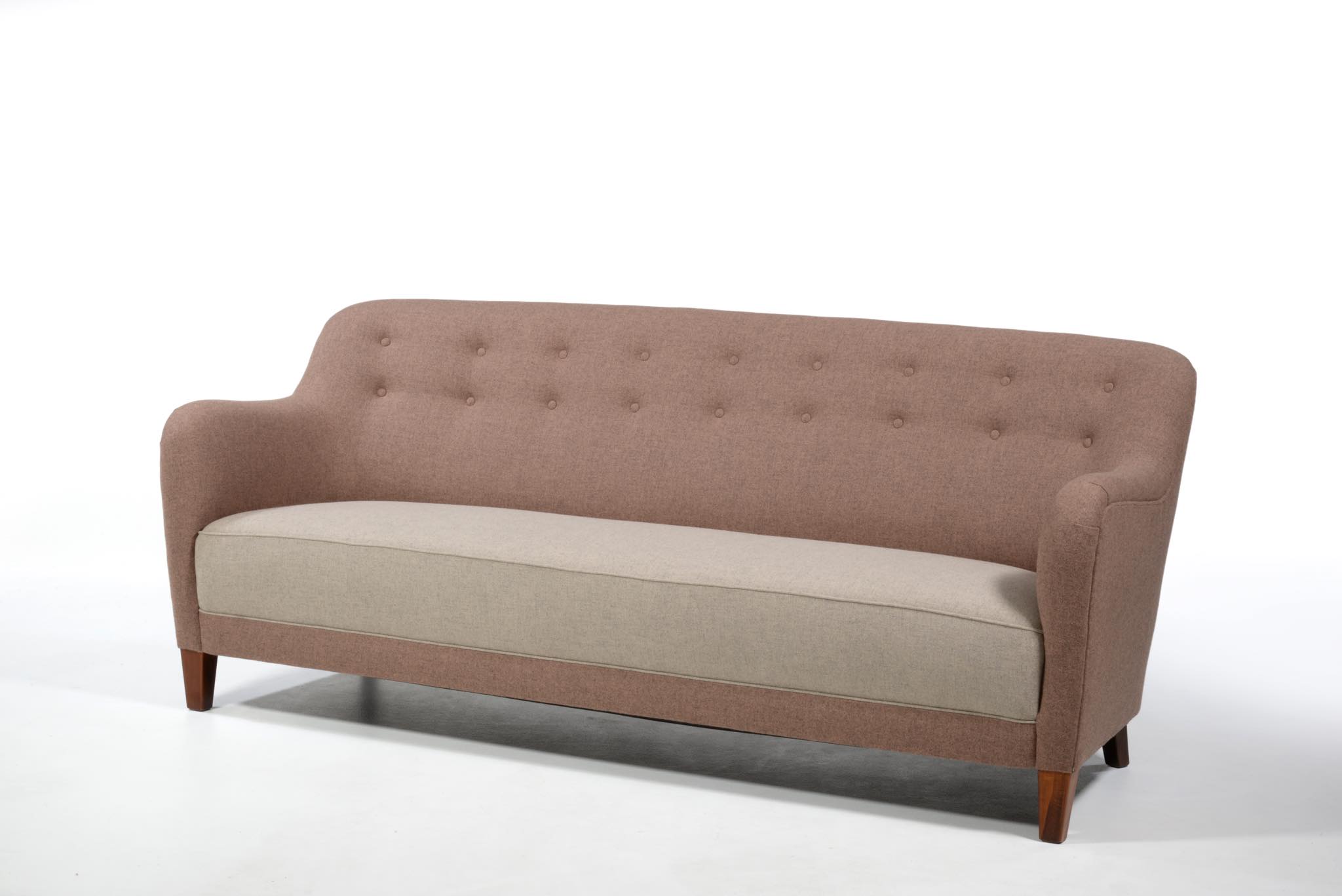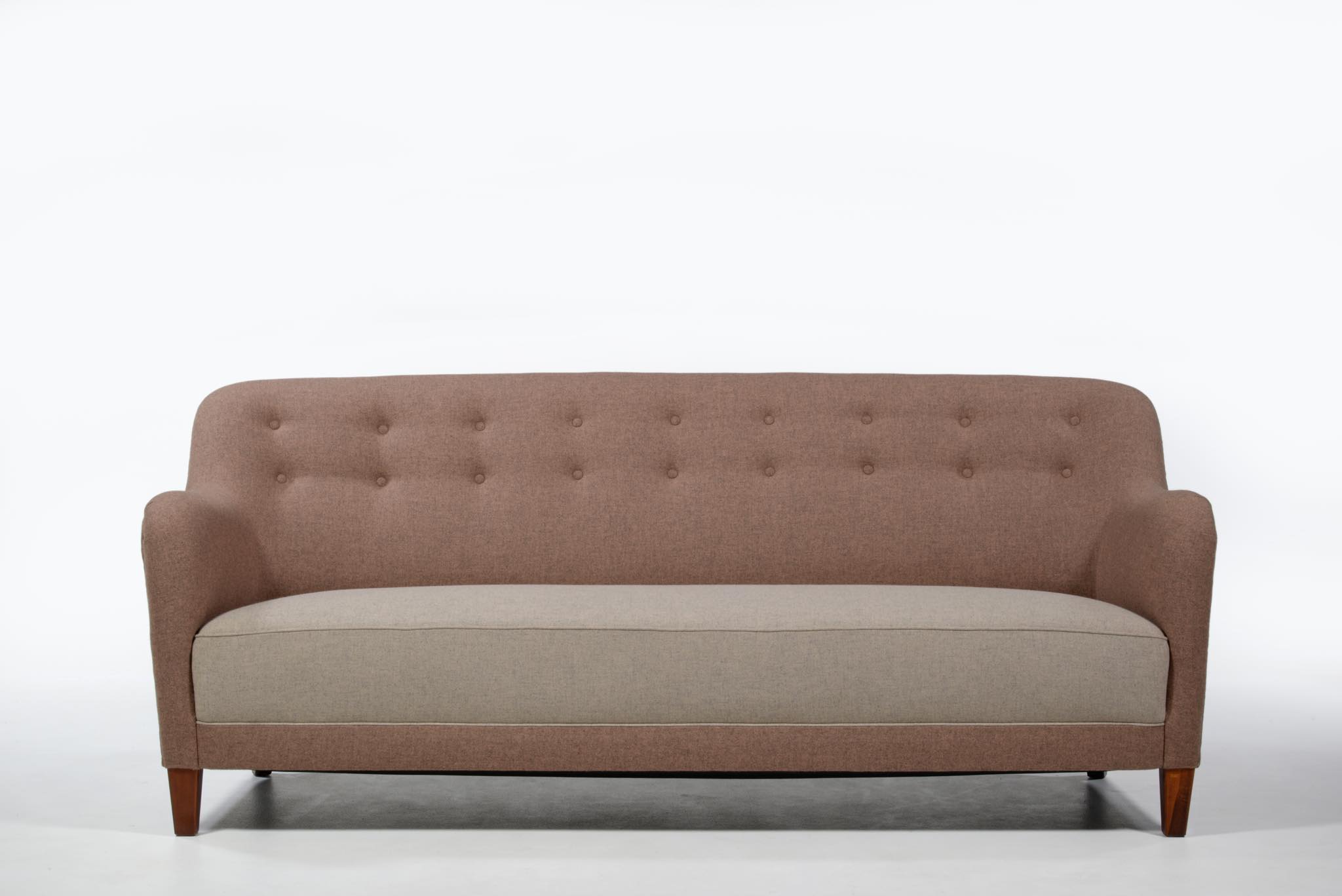 デンマークの名匠、Jacob Kjær/ヤコブ・ケアによってデザイン、製作された3人掛けソファです。1940年代頃に作られたものでしょう。昔ながらの製法で作られたもので、コイルスプリングをベースに天然素材の緩衝材などから構成されており、ずっしりと重量があり、クッションのストロークが深く、しかし沈まず、座り心地の良い椅子です。脚はコーカサスウォルナット材と思われます。近年、デンマークにてクヴァドラ社の ”Tonica 2” で張り替えられ、短期間の展示程度に使われたようですが、きれいな状態です。