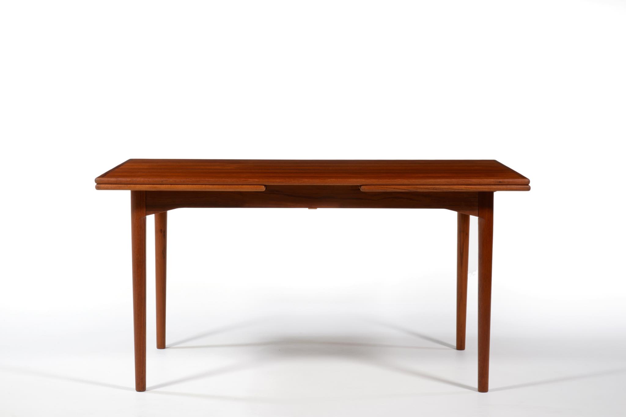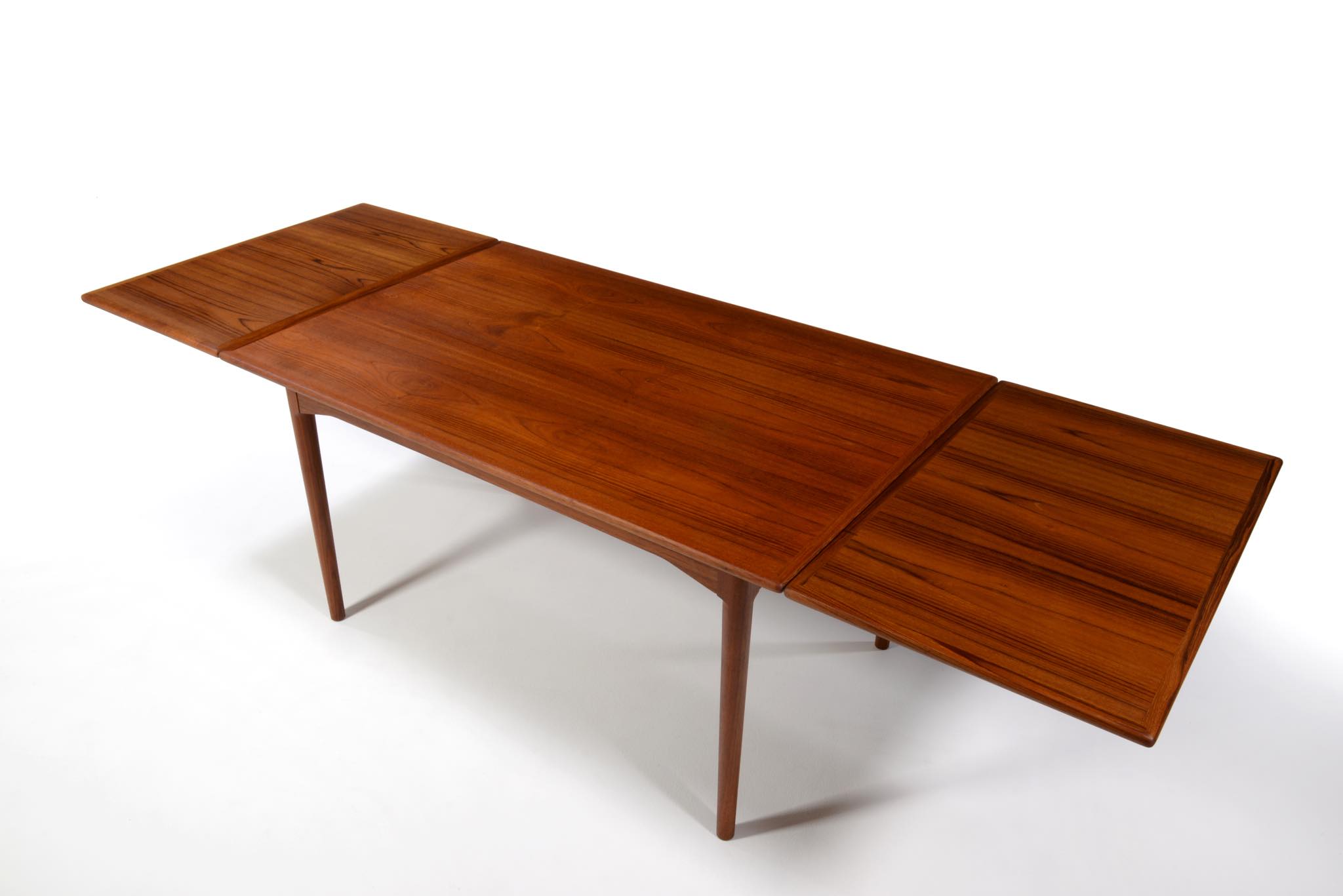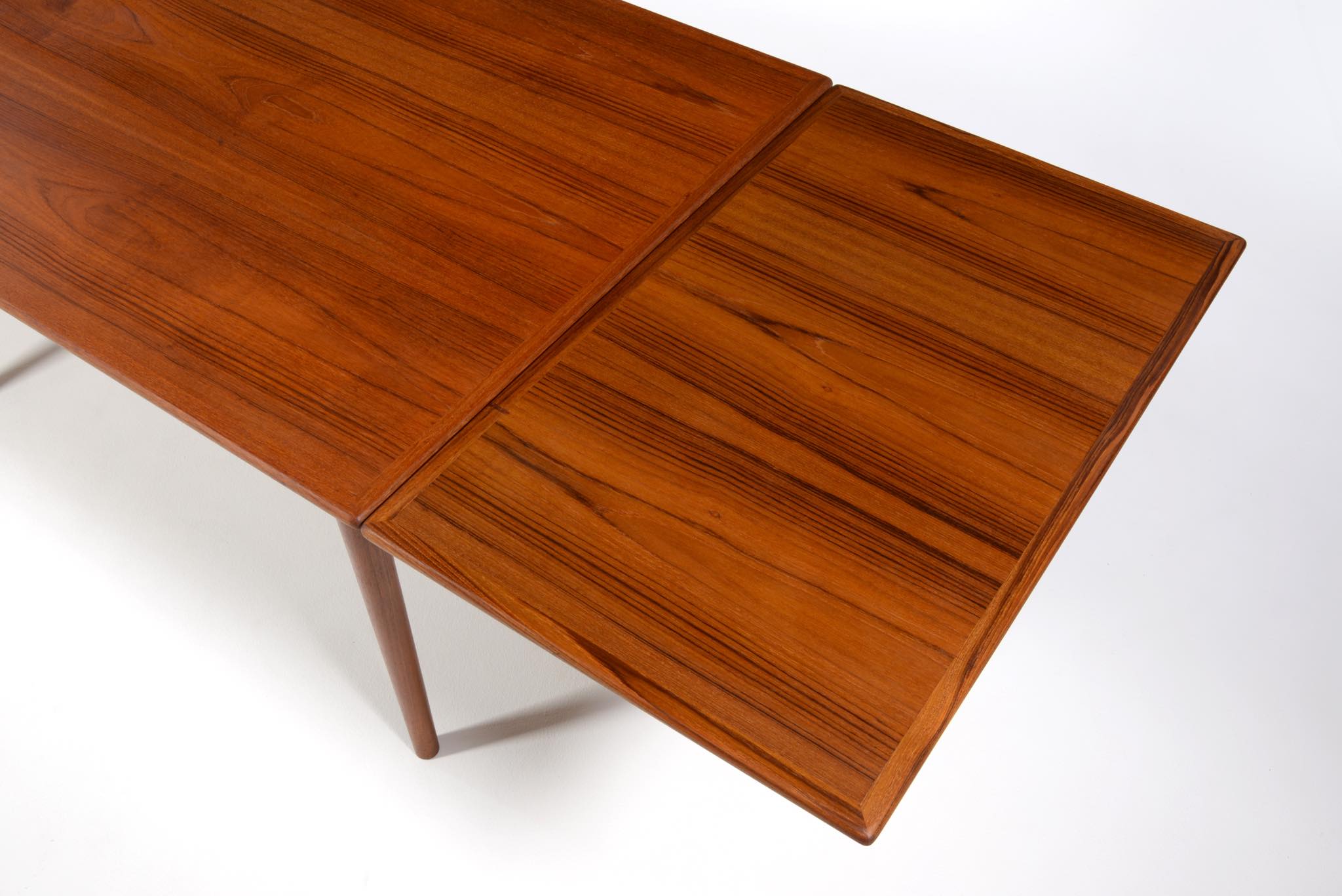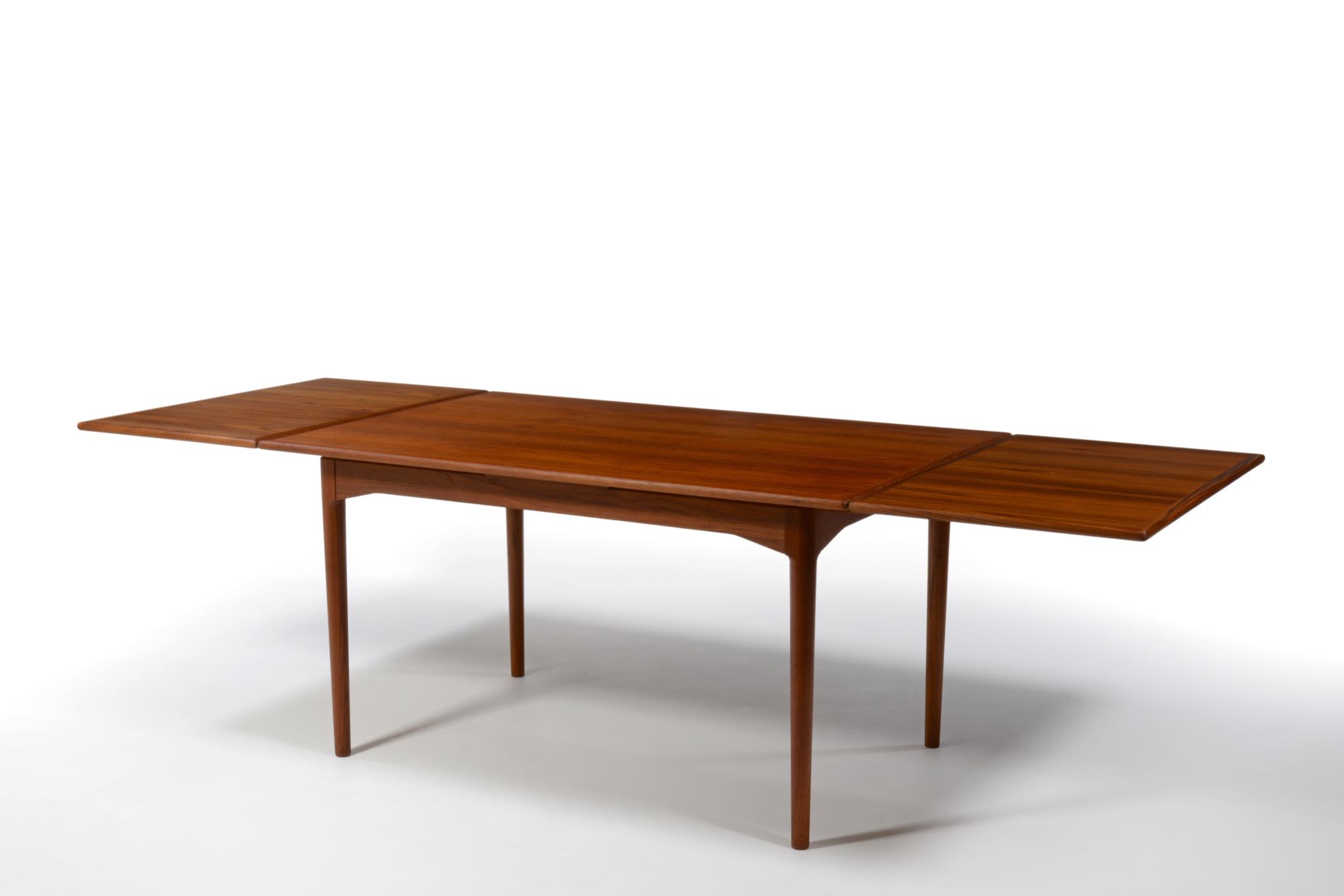 デンマークのキャビネットメーカー、Slagelse/スラゲル工房によるチーク材のダイニングテーブルです。1950~60年代頃に作られたものでしょう。良質なチーク材が用いられており、経年によって程よく変色しています。天板はエクステンションリーフが内包されており、天板の面積を拡張することができます。経年変化によってエクステンションリーフを広げた際に主天板との色差が生じます。エクステンションリーフの一部に擦傷がありますが、全体にきれいな状態です。