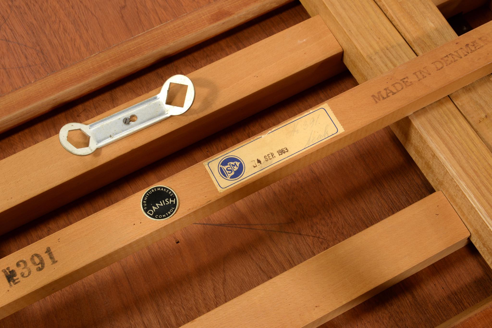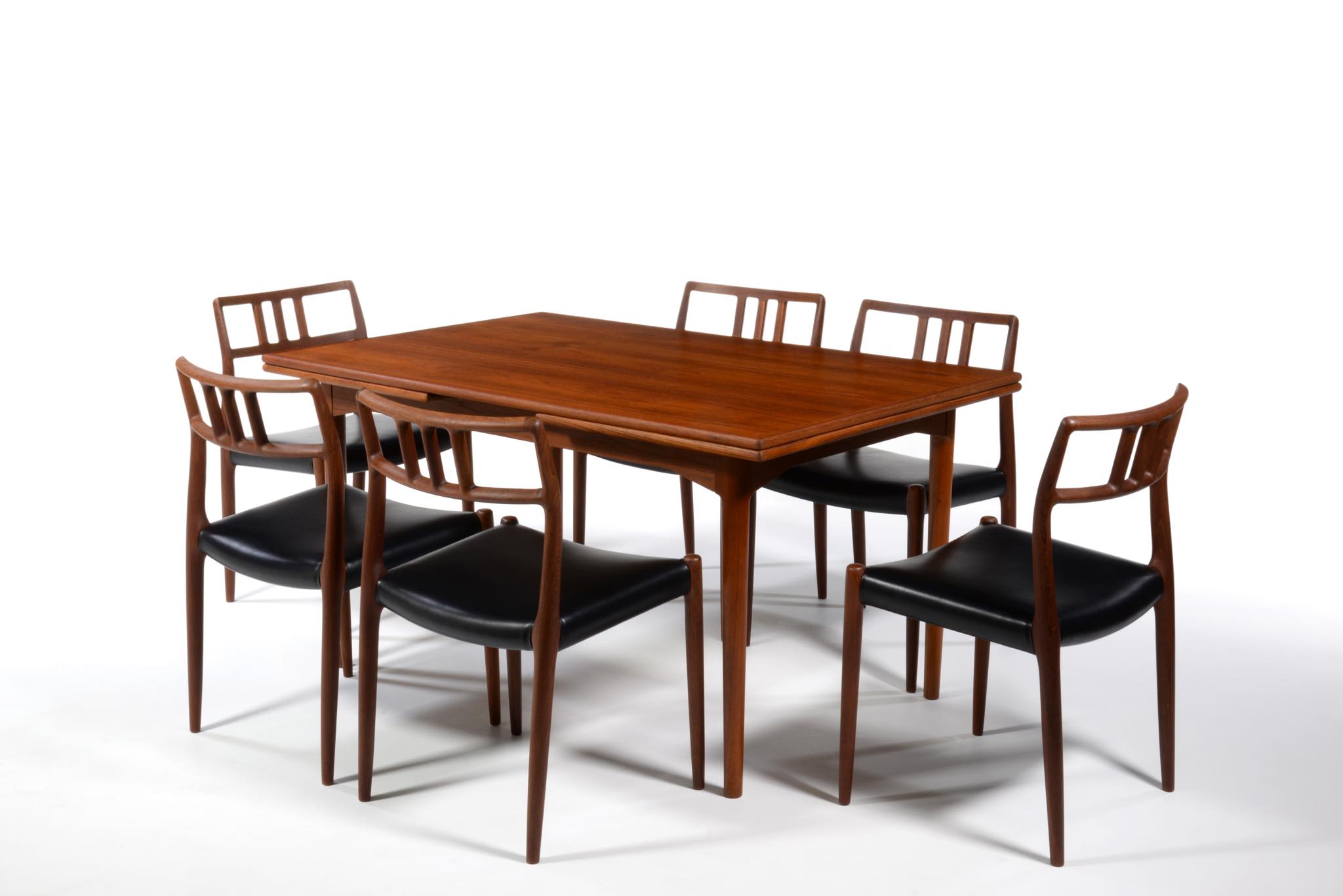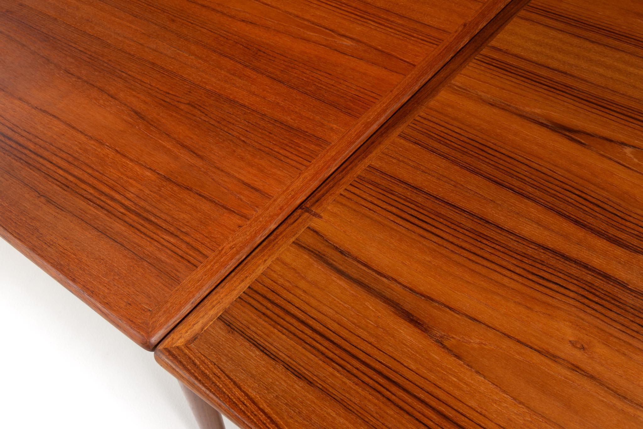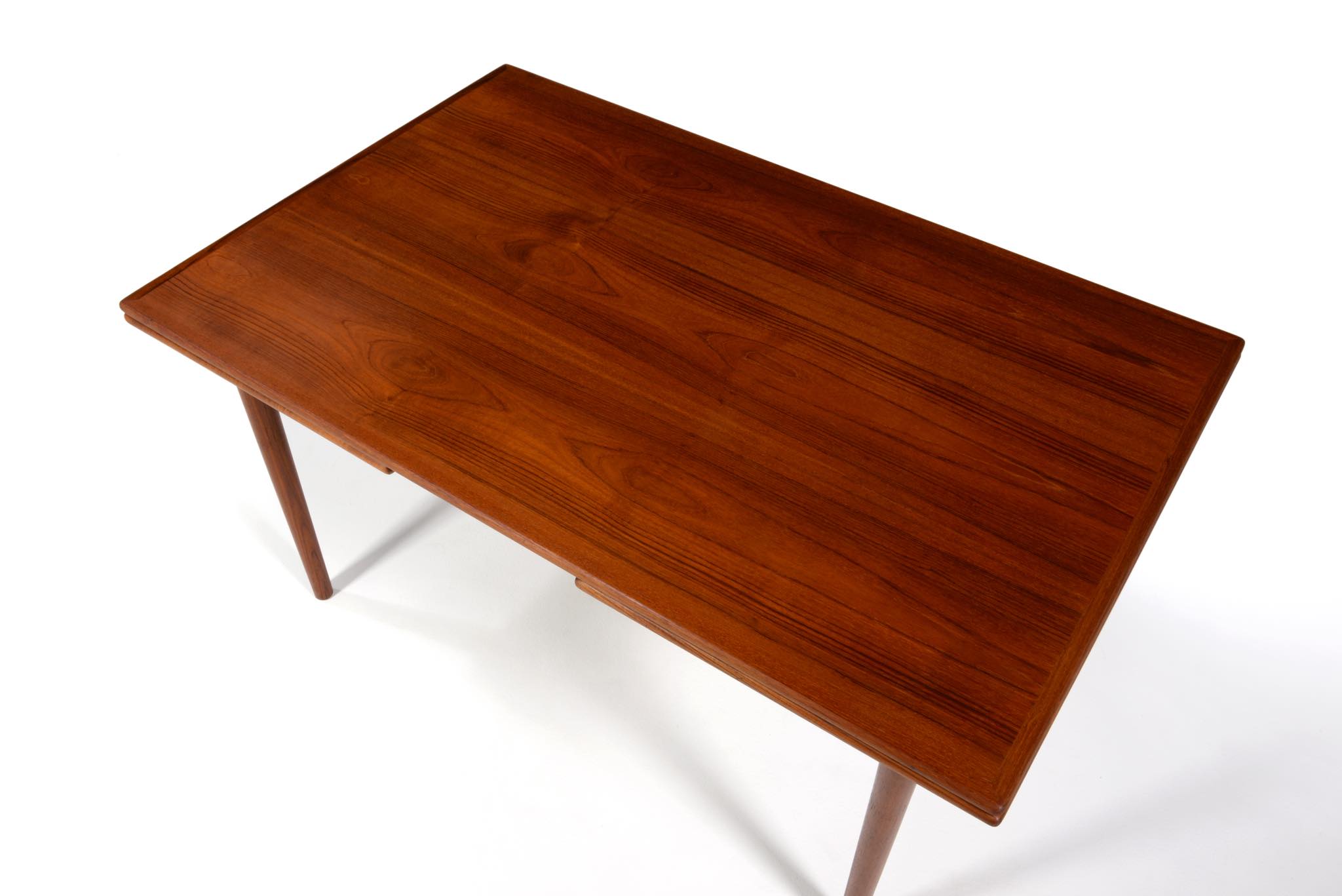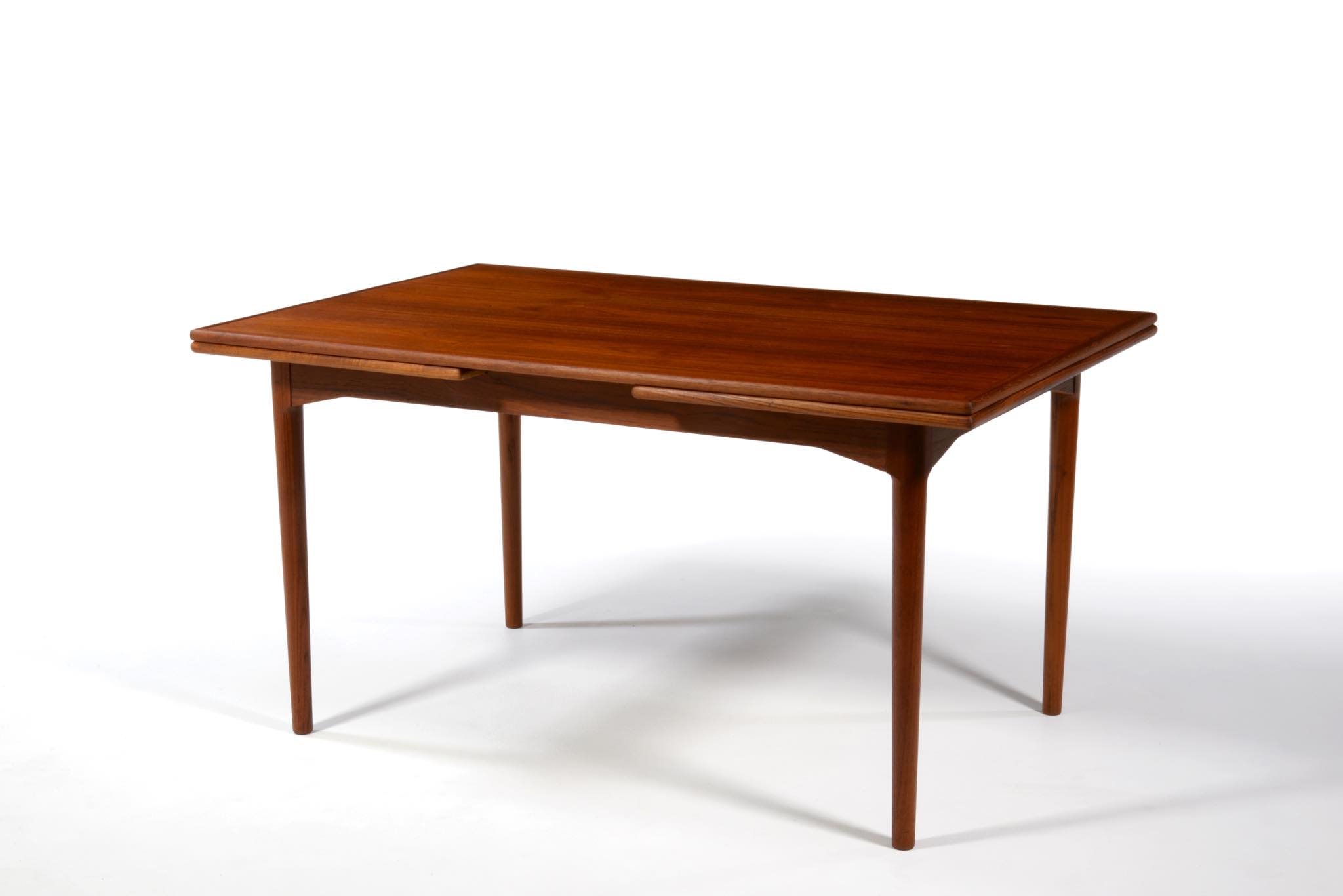デンマークのキャビネットメーカー、Slagelse/スラゲル工房によるチーク材のダイニングテーブルです。1950~60年代頃に作られたものでしょう。良質なチーク材が用いられており、経年によって程よく変色しています。天板はエクステンションリーフが内包されており、天板の面積を拡張することができます。経年変化によってエクステンションリーフを広げた際に主天板との色差が生じます。エクステンションリーフの一部に擦傷がありますが、全体にきれいな状態です。
