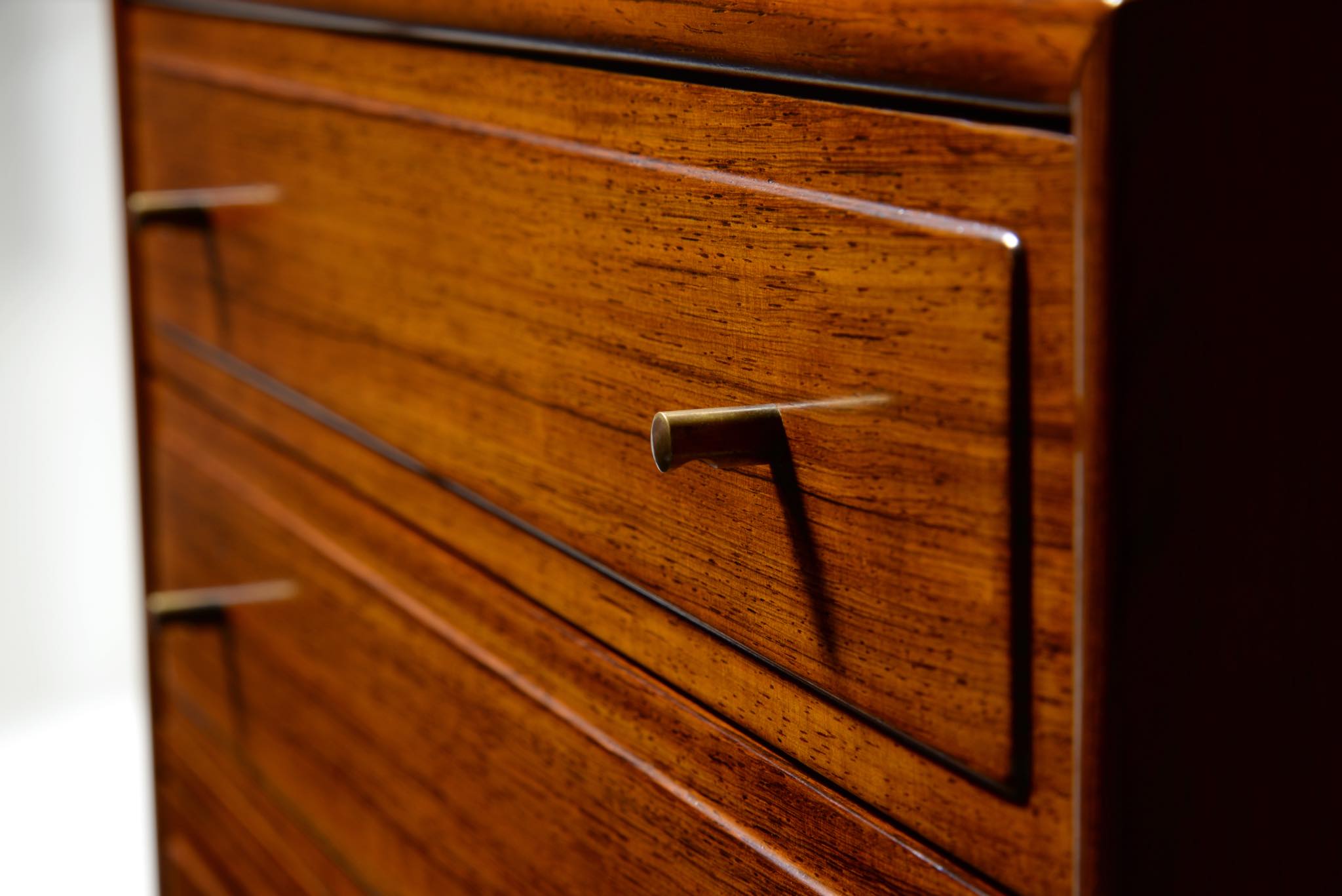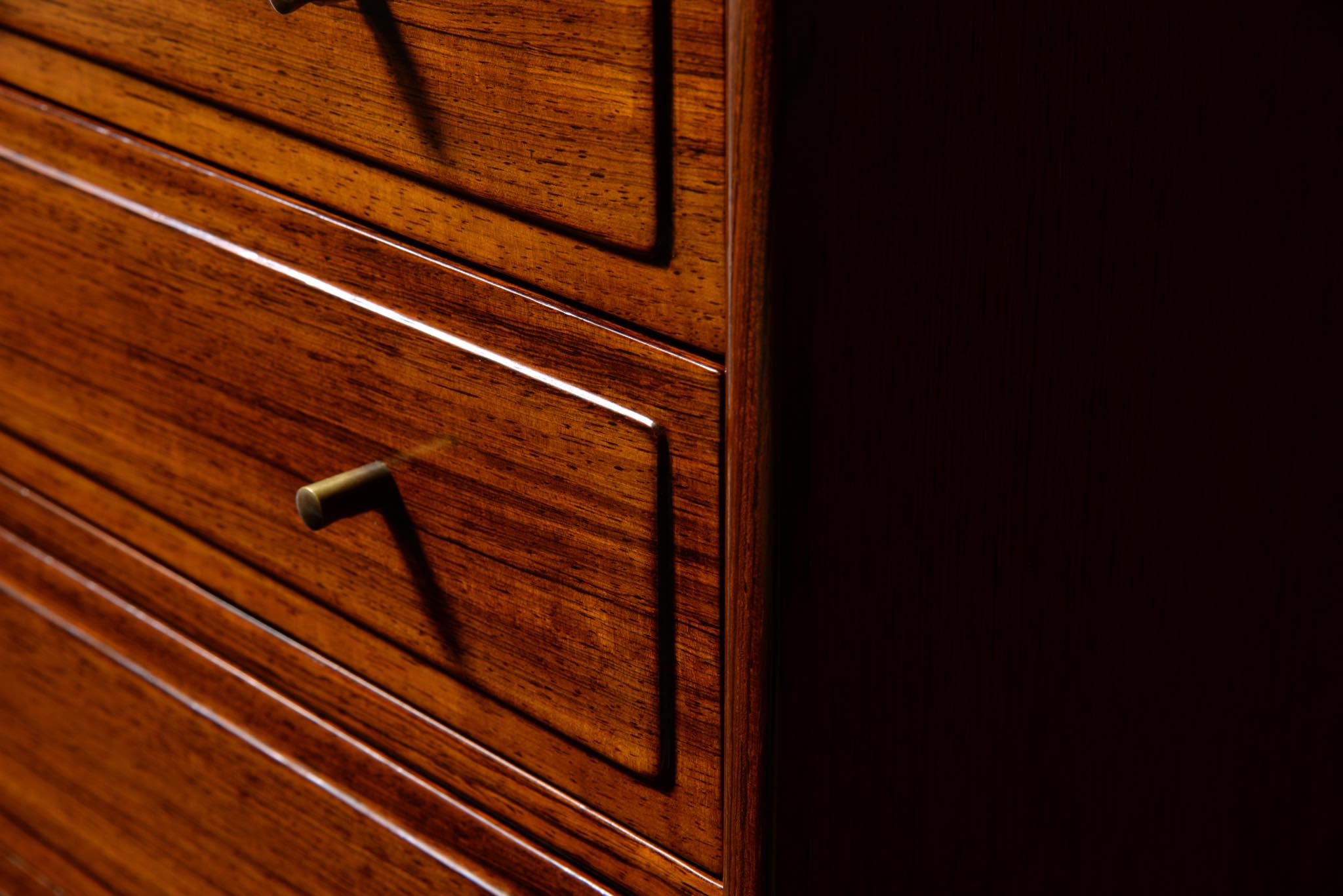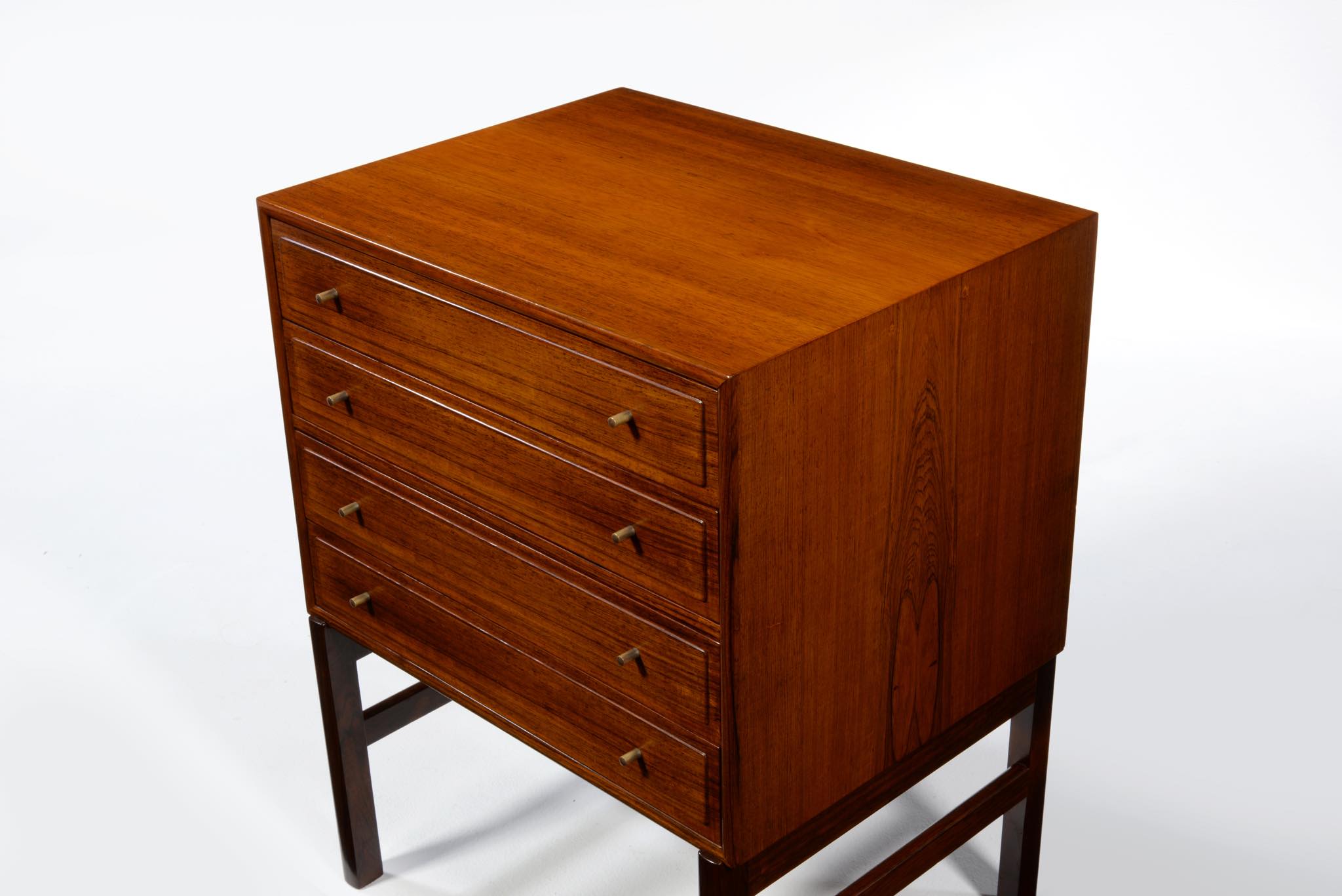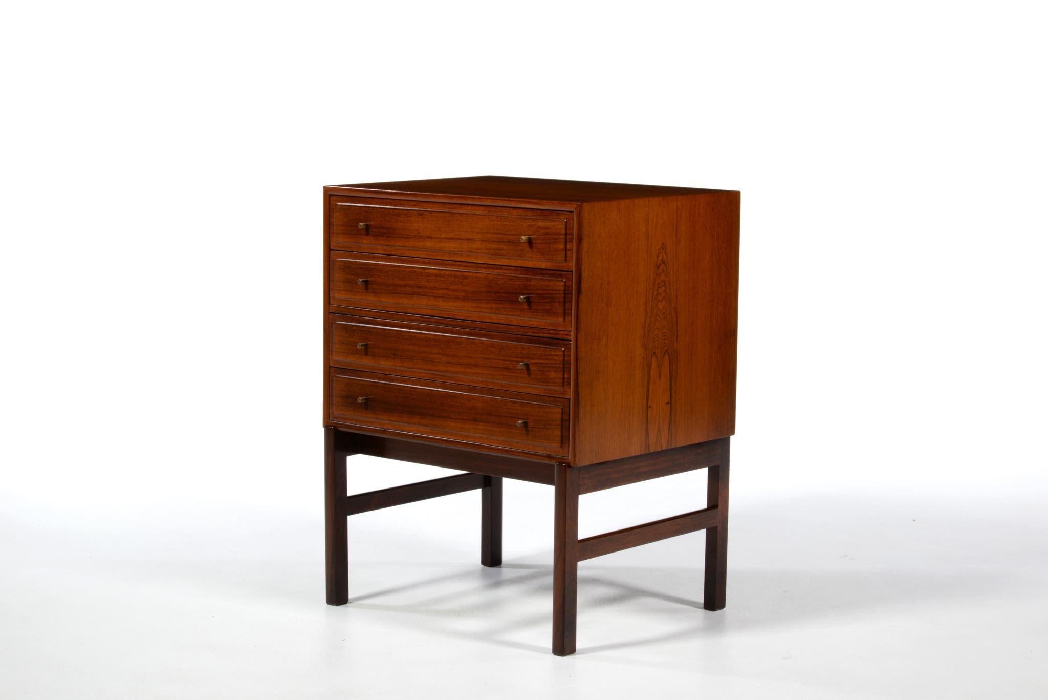20世紀のデンマークを代表する家具デザイナーで、王立アカデミー家具科の主任教授も務めた、Ole Wanscher/オーレ・ヴァンシャーによる名作チェストです。製作は名工A.J. イヴァーセンによるもので、とても丁寧に作られています。このモデルは生産台数が極めて少ないようで、デンマークのヴィンテージ市場に於いてもほとんど見かけることはありません。木目の詰まったブラジリアンローズウッドが用いられており、抽斗の取手は銅か真鍮製のようです。天板に僅かな擦り傷が見られますが、とても綺麗な状態です。