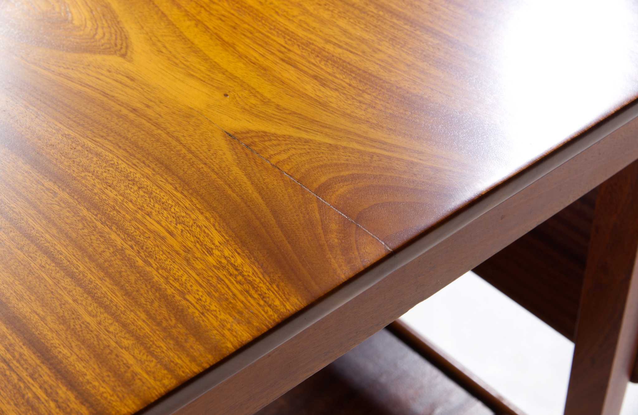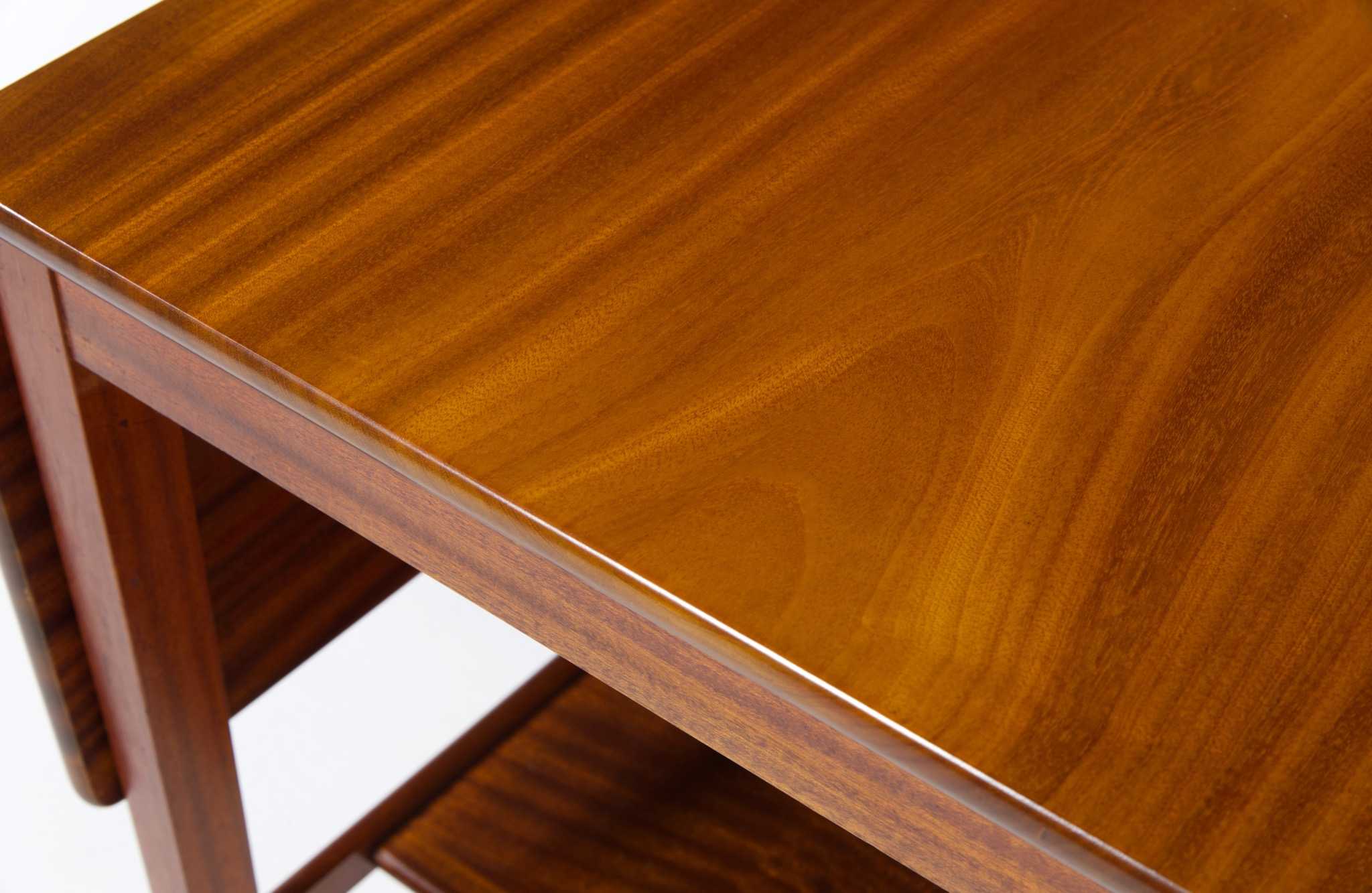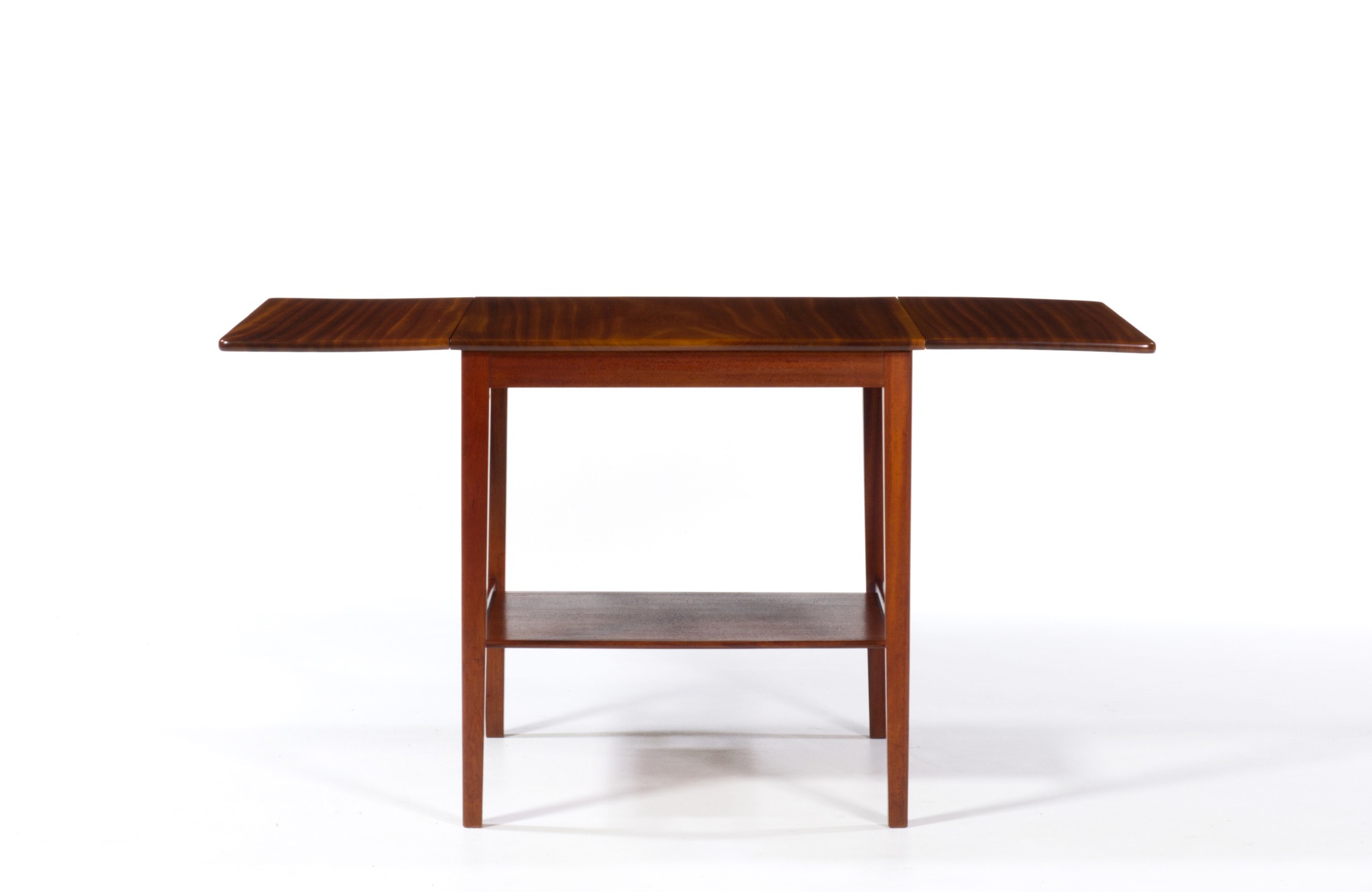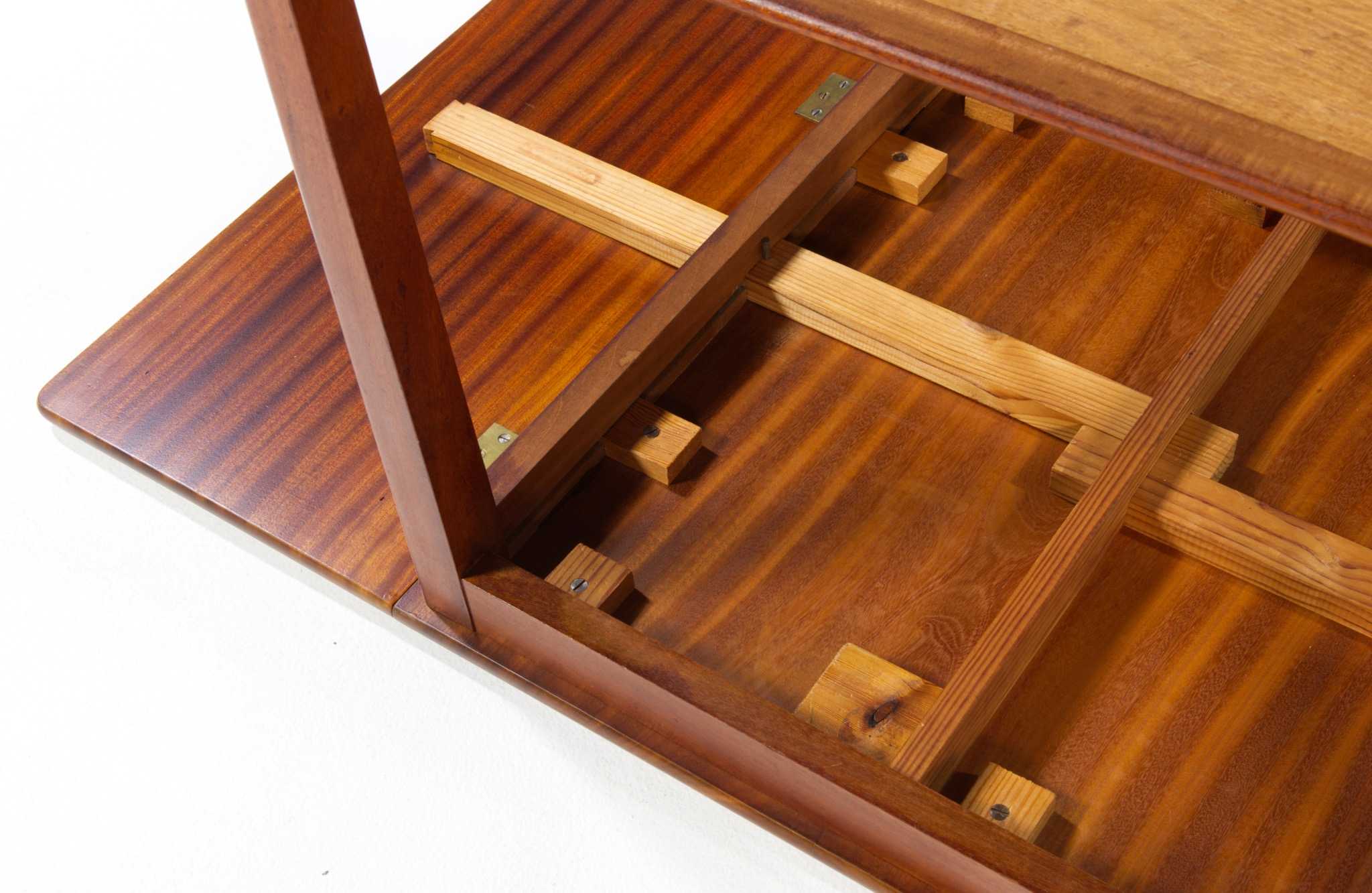 デンマークの家具工房にて1940年代頃に作られたバタフライリーフのコーヒーテーブルです。裏に工房の焼印はあるものの、情報に乏しく詳しいことは判っておりません。天板はとても綺麗な木目文様の現れた無垢材のマホガニーを使っており、主天板は二枚剥ぎ、リーフは一枚板を用いています。主天板の剥ぎの一方に、無垢材故の乾燥による隙間が生じたようで、古くに埋め木による補修がなされています。また、リーフは無垢故の僅かな反りが見られますが、全体に綺麗な状態です。