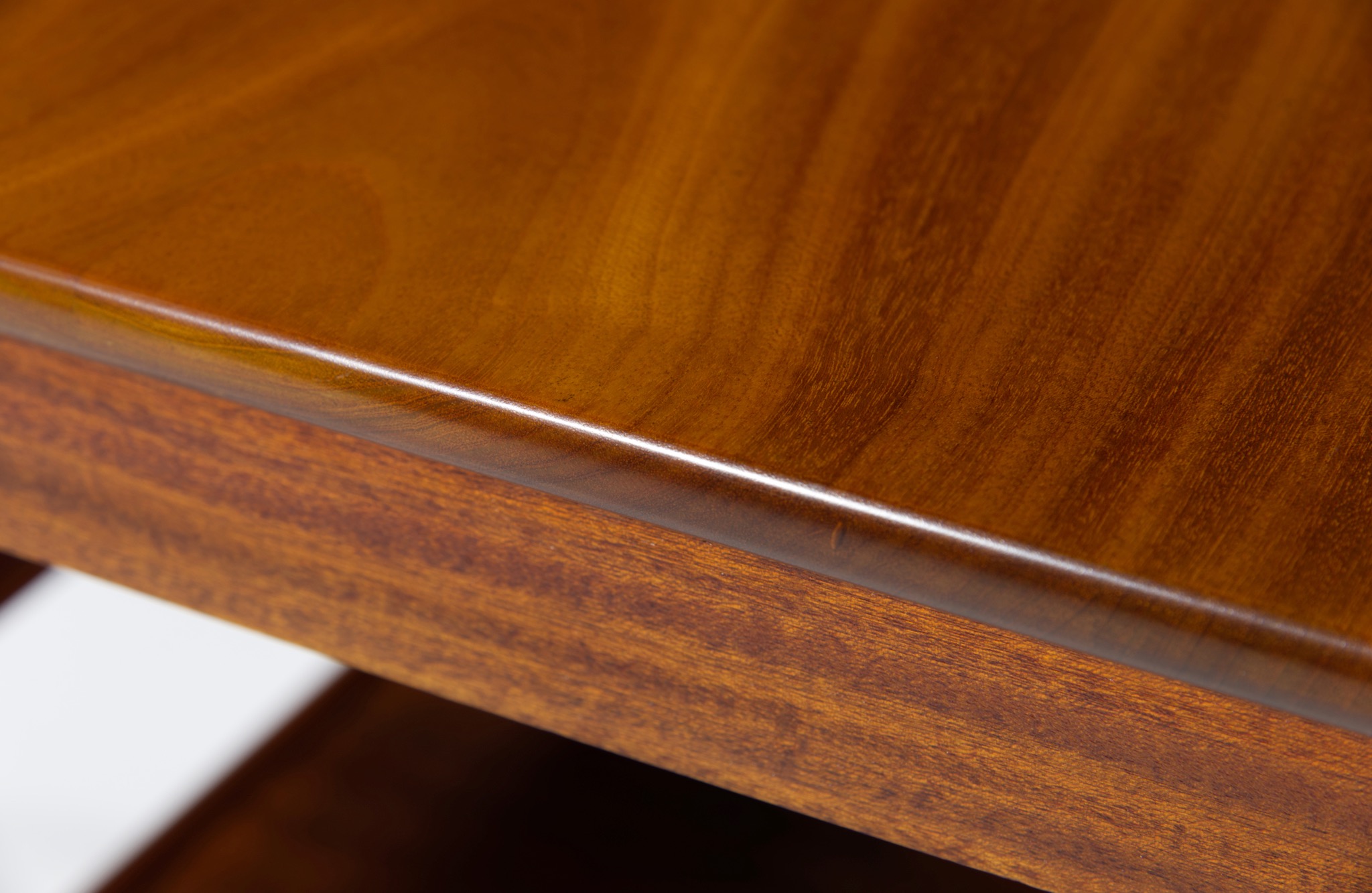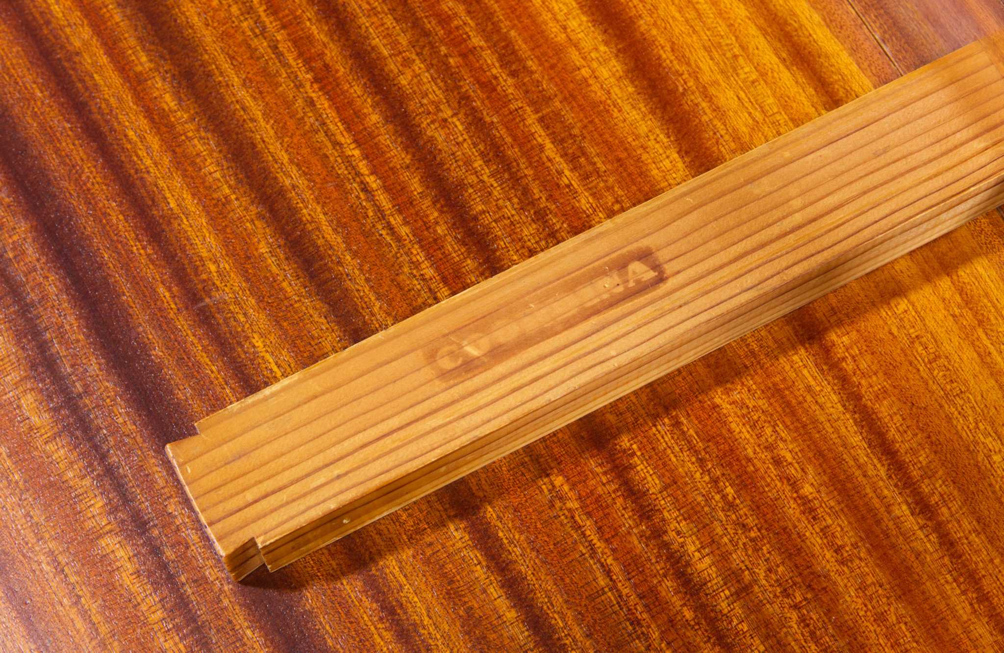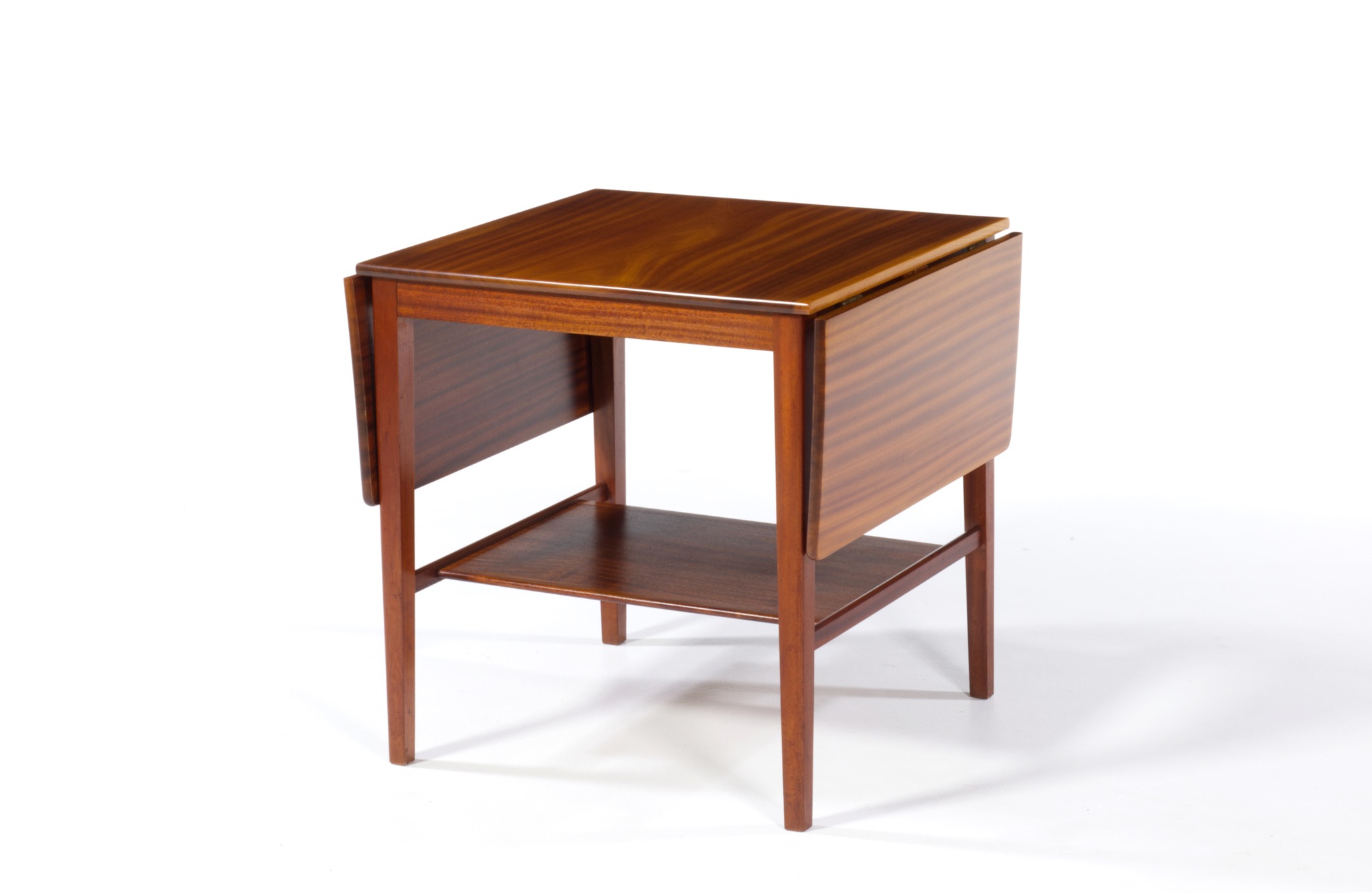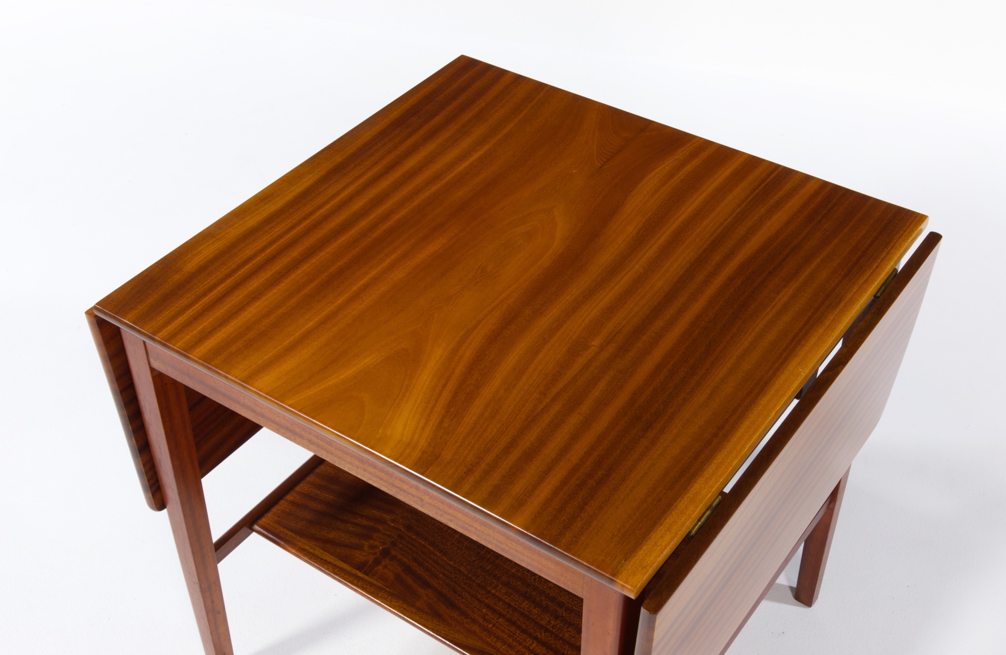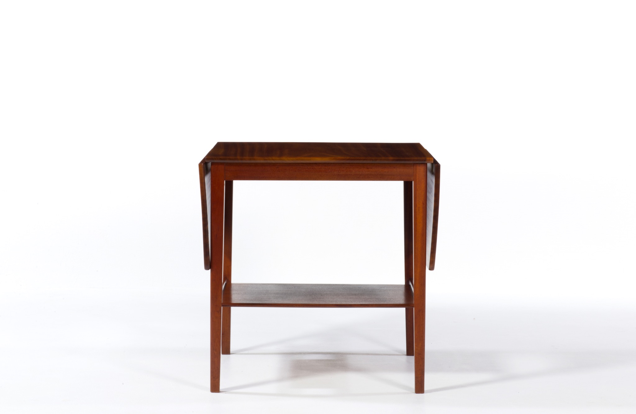 デンマークの家具工房にて1940年代頃に作られたバタフライリーフのコーヒーテーブルです。裏に工房の焼印はあるものの、情報に乏しく詳しいことは判っておりません。天板はとても綺麗な木目文様の現れた無垢材のマホガニーを使っており、主天板は二枚剥ぎ、リーフは一枚板を用いています。主天板の剥ぎの一方に、無垢材故の乾燥による隙間が生じたようで、古くに埋め木による補修がなされています。また、リーフは無垢故の僅かな反りが見られますが、全体に綺麗な状態です。