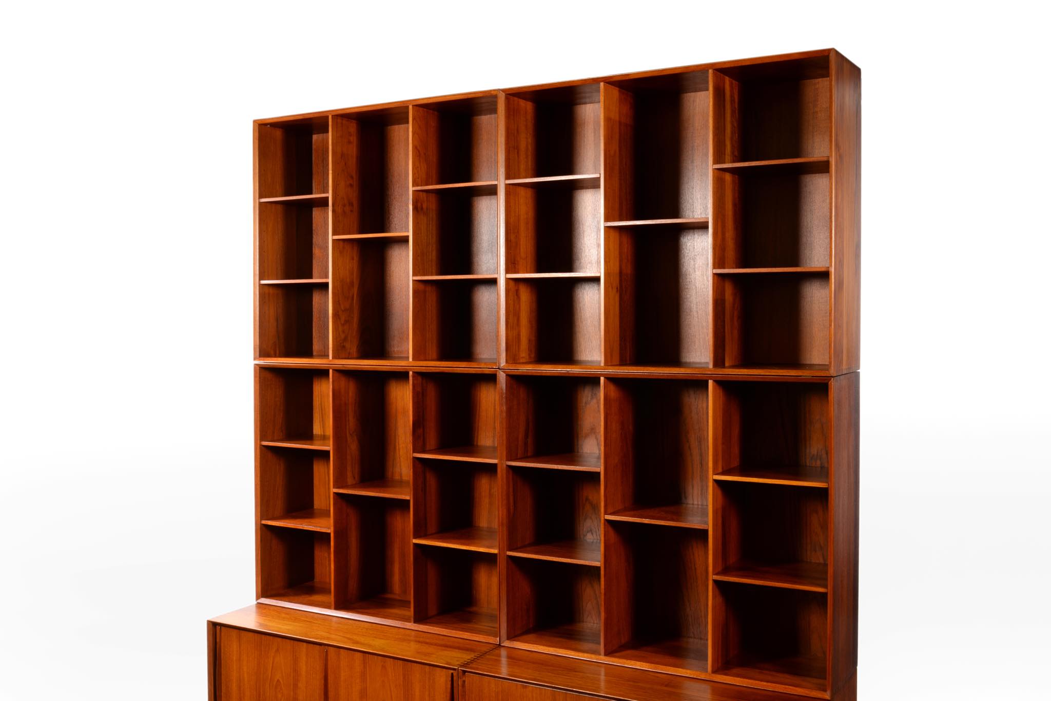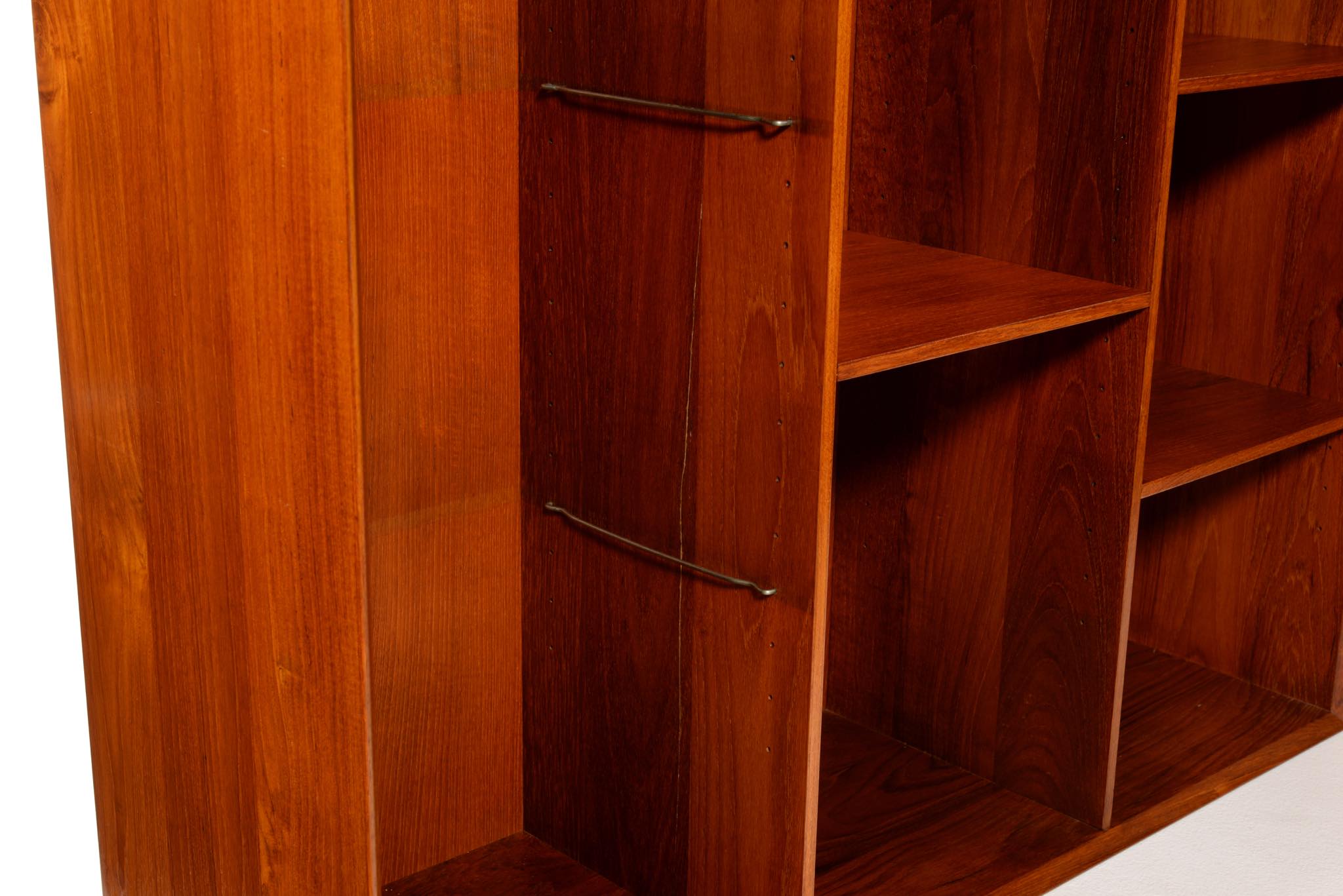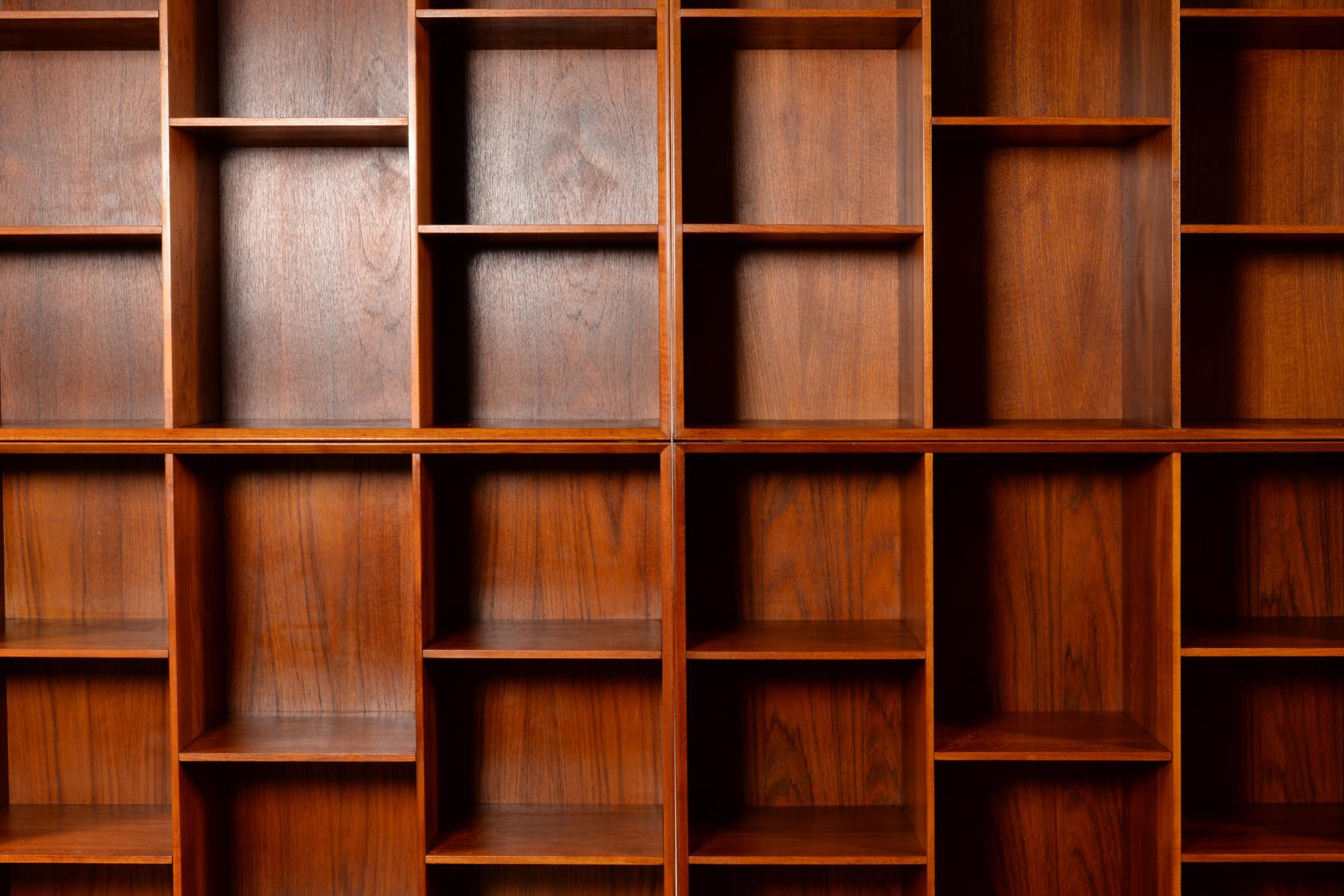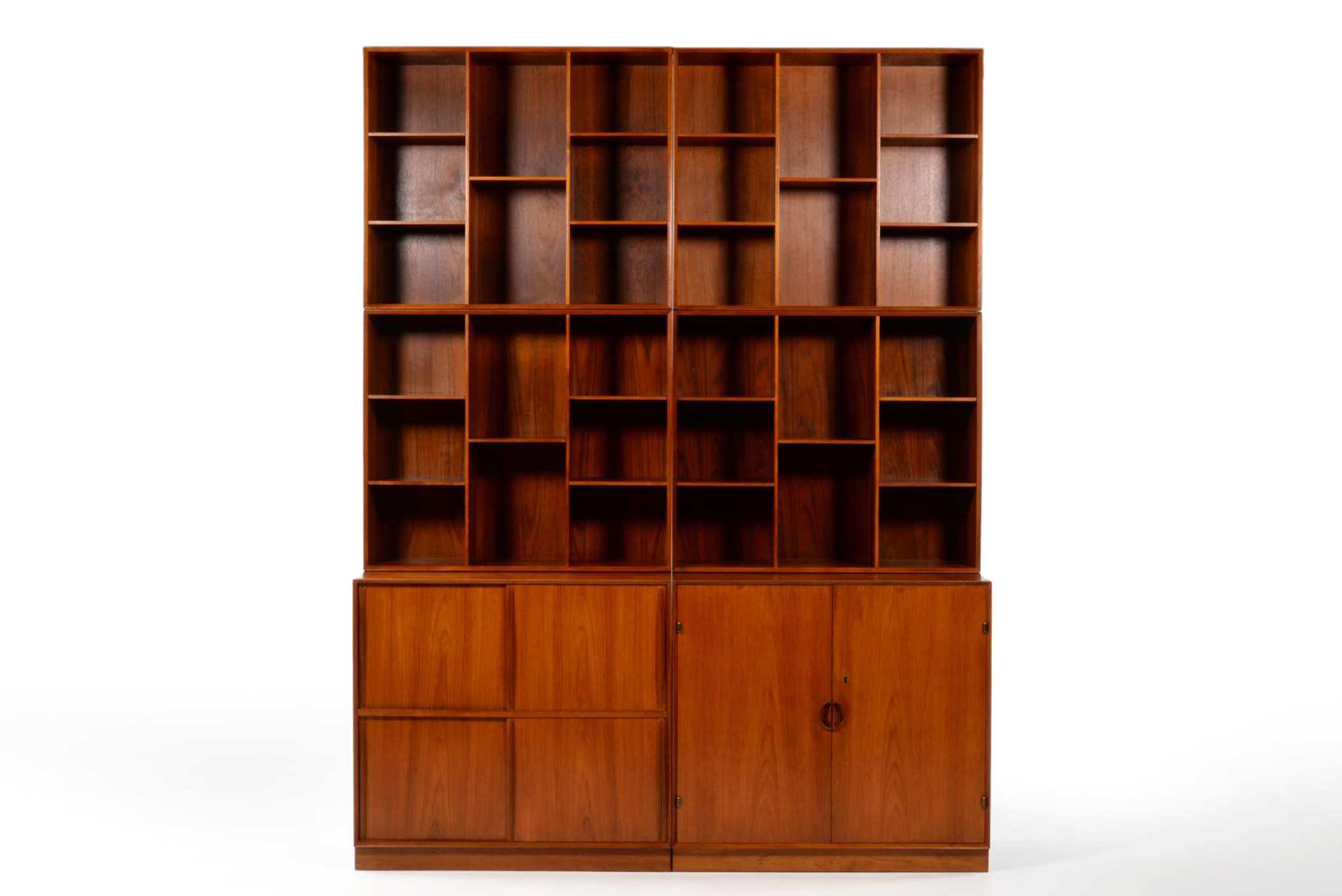 1950年代に活躍したデンマークのデザイナーユニット、Peter Hvidt/ピーター・ヴィッツとOrla Mølgaard Nielsen/オルラ・ミュルゴー・ニールセンによるブックケースキャビネットです。タイ国原産と思しき良質なチーク無垢材を用いたシリーズのもので、それぞれ異なる扉を有する2棹のキャビネットに4棹のシェルフ、計6点のセットです。4棹のシェルフは一部小さな補修がございますが、日焼けも少なく、概ね状態は良いようです。キャビネットとシェルフはそれぞれが独立したものなので、各々を別な部屋で使用することも可能です。その際の台輪(ベース部分)を作成することも可能です。また、シェルフを壁へ取り付けるための金具がございますので、必要な際にはお申し付けください。各サイズやコンディションなど、詳細についてはお問い合わせください。