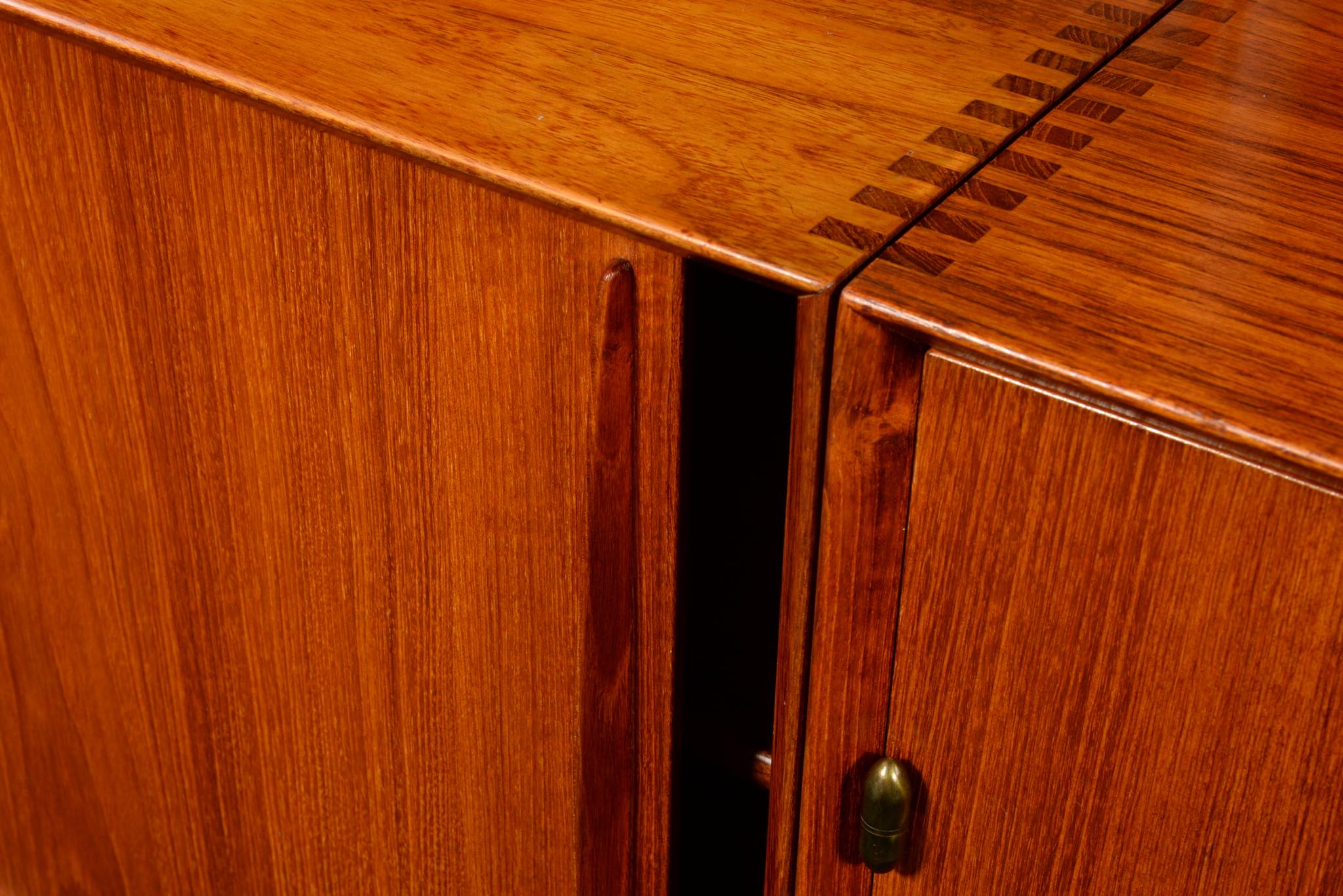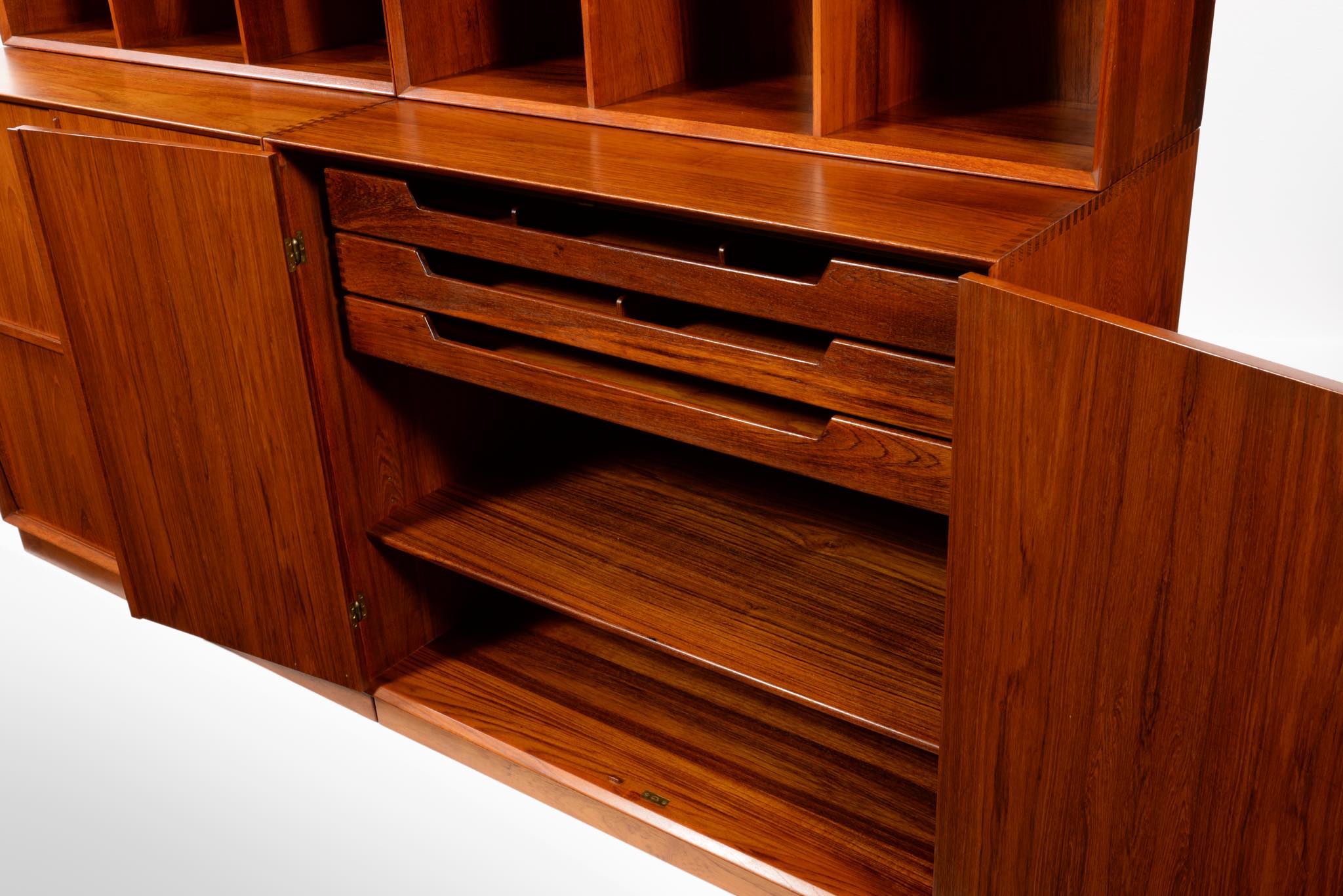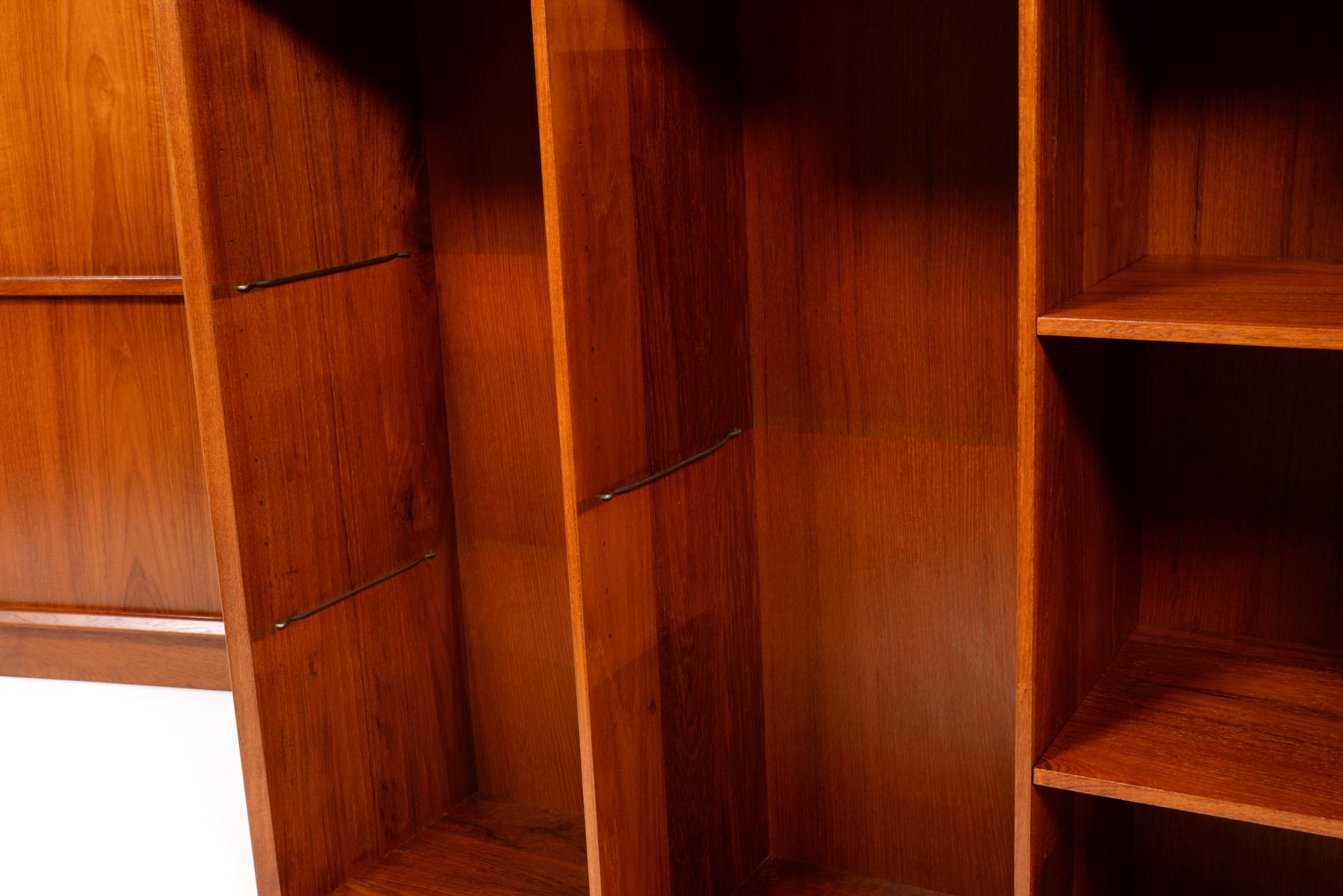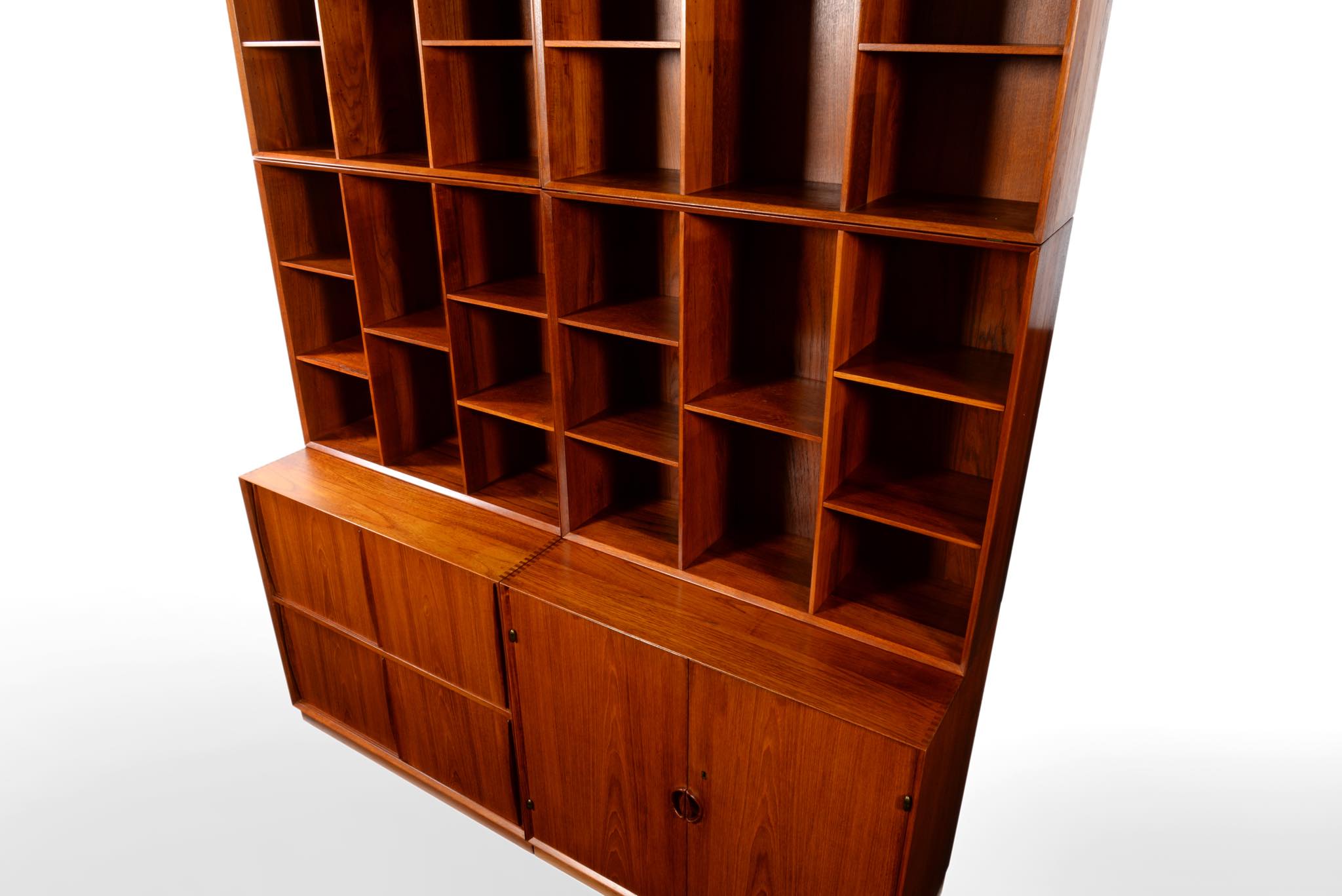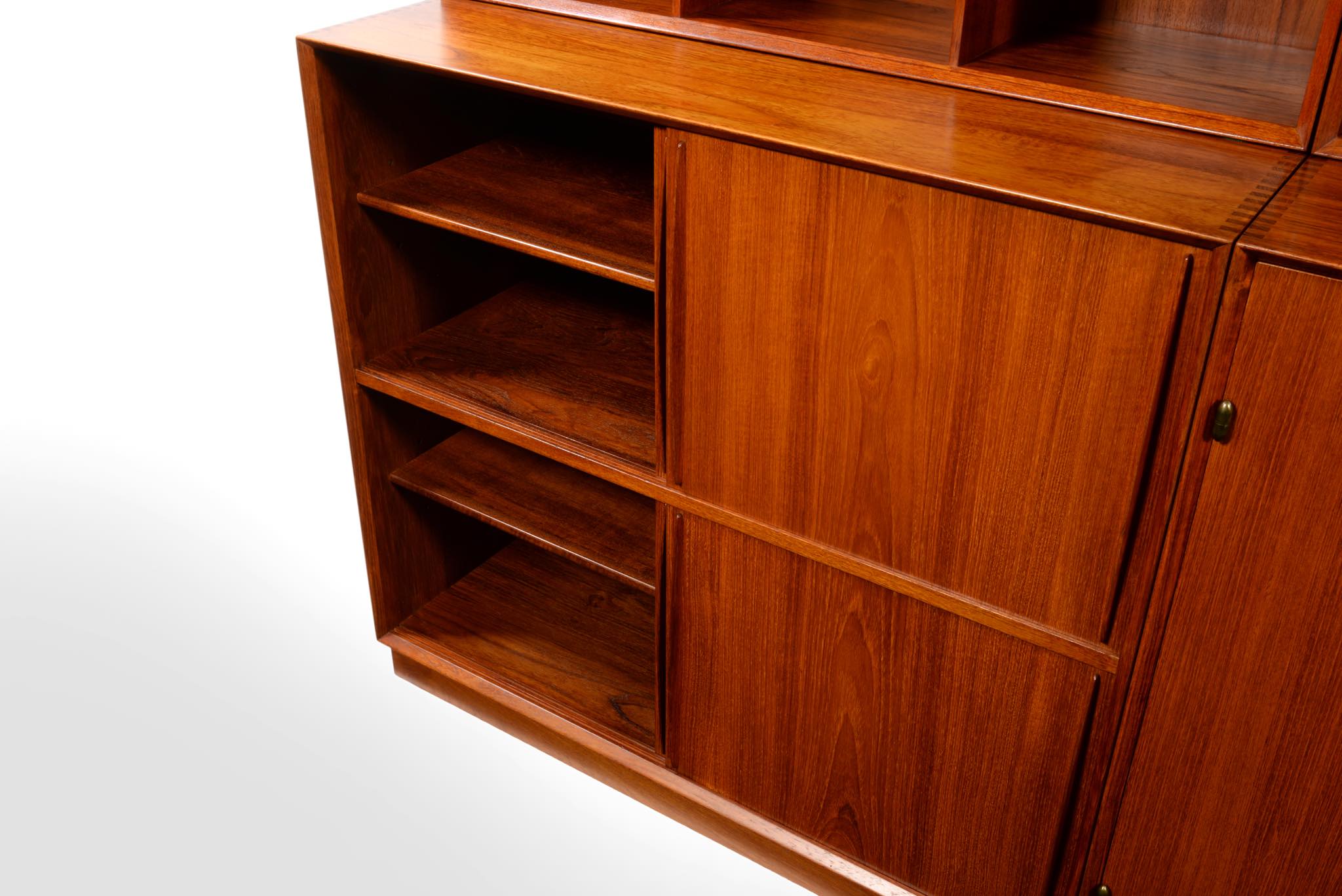 1950年代に活躍したデンマークのデザイナーユニット、Peter Hvidt/ピーター・ヴィッツとOrla Mølgaard Nielsen/オルラ・ミュルゴー・ニールセンによるブックケースキャビネットです。タイ国原産と思しき良質なチーク無垢材を用いたシリーズのもので、それぞれ異なる扉を有する2棹のキャビネットに4棹のシェルフ、計6点のセットです。4棹のシェルフは一部小さな補修がございますが、日焼けも少なく、概ね状態は良いようです。キャビネットとシェルフはそれぞれが独立したものなので、各々を別な部屋で使用することも可能です。その際の台輪(ベース部分)を作成することも可能です。また、シェルフを壁へ取り付けるための金具がございますので、必要な際にはお申し付けください。各サイズやコンディションなど、詳細についてはお問い合わせください。