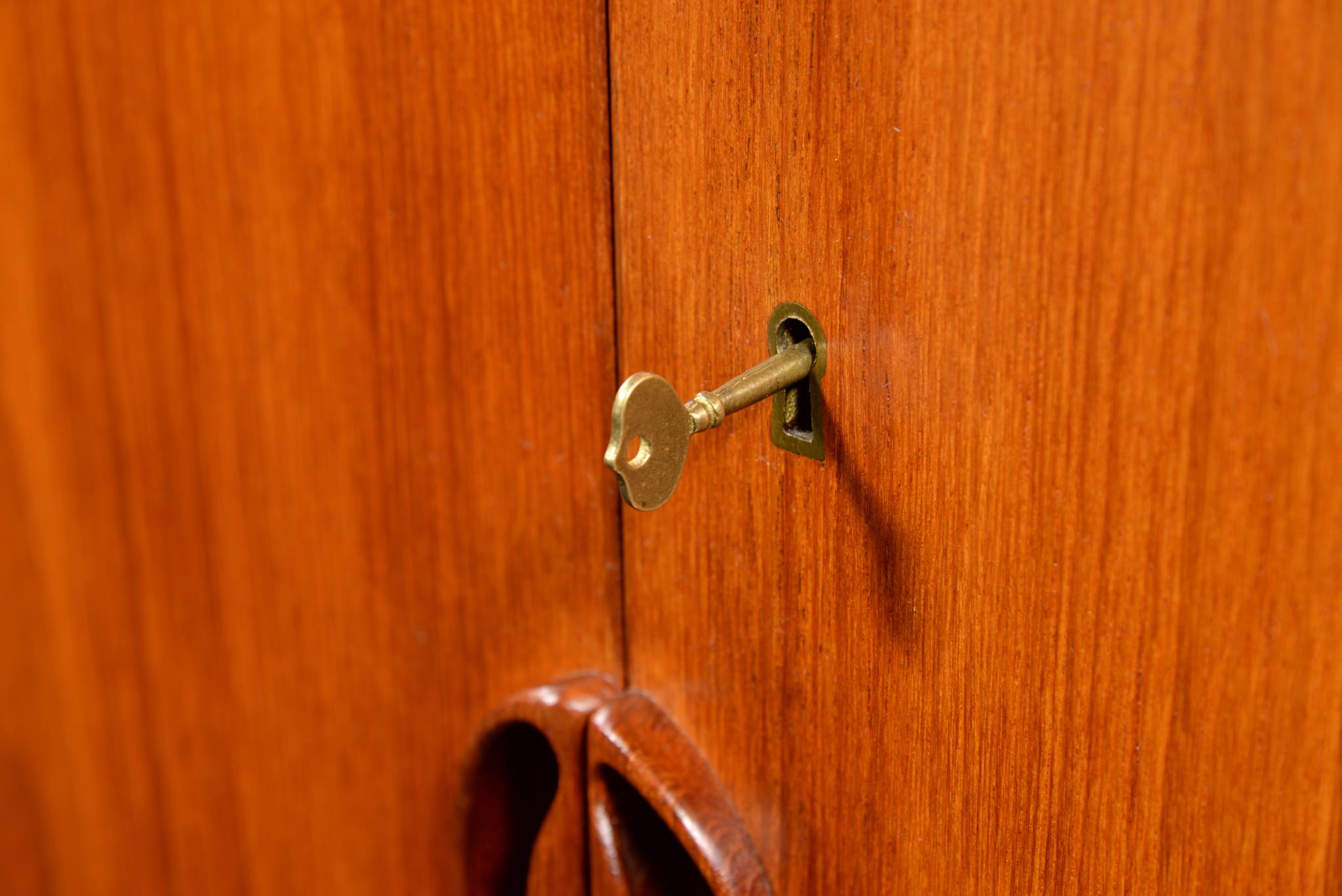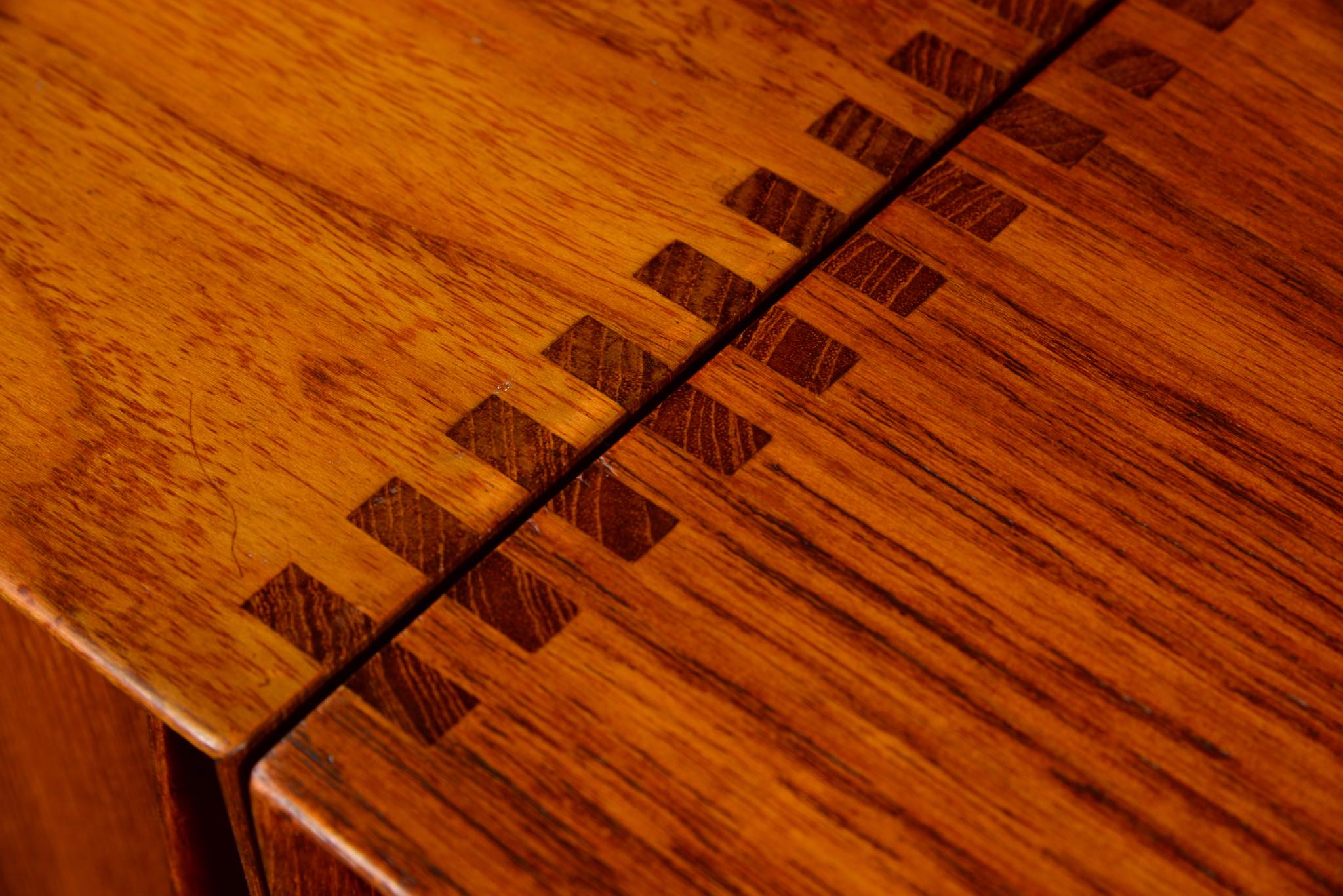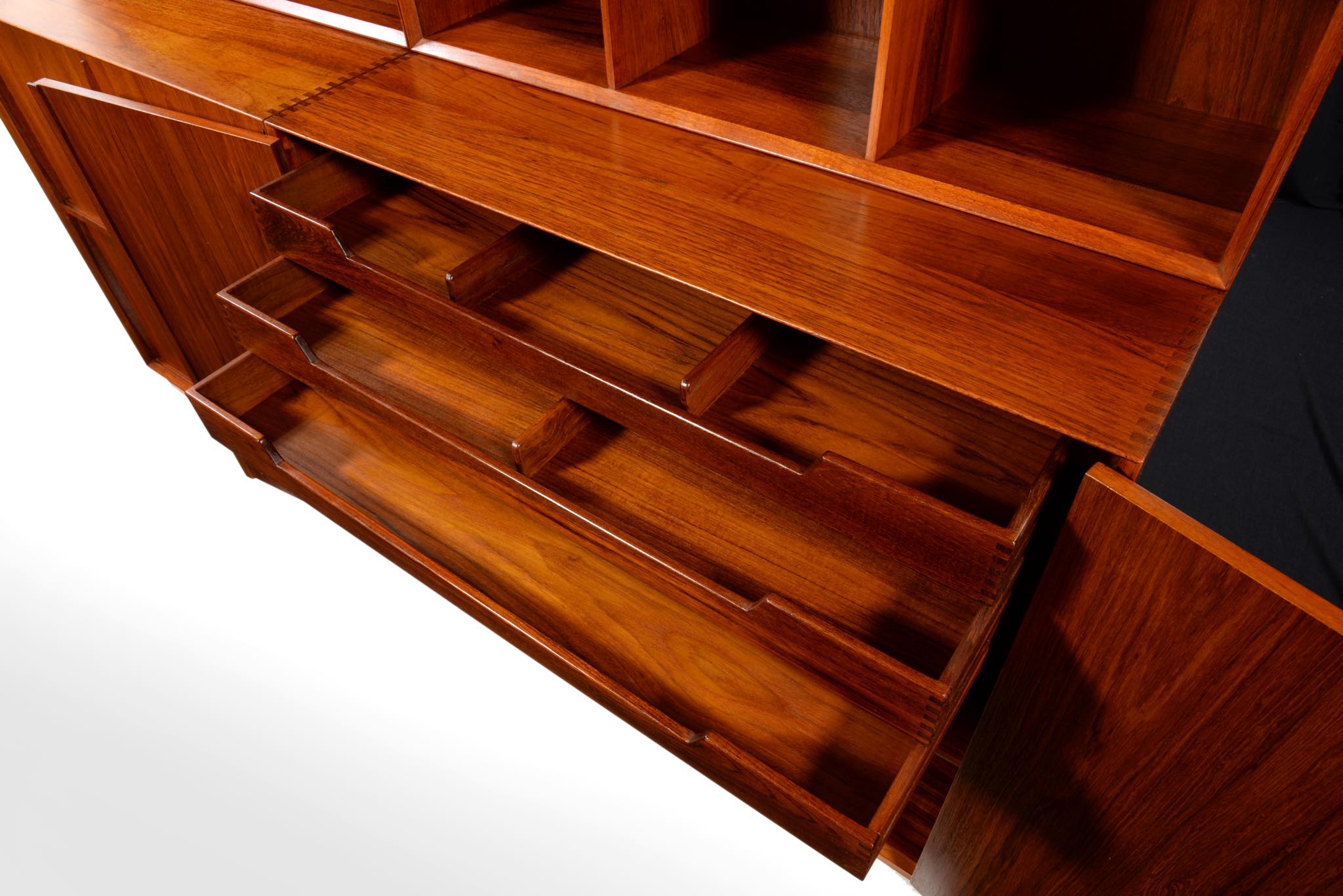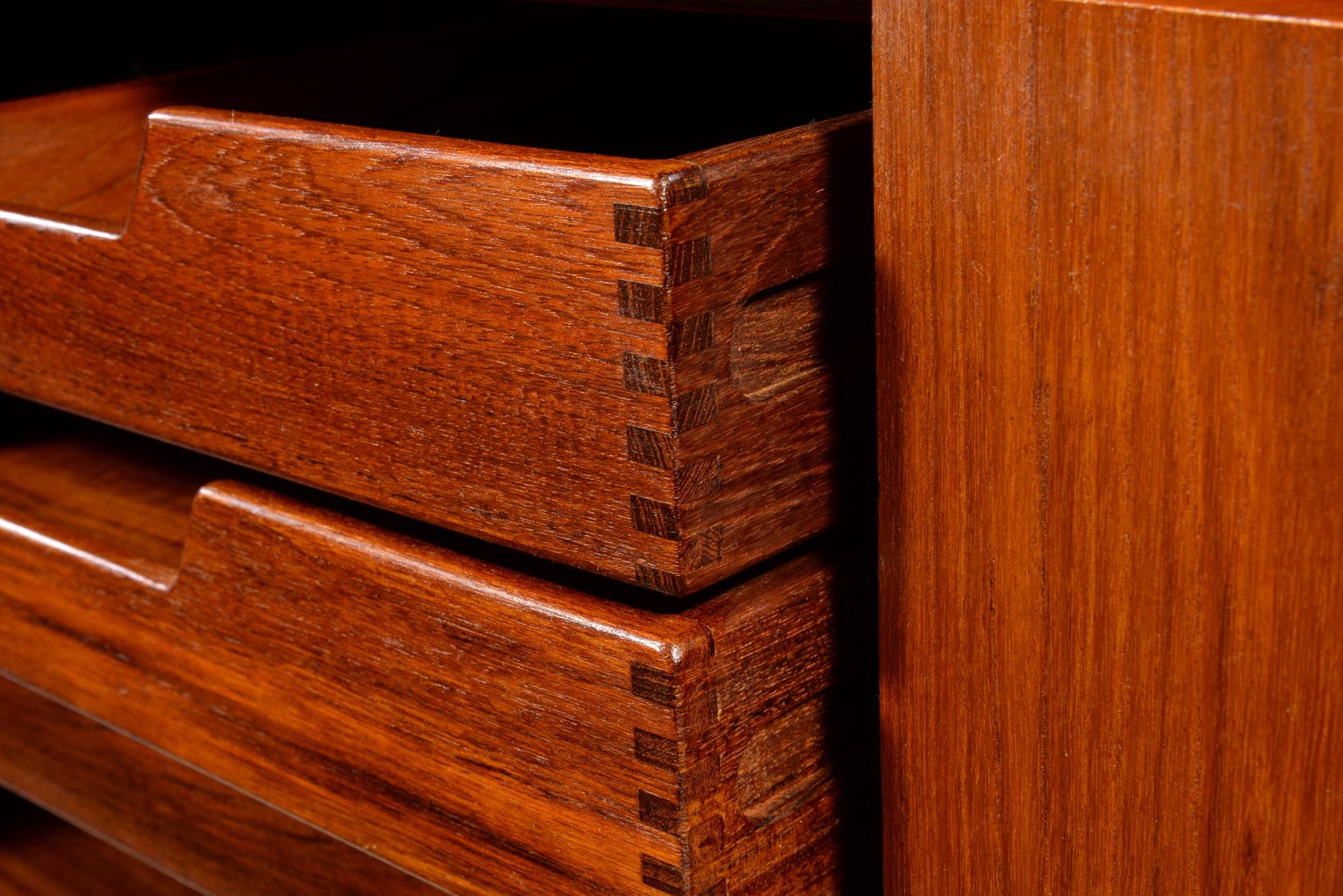 1950年代に活躍したデンマークのデザイナーユニット、Peter Hvidt/ピーター・ヴィッツとOrla Mølgaard Nielsen/オルラ・ミュルゴー・ニールセンによるブックケースキャビネットです。タイ国原産と思しき良質なチーク無垢材を用いたシリーズのもので、それぞれ異なる扉を有する2棹のキャビネットに4棹のシェルフ、計6点のセットです。4棹のシェルフは一部小さな補修がございますが、日焼けも少なく、概ね状態は良いようです。キャビネットとシェルフはそれぞれが独立したものなので、各々を別な部屋で使用することも可能です。その際の台輪(ベース部分)を作成することも可能です。また、シェルフを壁へ取り付けるための金具がございますので、必要な際にはお申し付けください。各サイズやコンディションなど、詳細についてはお問い合わせください。