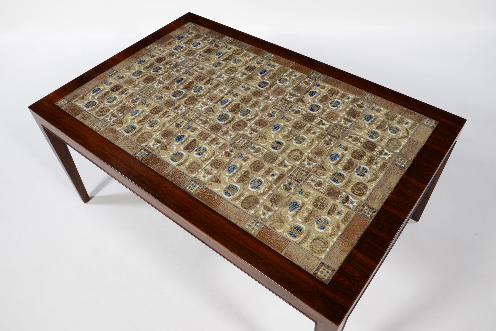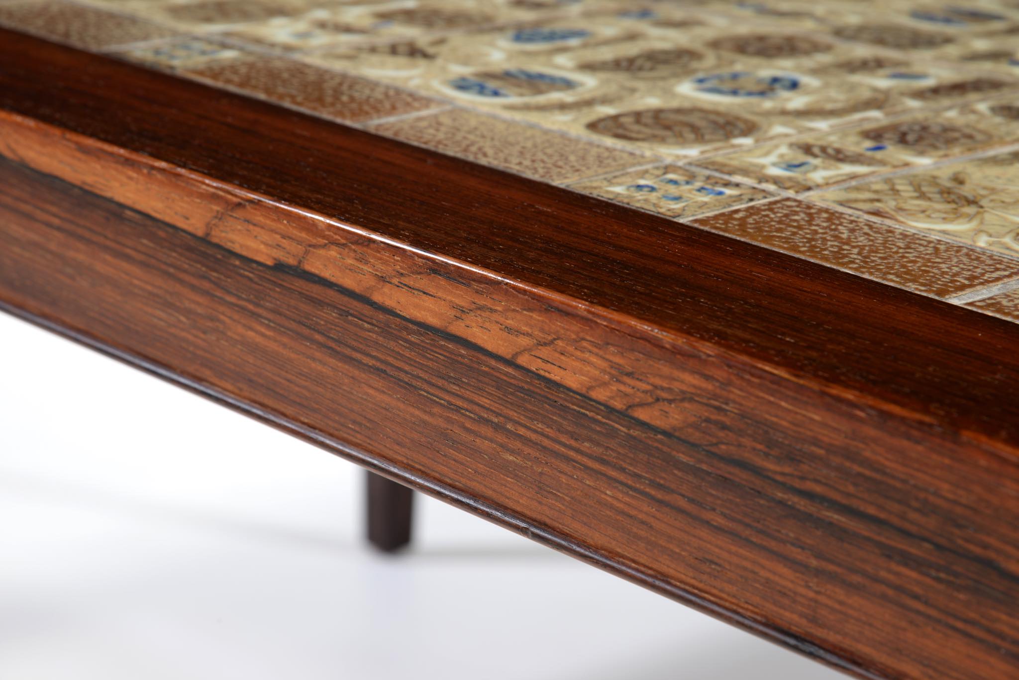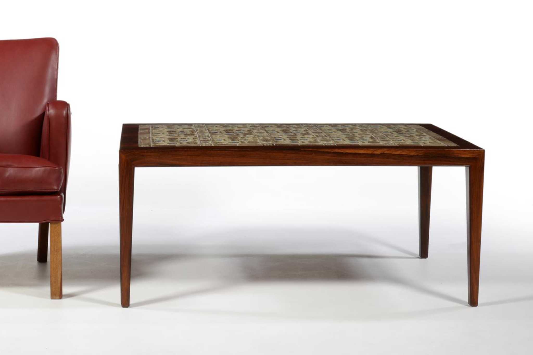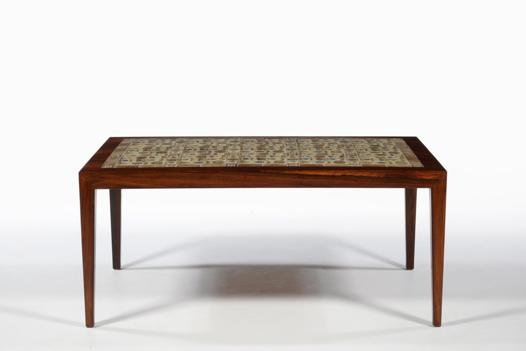 Severin Hansen Jr./セヴェリン・ハンセン・Jr によってデザインされたテーブルに、ロイヤルコペンハーゲン窯のチーフデザイナー、Nils Thorsson/ニルス・トーソンによるタイル ”BACA” を象嵌したコーヒーテーブルです。テーブルの本体にはローズウッド材が用いられています。当時は様々なサイズやディテール違いが展開されていたようで、こちらのテーブルは脚や天板の内郭に突帯を備えたクラシックな趣のタイプとなります。経年によって天板が僅かに山形に反っておりますが、通常使用には差し支えない程度です。このモデルは天板がこのように反りやすい性質にあるようで、多くの製品に見受けられます。その他、コンディションは良好です。
