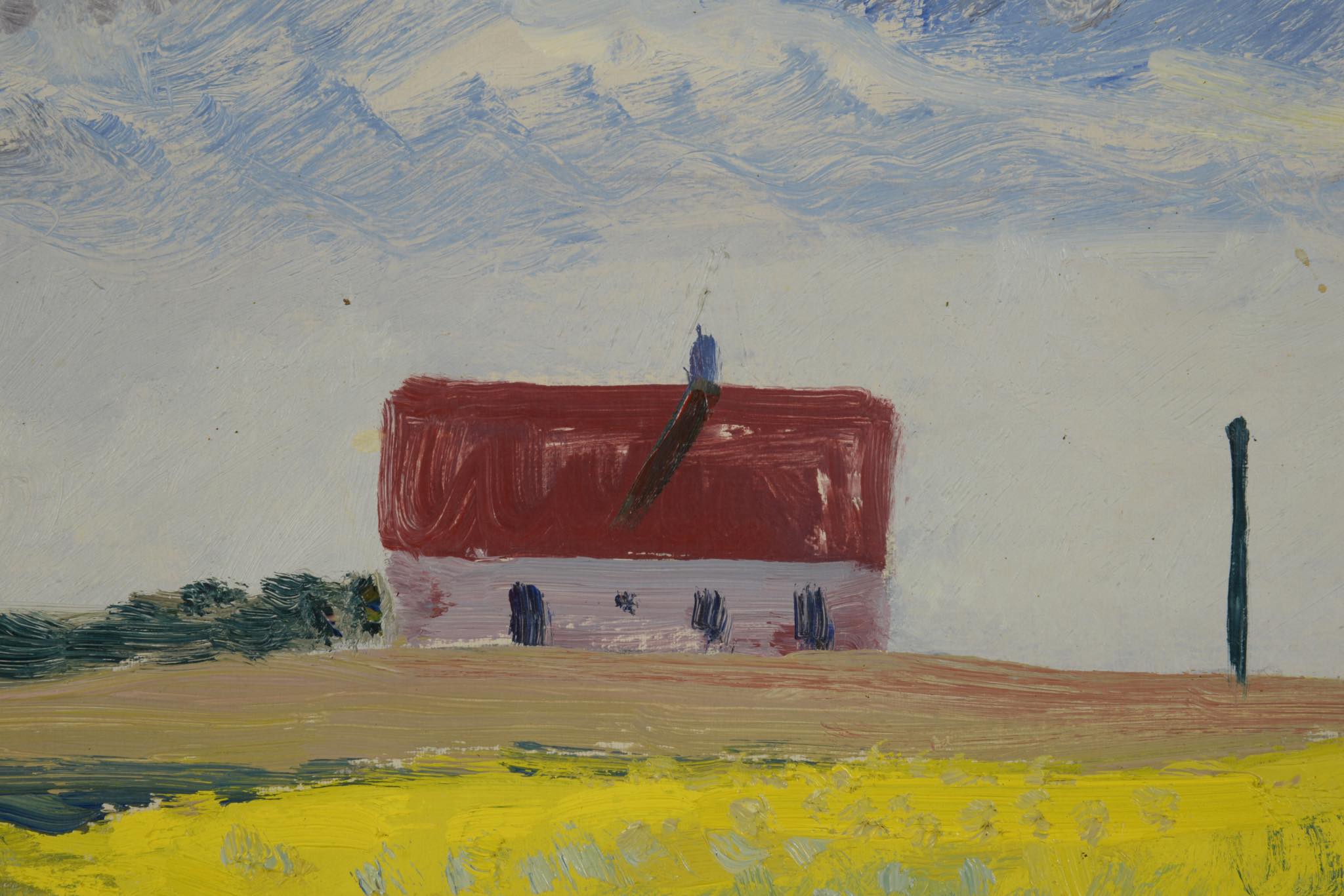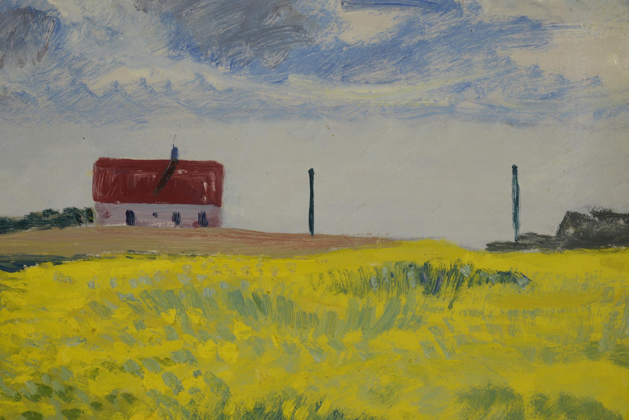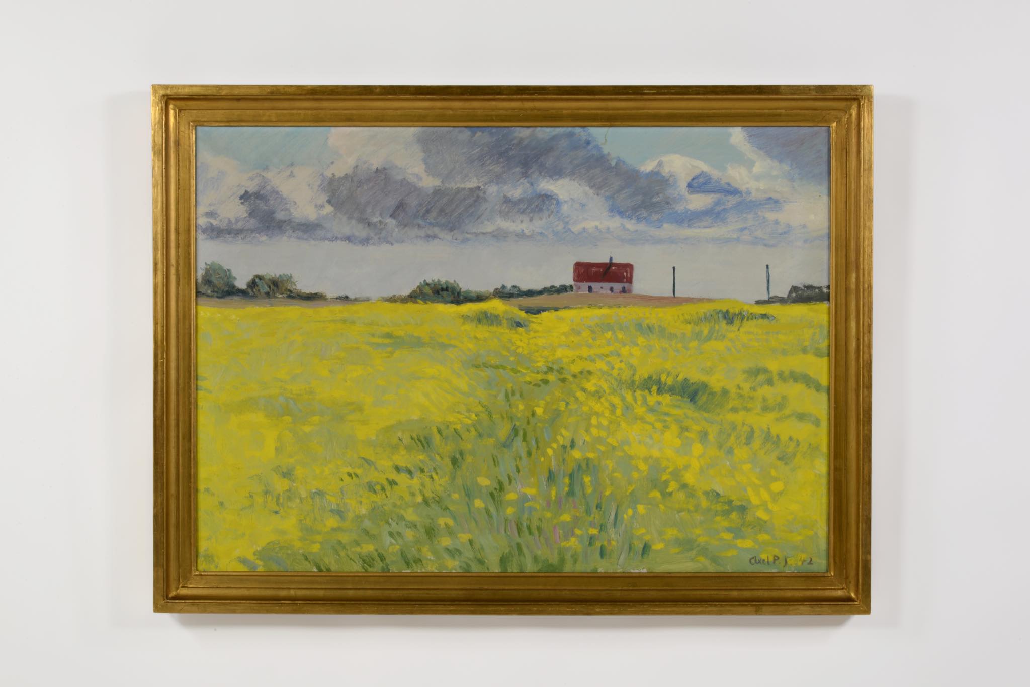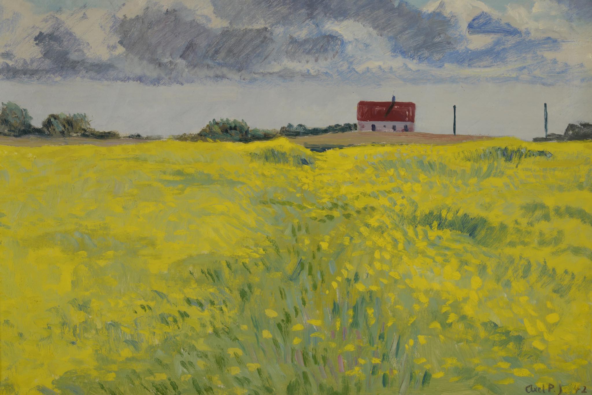 デンマークの画家、Axel P. Jensen/アクセル・P・イェンセンによる風景画作品です。デンマークがナチス占領下にあった1942年に描かれたもので、コペンハーゲンから10キロほど北上したVirum地区、Holmeparken15番地からの眺めを描いた作品と思われ、菜の花が辺り一面に咲き乱れています。金箔のフレームはオリジナルのようで、経年感や小傷等見られますがコンディションは良好です。