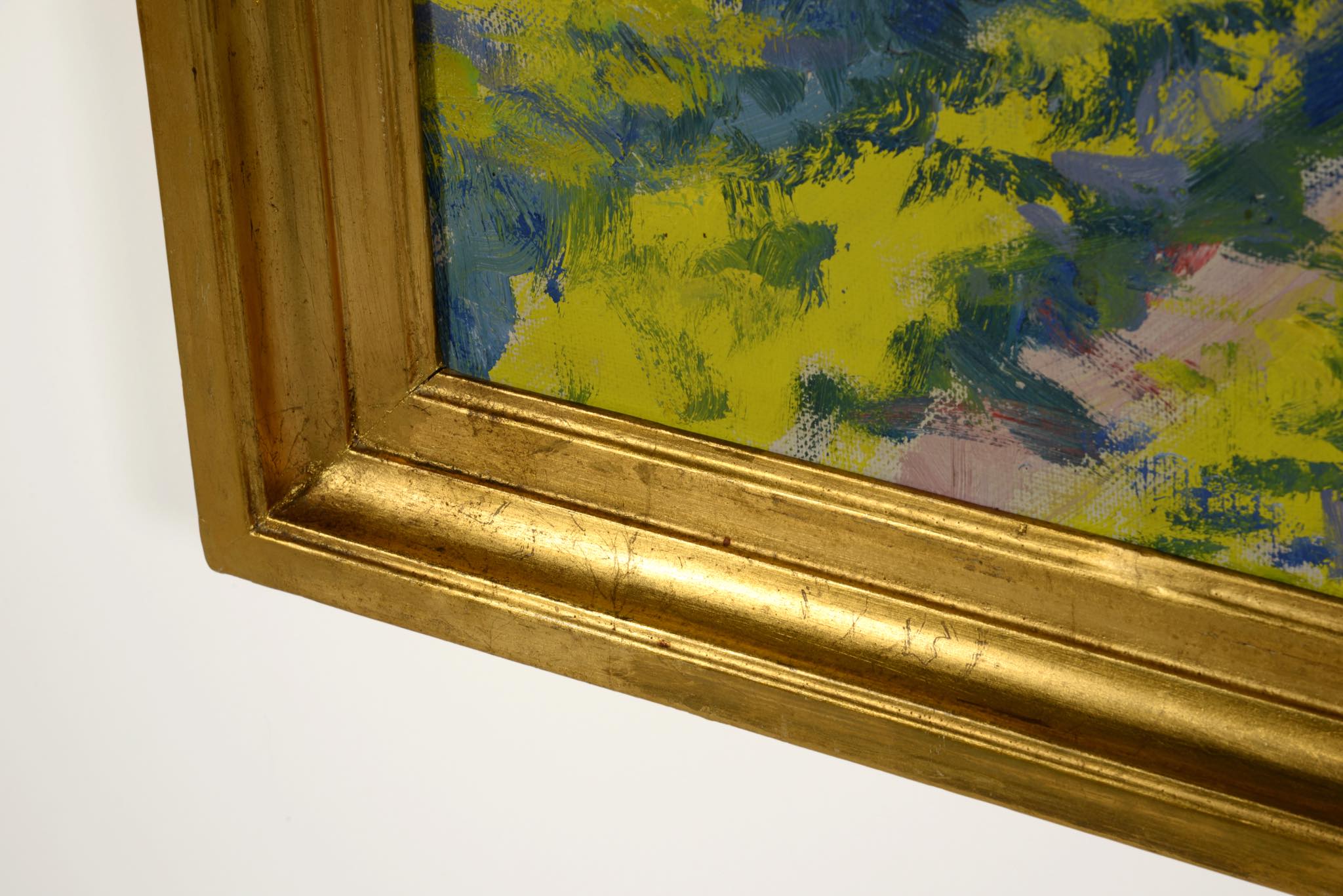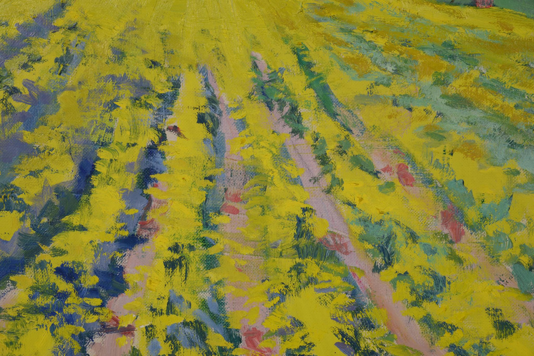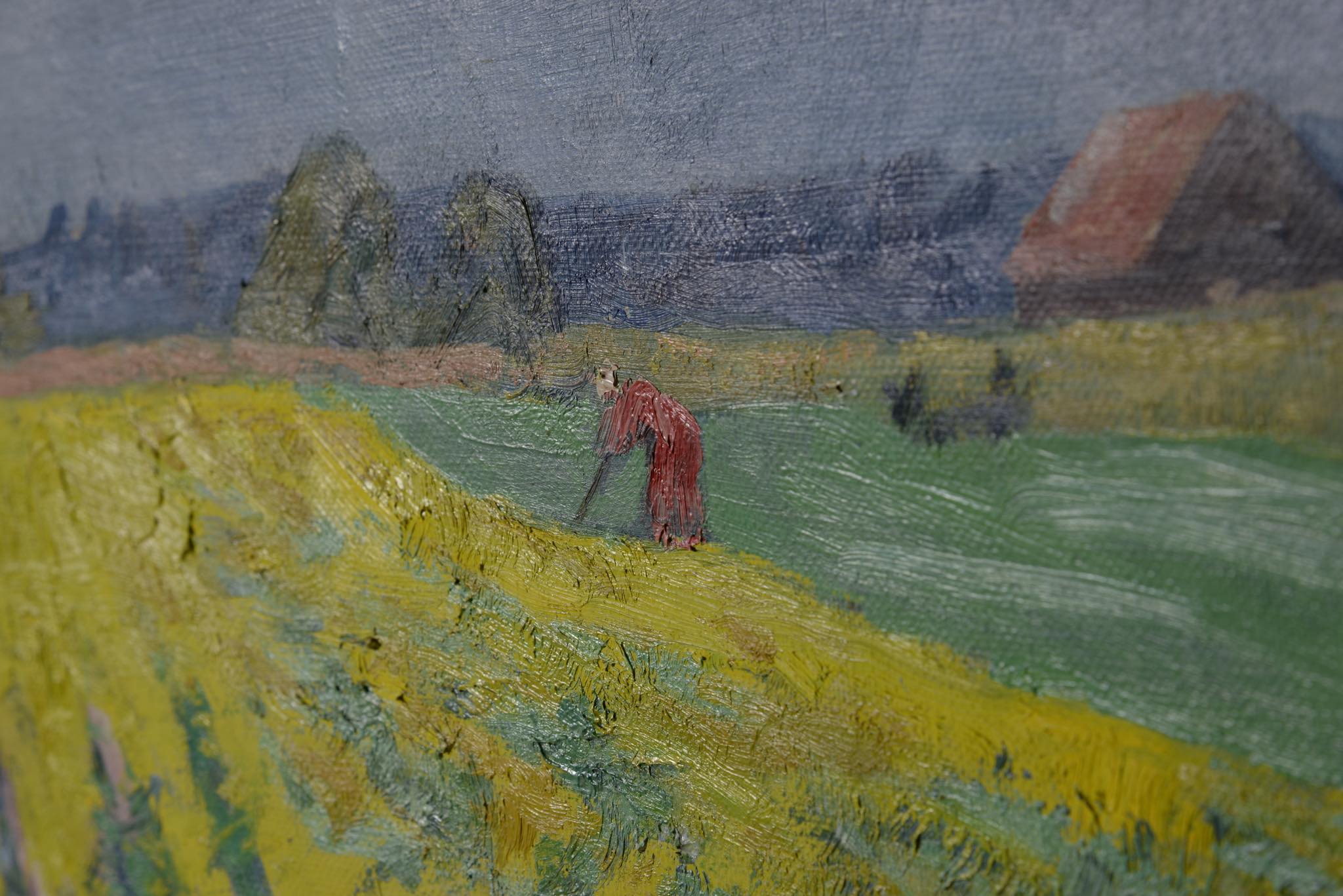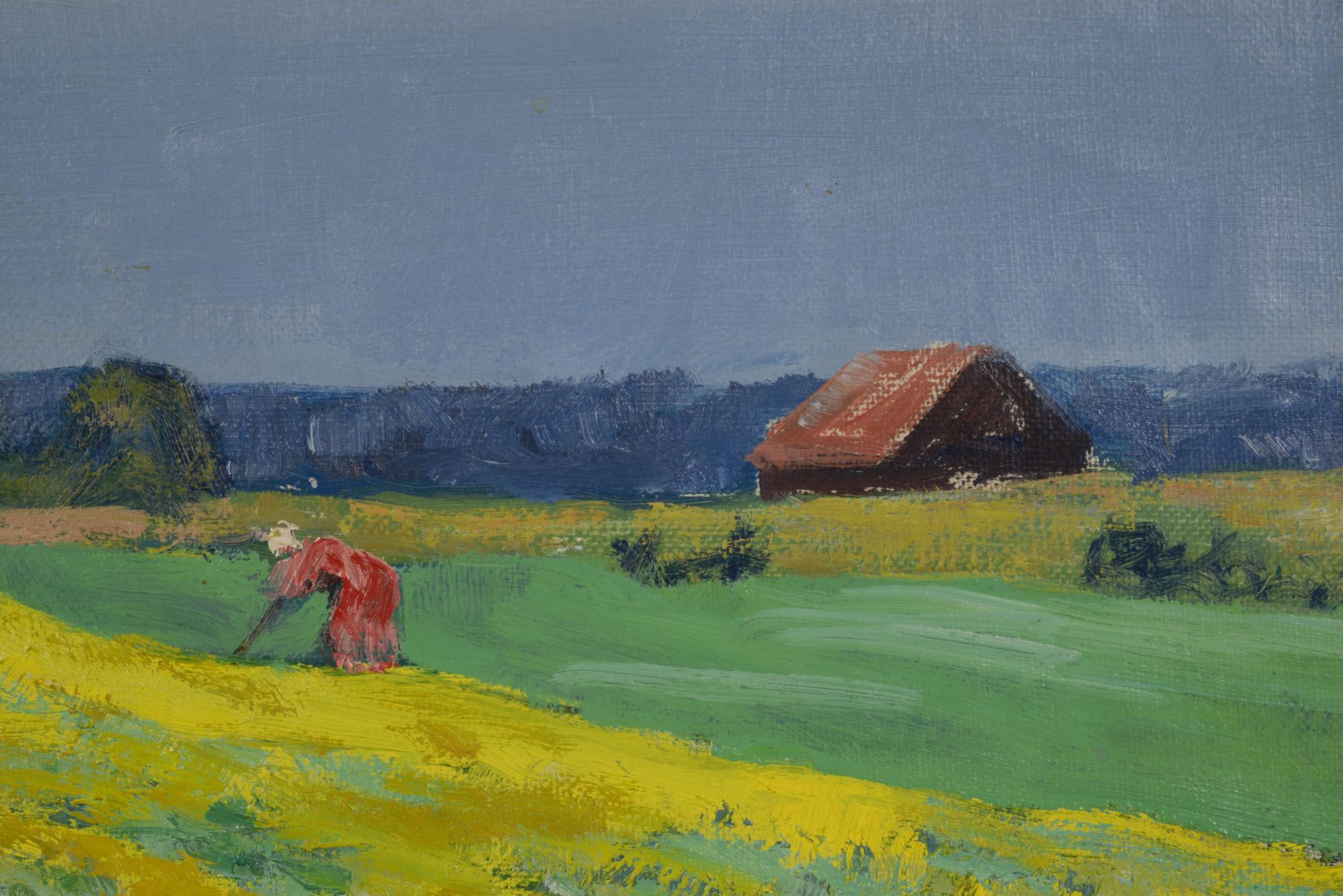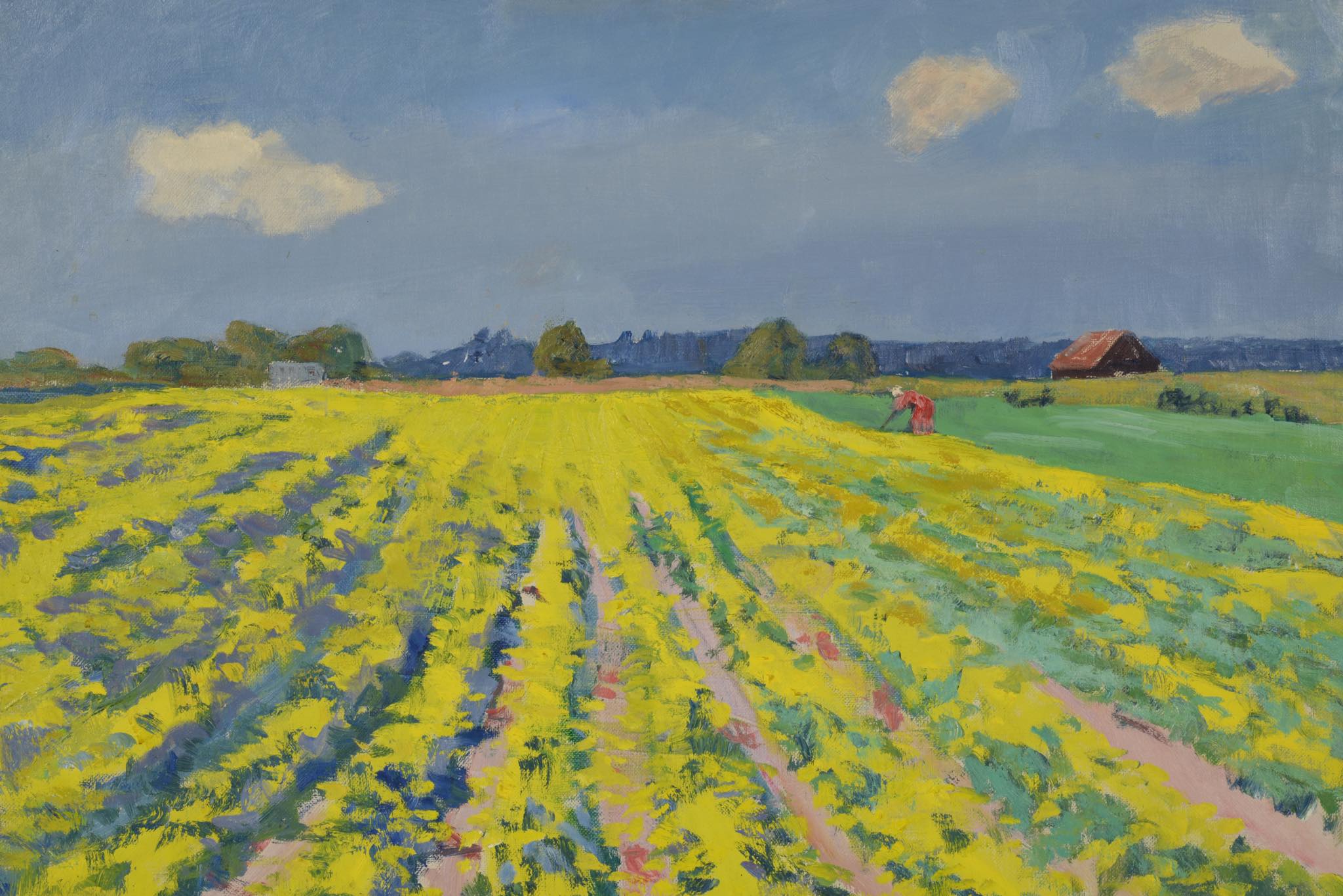 デンマークの画家、Axel P. Jensen/アクセル・P・イェンセンによる風景画作品です。デンマークがナチス占領下にあった1943年に描かれたもので、燦々と降り注ぐ太陽のもと、辺り一面に咲き乱れる菜の花と農夫の姿が描かれています。金箔のフレームはオリジナルのようで、経年感や小傷等見られますがコンディションは良好です。