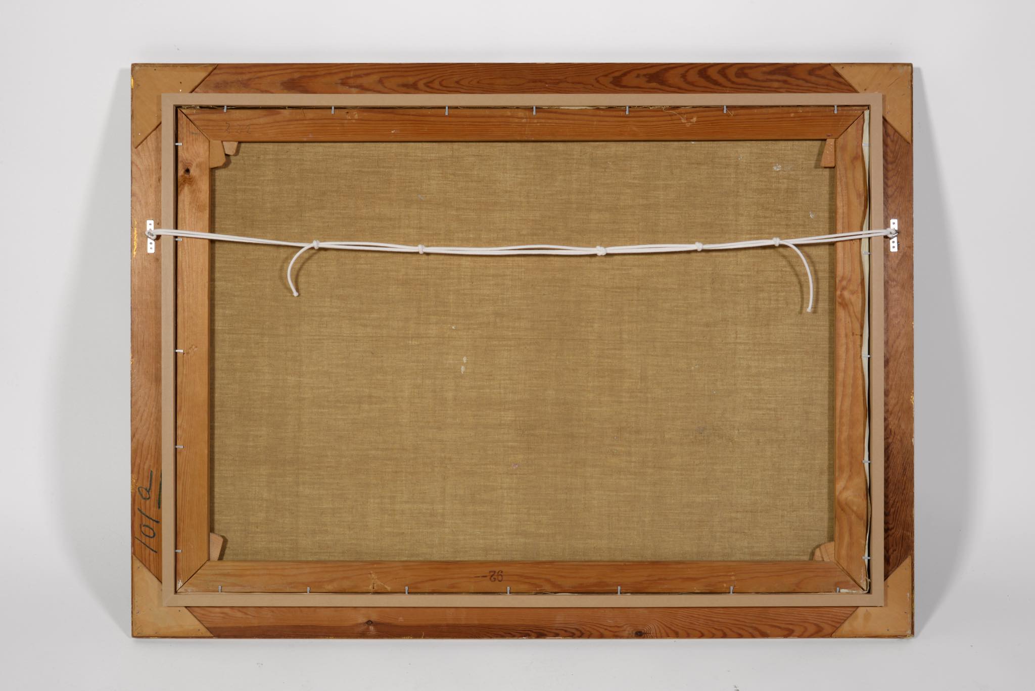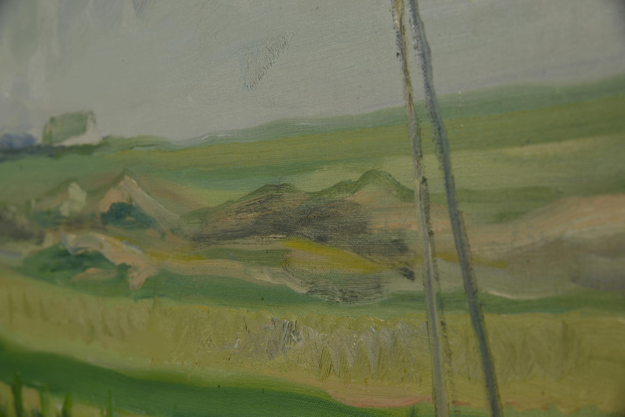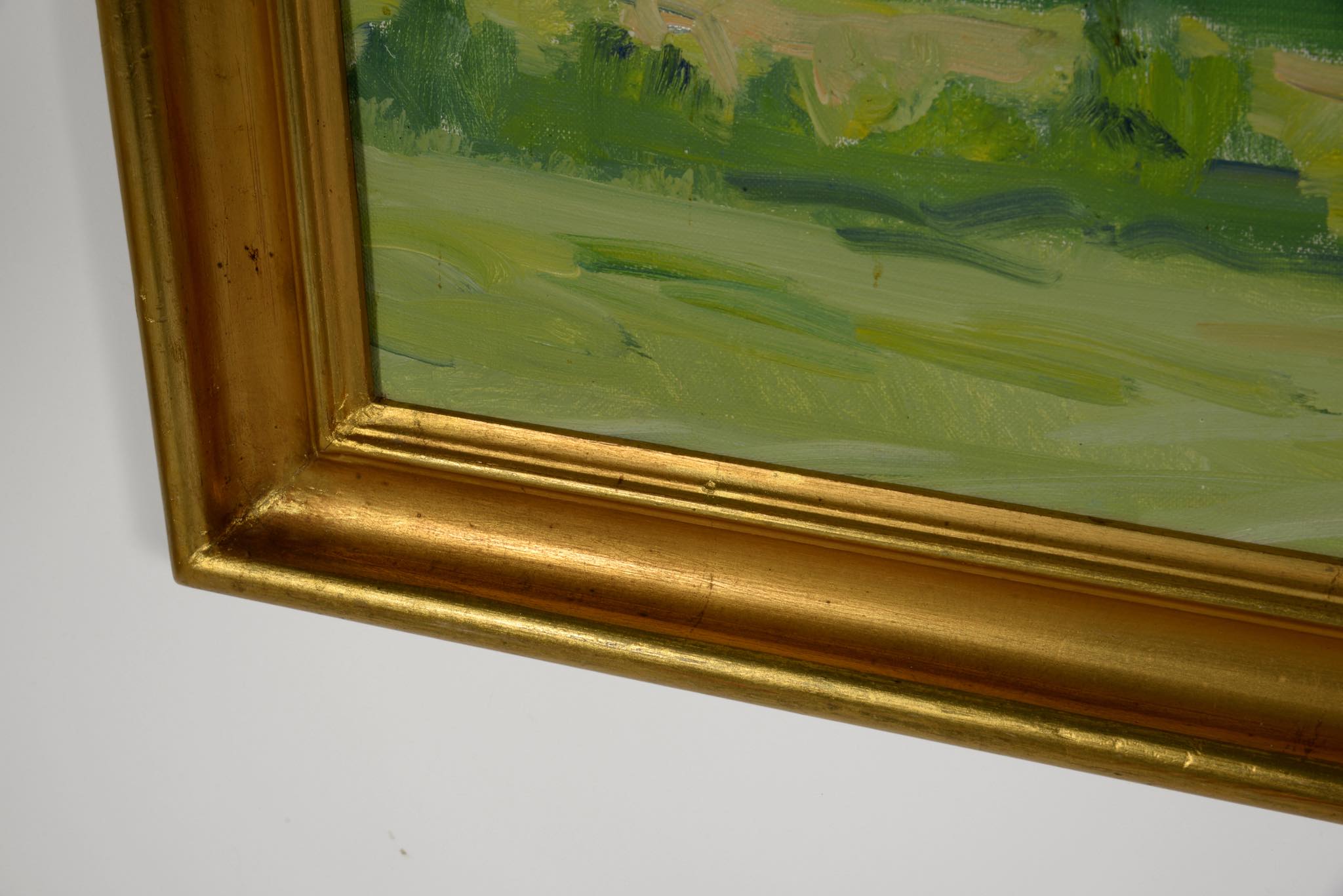 デンマークの画家、Axel P. Jensen/アクセル・P・イェンセンによる風景画作品です。春の広大な農村地帯を描いた作品で、花曇りの日の大気感が表現されています。制作された年号等は見当たりませんが、おそらく1940年代に描かれたものと思われます。金箔のフレームはオリジナルのようで、経年感や小傷等見られますがコンディションは良好です。