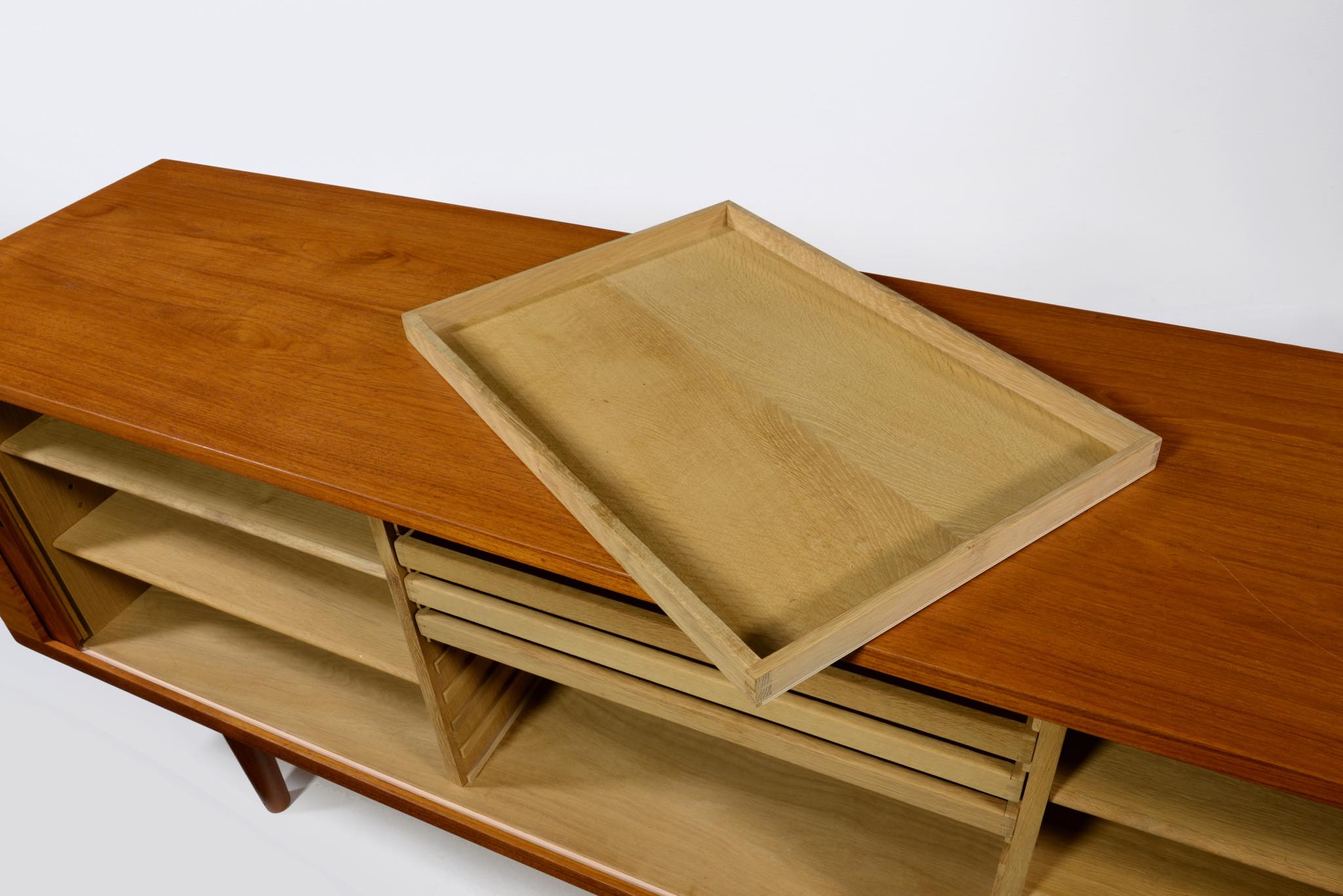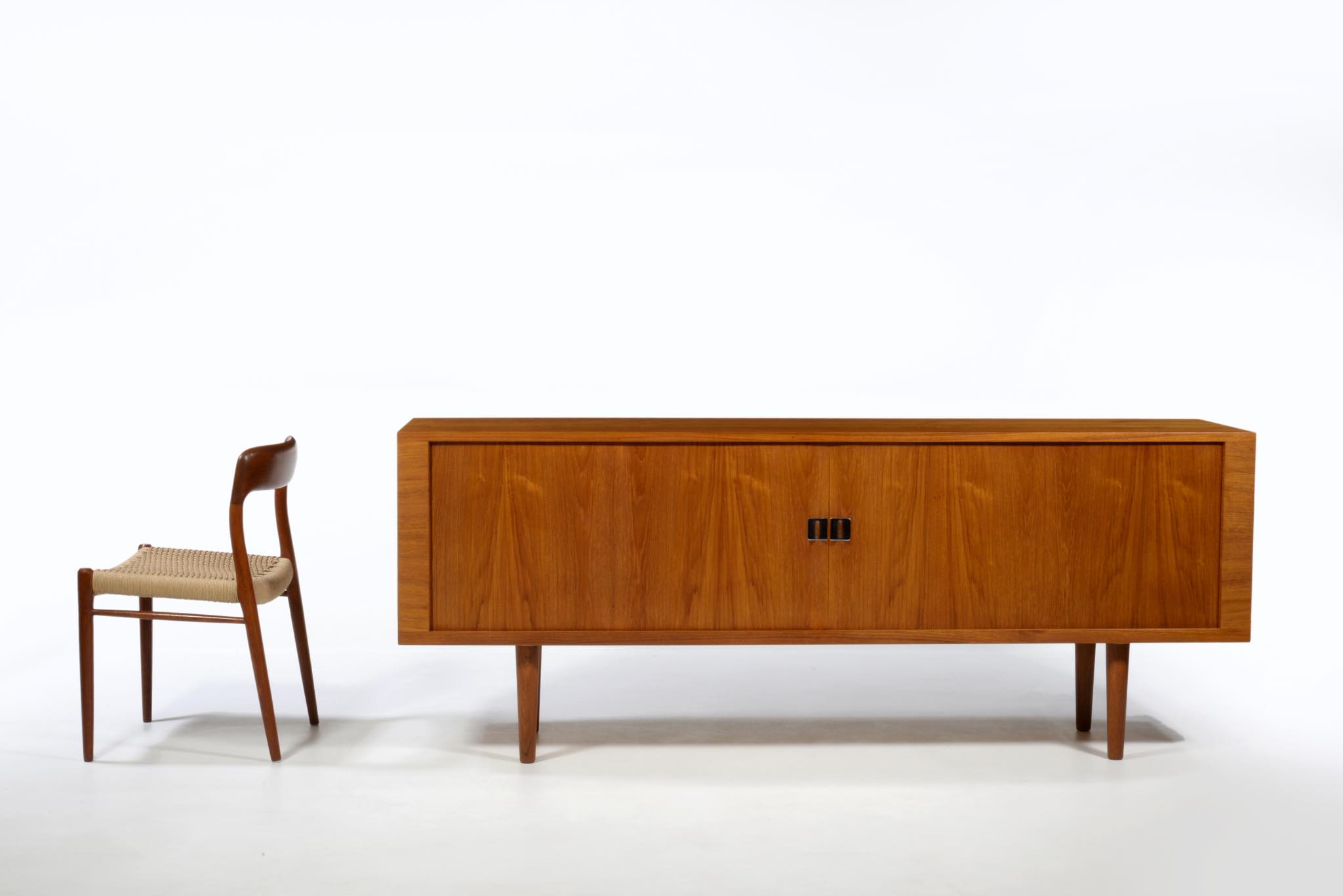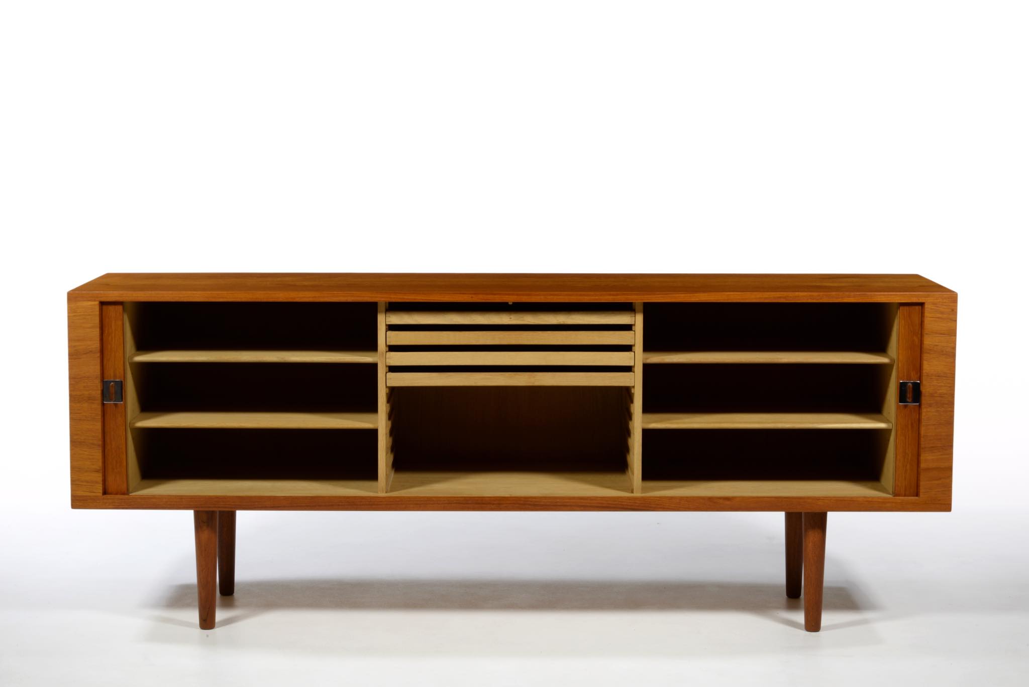 Hans J. Wegner/ハンス・ウェグナーによる RY25サイドボード、チーク材のモデルです。扉にはタンブールドアと称される蛇腹式で開閉する引戸を備えており、20世紀のデンマーク家具工芸の素晴らしさを垣間見ることができます。内部の抽斗や棚板にはオークの無垢材が用いられています。外装と内装とのコントラストの美しい作品です。コンディションにつきましてはお問い合わせください。