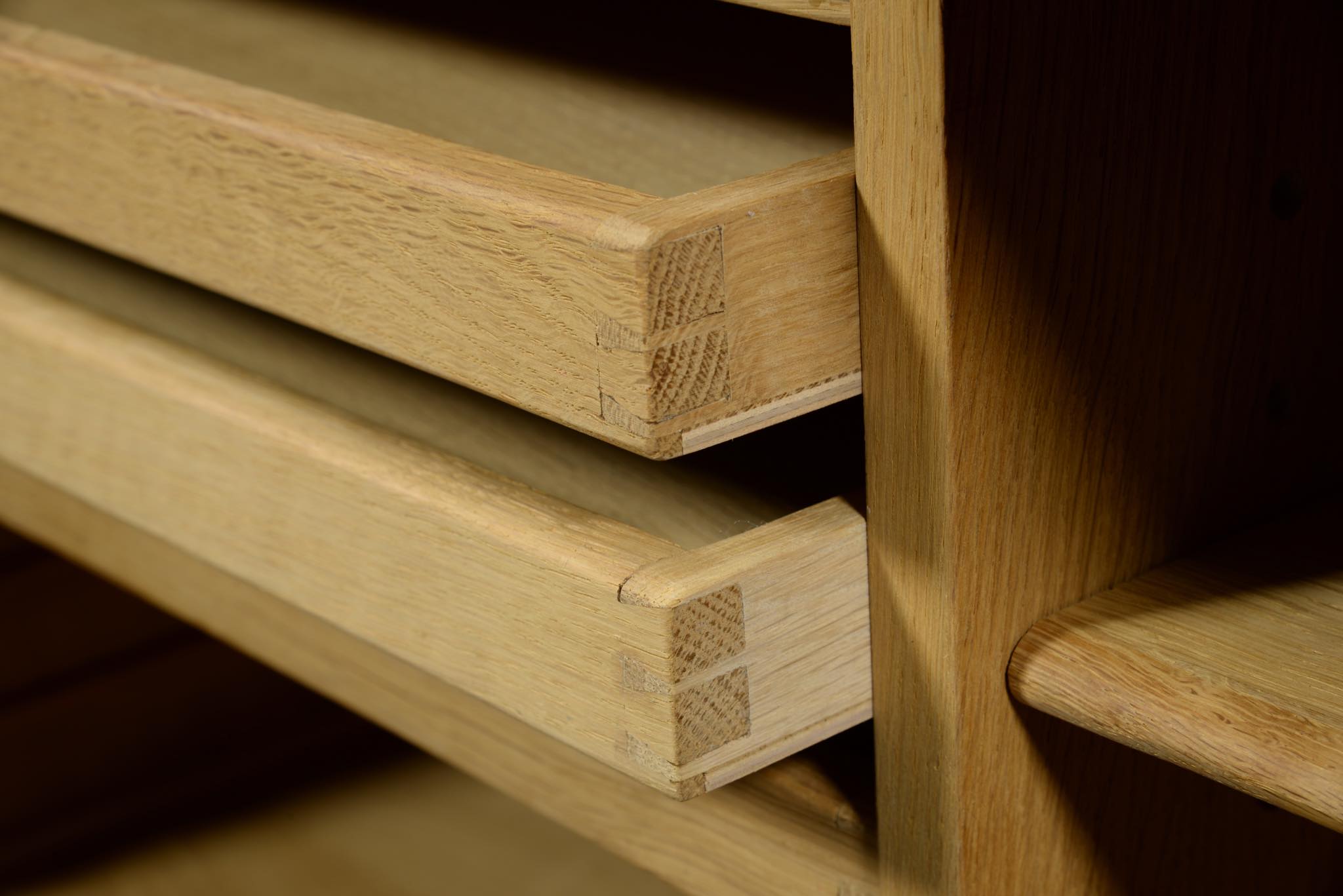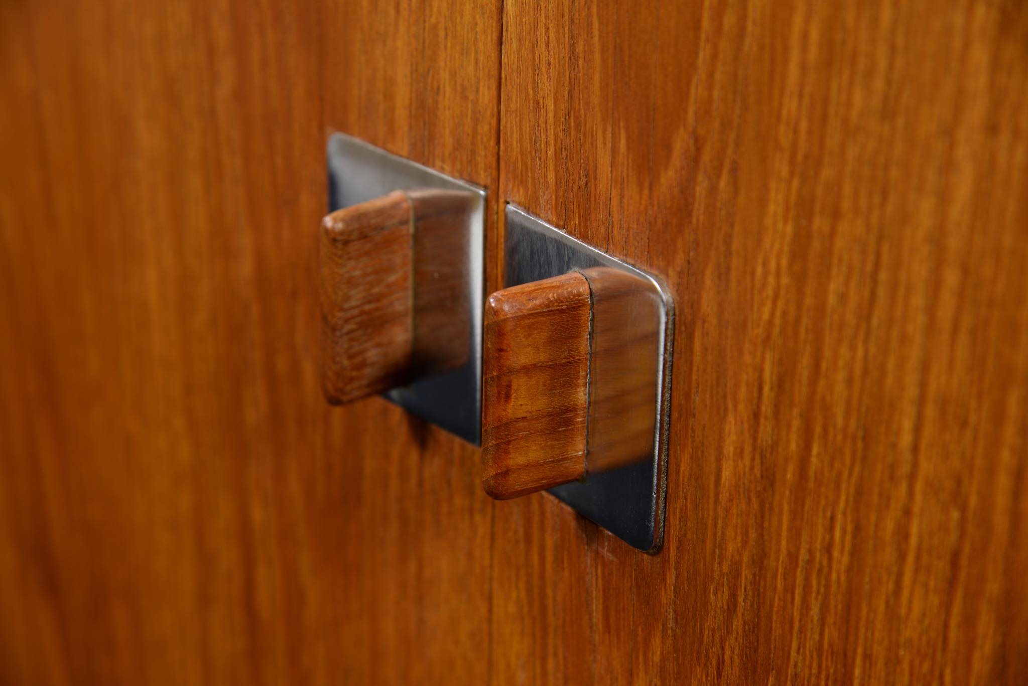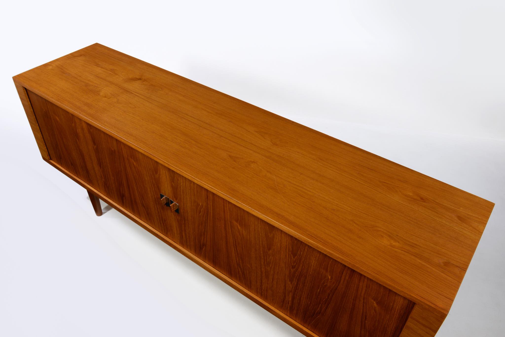 Hans J. Wegner/ハンス・ウェグナーによる RY25サイドボード、チーク材のモデルです。扉にはタンブールドアと称される蛇腹式で開閉する引戸を備えており、20世紀のデンマーク家具工芸の素晴らしさを垣間見ることができます。内部の抽斗や棚板にはオークの無垢材が用いられています。外装と内装とのコントラストの美しい作品です。コンディションにつきましてはお問い合わせください。