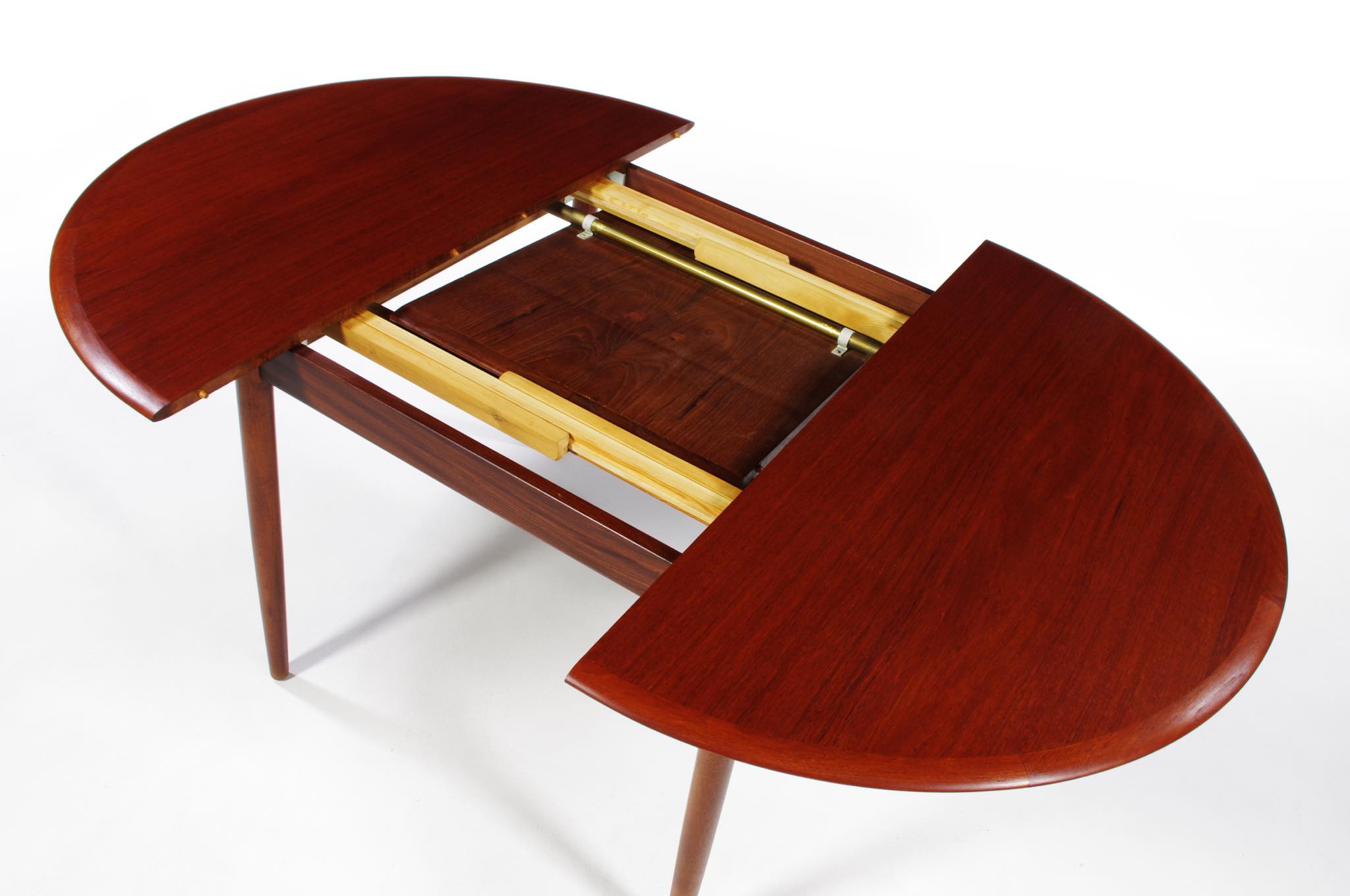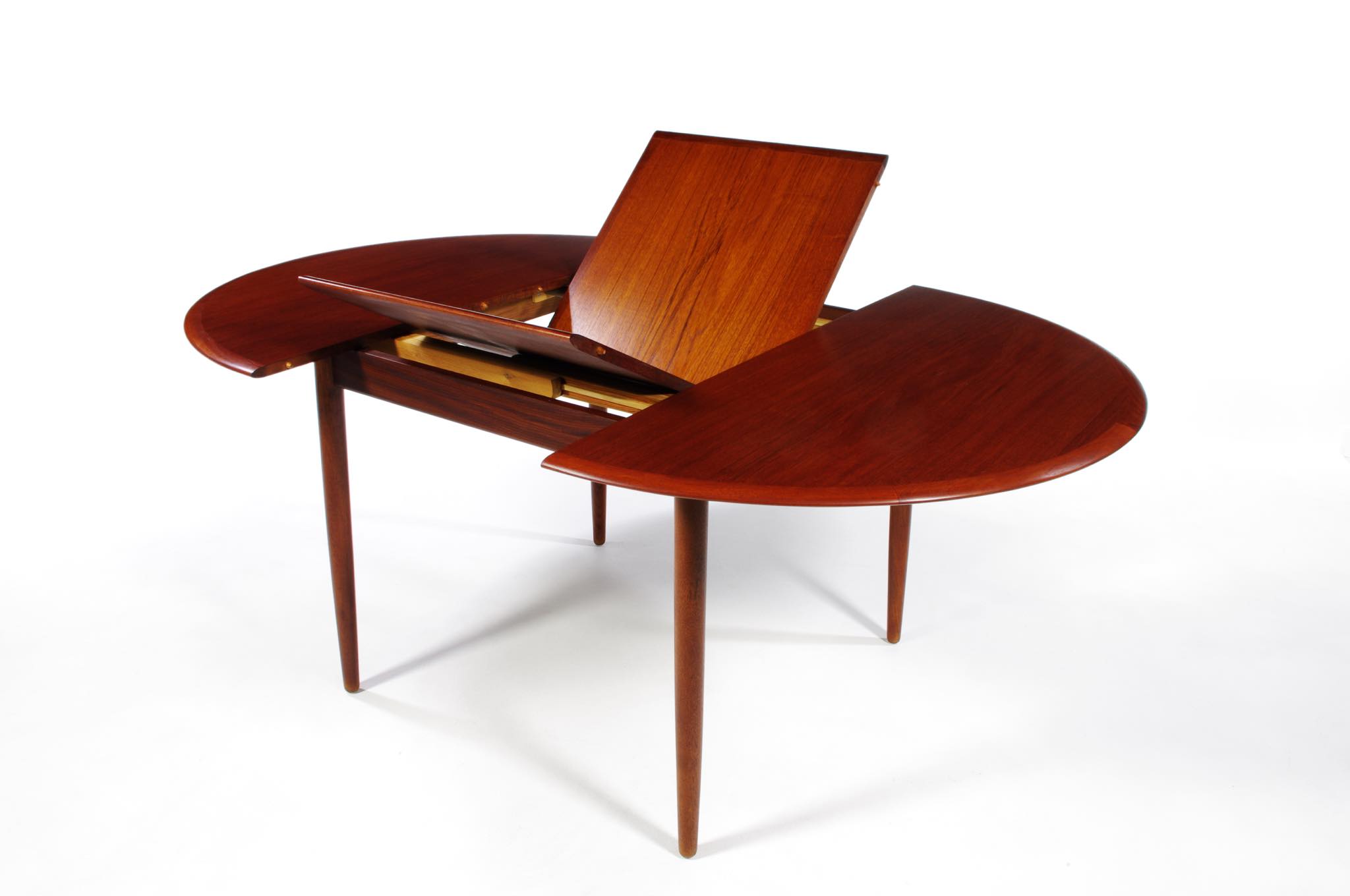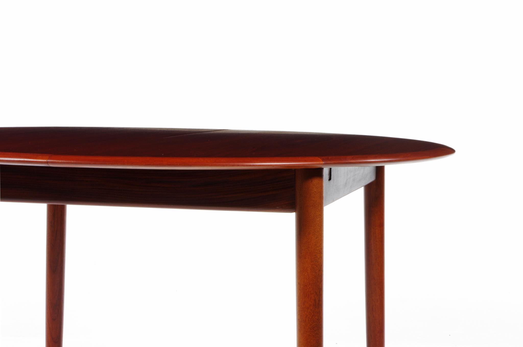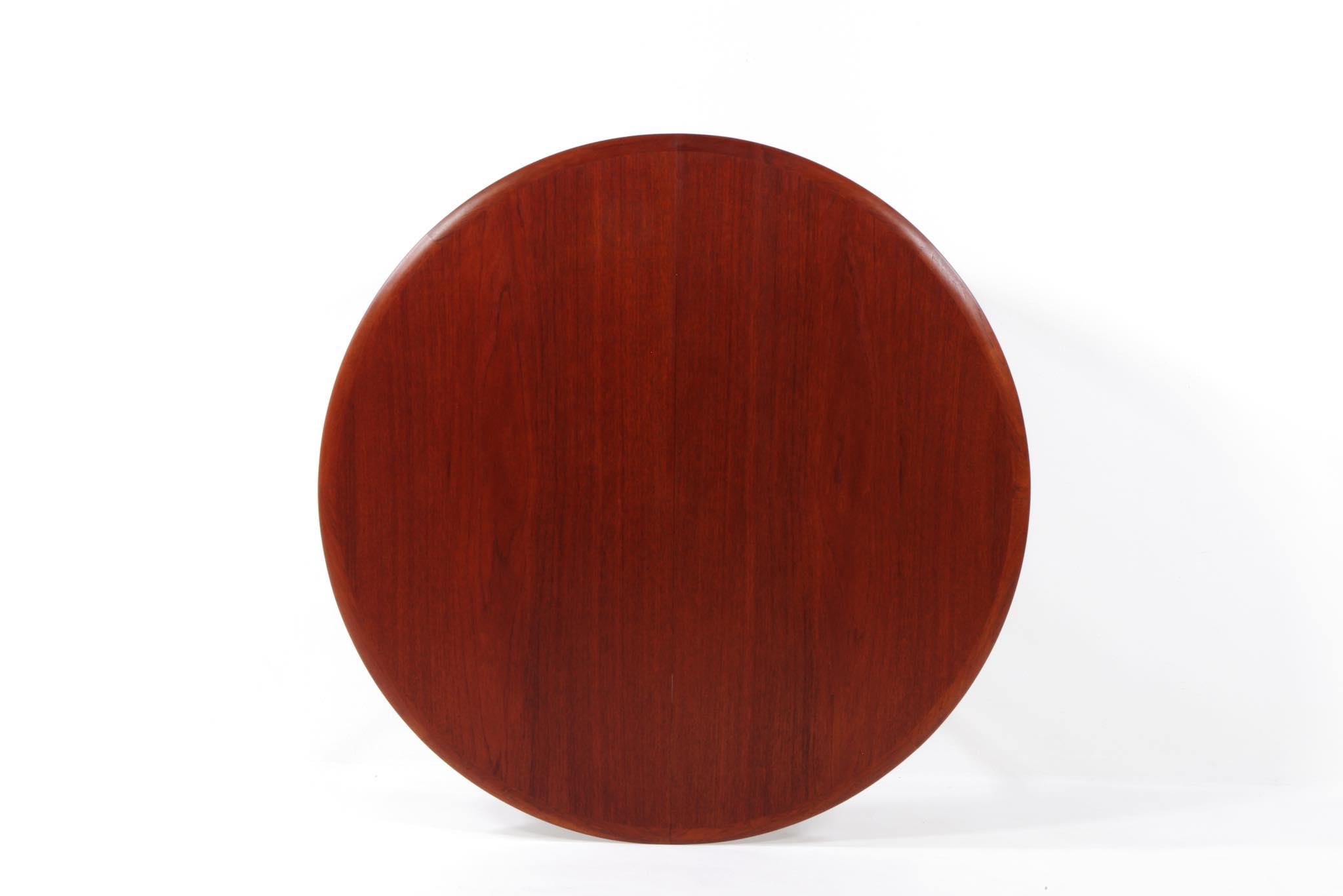 デンマークのデザイナー、Arne Hovmand Olsen/アルネ・ホフマンド・オルセンによるMK216ラウンドダイニングテーブルです。1950〜60年代頃に作られたものでしょう。素材には良質なチーク材が用いられています。エクステンションリーフが折りたたまれた状態で収納されるタイプで、拡張する際はおひとりで簡単に設置できます。経年による僅かな小傷が見られ、また、主天板とエクステンションリーフとに色差がありますが、全体的なコンディションは良好です。