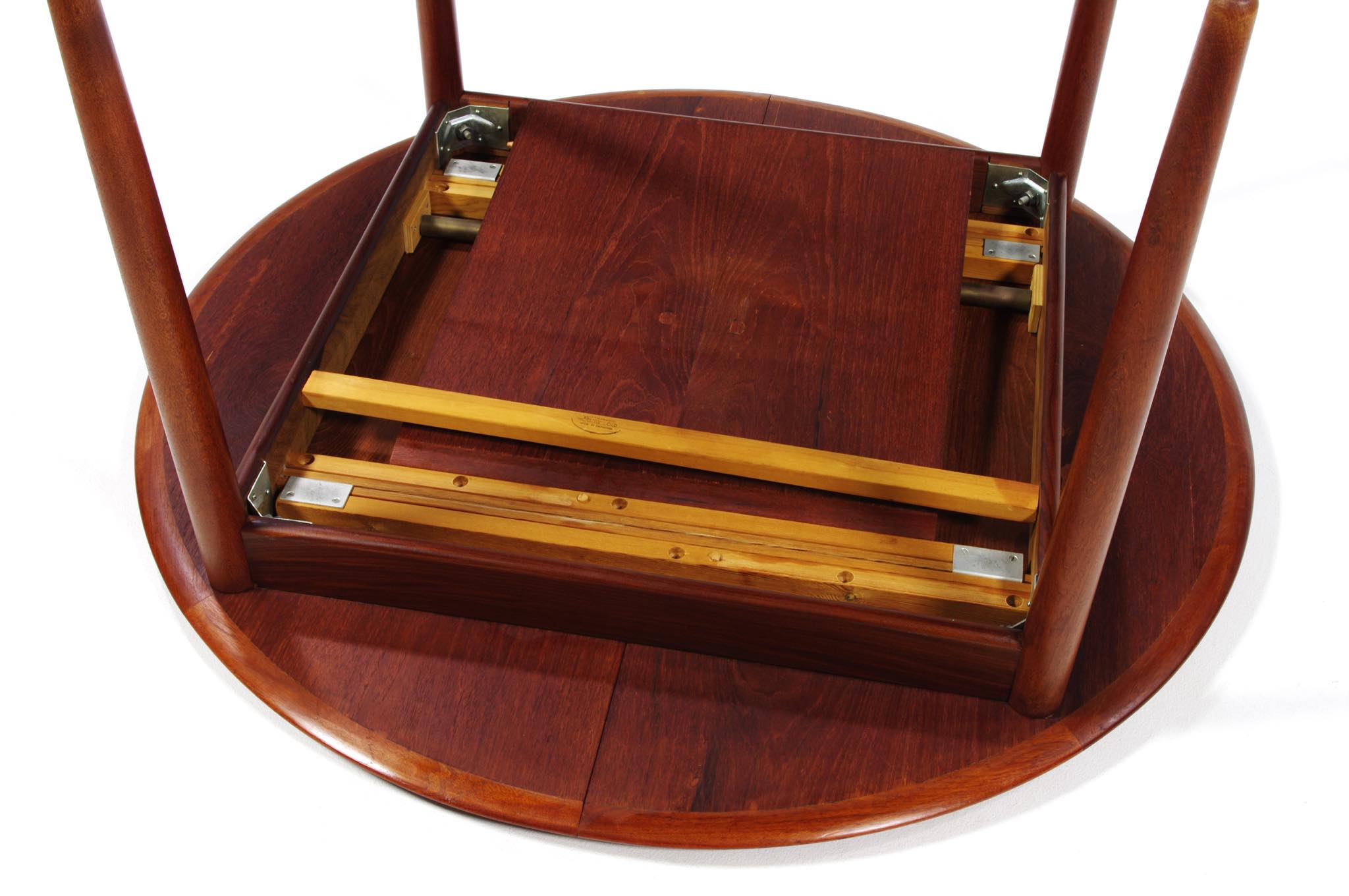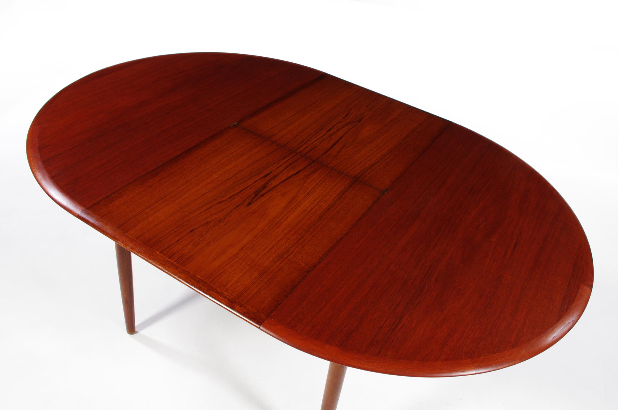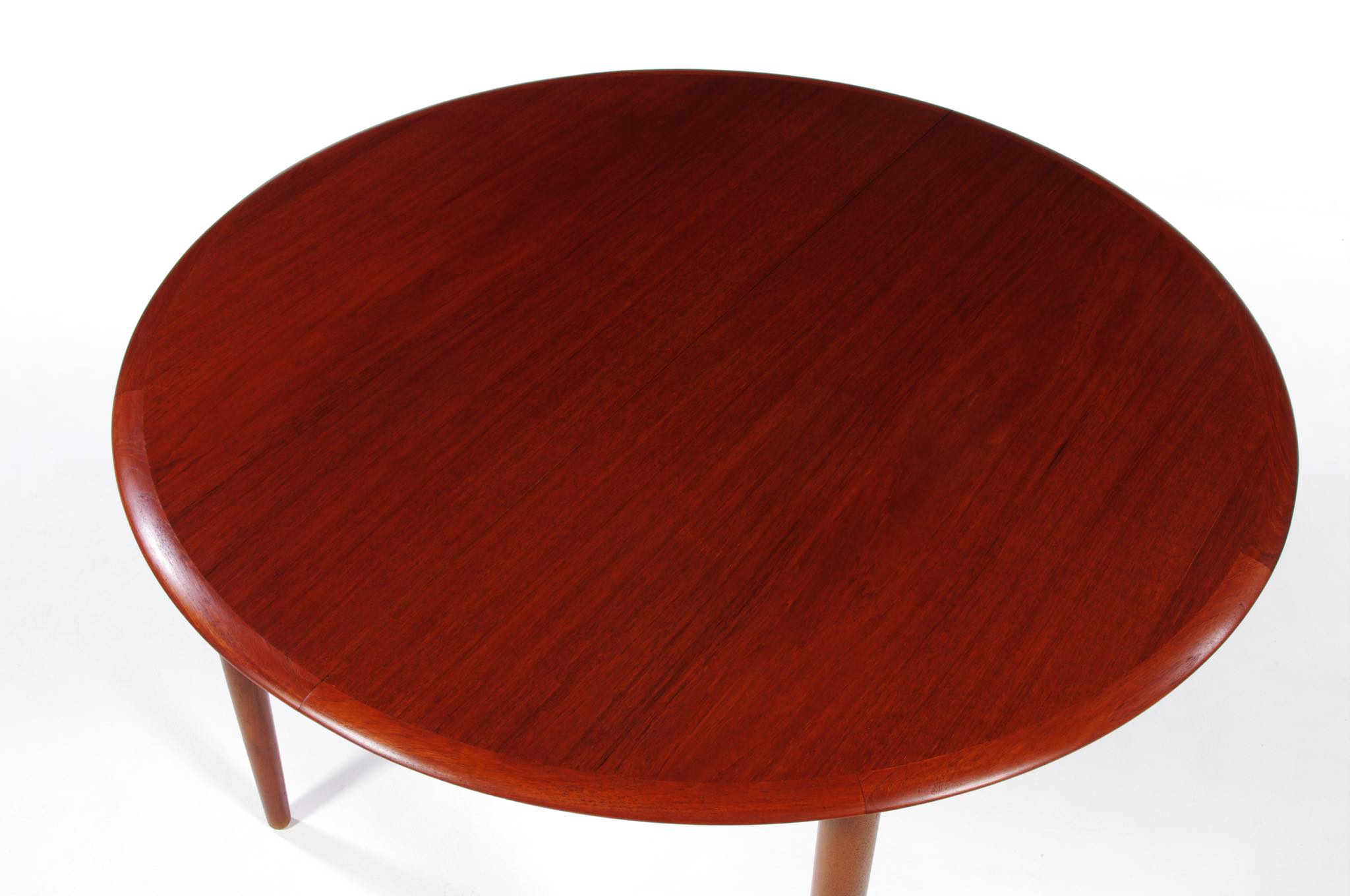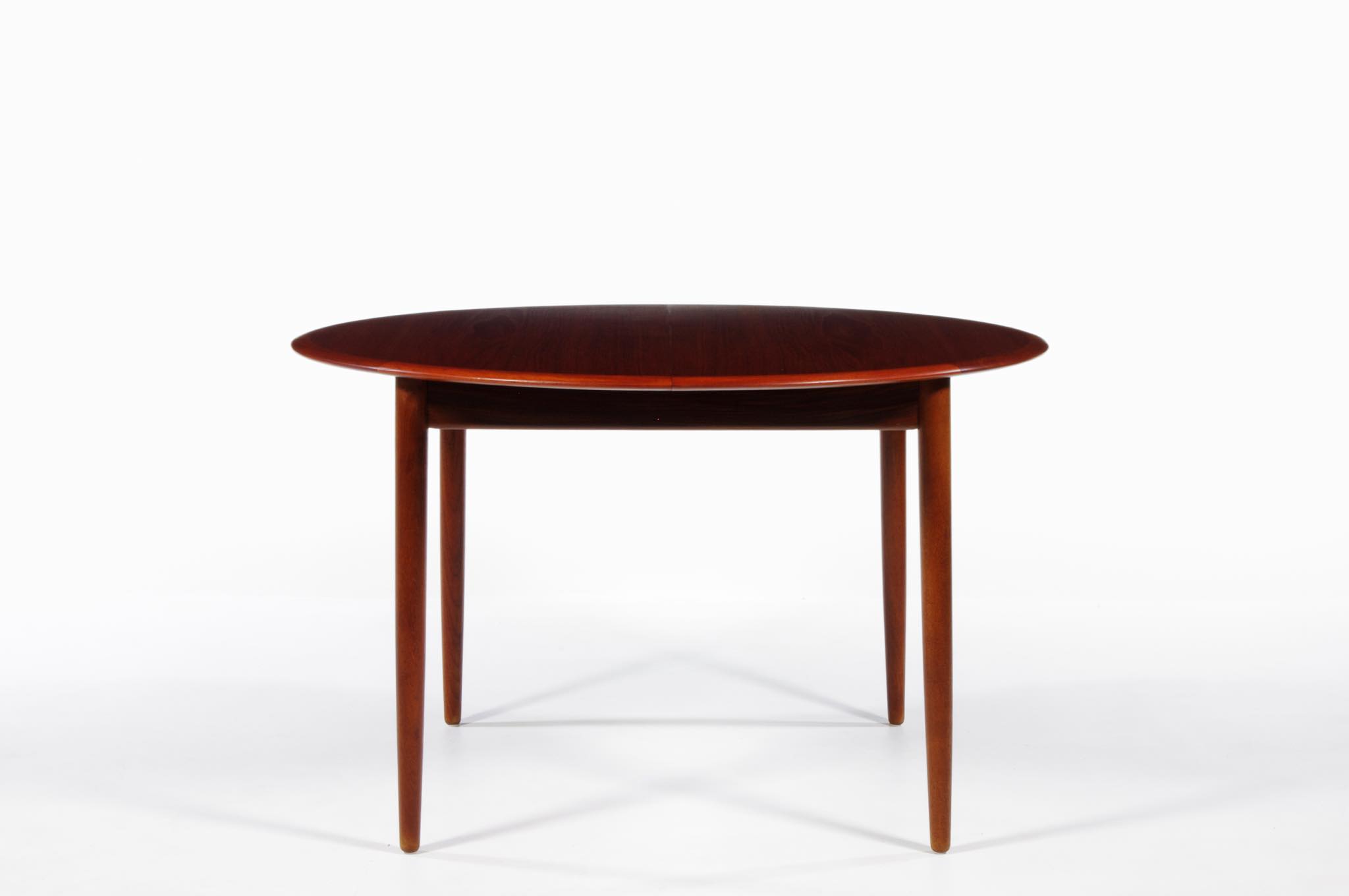 デンマークのデザイナー、Arne Hovmand Olsen/アルネ・ホフマンド・オルセンによるMK216ラウンドダイニングテーブルです。1950〜60年代頃に作られたものでしょう。素材には良質なチーク材が用いられています。エクステンションリーフが折りたたまれた状態で収納されるタイプで、拡張する際はおひとりで簡単に設置できます。経年による僅かな小傷が見られ、また、主天板とエクステンションリーフとに色差がありますが、全体的なコンディションは良好です。