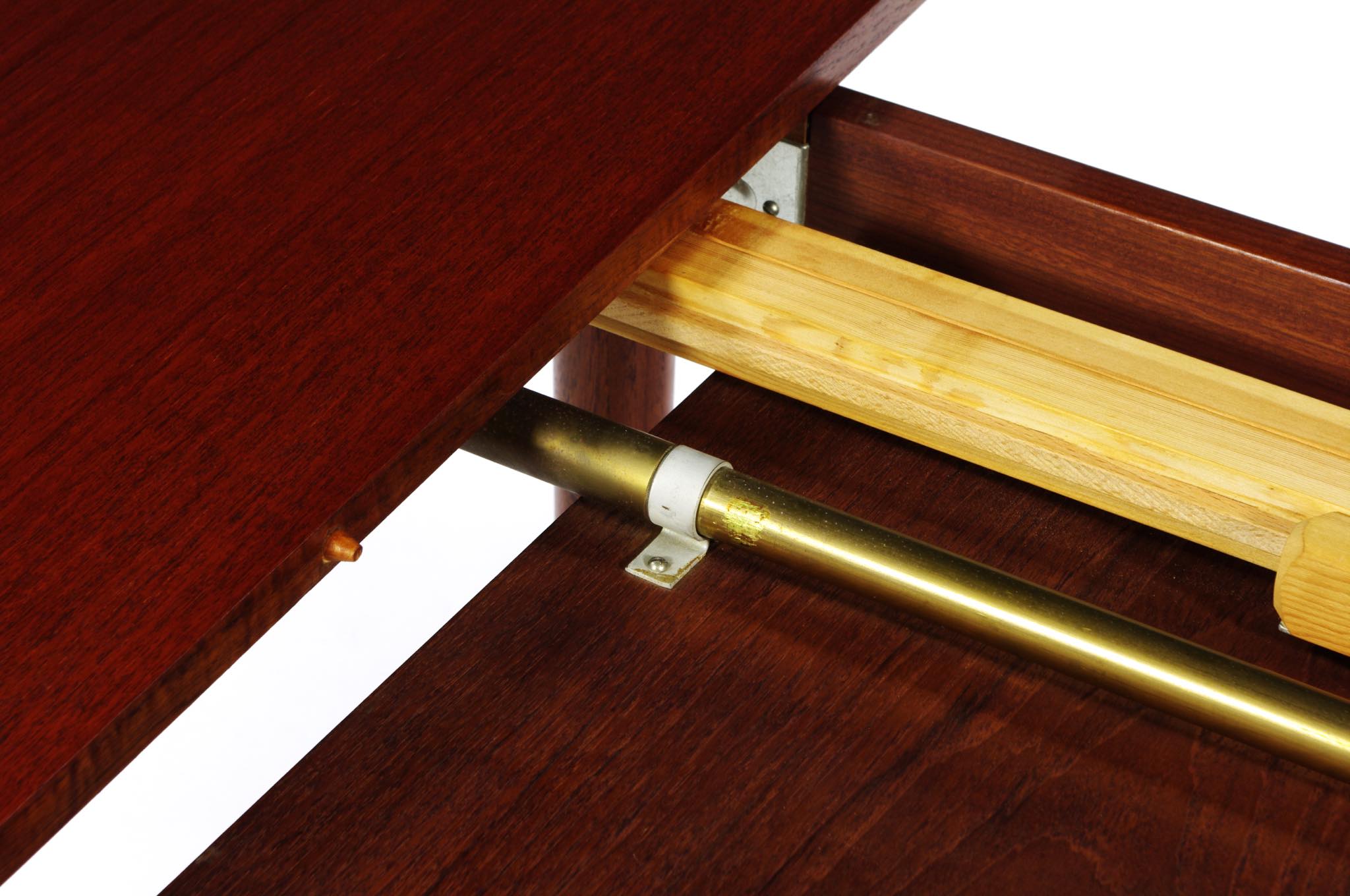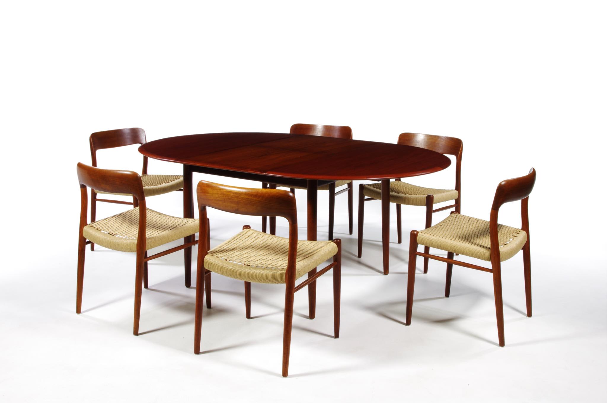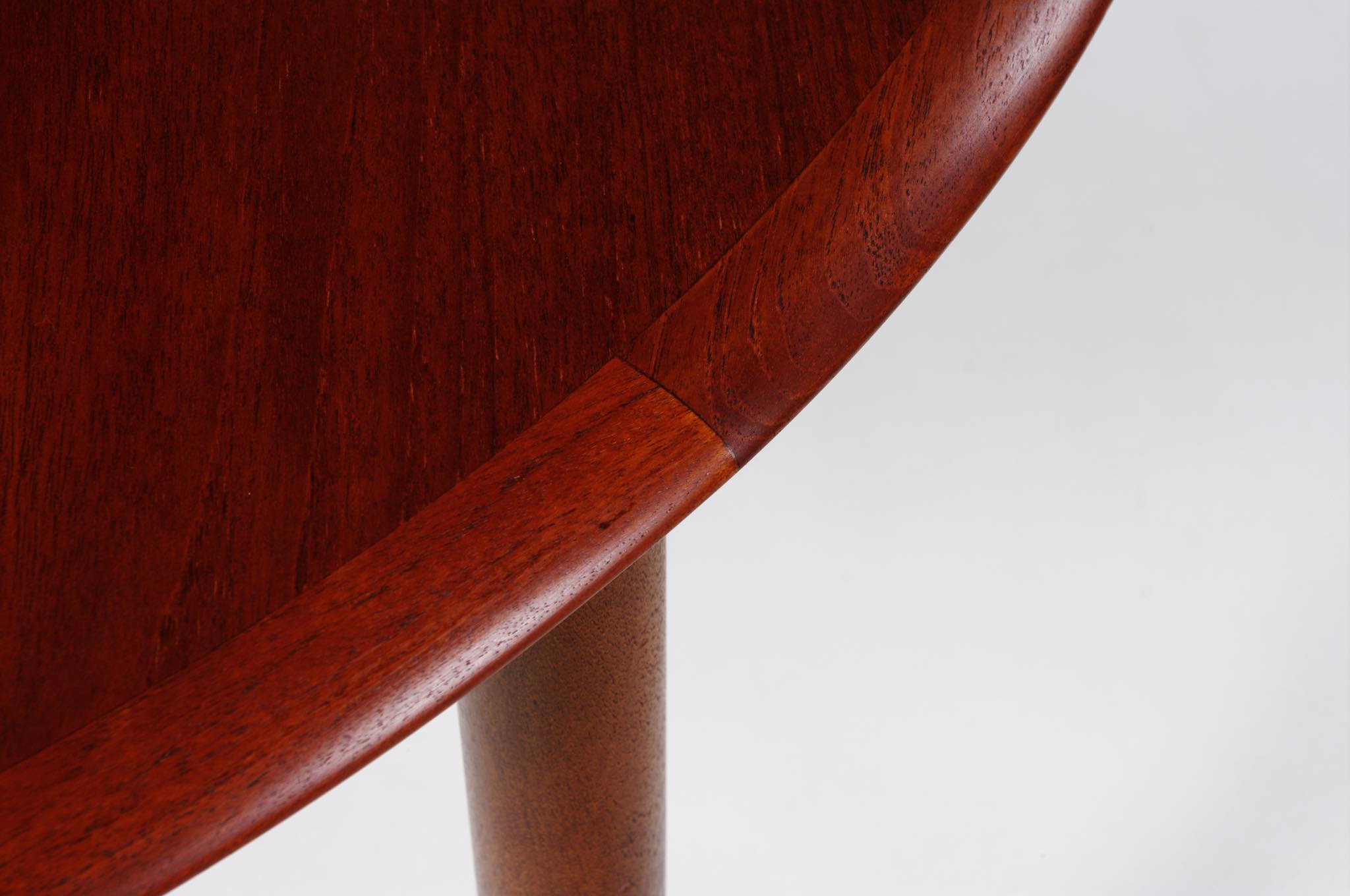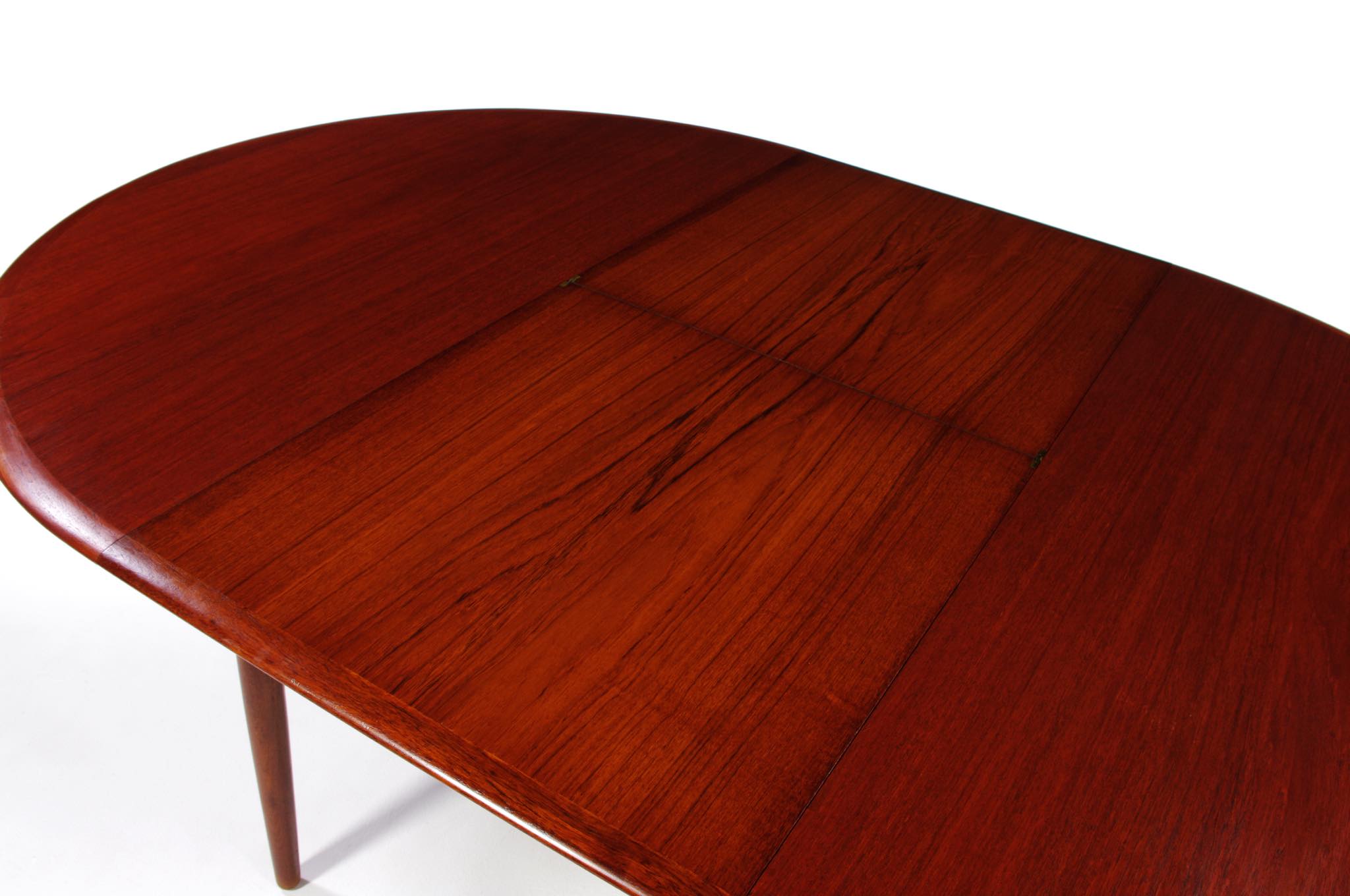 デンマークのデザイナー、Arne Hovmand Olsen/アルネ・ホフマンド・オルセンによるMK216ラウンドダイニングテーブルです。1950〜60年代頃に作られたものでしょう。素材には良質なチーク材が用いられています。エクステンションリーフが折りたたまれた状態で収納されるタイプで、拡張する際はおひとりで簡単に設置できます。経年による僅かな小傷が見られ、また、主天板とエクステンションリーフとに色差がありますが、全体的なコンディションは良好です。