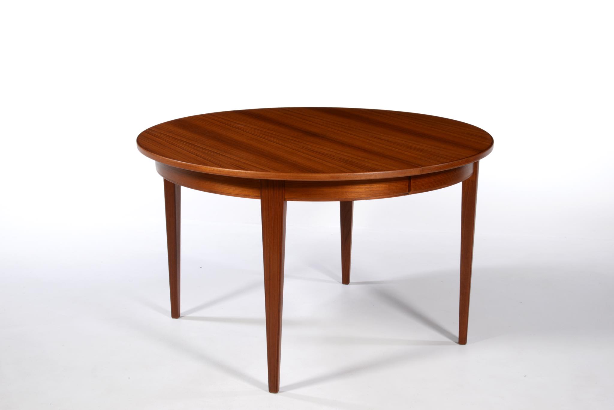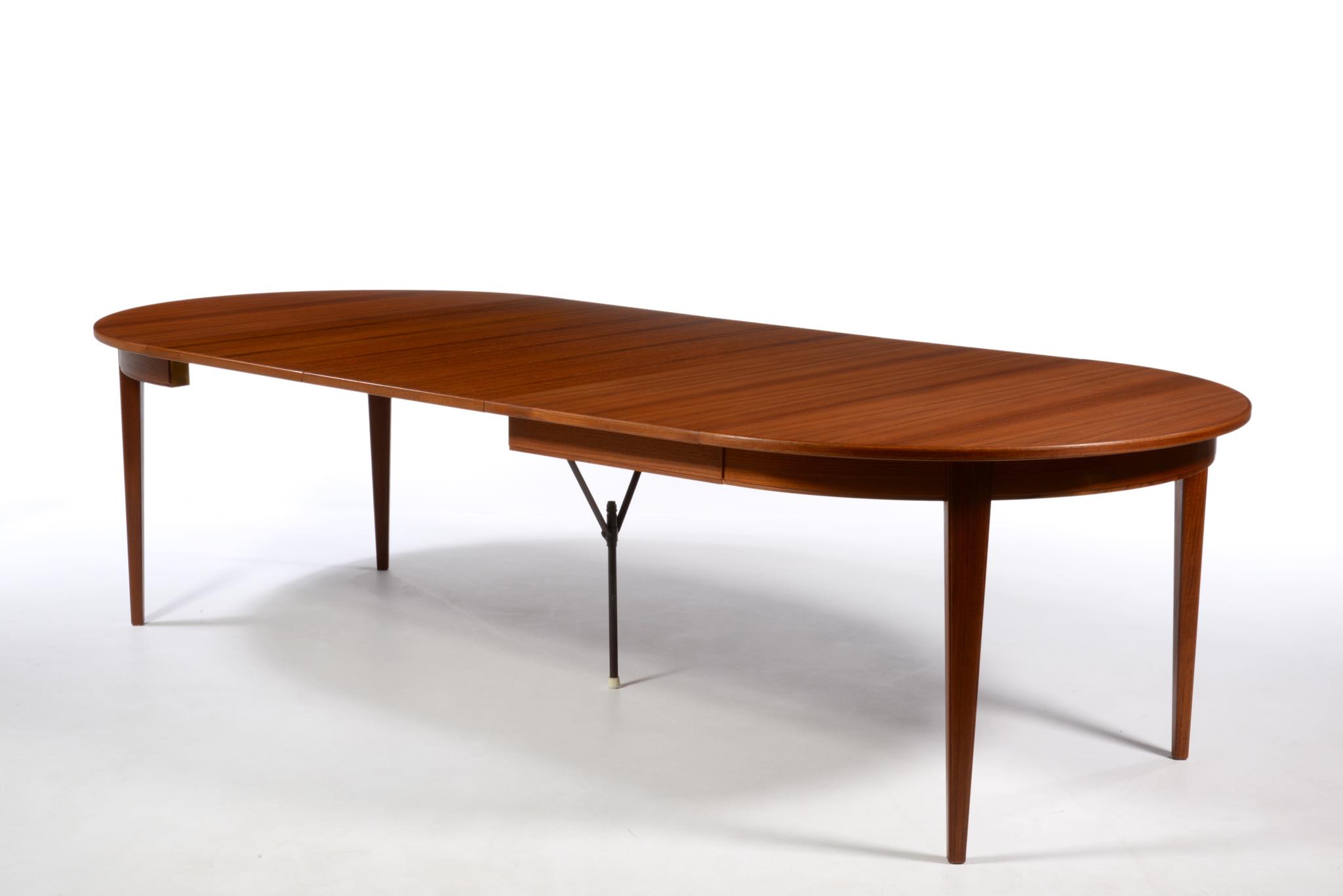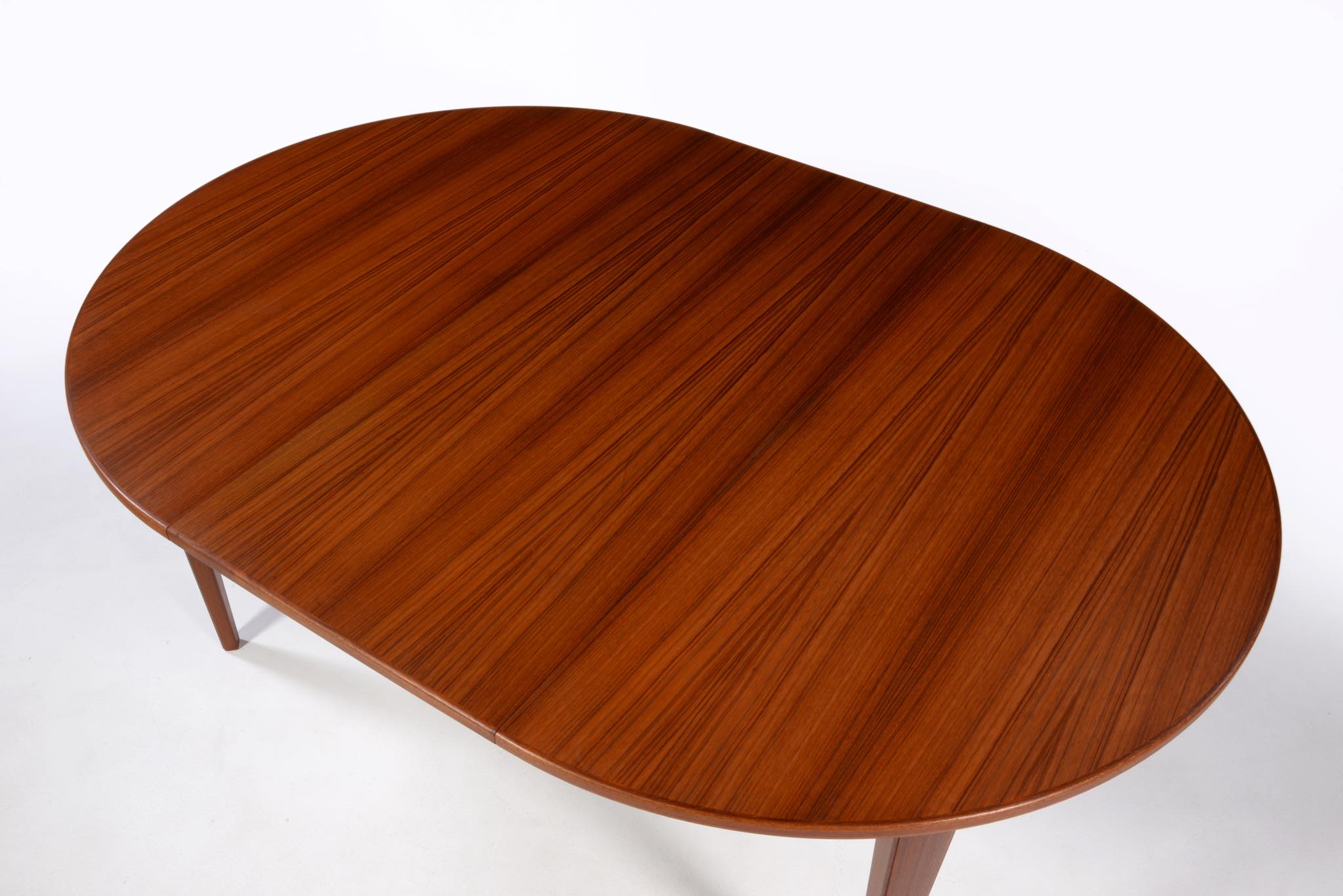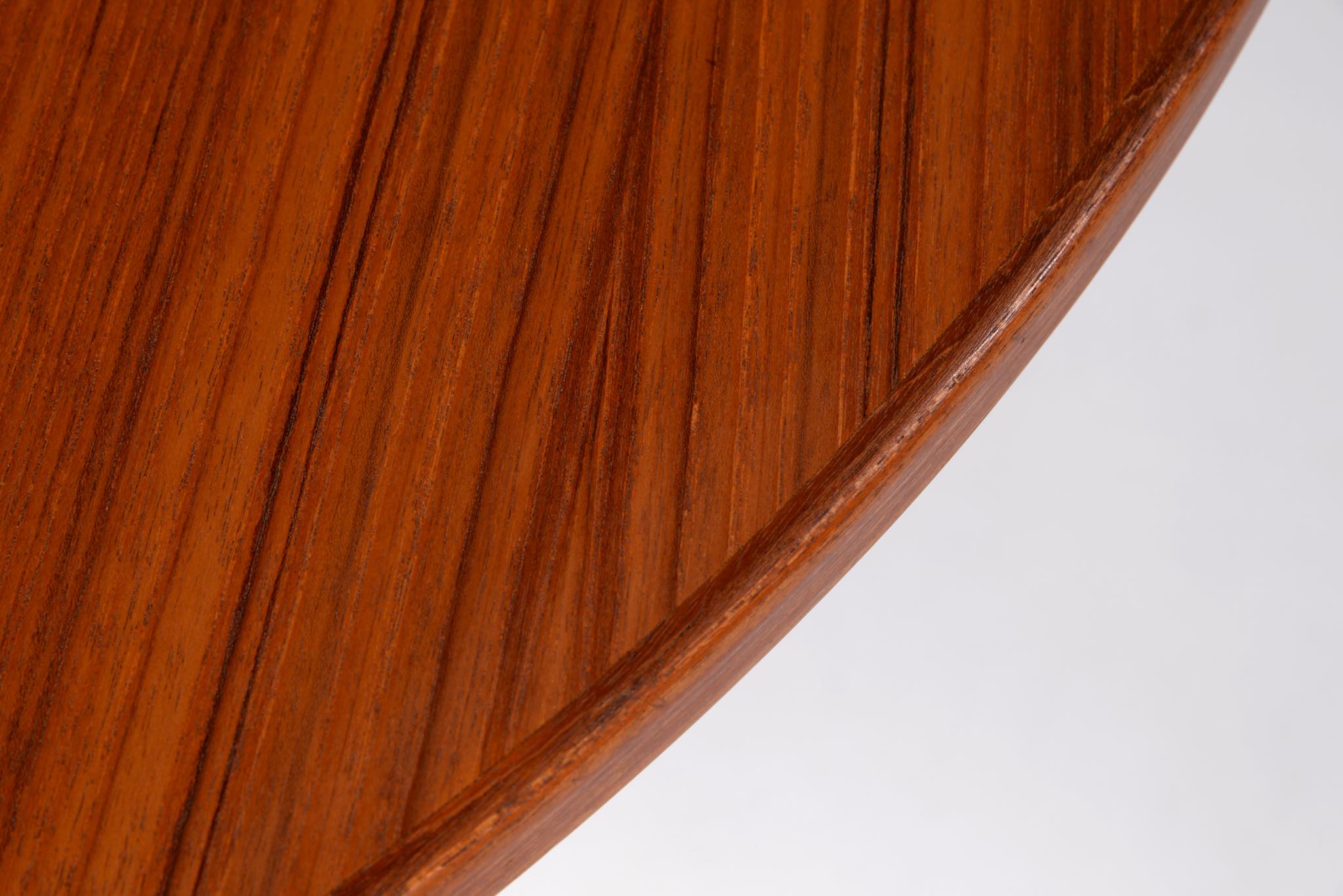 1933年創業のデンマークの家具メーカー、Omann Jun/オマーン・ユンによるダイニングテーブルです。1960年代頃に作られたもので、きれいな柾目のチーク材が天板に用いられています。エクステンションリーフが3枚付属し、最大で270センチまで拡張することが可能です。3枚のエクステンションリーフのうち、2枚には幕板が付属しません。詳しくはお問い合わせください。Omann Junはしっかりとした骨格の家具作りで知られ、1960年代には地元デンマークでも人気を博し、広く普及したようです。