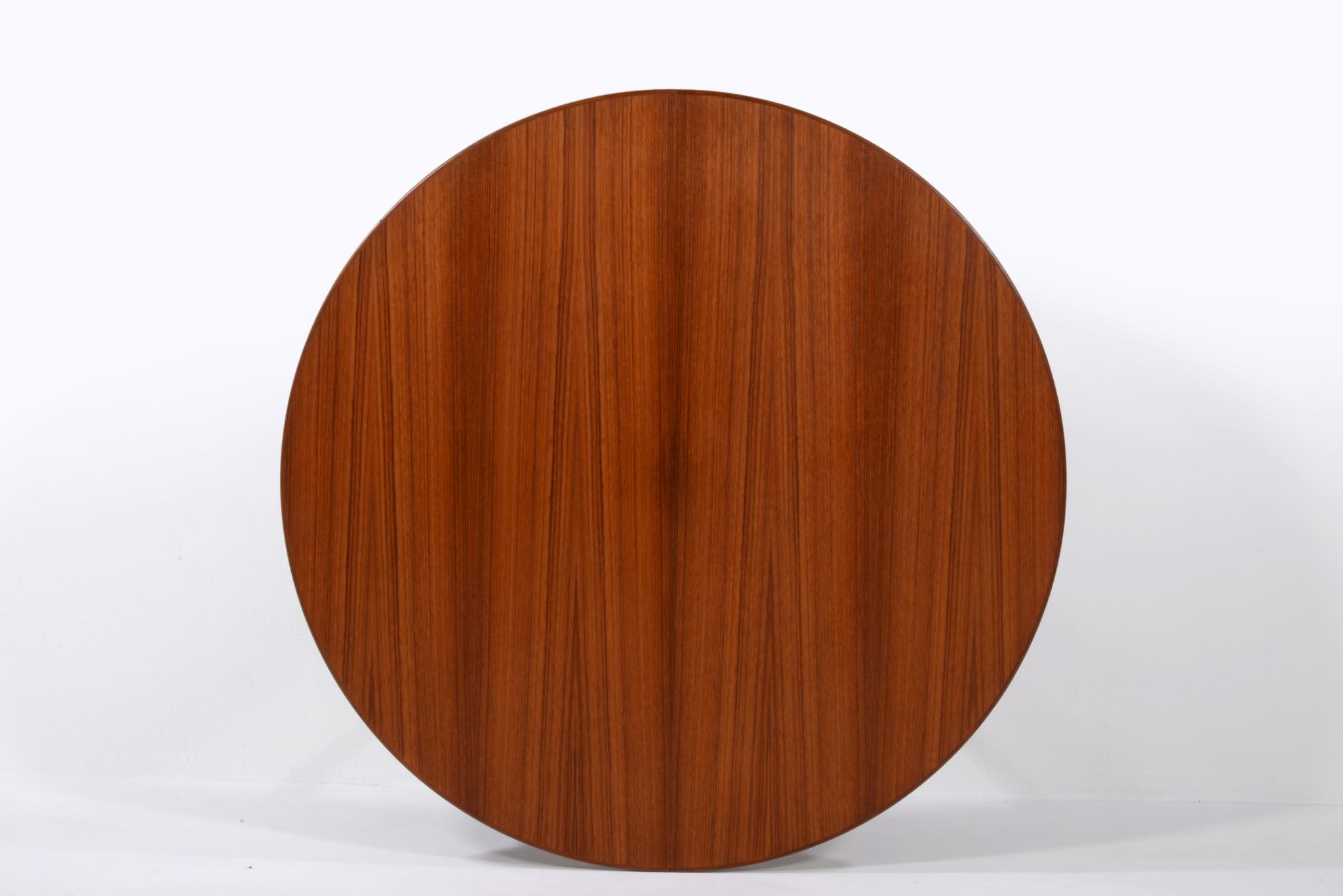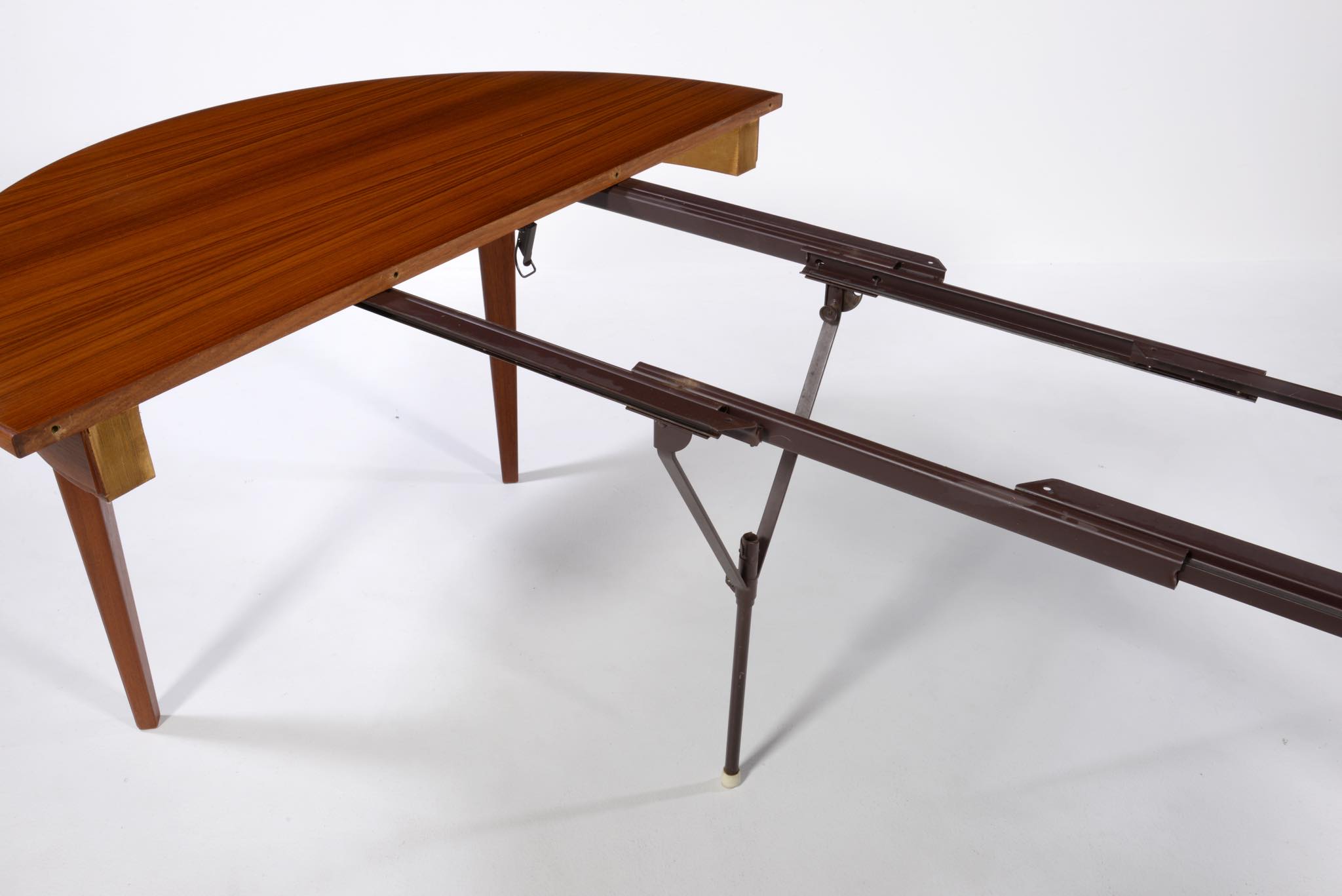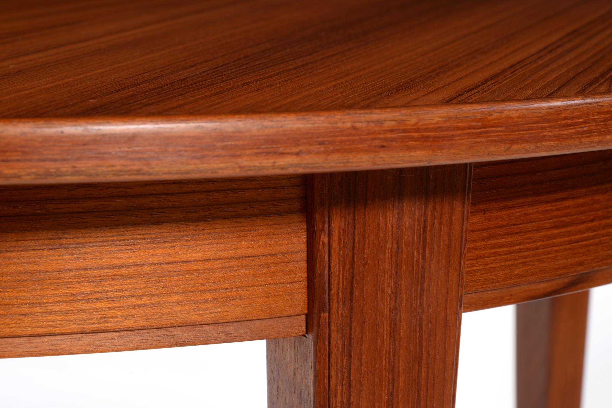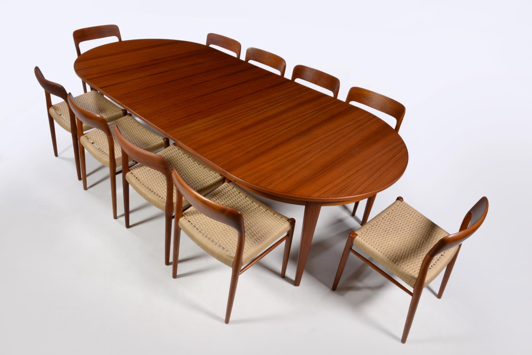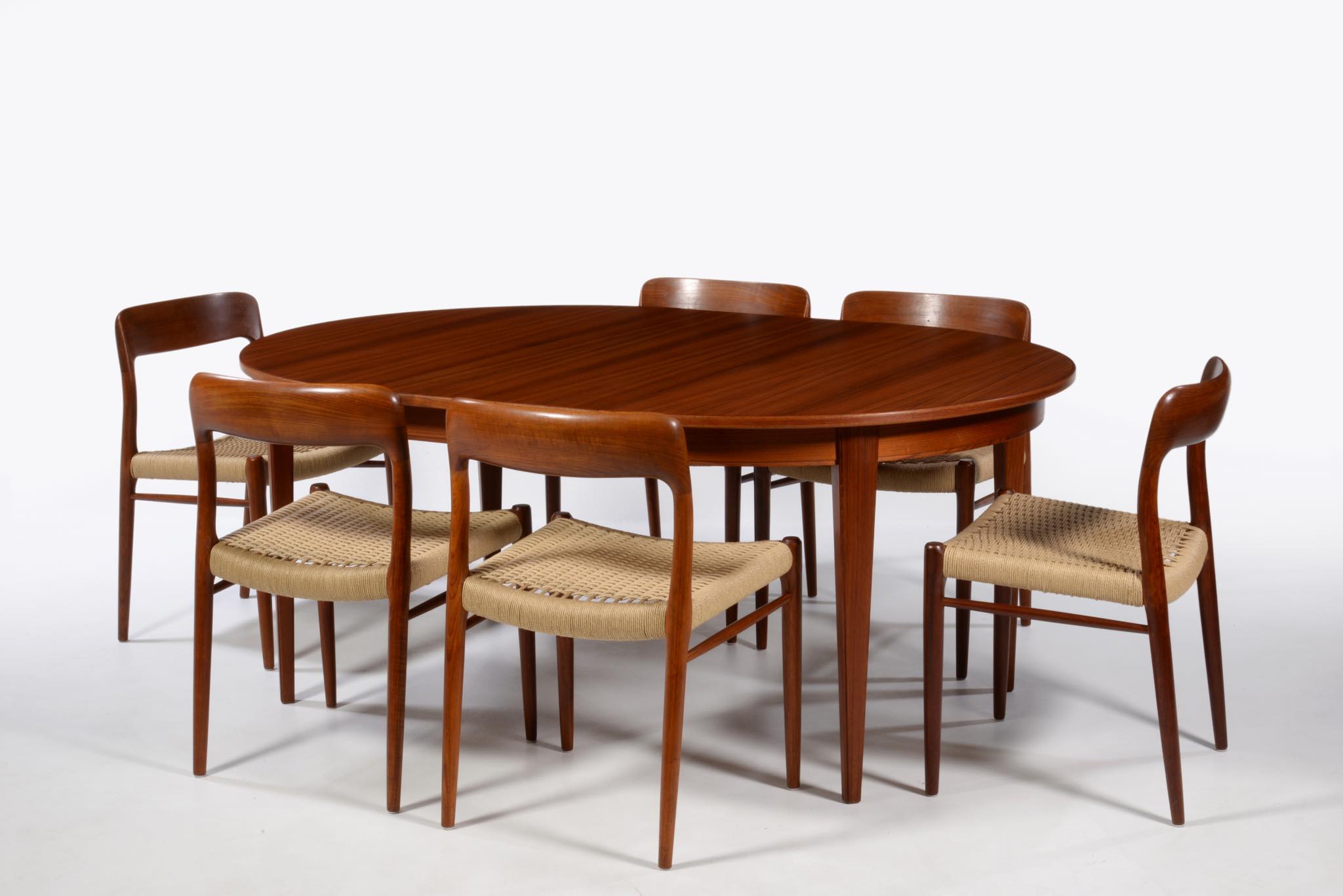 1933年創業のデンマークの家具メーカー、Omann Jun/オマーン・ユンによるダイニングテーブルです。1960年代頃に作られたもので、きれいな柾目のチーク材が天板に用いられています。エクステンションリーフが3枚付属し、最大で270センチまで拡張することが可能です。3枚のエクステンションリーフのうち、2枚には幕板が付属しません。詳しくはお問い合わせください。Omann Junはしっかりとした骨格の家具作りで知られ、1960年代には地元デンマークでも人気を博し、広く普及したようです。