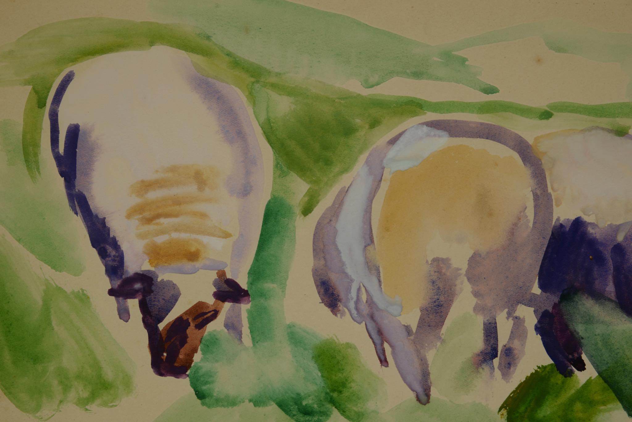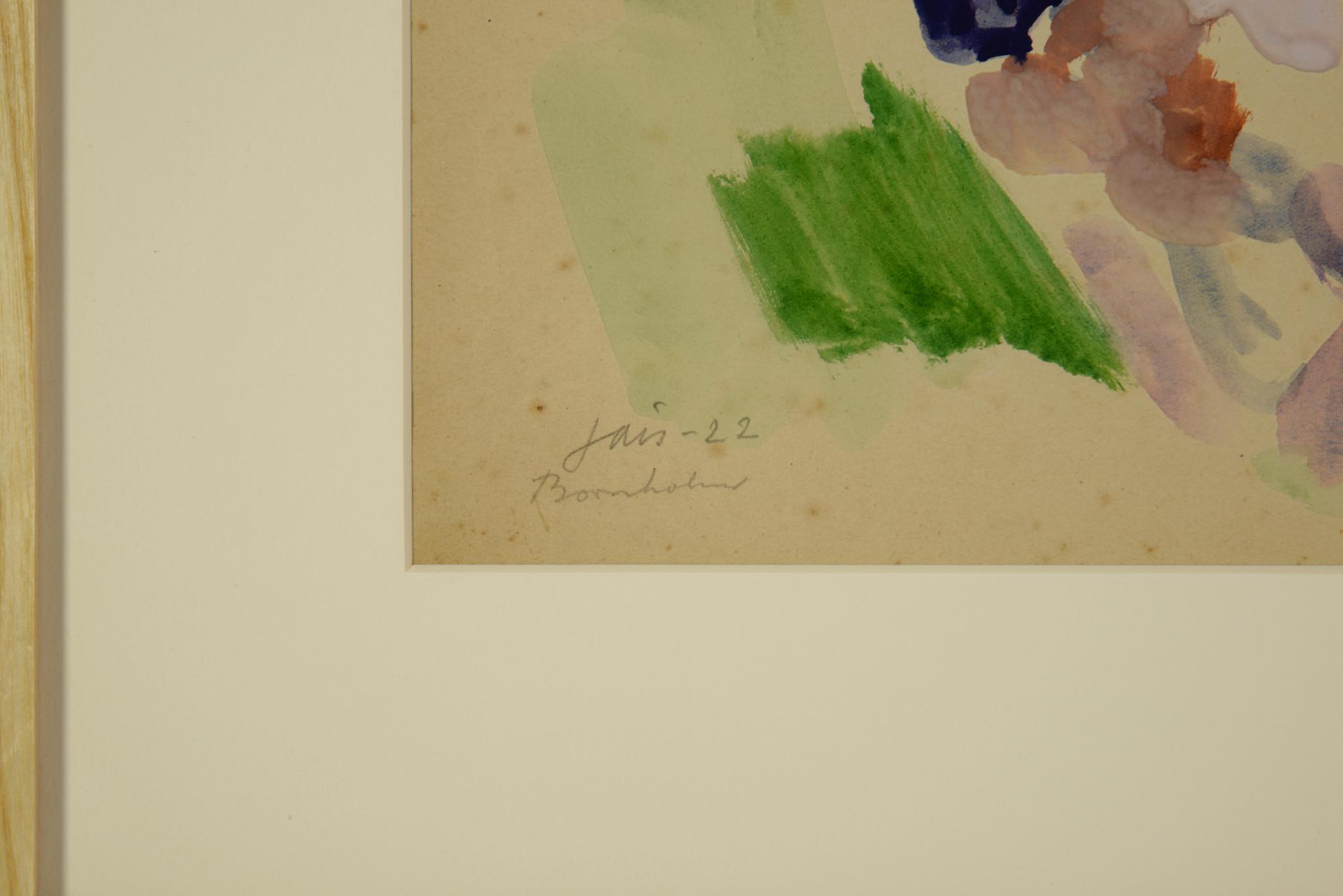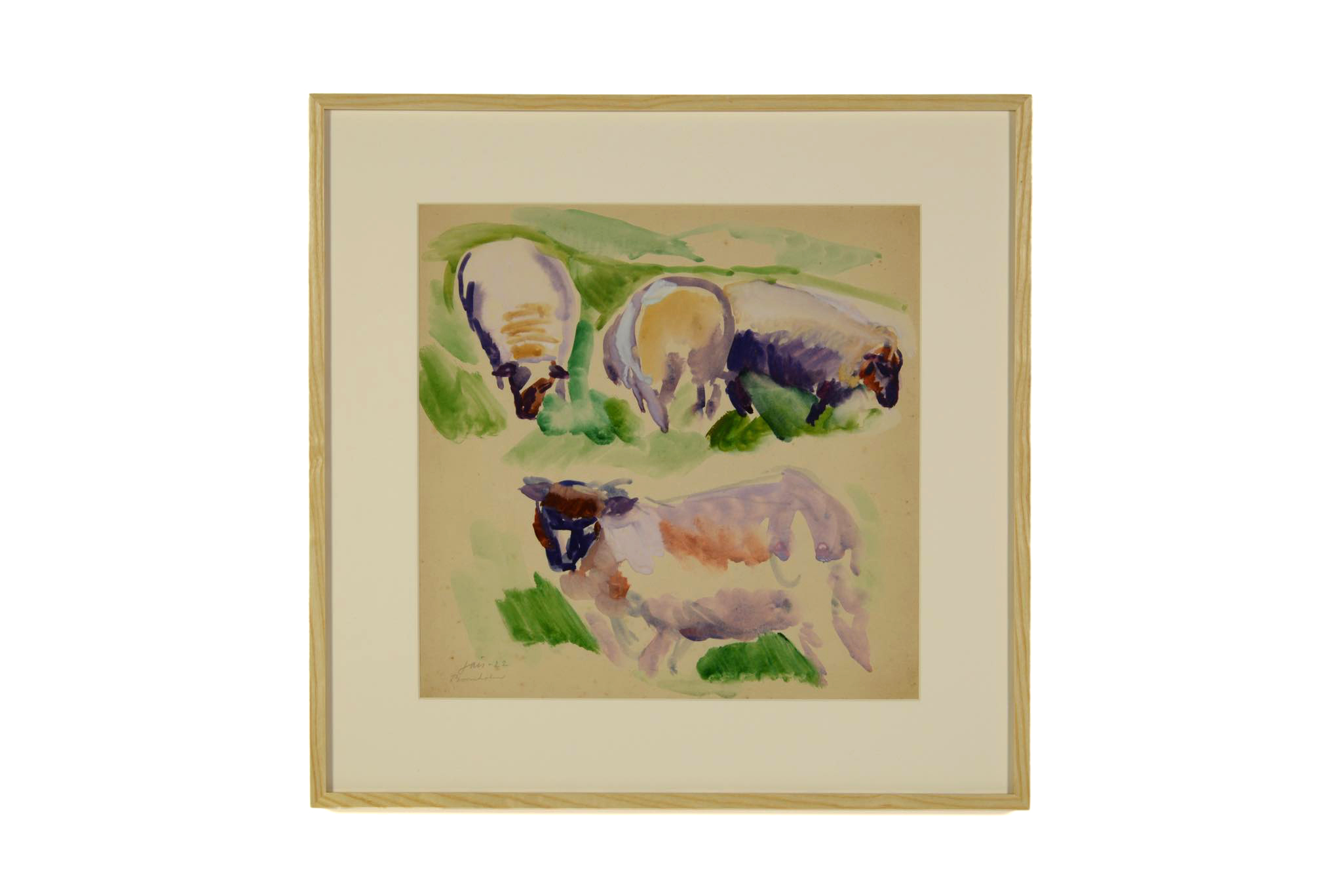 デンマークの画家、Jais Nielsen/ヤイス・ニールセンによる水彩画作品です。1922年に制作されたもので、ボーンホルム島の自然保護区に生息する「羊」が描かれており、その羊の表情にヤイスの表現する独特の世界観が現れています。描かれてから100年近く経つこともあり、経年による染みが発生していますが、一見してきれいな状態です。絵の具は鮮やかに色彩を発しており、色褪せを感じさせません。