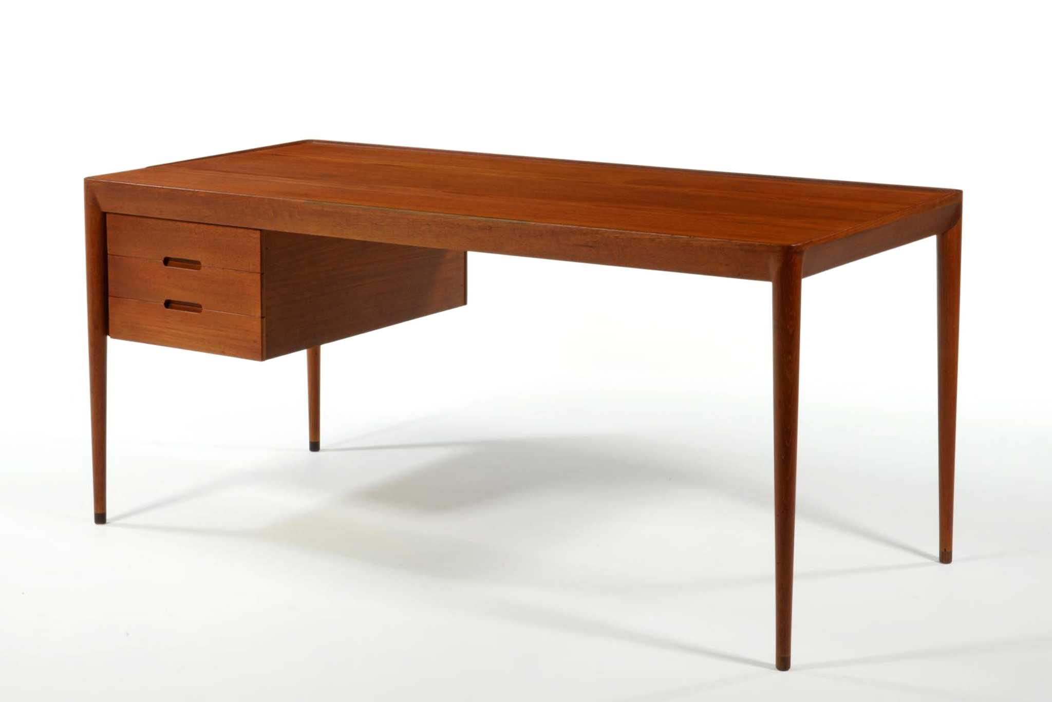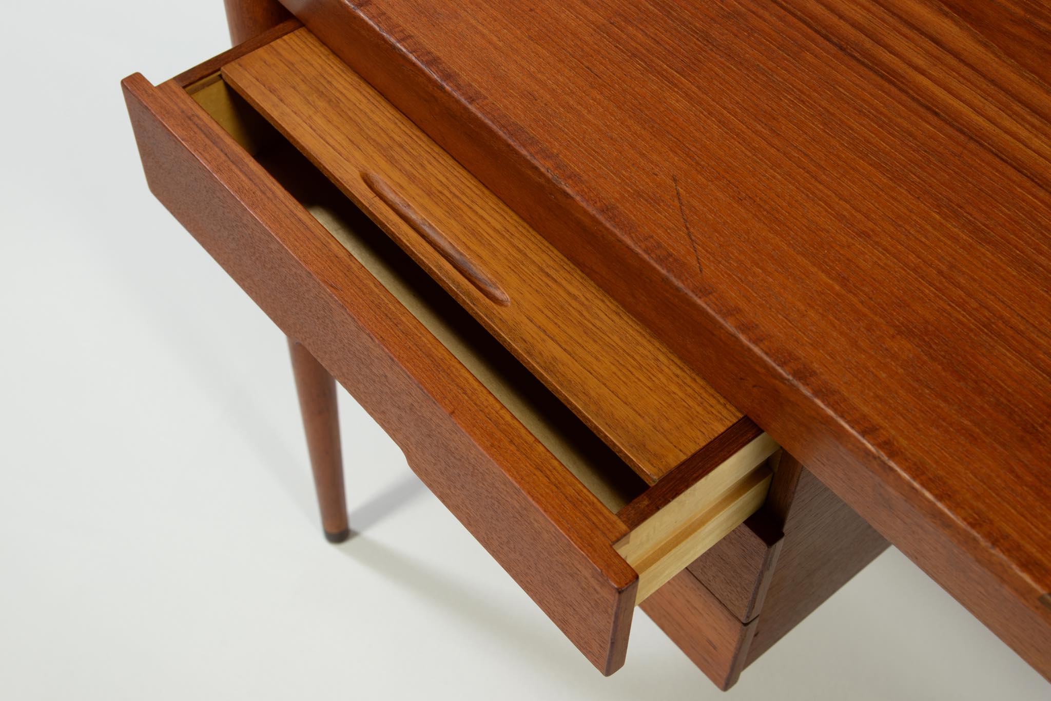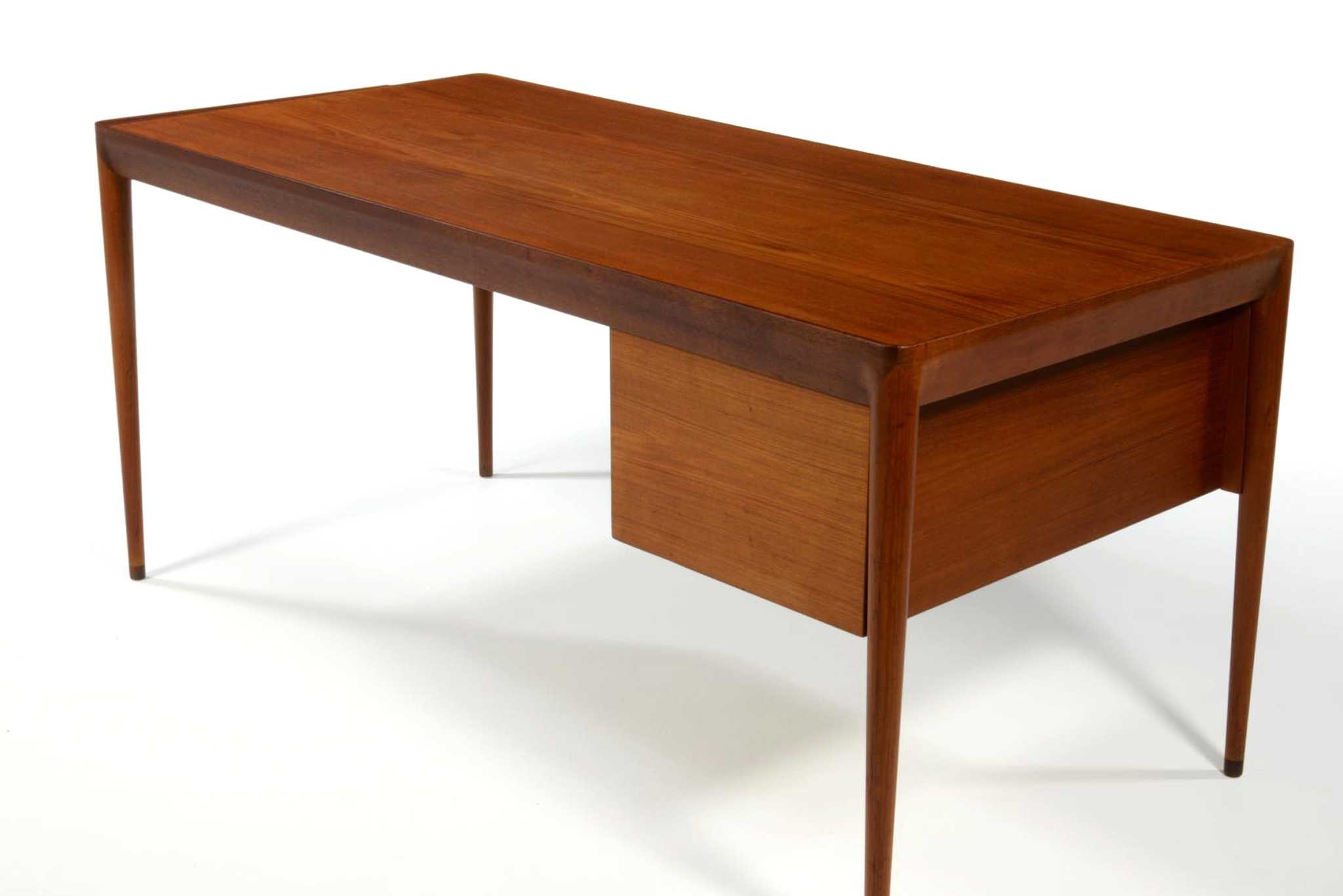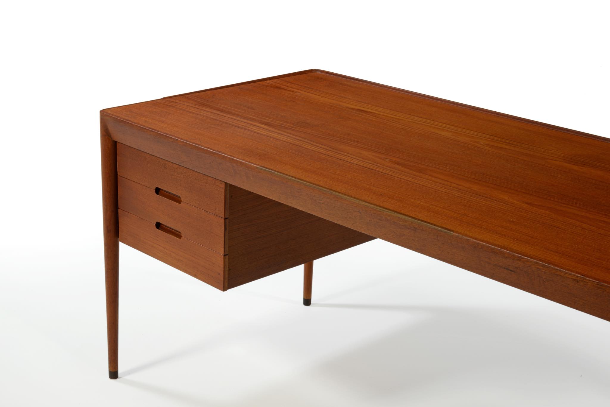 デンマークの家具デザイナー、Erik Riisager Hansen/エリック・リサガー・ハンセンによるライティングデスクです。良質なチーク材を用いたモデルで、有機的なデザインでの脚の接合や、天板のエッジに備わる筆返し、地擦りに備えられたローズウッドなど、シンプルなデザインでありながら手の込んだ作りのものです。かなり使い込まれたようで、全体に小傷や輪染みが見られます。特に、天板のエッジの手前部分に広い範囲で小傷が見られたため、幅50センチほどの呼継ぎ補修を行なっております。コンディションは良好とは言えませんが、しかし良い木取りがなされており、時代感や存在感のある雰囲気の良いデスクです。