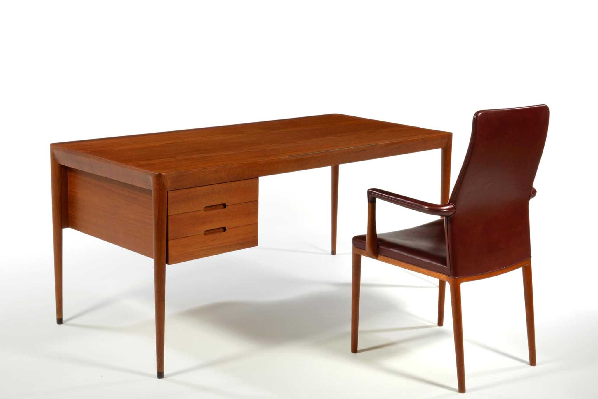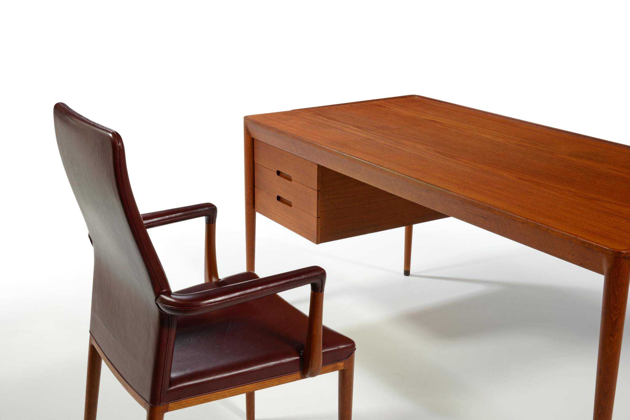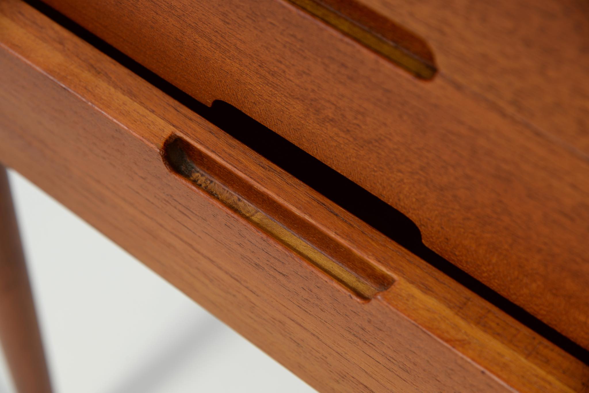 デンマークの家具デザイナー、Erik Riisager Hansen/エリック・リサガー・ハンセンによるライティングデスクです。良質なチーク材を用いたモデルで、有機的なデザインでの脚の接合や、天板のエッジに備わる筆返し、地擦りに備えられたローズウッドなど、シンプルなデザインでありながら手の込んだ作りのものです。かなり使い込まれたようで、全体に小傷や輪染みが見られます。特に、天板のエッジの手前部分に広い範囲で小傷が見られたため、幅50センチほどの呼継ぎ補修を行なっております。コンディションは良好とは言えませんが、しかし良い木取りがなされており、時代感や存在感のある雰囲気の良いデスクです。