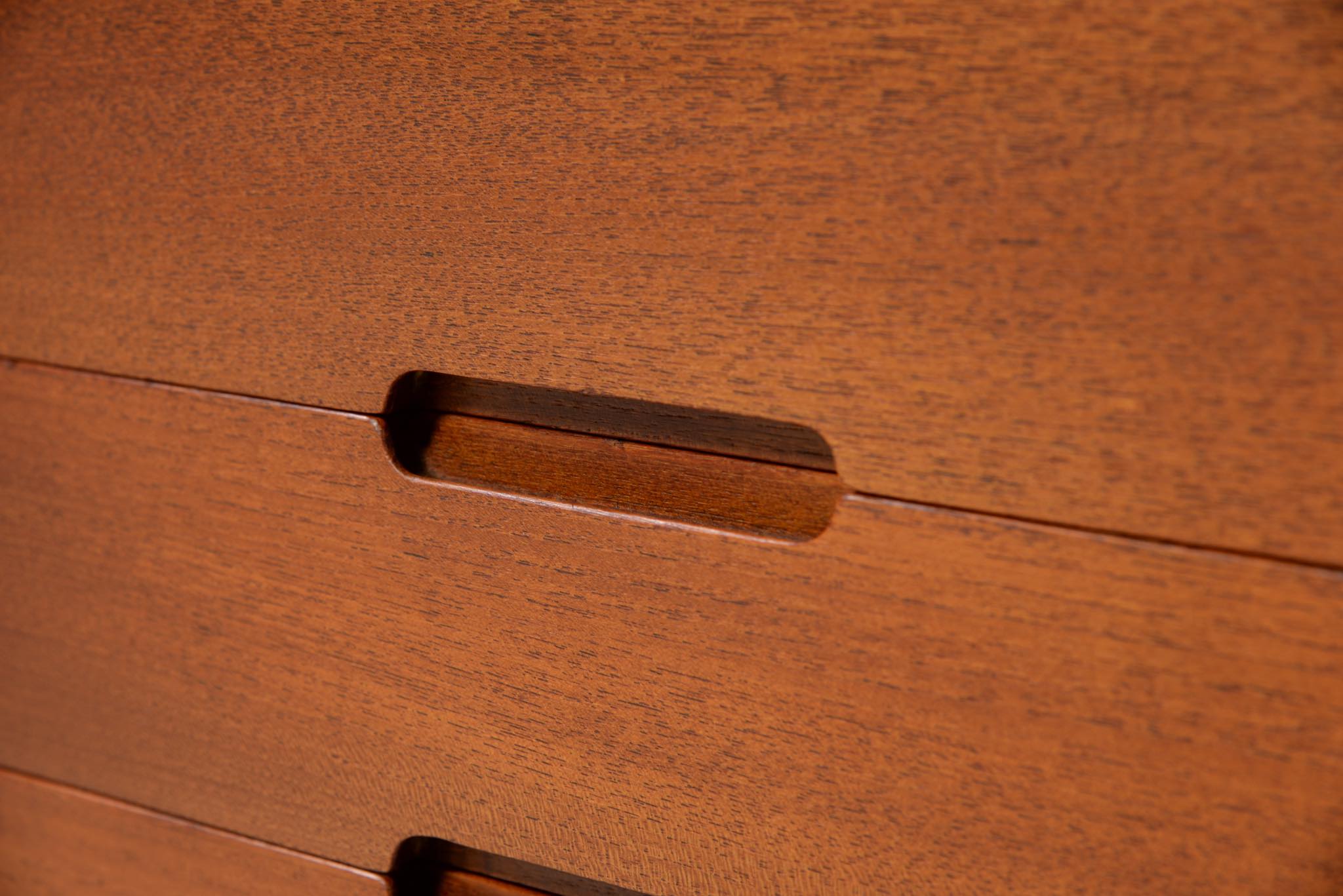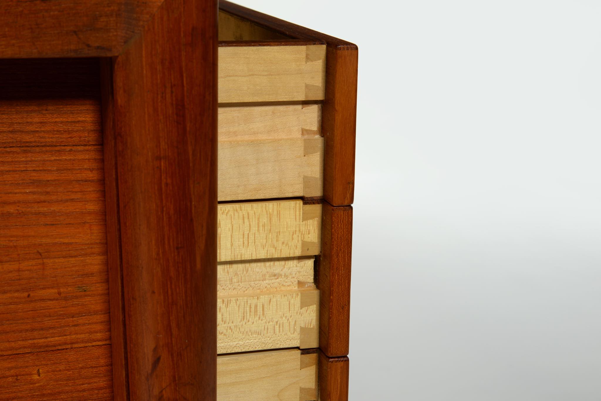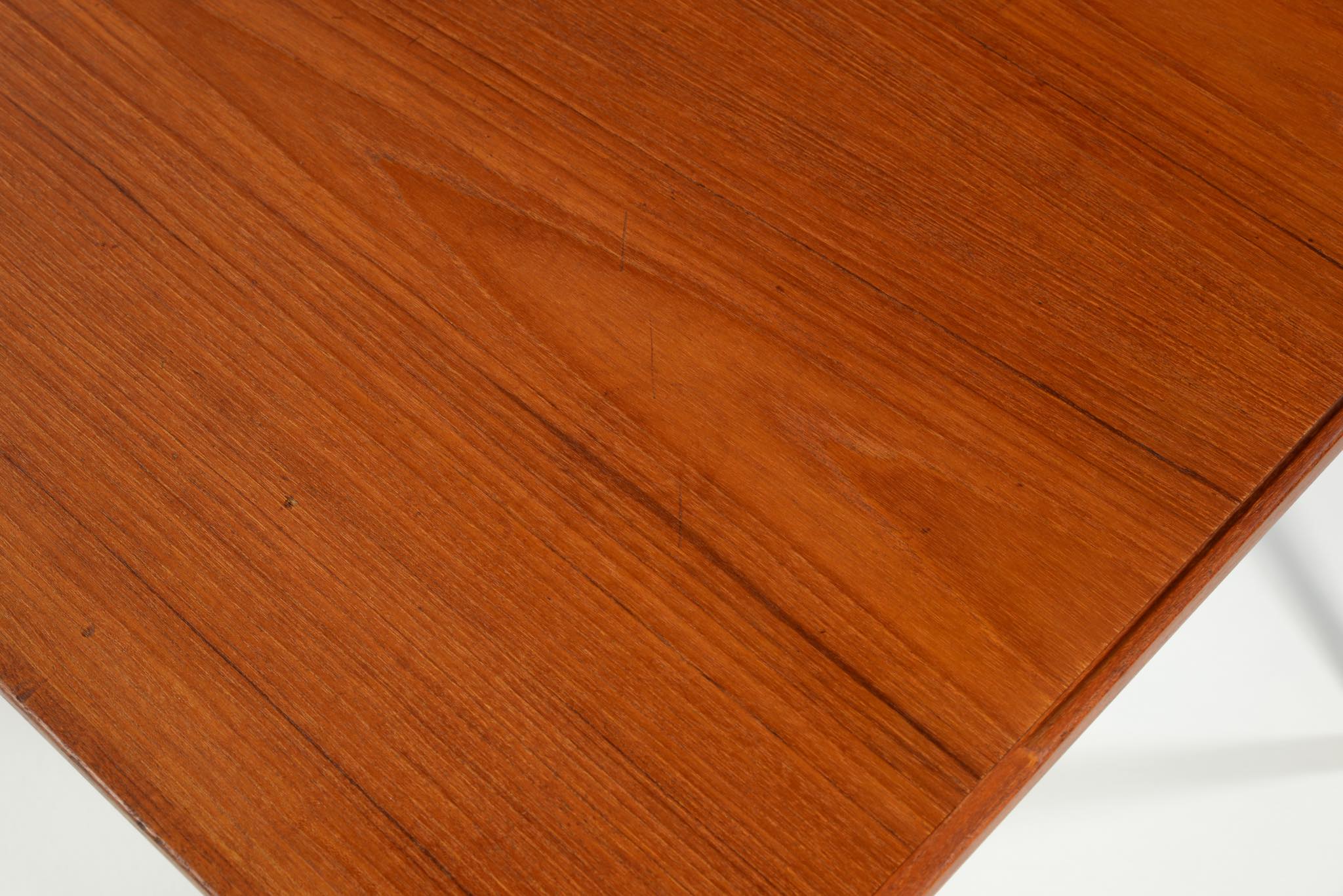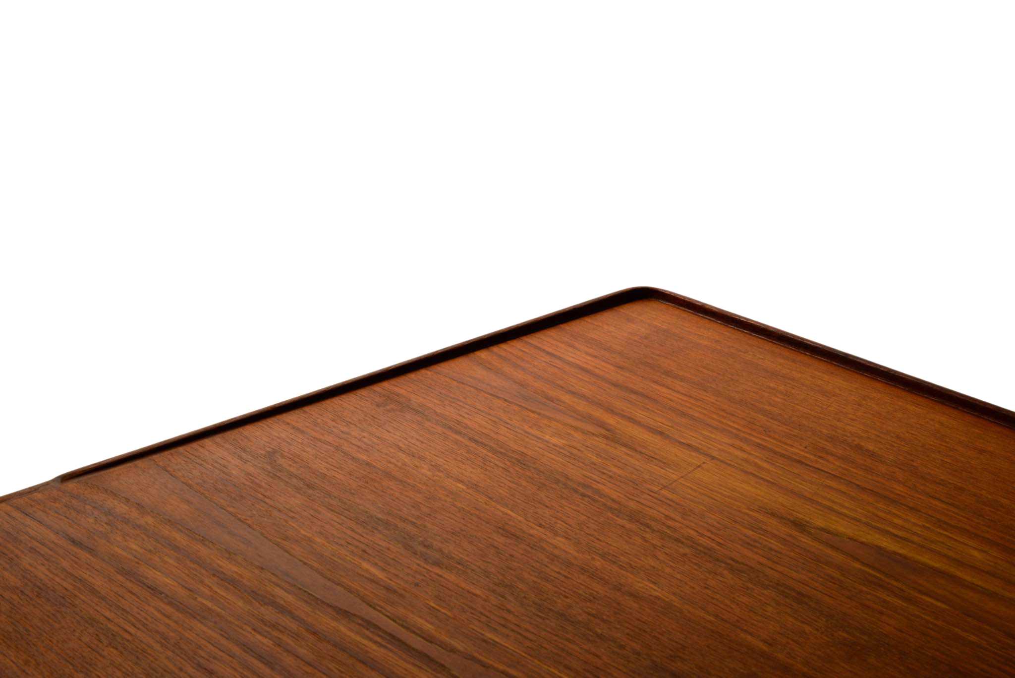 デンマークの家具デザイナー、Erik Riisager Hansen/エリック・リサガー・ハンセンによるライティングデスクです。良質なチーク材を用いたモデルで、有機的なデザインでの脚の接合や、天板のエッジに備わる筆返し、地擦りに備えられたローズウッドなど、シンプルなデザインでありながら手の込んだ作りのものです。かなり使い込まれたようで、全体に小傷や輪染みが見られます。特に、天板のエッジの手前部分に広い範囲で小傷が見られたため、幅50センチほどの呼継ぎ補修を行なっております。コンディションは良好とは言えませんが、しかし良い木取りがなされており、時代感や存在感のある雰囲気の良いデスクです。
