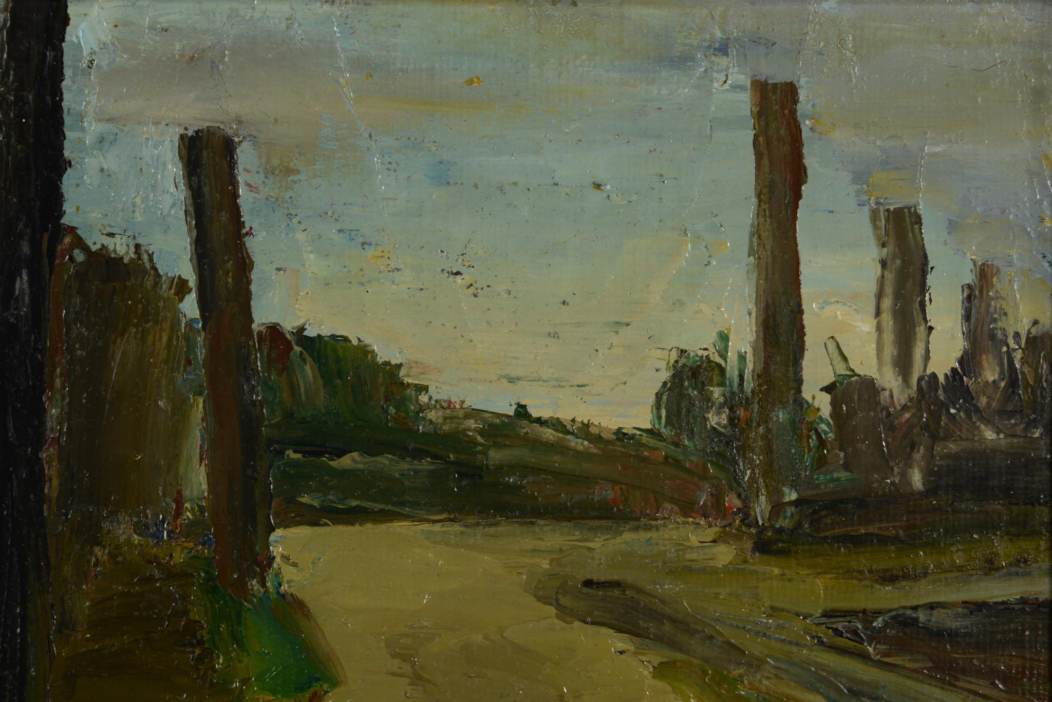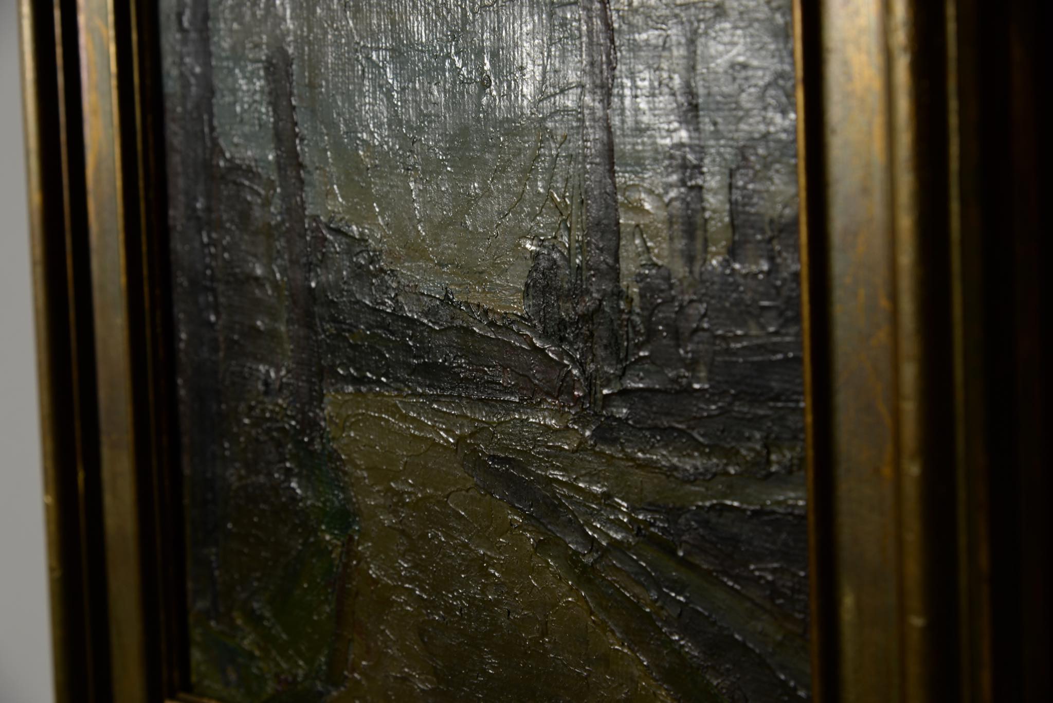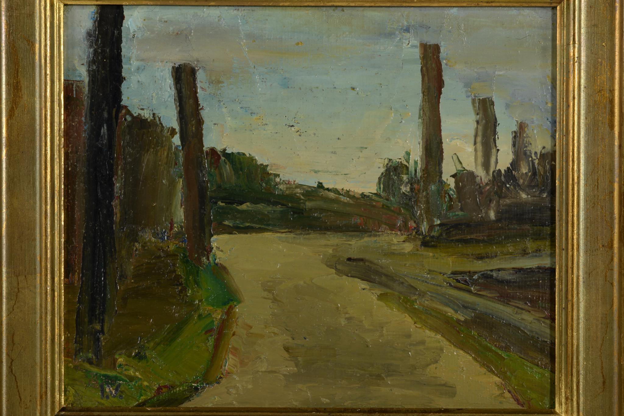 デンマークの画家、Jeppe Vontillius/イェッペ・ヴォンティリウスによって描かれた油彩小品画 ”Vej ved Holte" です。コペンハーゲンから北西に十キロほど上がった小さな街、Holte/ホルテへと続く田舎道が素朴なタッチで描かれています。背後には当時の所有者によって、1948年にコペンハーゲンのDen Permanente/デン・パーマネンテにて購入した記録が記されており、エキシビジョングループ "Bølleblomsten"に在籍していた頃に描かれた作品のようです。フレームはオリジナルのようで、背後に板が嵌っていますが、絵画自体はキャンバスに描かれています。コンディションですが、小傷が若干見られ、特にサインの部分に絵の具の剥落が見られます。