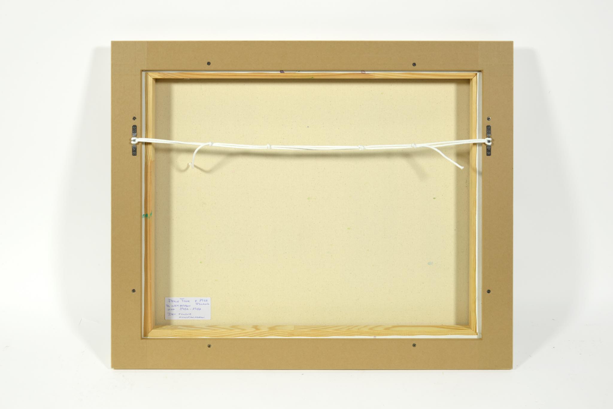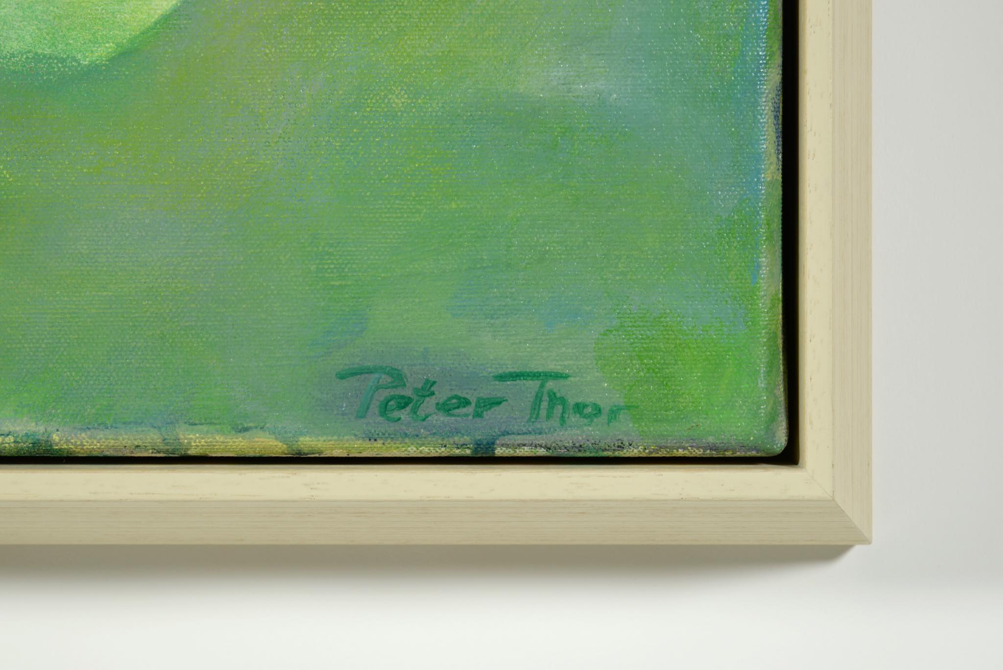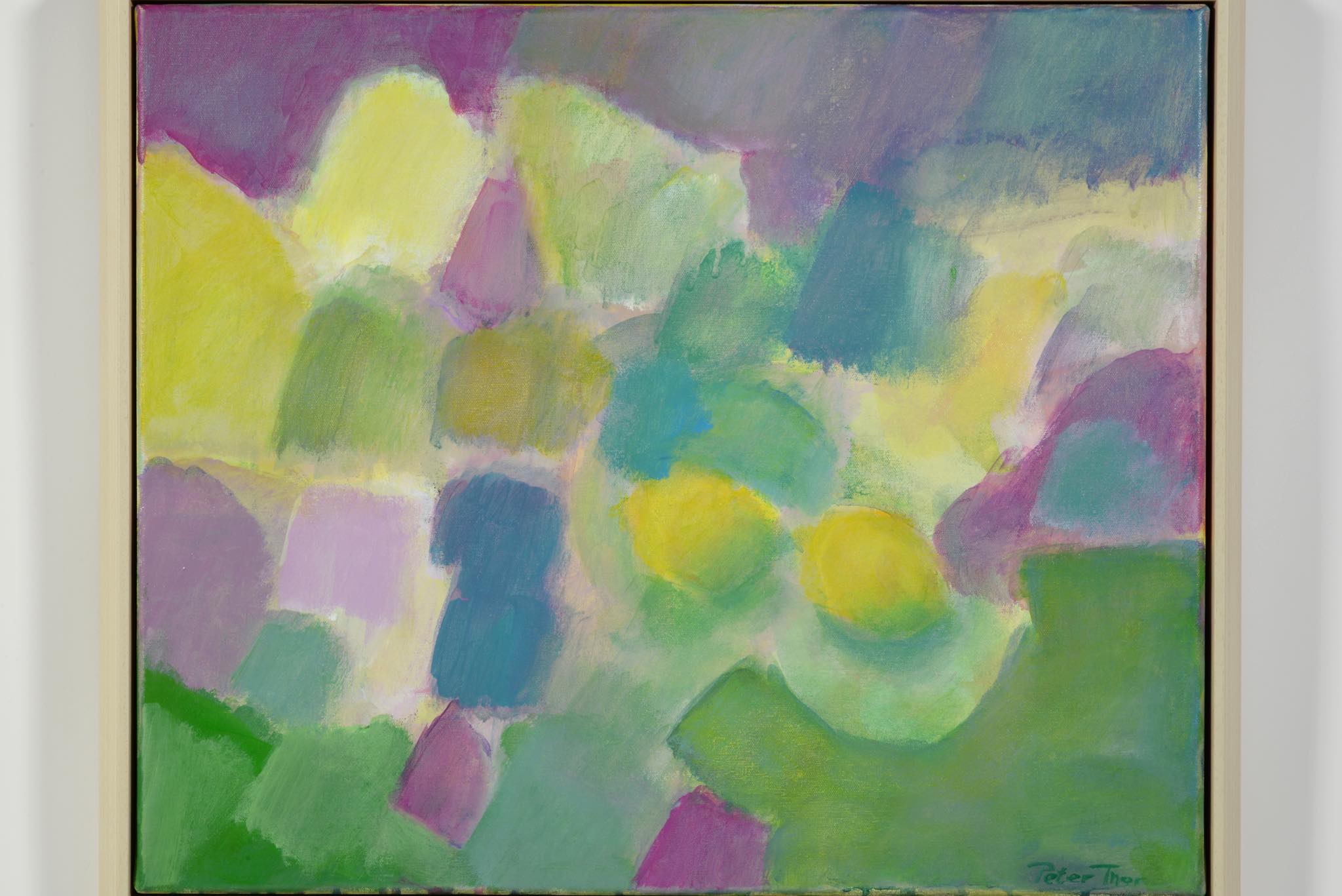 アイスランド出身のアーティスト、Peter Thor Gunnarsson/ピーター・トール・グンナーソンによる、コンポジション油彩作品です。淡いタッチで描かれたもので、おそらく1980年代に描かれたものでしょう。フレームは国内で設えました。春の陽気を感じさせる明るい作品です。