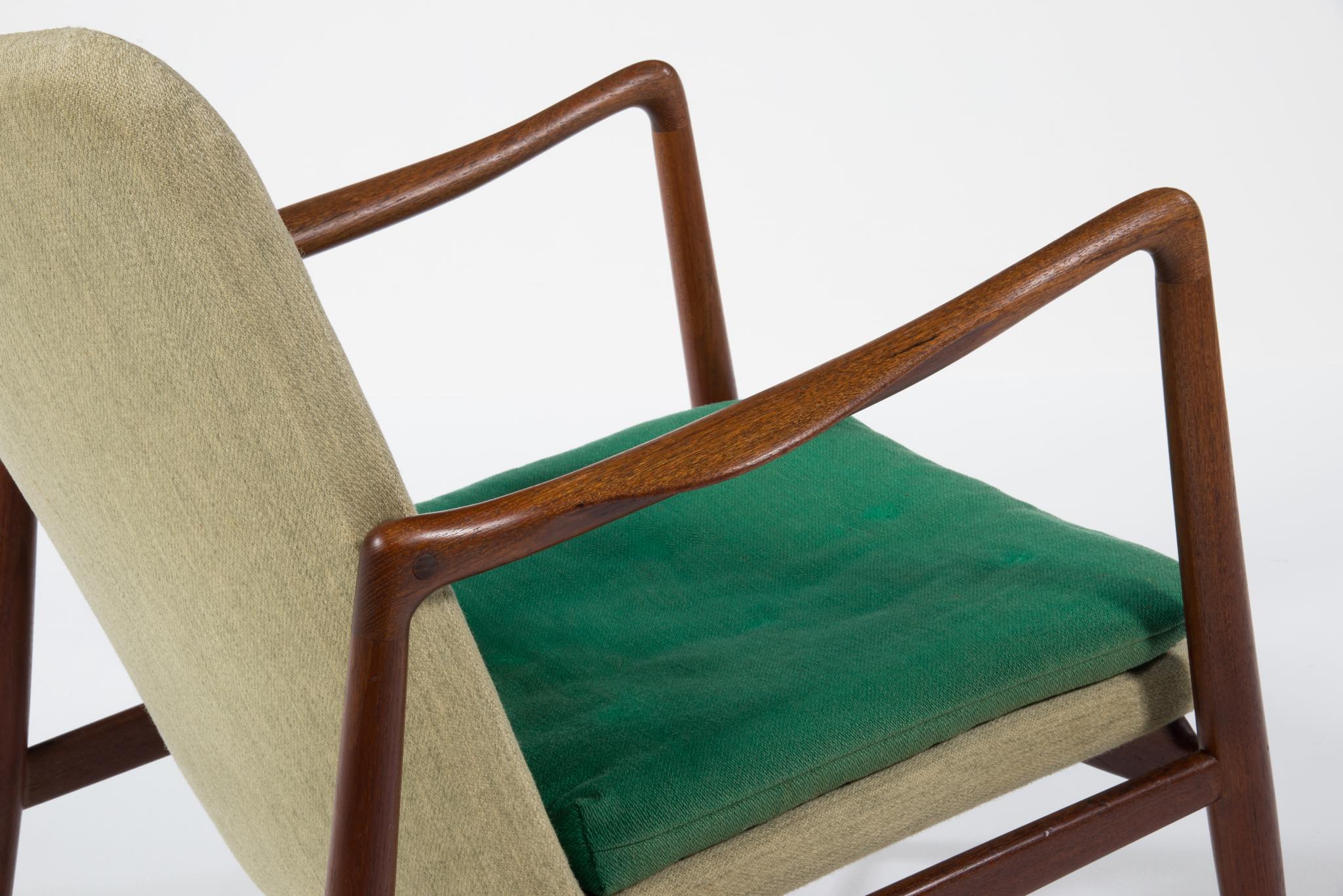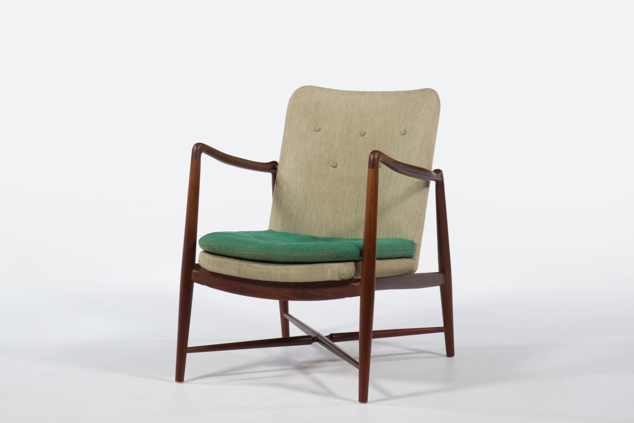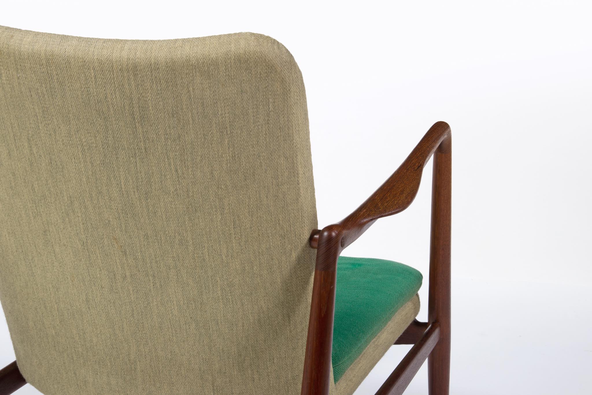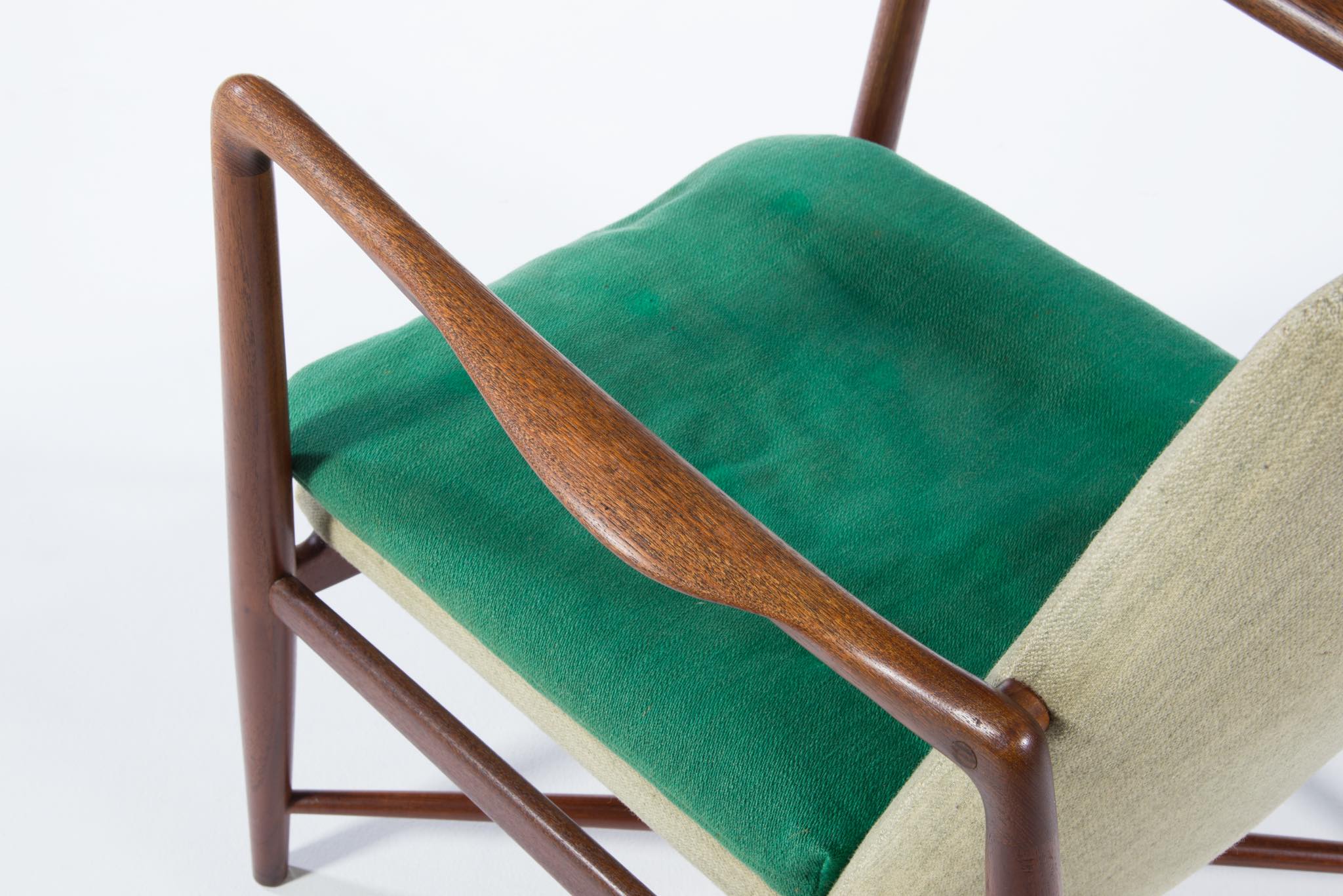 デンマークを代表する家具デザイナー、Finn Juhl/フィン・ユールによるイージーチェア「BO59」です。 通称 "ファイヤープレイス"と呼ばれるモデルで、細身の本体と座面下で交差する貫が特徴のモデルです。 タイ国原産と思しき良質なチーク材が用いられており、整った木目やきめ細やかな木肌が見所です。構造的にはしっかりしております。資料としての価値もあろうかと思われるオリジナルと思しきファブリックは、専門職に依頼し洗剤水を生地に浸透させ古い汚れを吸い出すクリーニングを施しておりますが、経年の汚れは否めません。張り替え(別費用)のご相談も承ります。