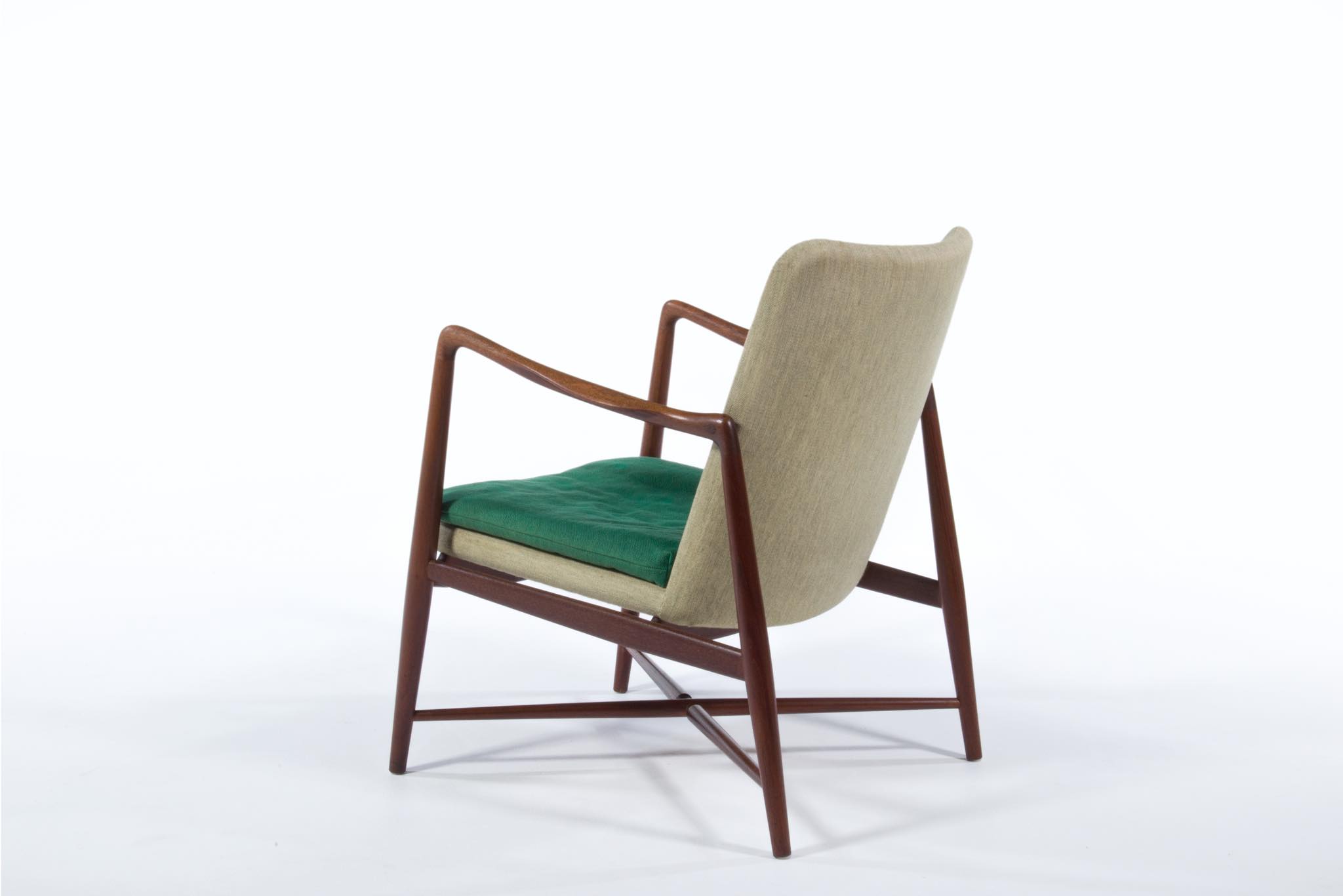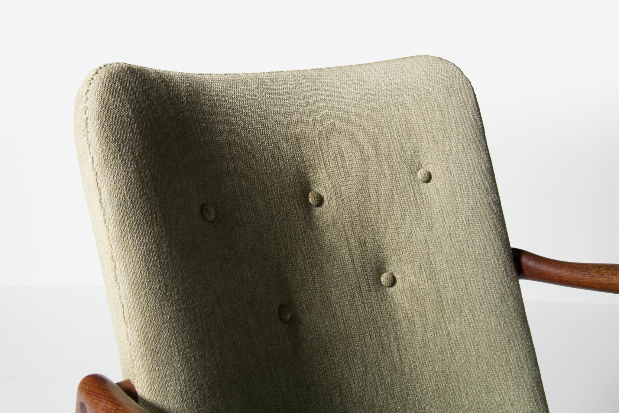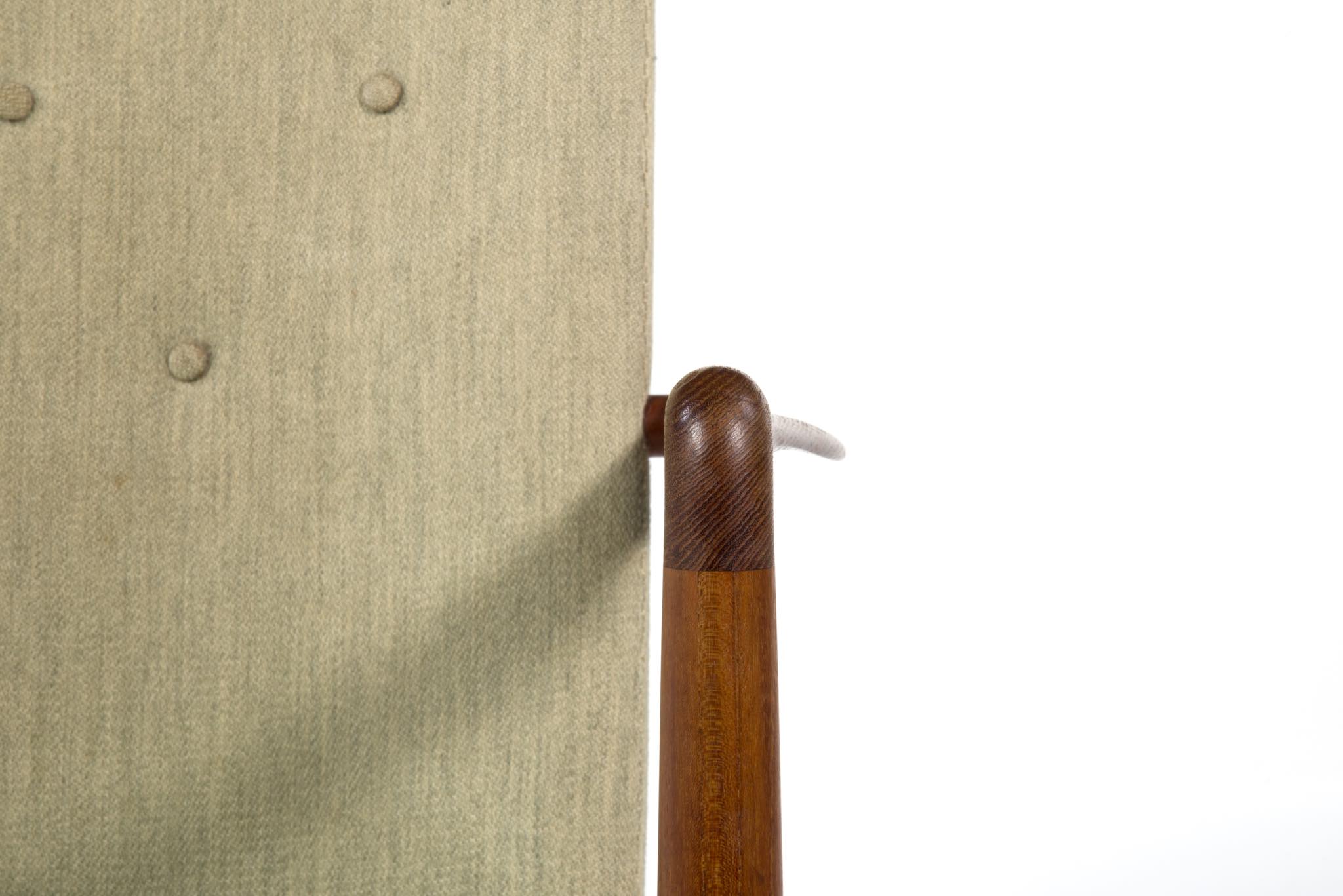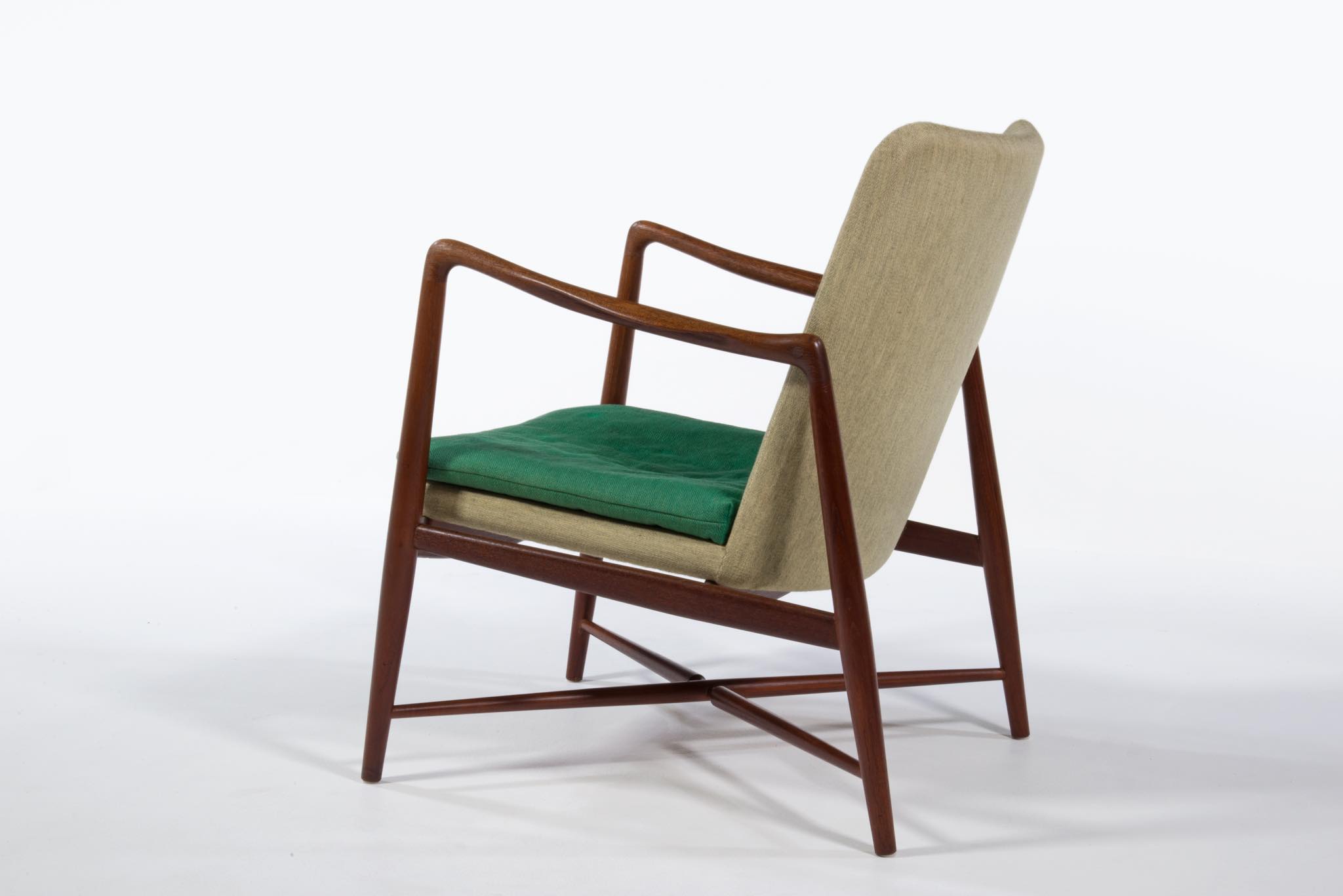 デンマークを代表する家具デザイナー、Finn Juhl/フィン・ユールによるイージーチェア「BO59」です。 通称 "ファイヤープレイス"と呼ばれるモデルで、細身の本体と座面下で交差する貫が特徴のモデルです。 タイ国原産と思しき良質なチーク材が用いられており、整った木目やきめ細やかな木肌が見所です。構造的にはしっかりしております。資料としての価値もあろうかと思われるオリジナルと思しきファブリックは、専門職に依頼し洗剤水を生地に浸透させ古い汚れを吸い出すクリーニングを施しておりますが、経年の汚れは否めません。張り替え(別費用)のご相談も承ります。