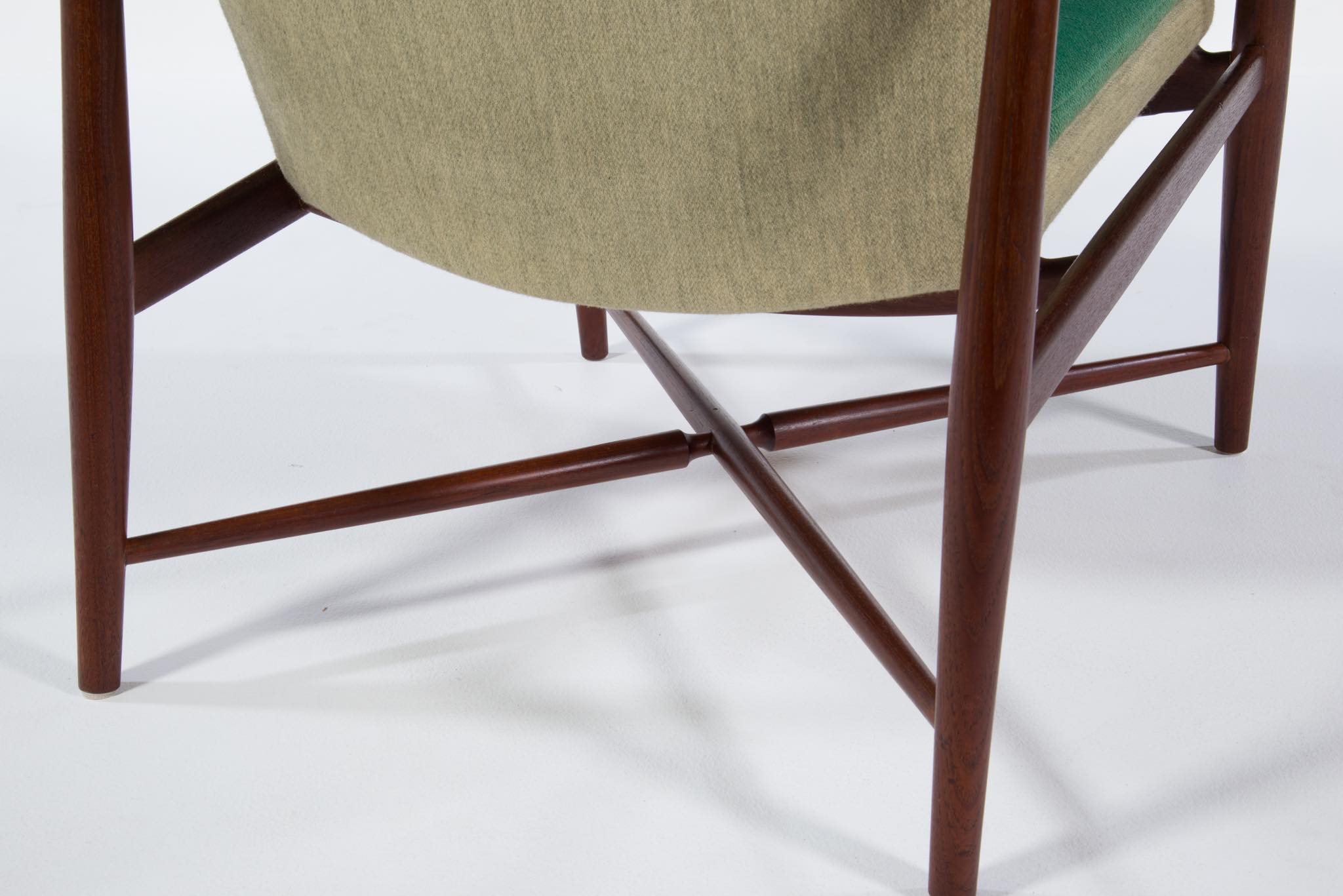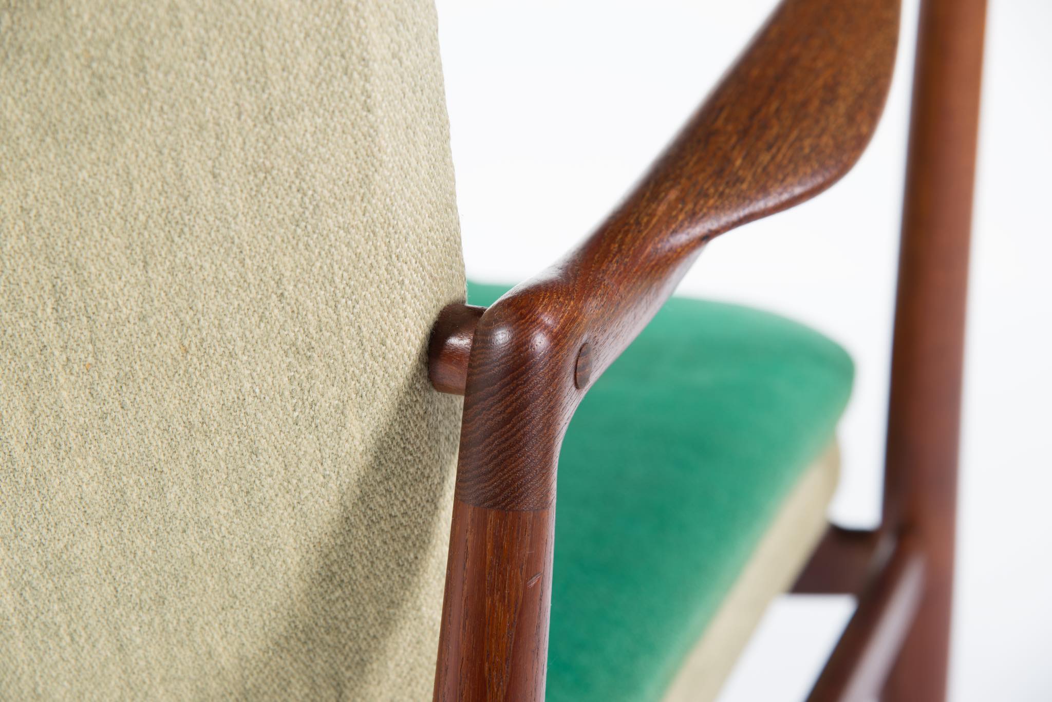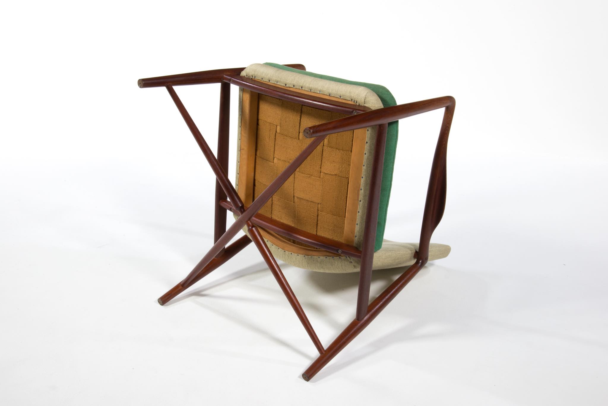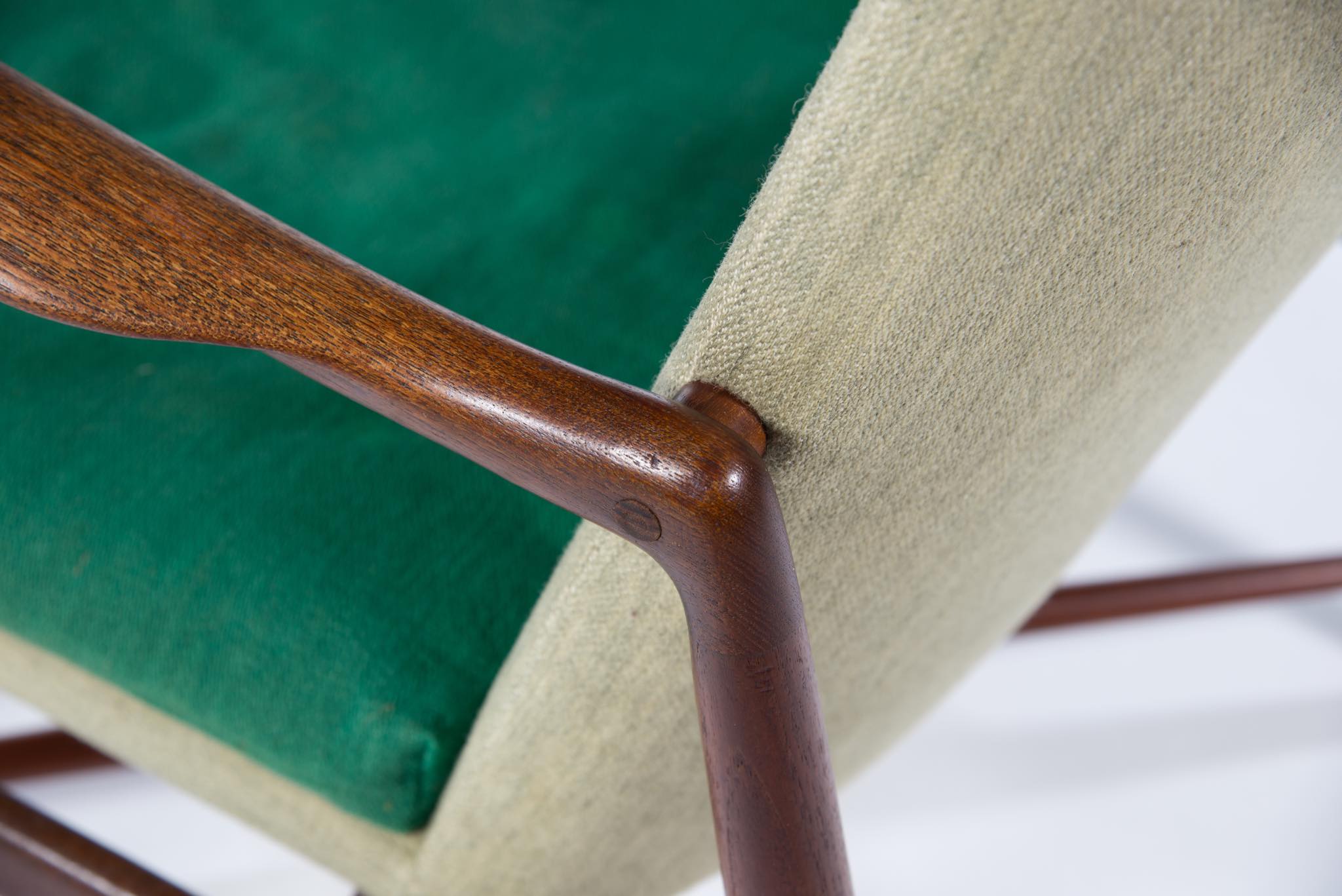 デンマークを代表する家具デザイナー、Finn Juhl/フィン・ユールによるイージーチェア「BO59」です。 通称 "ファイヤープレイス"と呼ばれるモデルで、細身の本体と座面下で交差する貫が特徴のモデルです。 タイ国原産と思しき良質なチーク材が用いられており、整った木目やきめ細やかな木肌が見所です。構造的にはしっかりしております。資料としての価値もあろうかと思われるオリジナルと思しきファブリックは、専門職に依頼し洗剤水を生地に浸透させ古い汚れを吸い出すクリーニングを施しておりますが、経年の汚れは否めません。張り替え(別費用)のご相談も承ります。