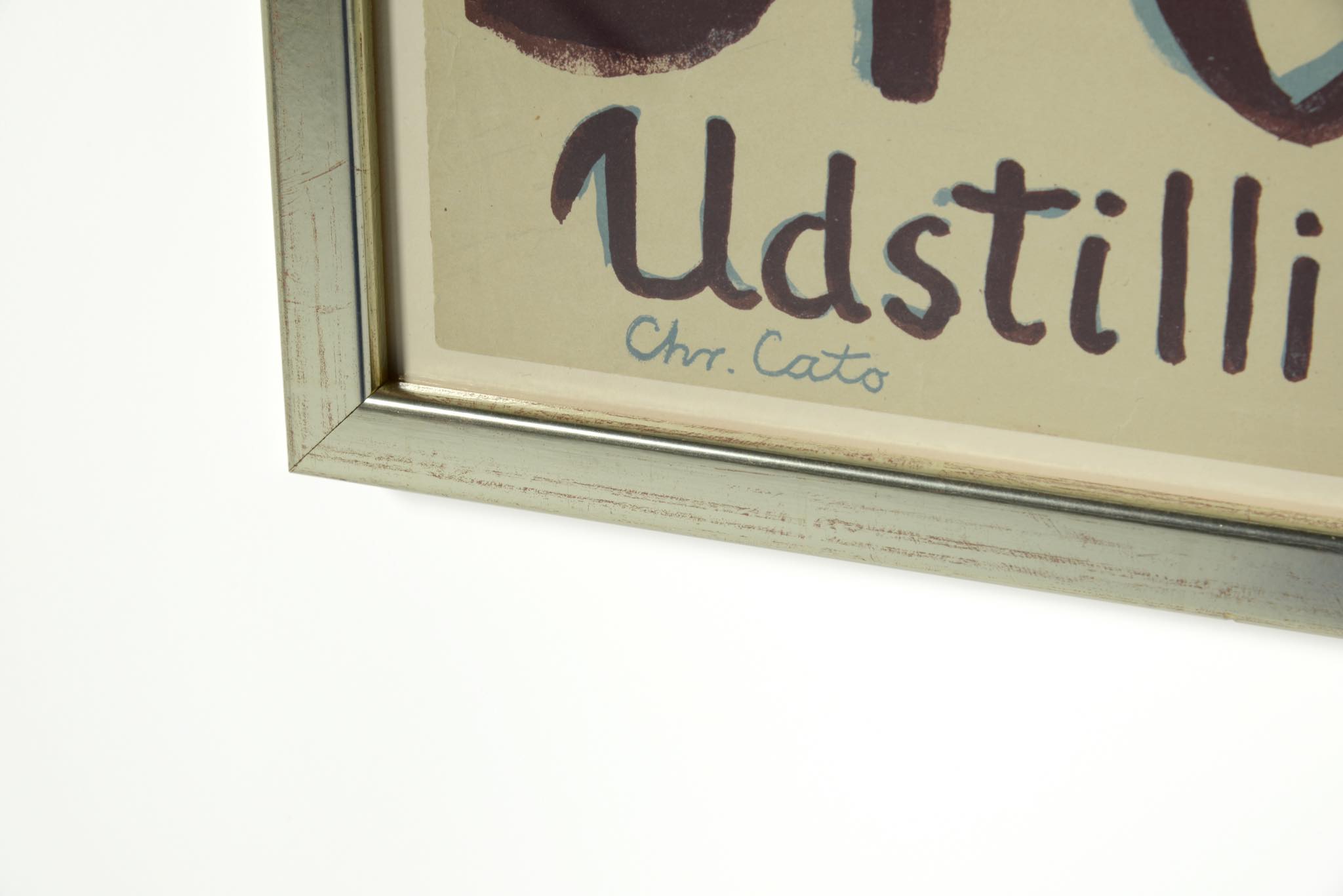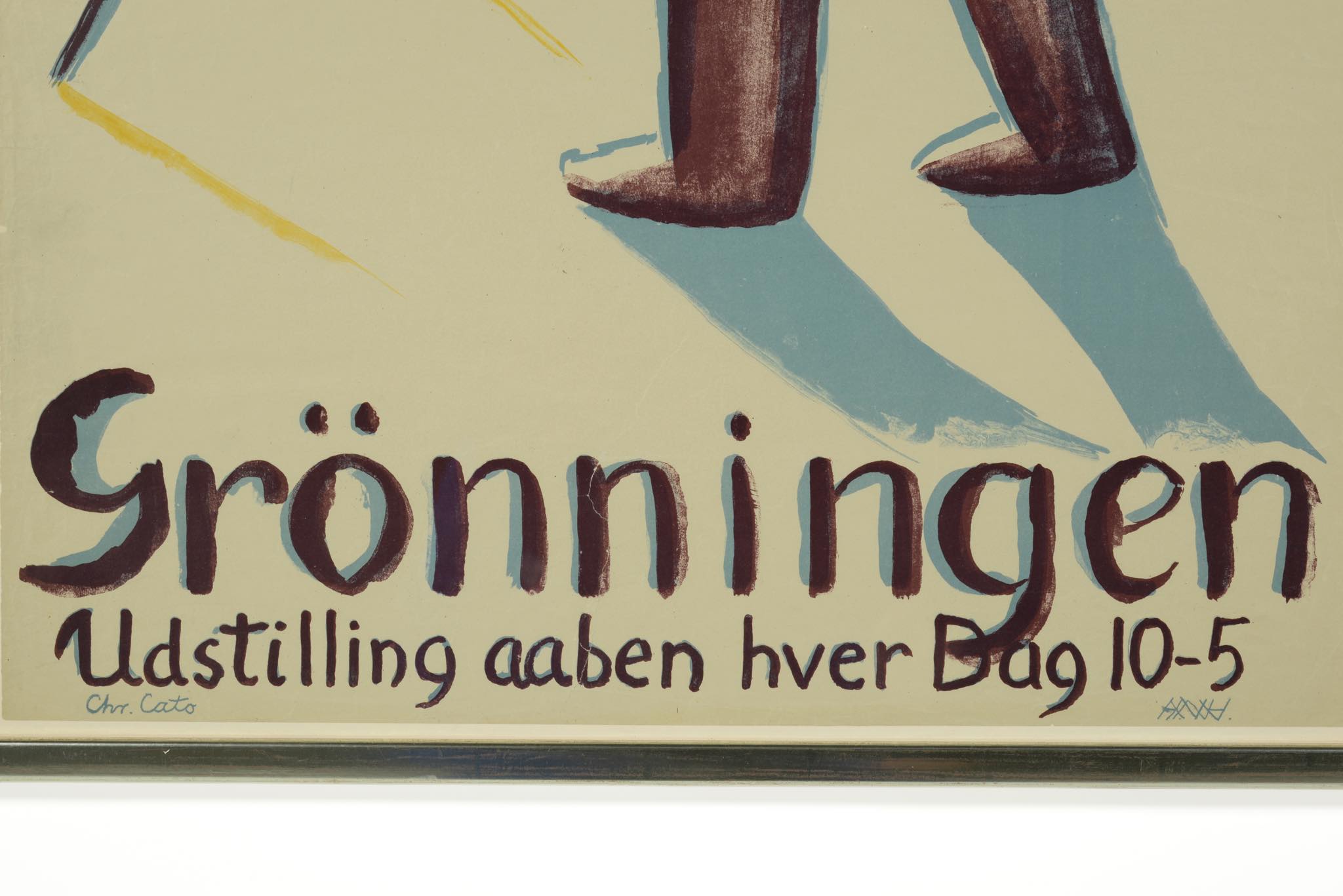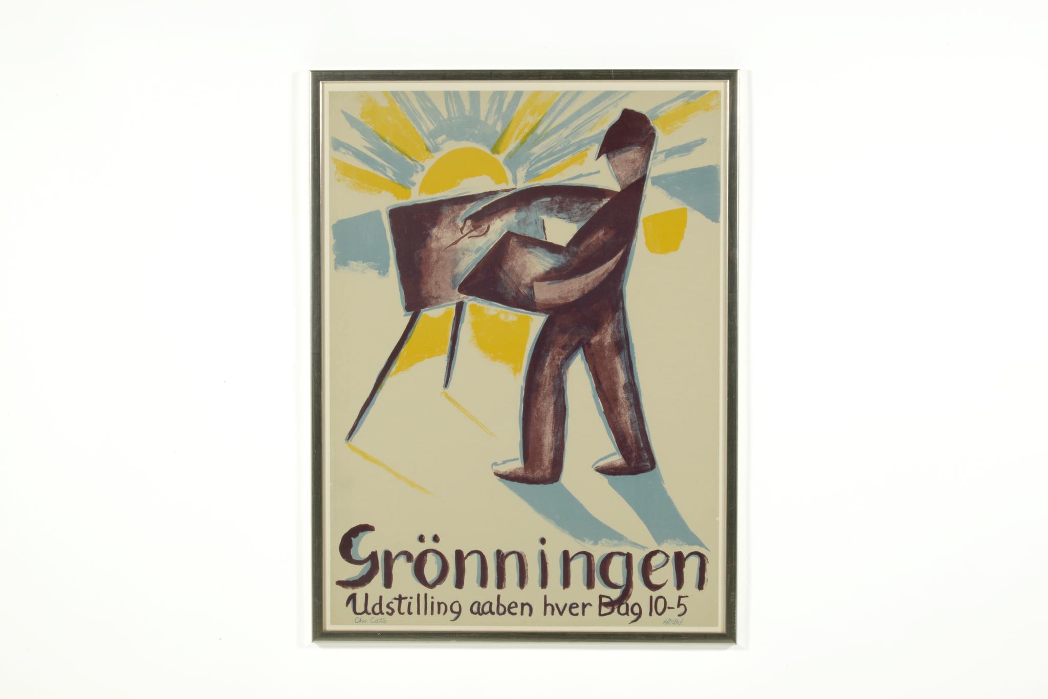 デンマークのアーティスト、Albert Naur/アルベルト・ナウアによる "Grønningen" エキシビジョン用リトグラフポスターです。原画は1921年に描かれたもので、朝日に向かって絵を描く画家の姿が強いインパクトで表現されています。こちらは、同展覧会がその原画をシンボルマークとして採用し、エキシビジョンの開場時間の案内用に作られたポスターです。同展覧会は現在に至るまでこの図案をシンボルマークとして頻繁に使用しています。こちらのポスターはリトグラフで刷られており、色彩が鮮やかです。紙は古く、皺や折れた箇所が見受けられ、コンディションとしてはまずまずと言ったところでしょう。銀箔のフレームは古い時代に誂えられたものと思われます。