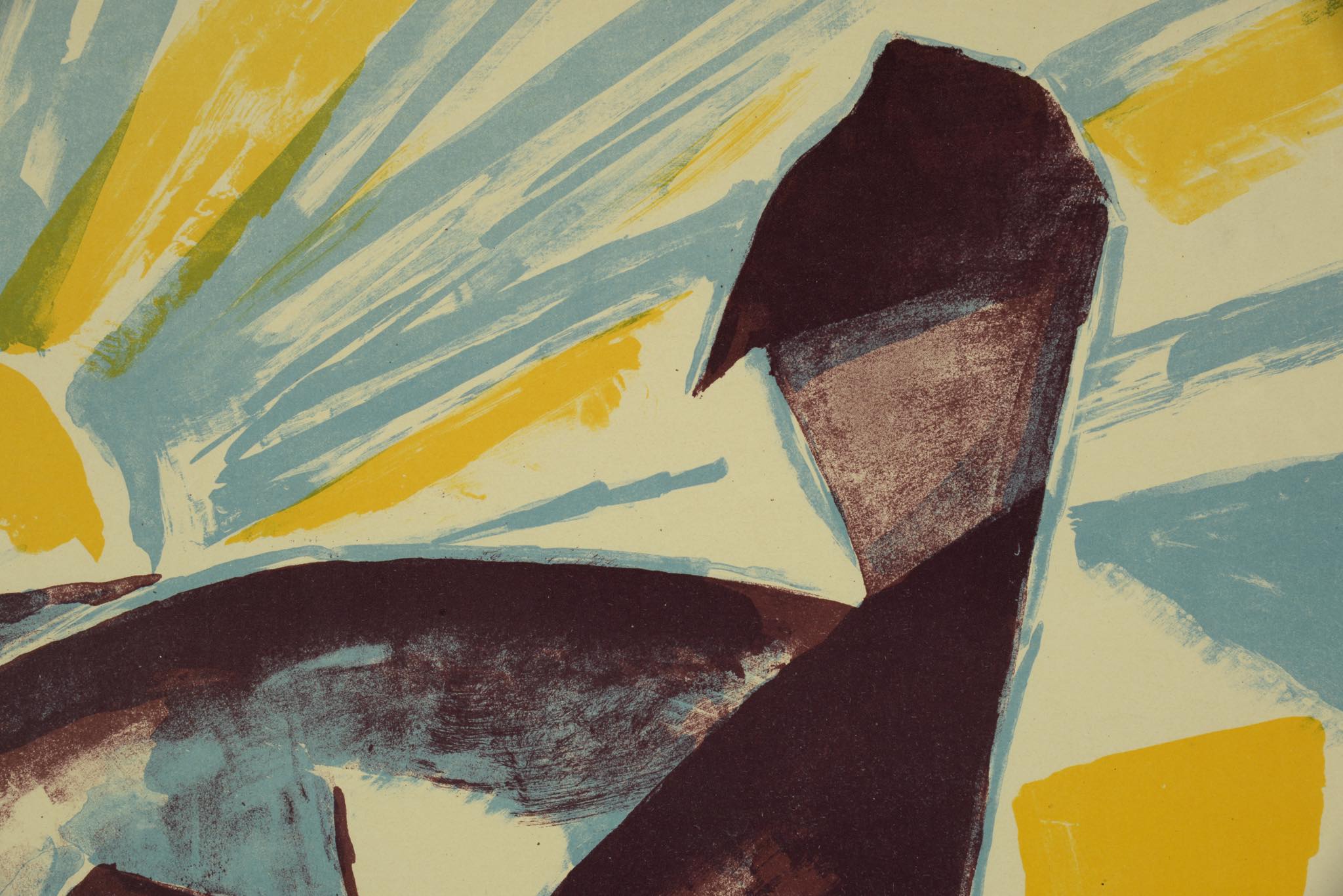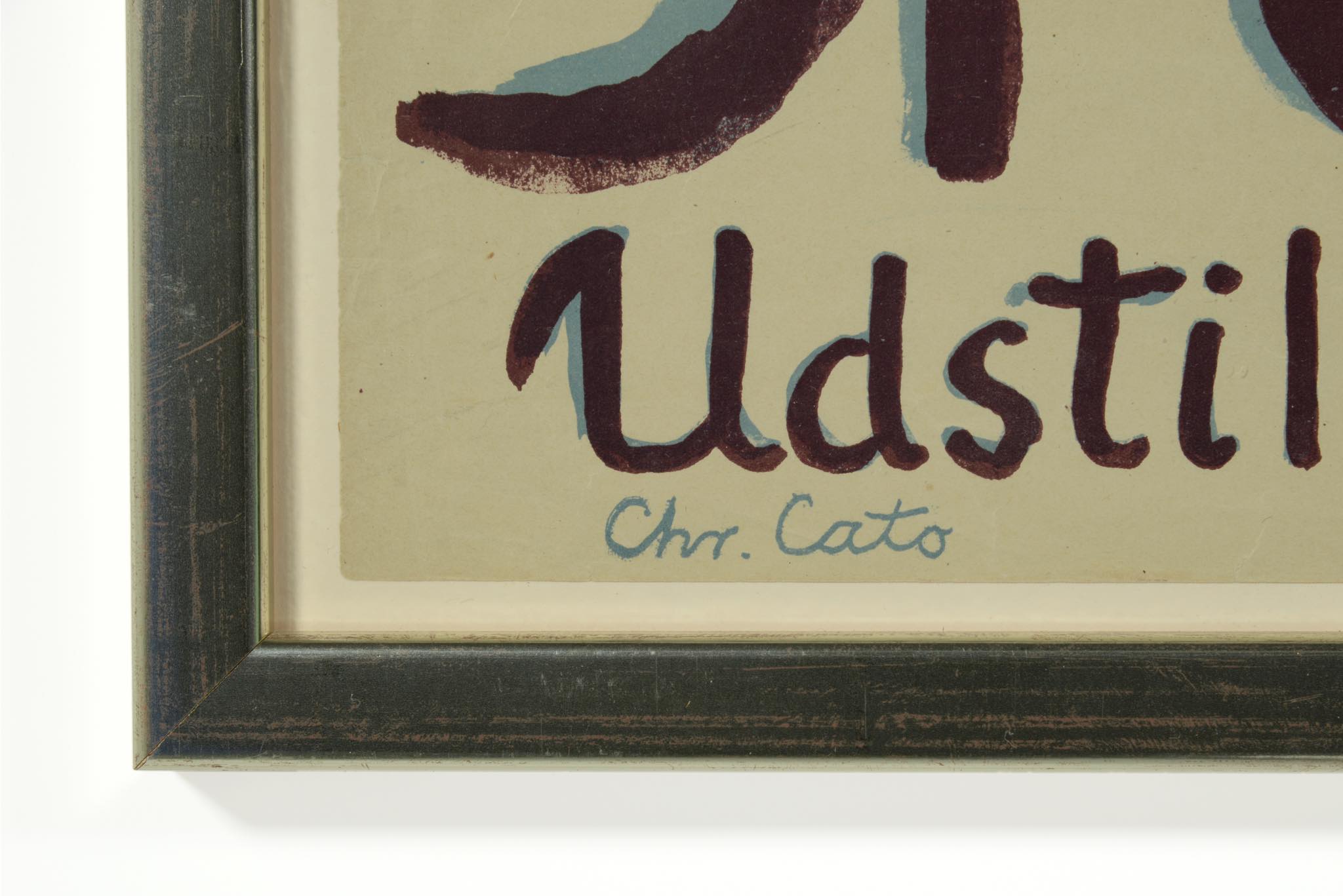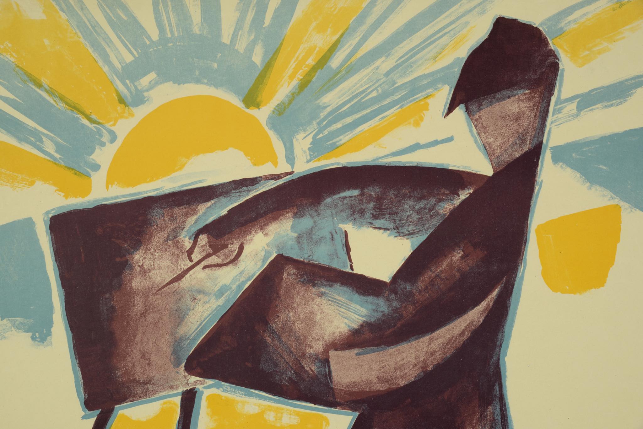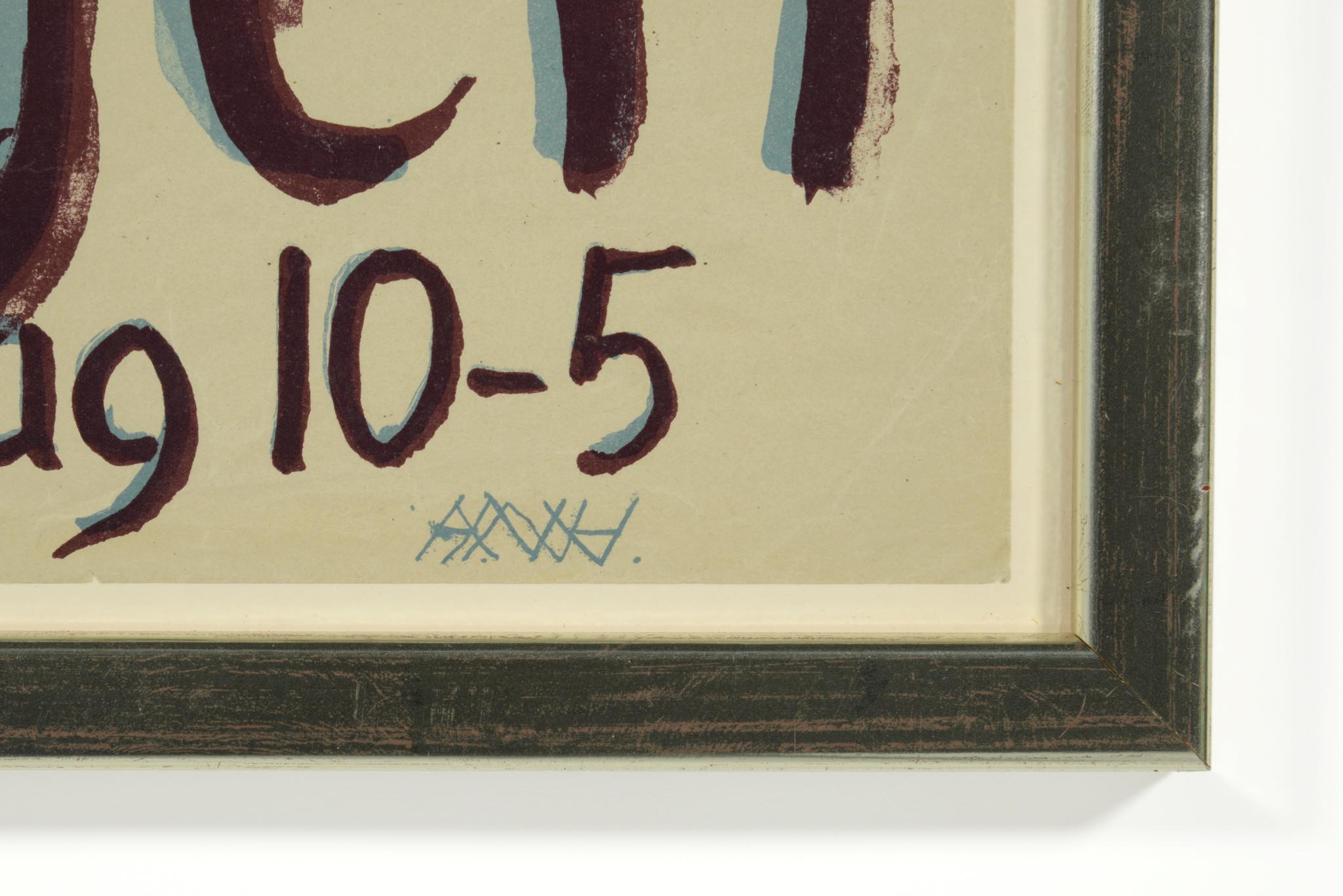 デンマークのアーティスト、Albert Naur/アルベルト・ナウアによる "Grønningen" エキシビジョン用リトグラフポスターです。原画は1921年に描かれたもので、朝日に向かって絵を描く画家の姿が強いインパクトで表現されています。こちらは、同展覧会がその原画をシンボルマークとして採用し、エキシビジョンの開場時間の案内用に作られたポスターです。同展覧会は現在に至るまでこの図案をシンボルマークとして頻繁に使用しています。こちらのポスターはリトグラフで刷られており、色彩が鮮やかです。紙は古く、皺や折れた箇所が見受けられ、コンディションとしてはまずまずと言ったところでしょう。銀箔のフレームは古い時代に誂えられたものと思われます。