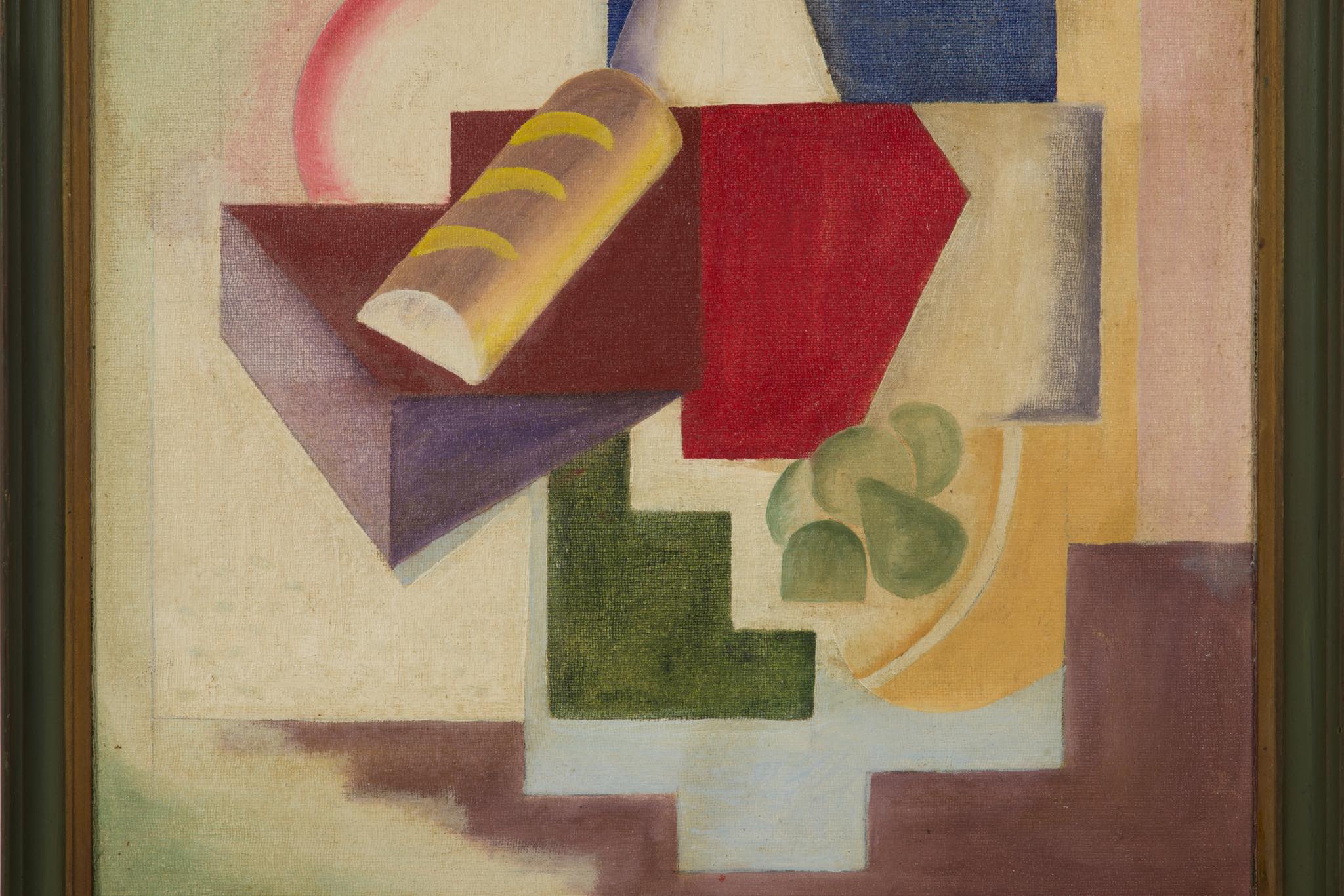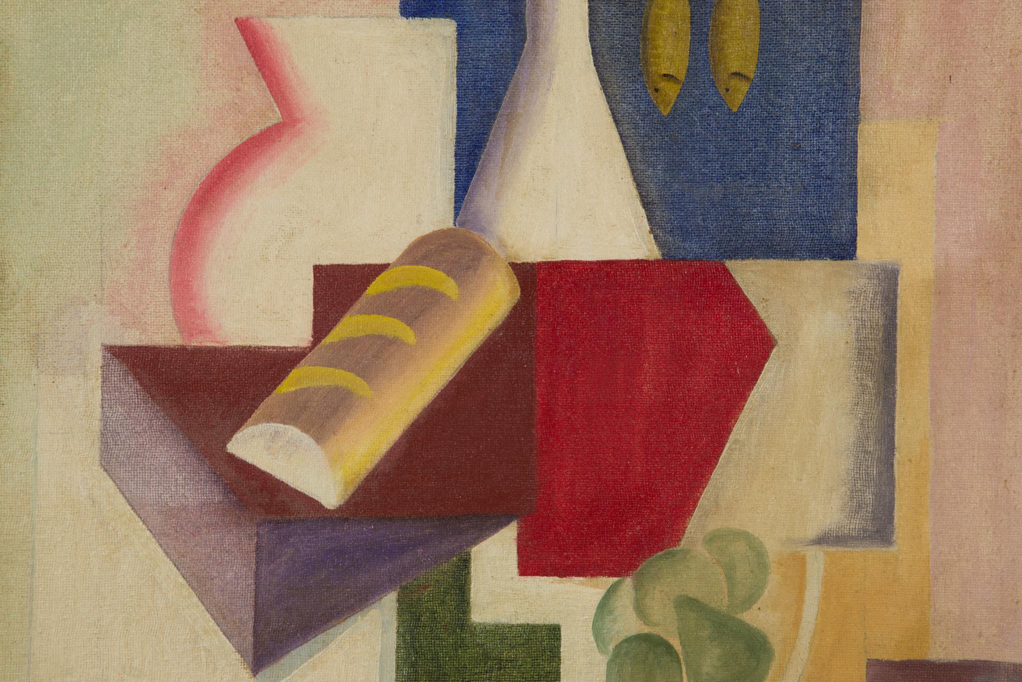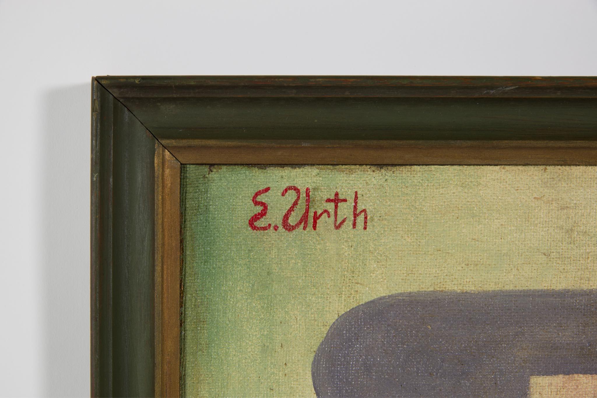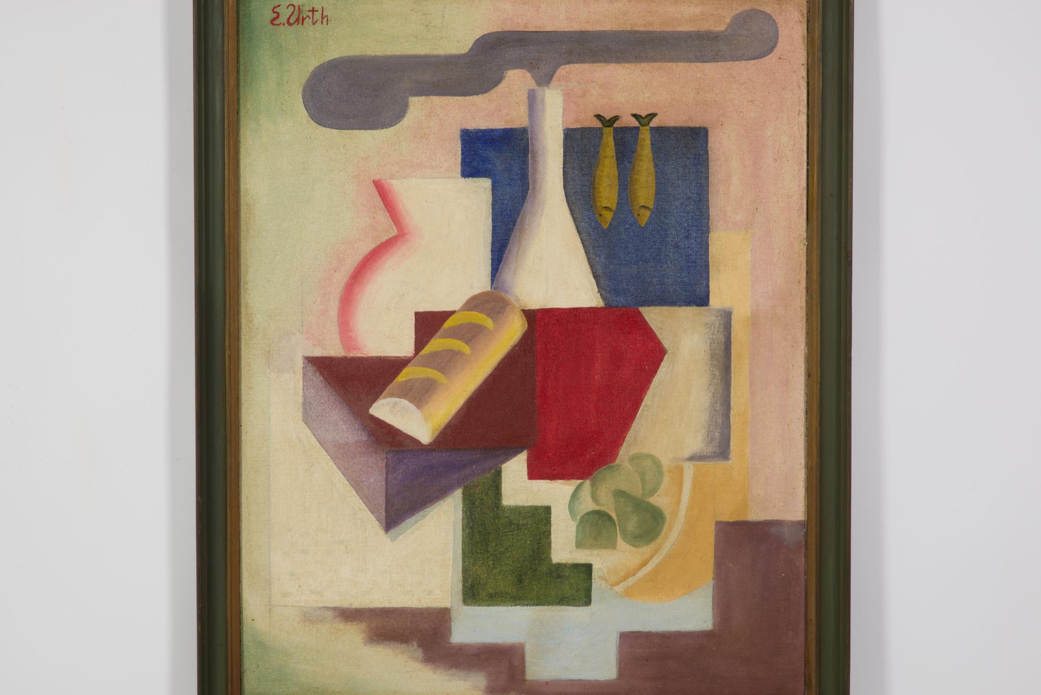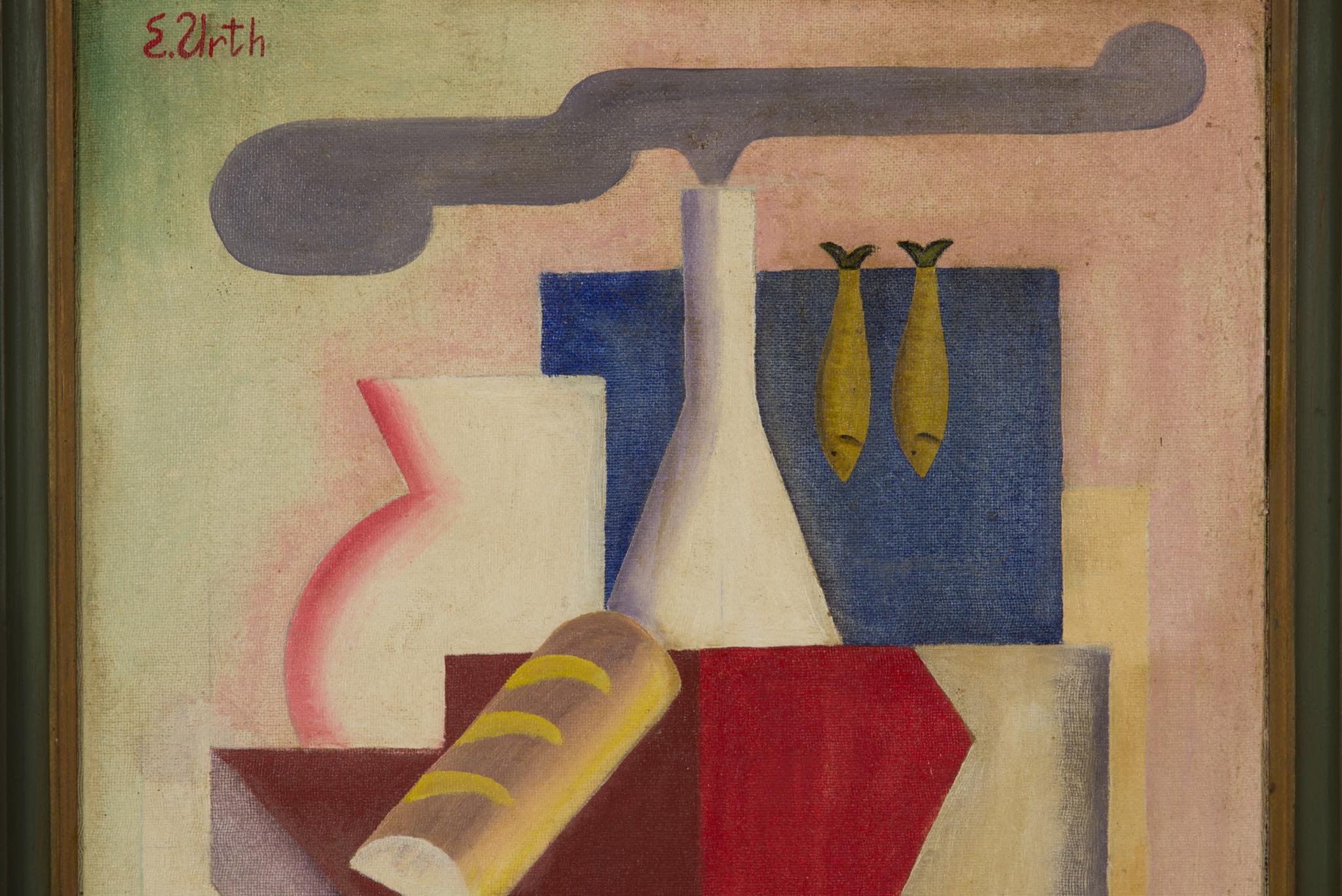 E. Urth/E・ウルスによる油彩作品です。ボーンホルム島の伝統的なスモークハウス(ニシンの燻製工場)をモチーフにした作品で、燻製されたニシンやグリーンイチジクをキュビズムを交えた画法で表現しています。デンマークを代表する画家の Olaf Rudeに影響を受けていたようですが、E・ウルスに関する情報につきましては判っておりません。