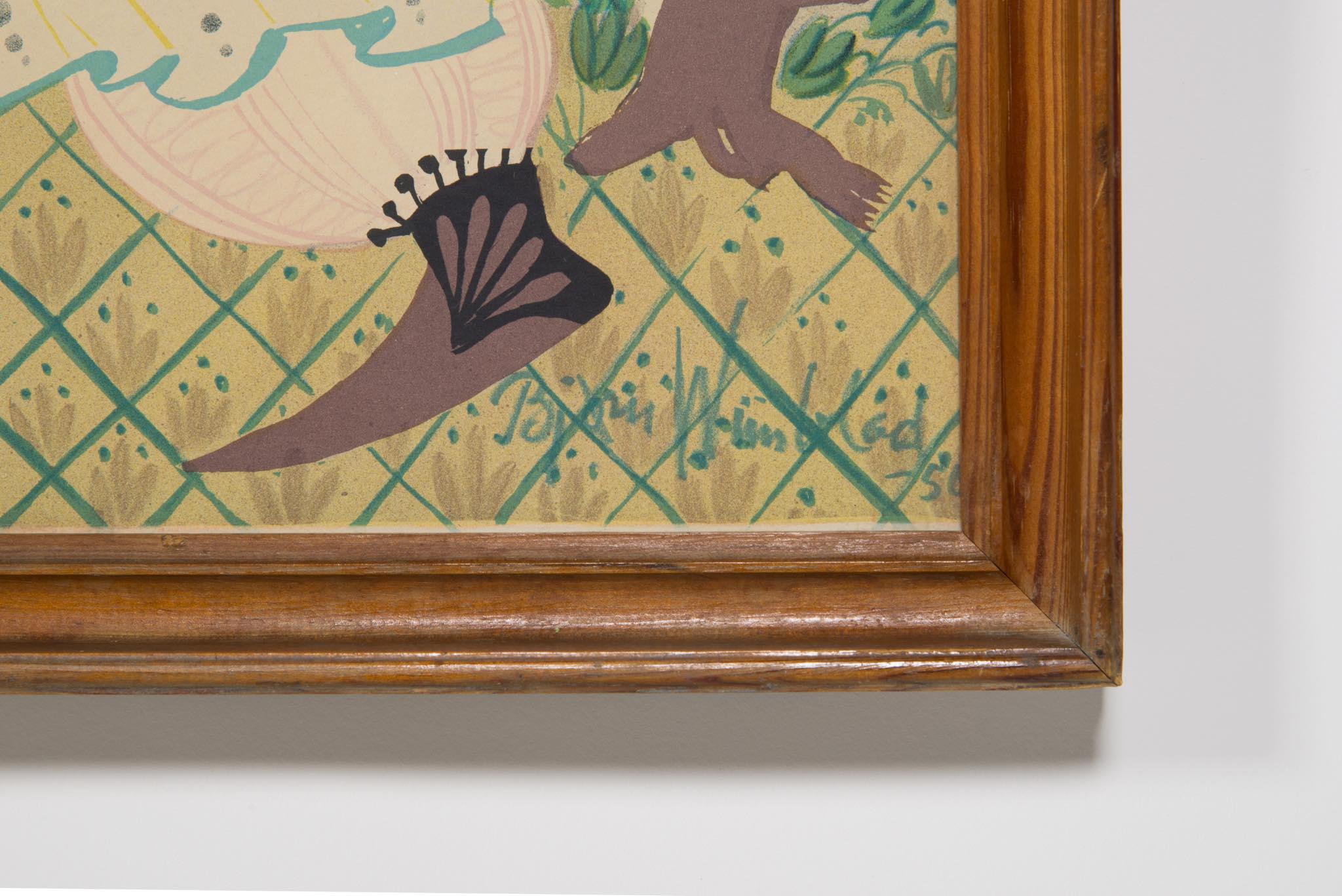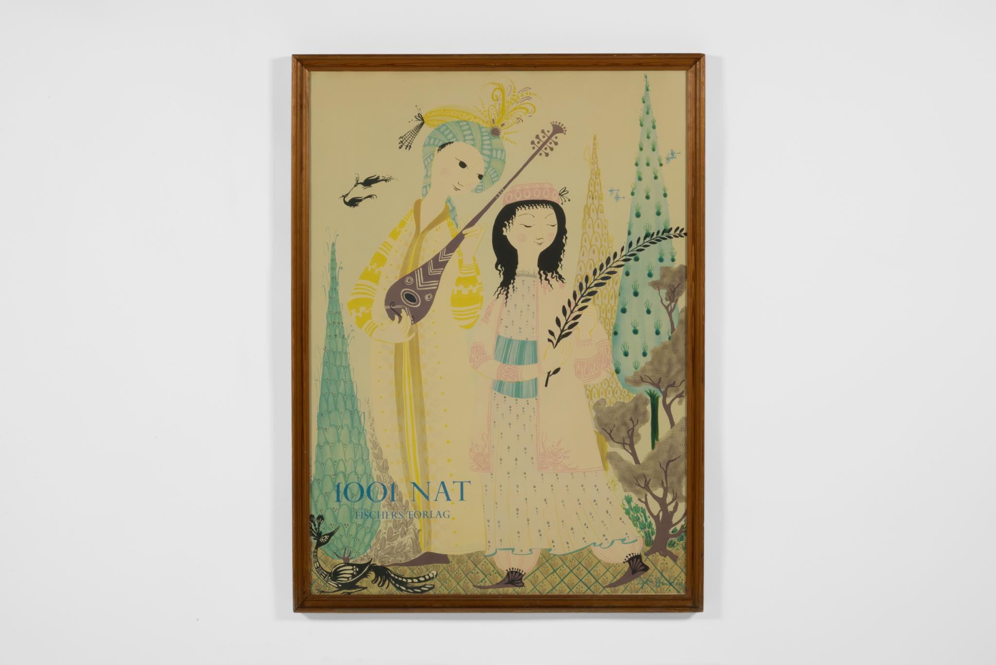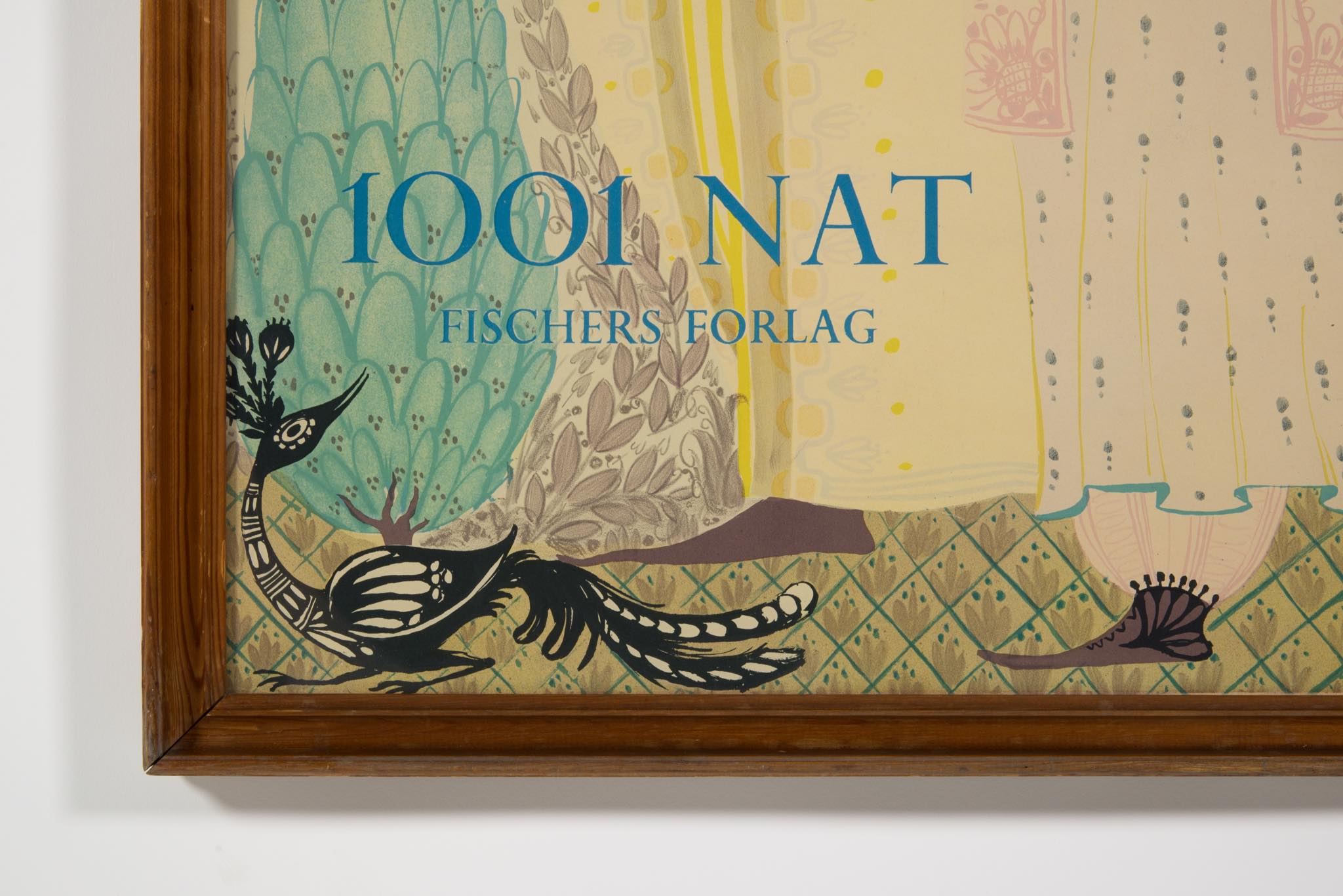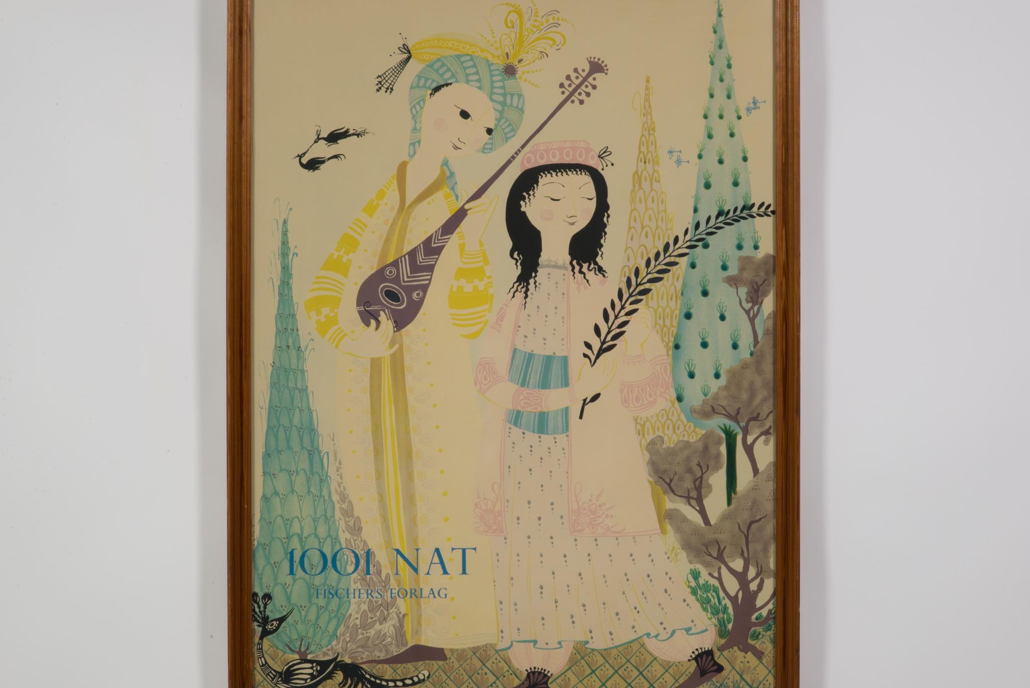 デンマークを代表するアーティスト、ビョルン・ヴィンブラッド によるリトグラフポスターです。デンマークの出版社 "Fischers Forlag” から「アラビアン・ナイト」(千夜一夜物語)が発刊された際に制作されたもので、お庭を散歩する王と王妃シェヘラザードの仲睦まじきご様子が描かれています。サインの下の年号はフレームに一部隠れてしまっていますが、1956年に擦られたようで、印刷技法はリトグラフによるものです。ウィンブラッドは、アラビアン・ナイトにインスピレーショを受け、その後もたくさんの作品を残しています。パイン材のフレームはオリジナルで、ガラスを磨き背板を新たに整えました。経年による日焼けやフレームの隙間や小傷などはございますが、鑑賞に値するコンディションです。
