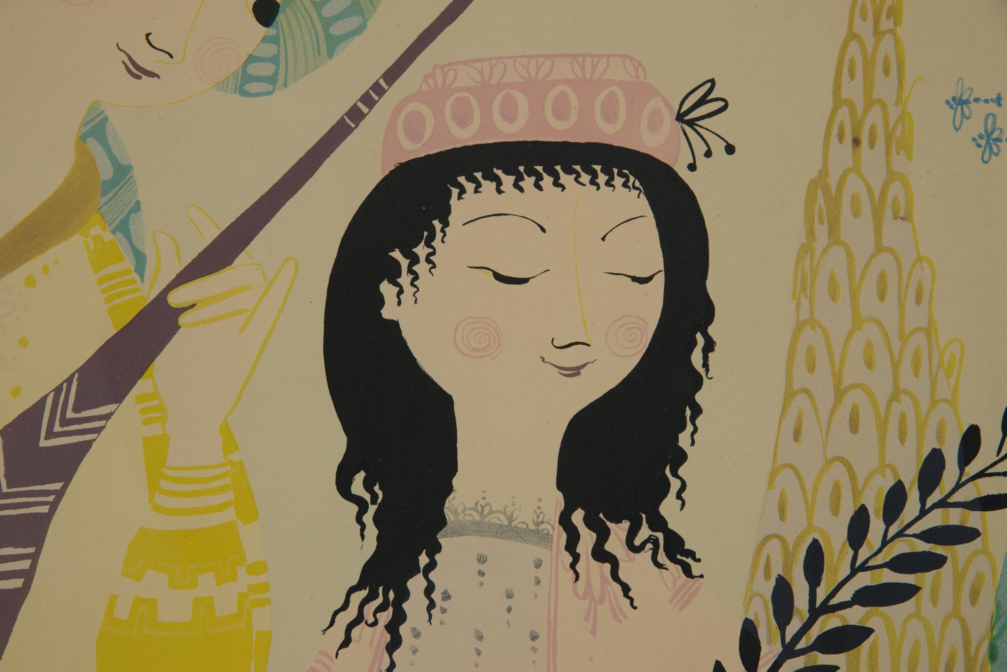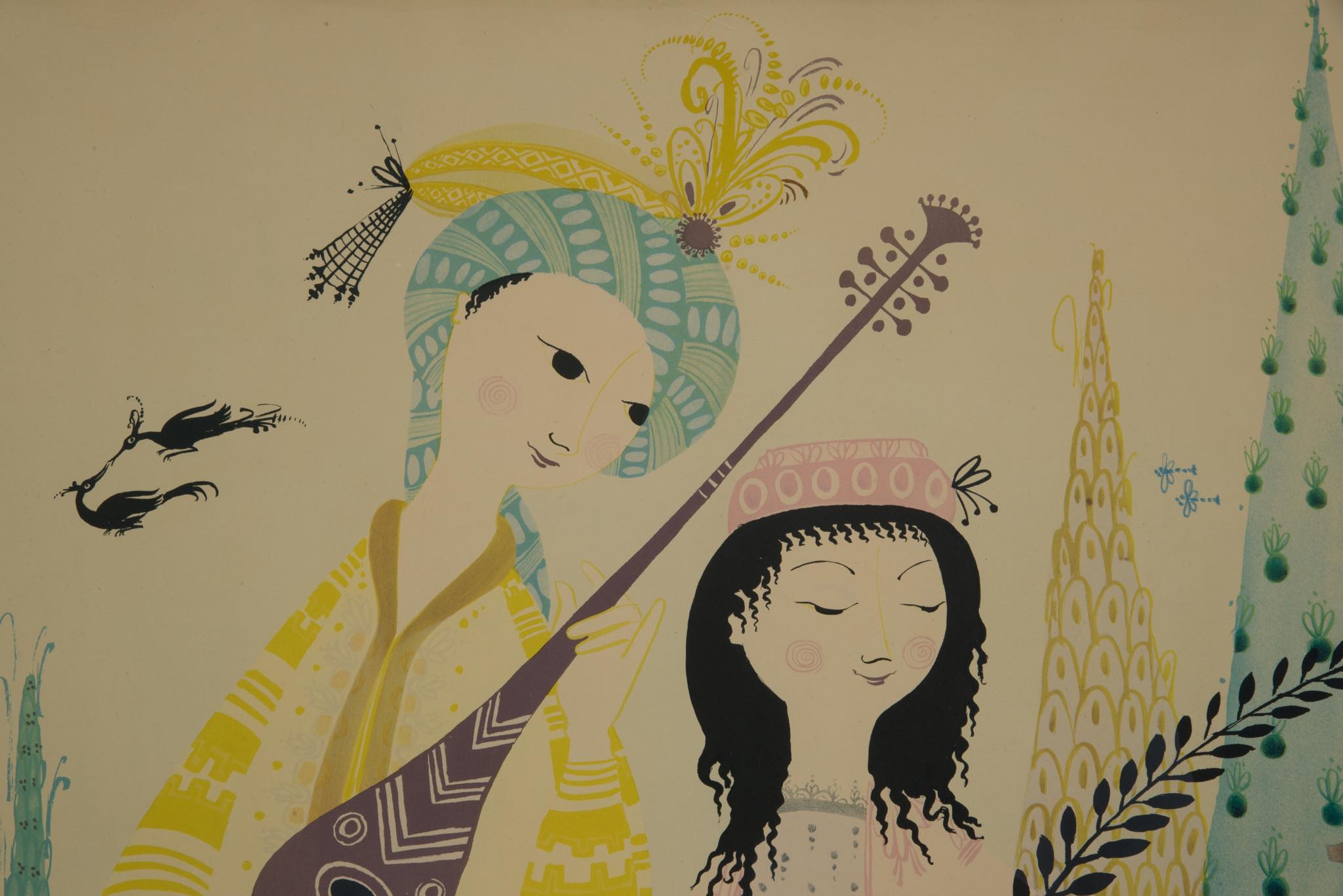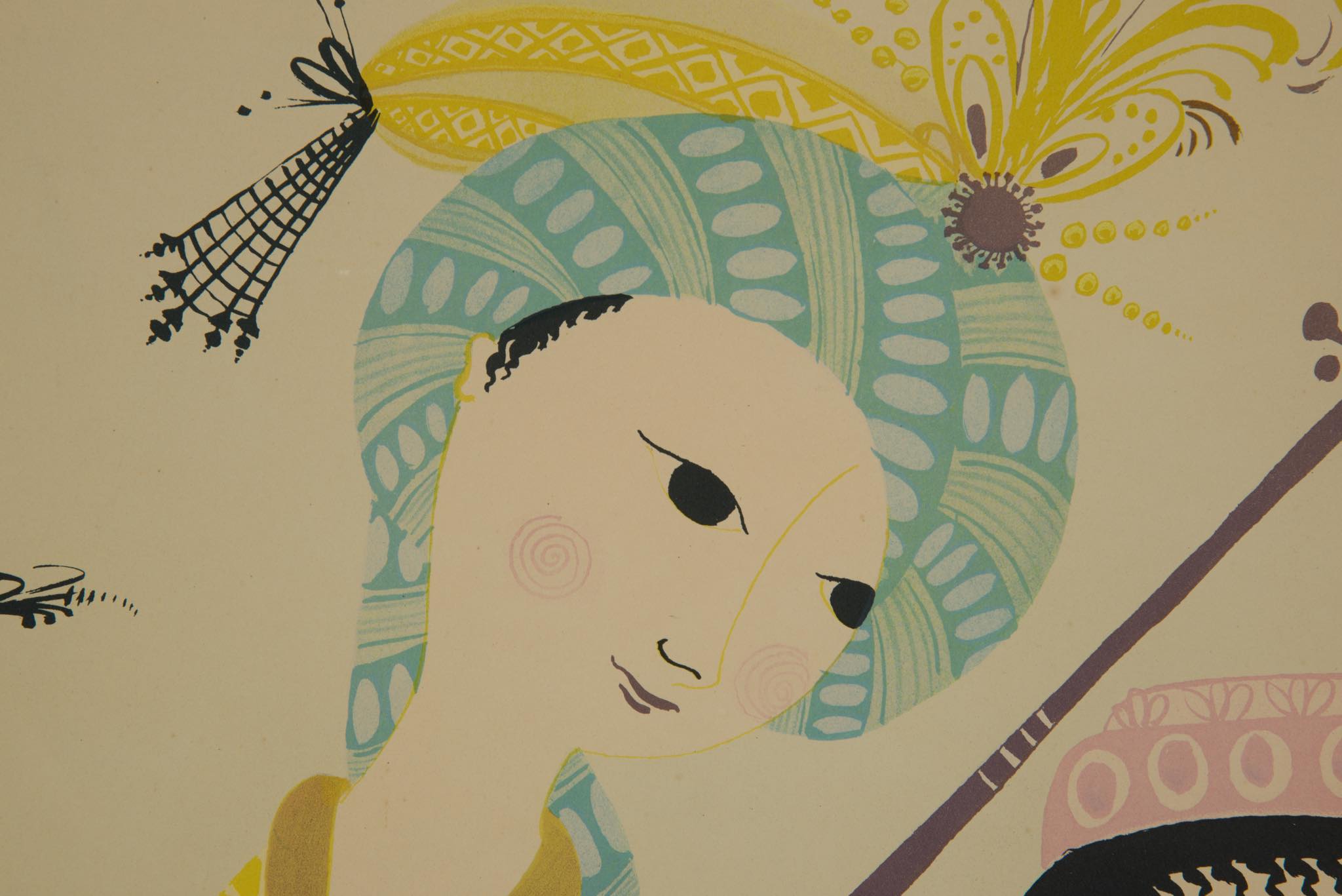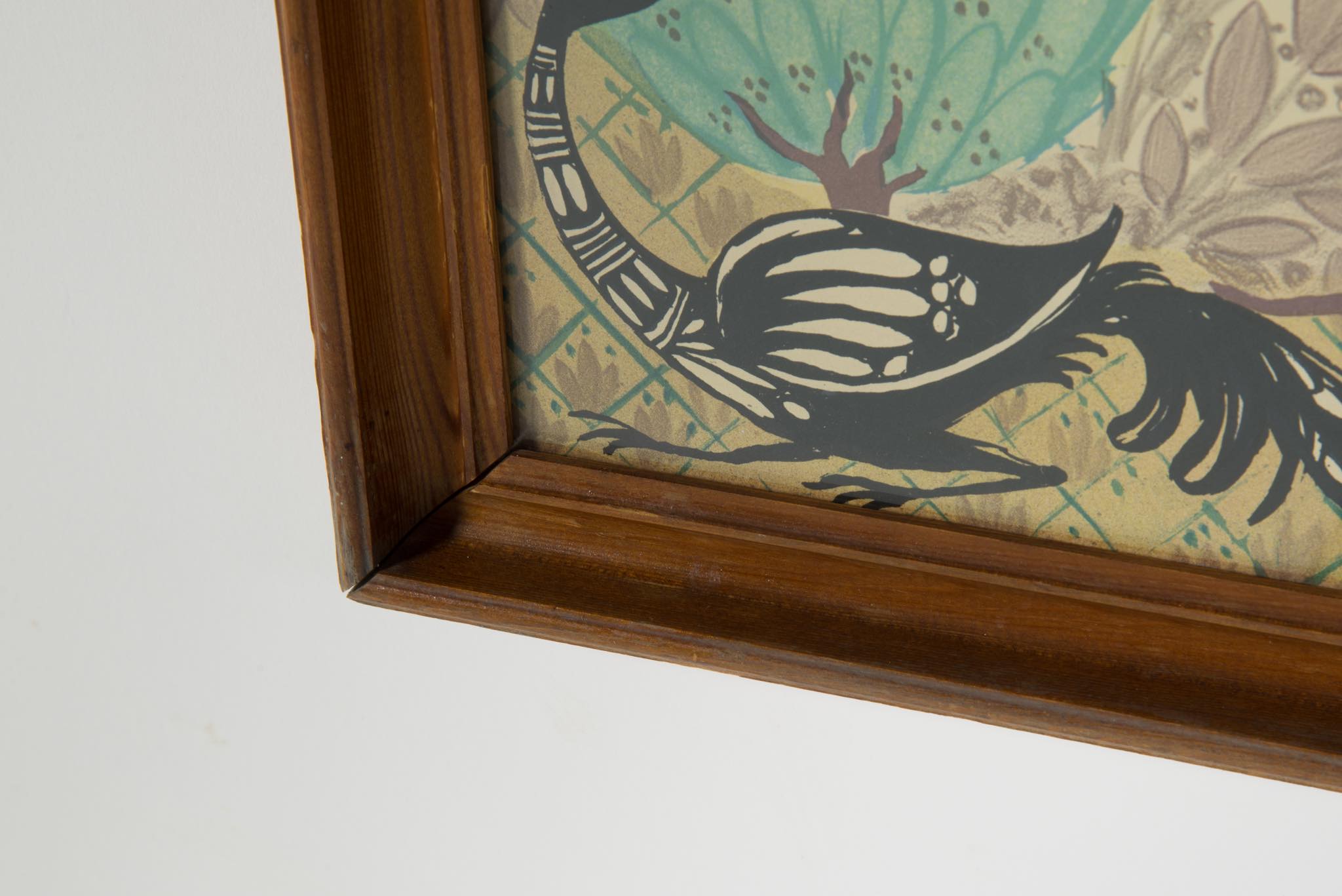 デンマークを代表するアーティスト、ビョルン・ヴィンブラッド によるリトグラフポスターです。デンマークの出版社 "Fischers Forlag” から「アラビアン・ナイト」(千夜一夜物語)が発刊された際に制作されたもので、お庭を散歩する王と王妃シェヘラザードの仲睦まじきご様子が描かれています。サインの下の年号はフレームに一部隠れてしまっていますが、1956年に擦られたようで、印刷技法はリトグラフによるものです。ウィンブラッドは、アラビアン・ナイトにインスピレーショを受け、その後もたくさんの作品を残しています。パイン材のフレームはオリジナルで、ガラスを磨き背板を新たに整えました。経年による日焼けやフレームの隙間や小傷などはございますが、鑑賞に値するコンディションです。