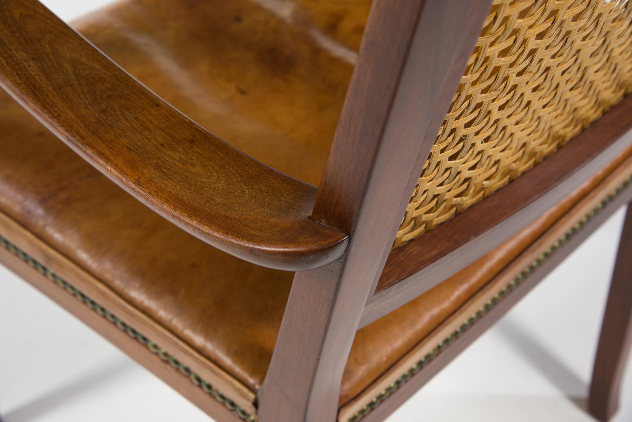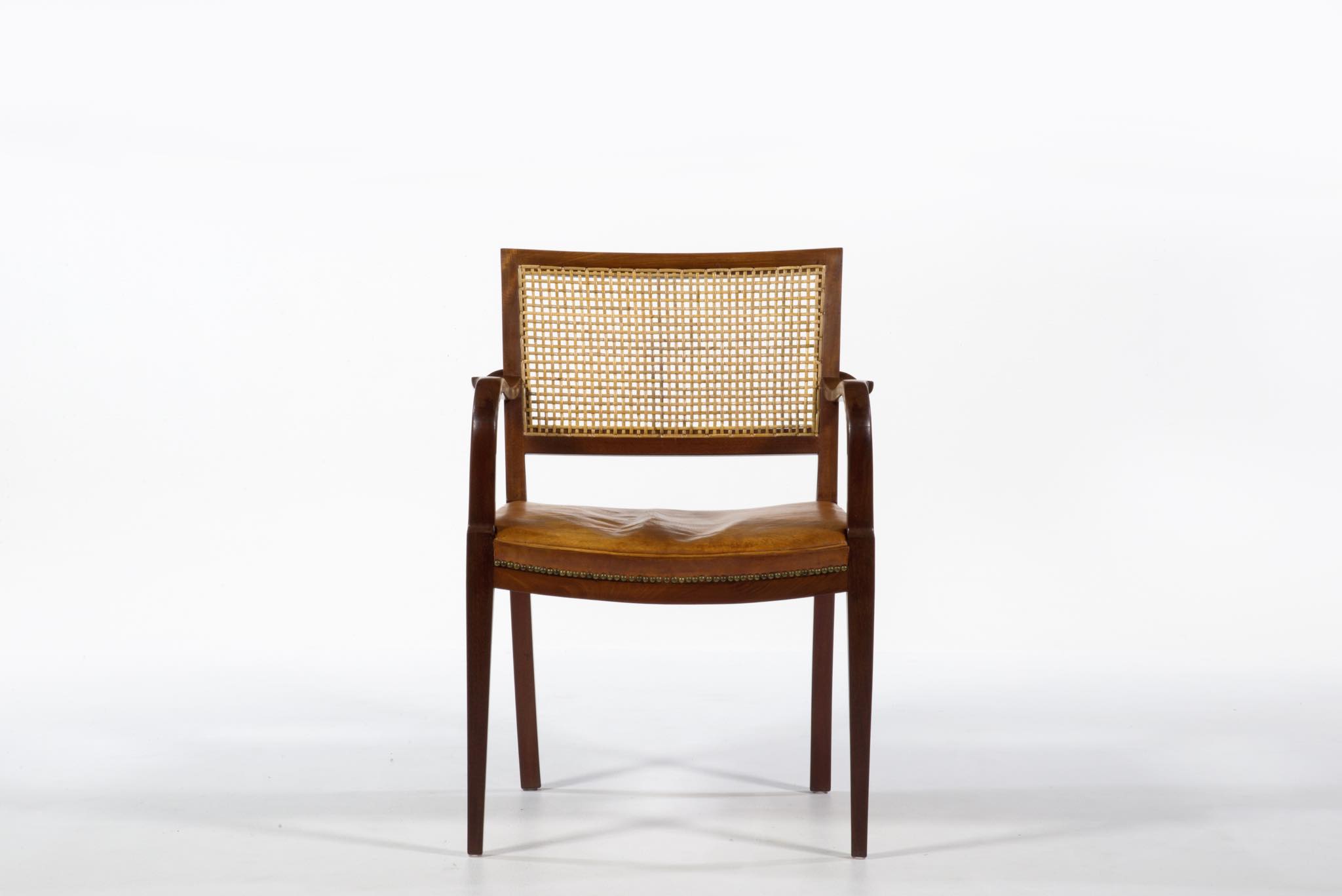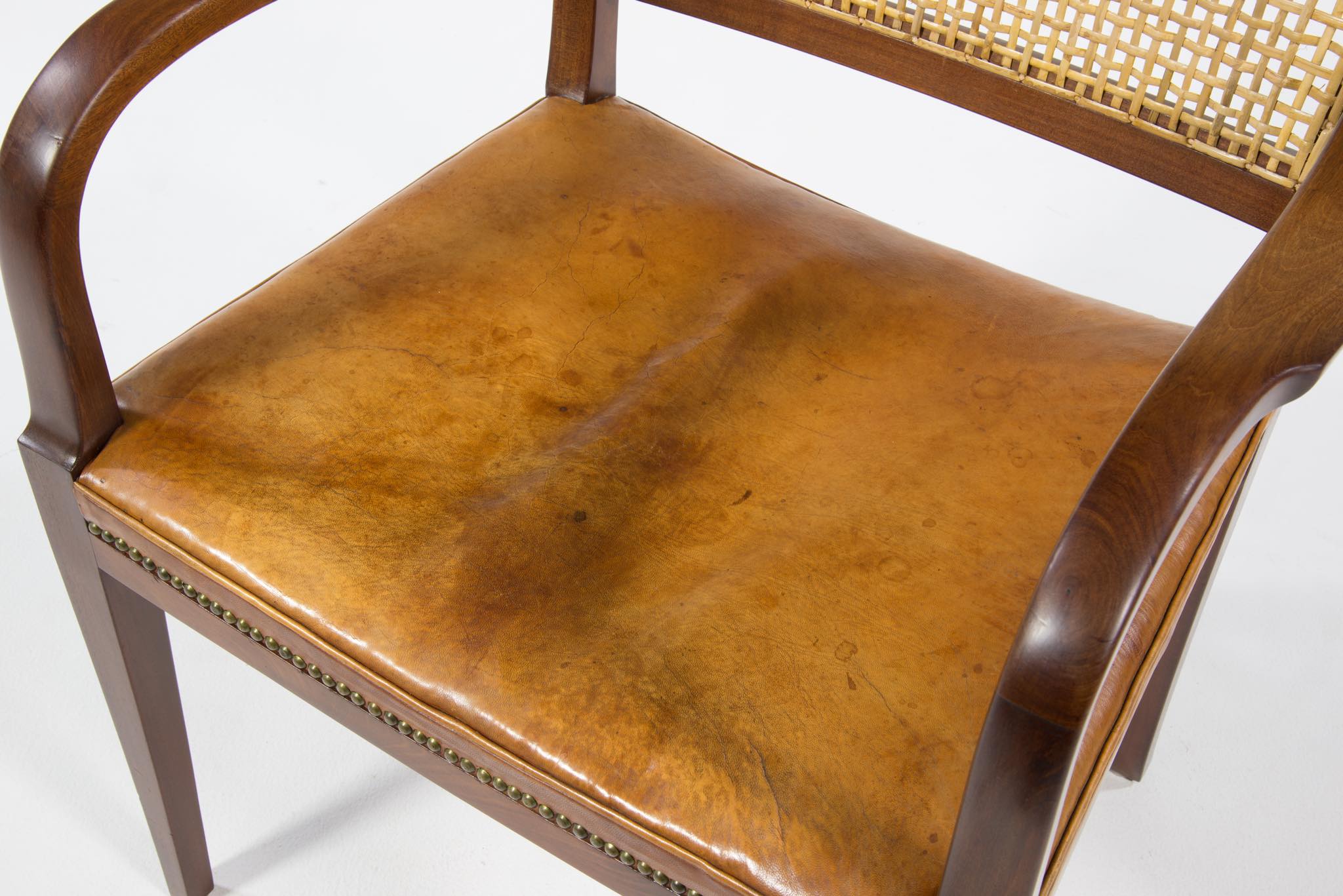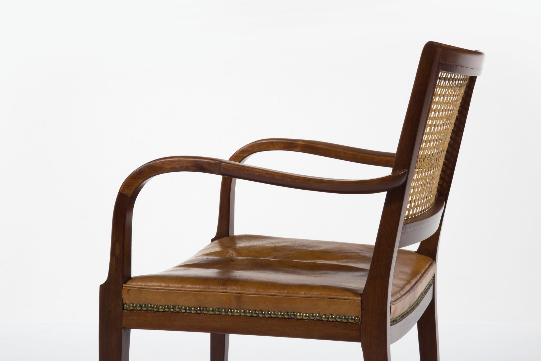 20世紀に於けるデンマーク家具デザインの礎を築いたキャビネットメーカーの Frits Henningsen/フリッツ・ヘニングセンによるアームチェアです。1930~40年代頃に作られたものでしょう。あまり見かけないモデルで、”Study chair”と称されているようです。フレームはマホガニー材と思われ、背もたれの「籐」は手編みによるもので、比較的近年にデンマークで張り替えらえれているようです。シートの皮革はオリジナルの山羊皮革のようで、使い込まれた風合いとなっています。コンディションは良好です。