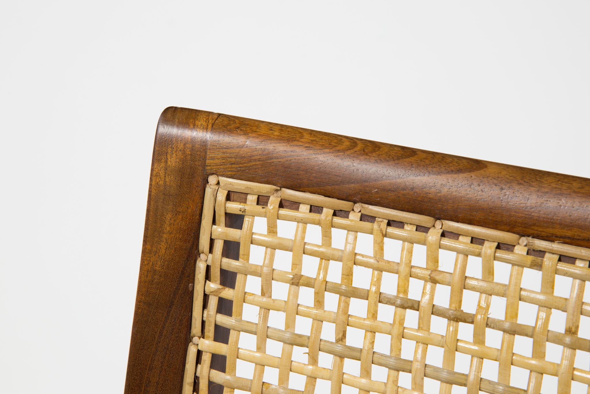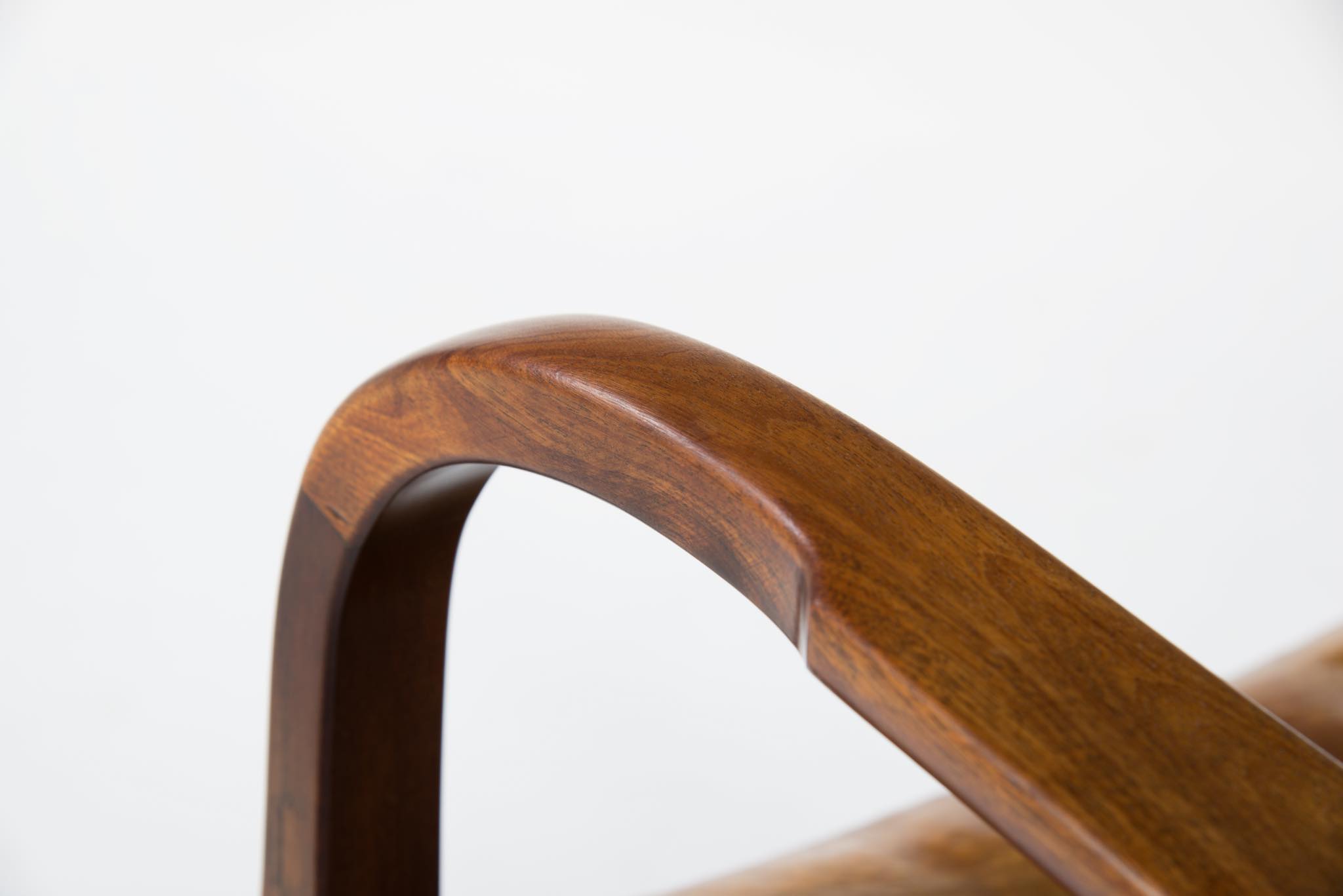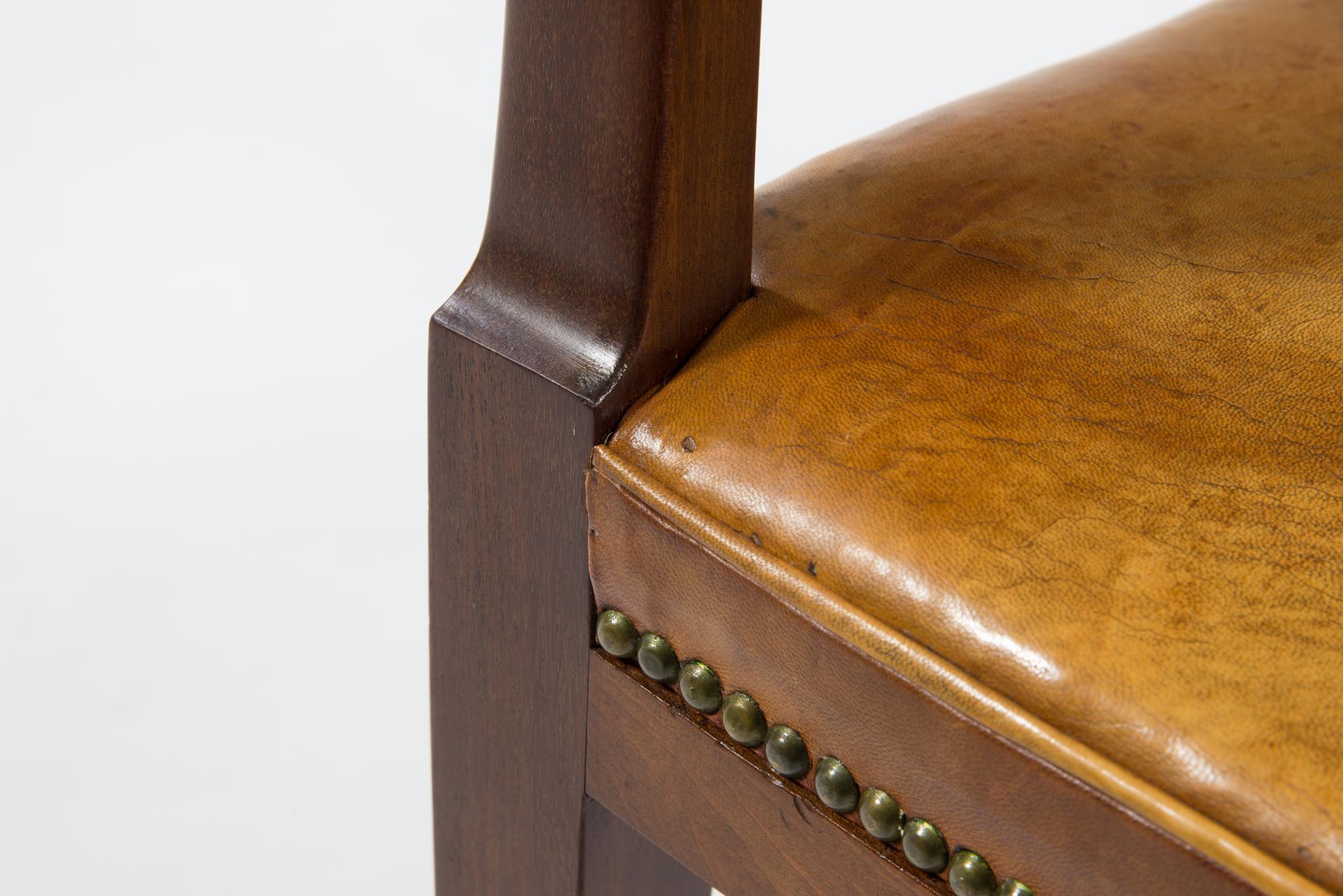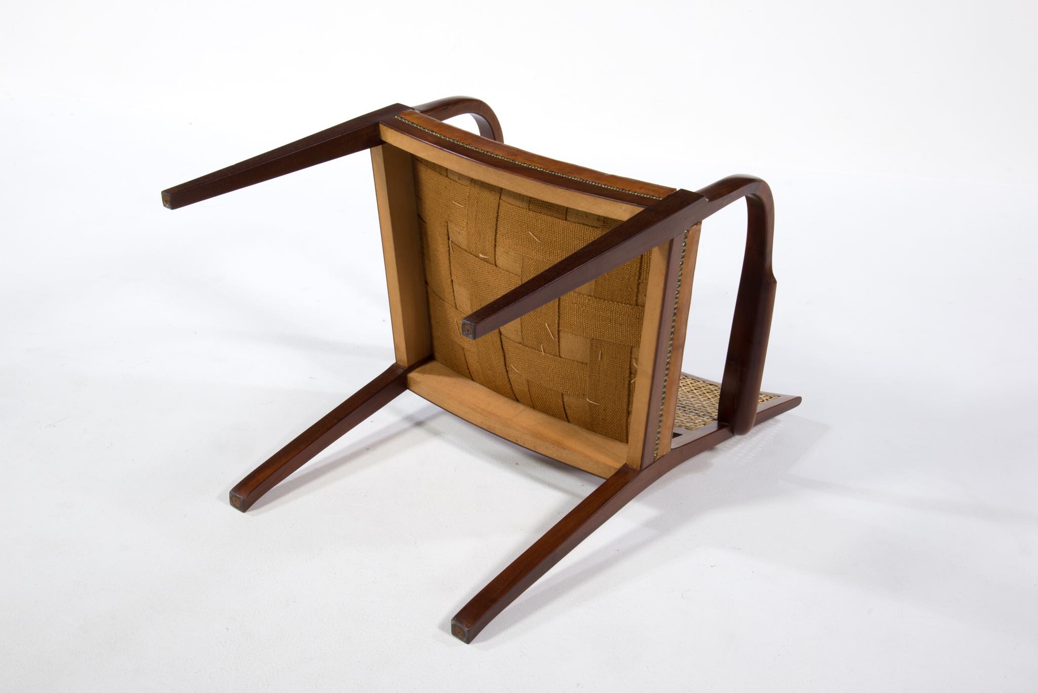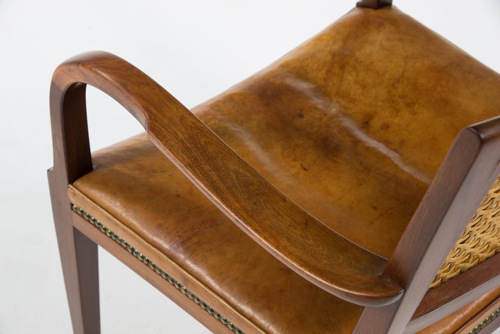 20世紀に於けるデンマーク家具デザインの礎を築いたキャビネットメーカーの Frits Henningsen/フリッツ・ヘニングセンによるアームチェアです。1930~40年代頃に作られたものでしょう。あまり見かけないモデルで、”Study chair”と称されているようです。フレームはマホガニー材と思われ、背もたれの「籐」は手編みによるもので、比較的近年にデンマークで張り替えらえれているようです。シートの皮革はオリジナルの山羊皮革のようで、使い込まれた風合いとなっています。コンディションは良好です。