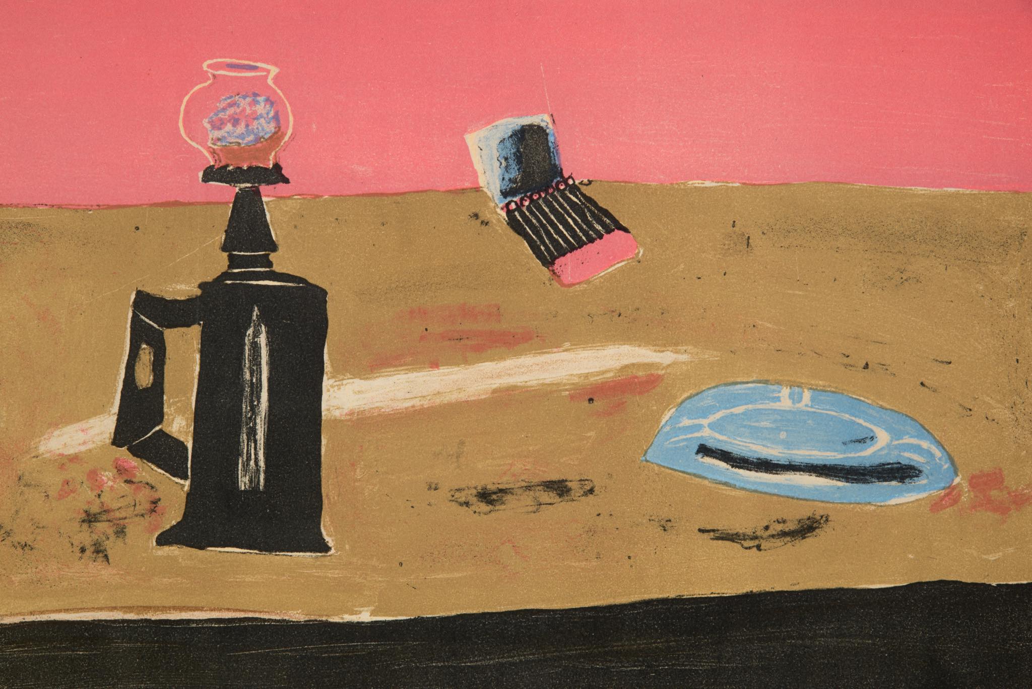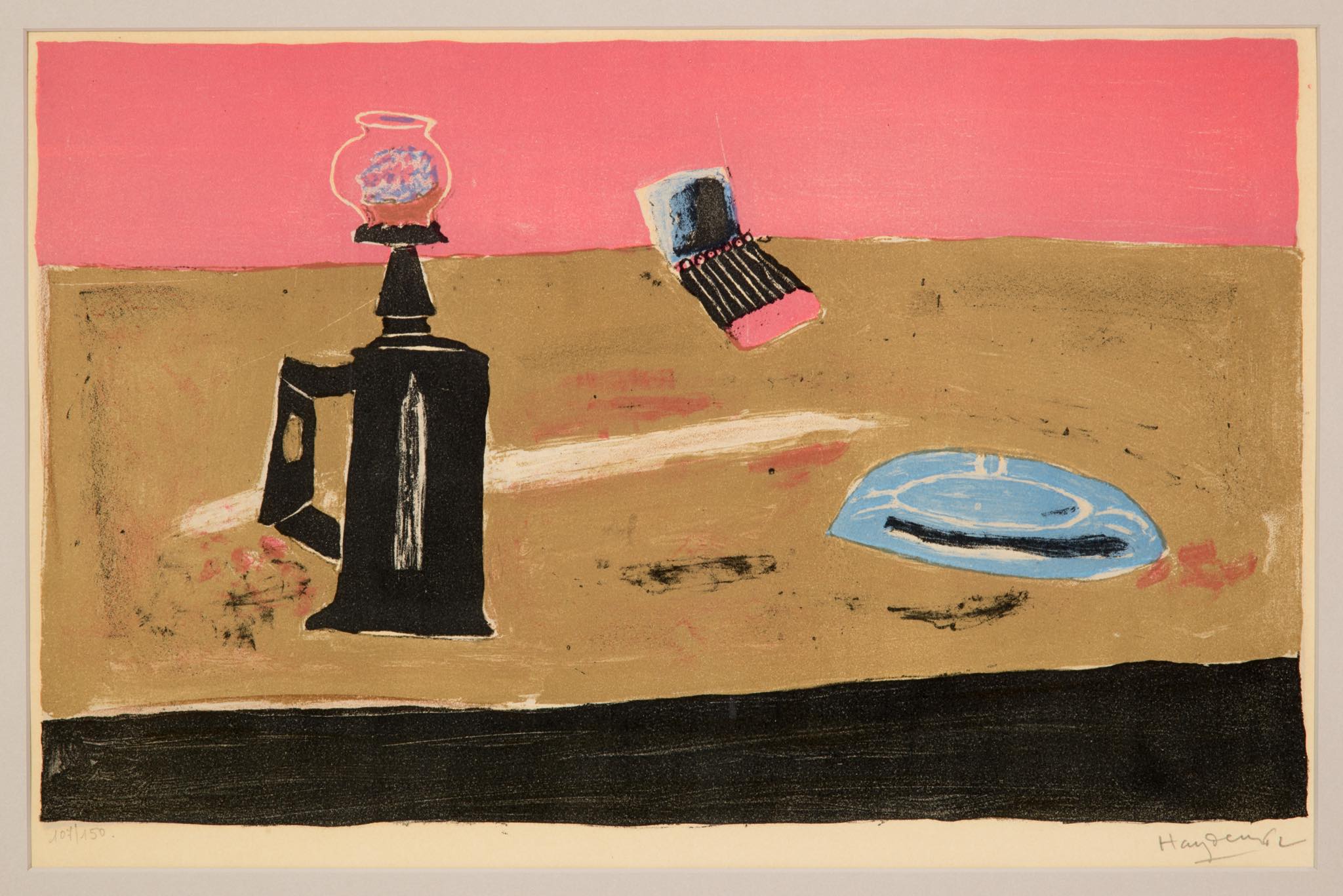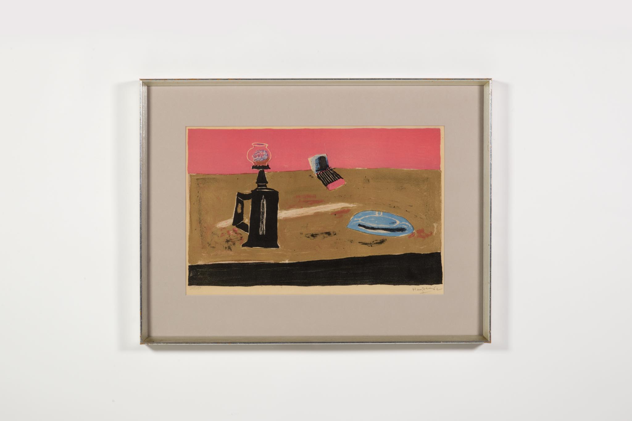 フランスで活躍したポーランド出身の画家、Henri Hayden/アンリ・エダンによるリトグラフ作品です。1962年に制作されたもので、卓上の豆ランプとブックマッチ、灰皿などがノスタルジックな表現で描かれています。この図案は色違いも発表されていたようで、こちらはピンク色の背景の作品となります。銀箔のフレームはオリジナルで、マットを新たに差し替えました。コンディションは良好です。