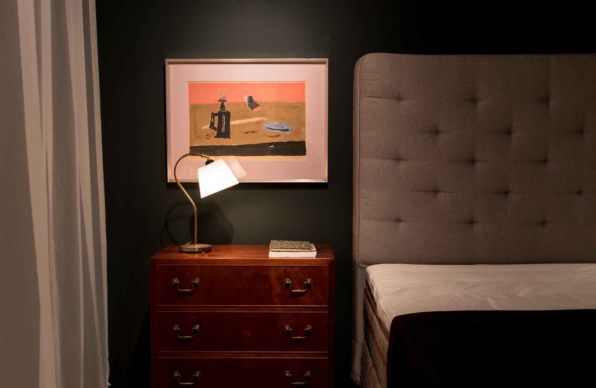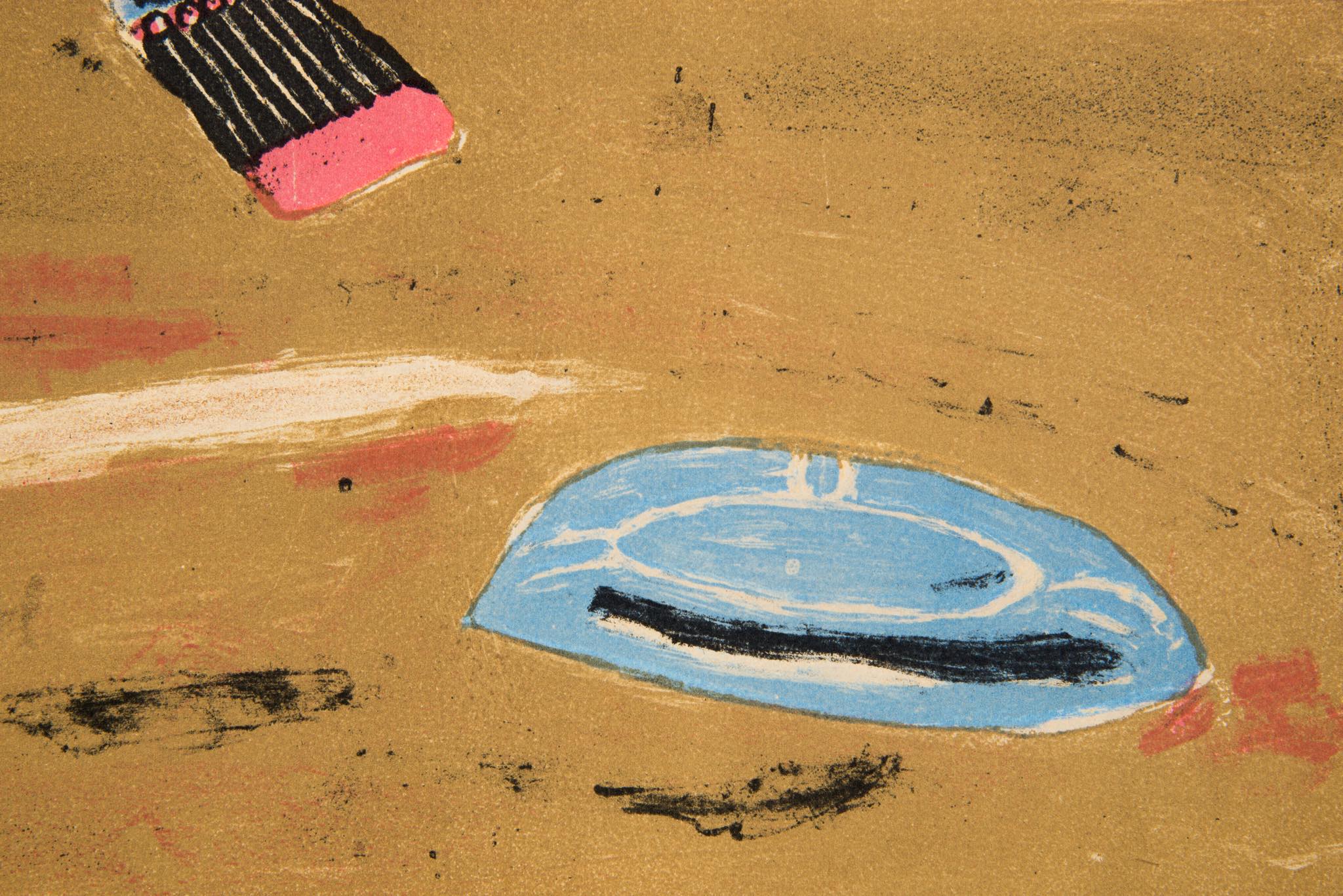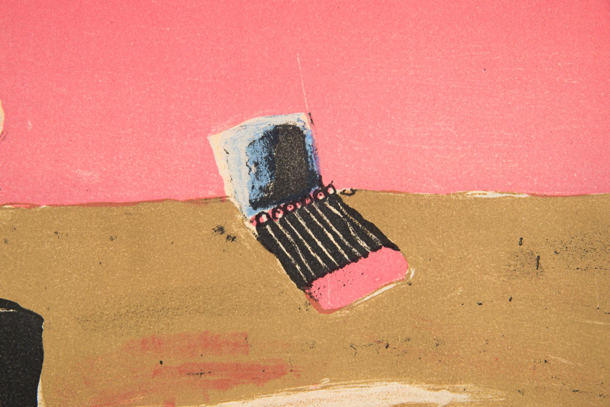 フランスで活躍したポーランド出身の画家、Henri Hayden/アンリ・エダンによるリトグラフ作品です。1962年に制作されたもので、卓上の豆ランプとブックマッチ、灰皿などがノスタルジックな表現で描かれています。この図案は色違いも発表されていたようで、こちらはピンク色の背景の作品となります。銀箔のフレームはオリジナルで、マットを新たに差し替えました。コンディションは良好です。