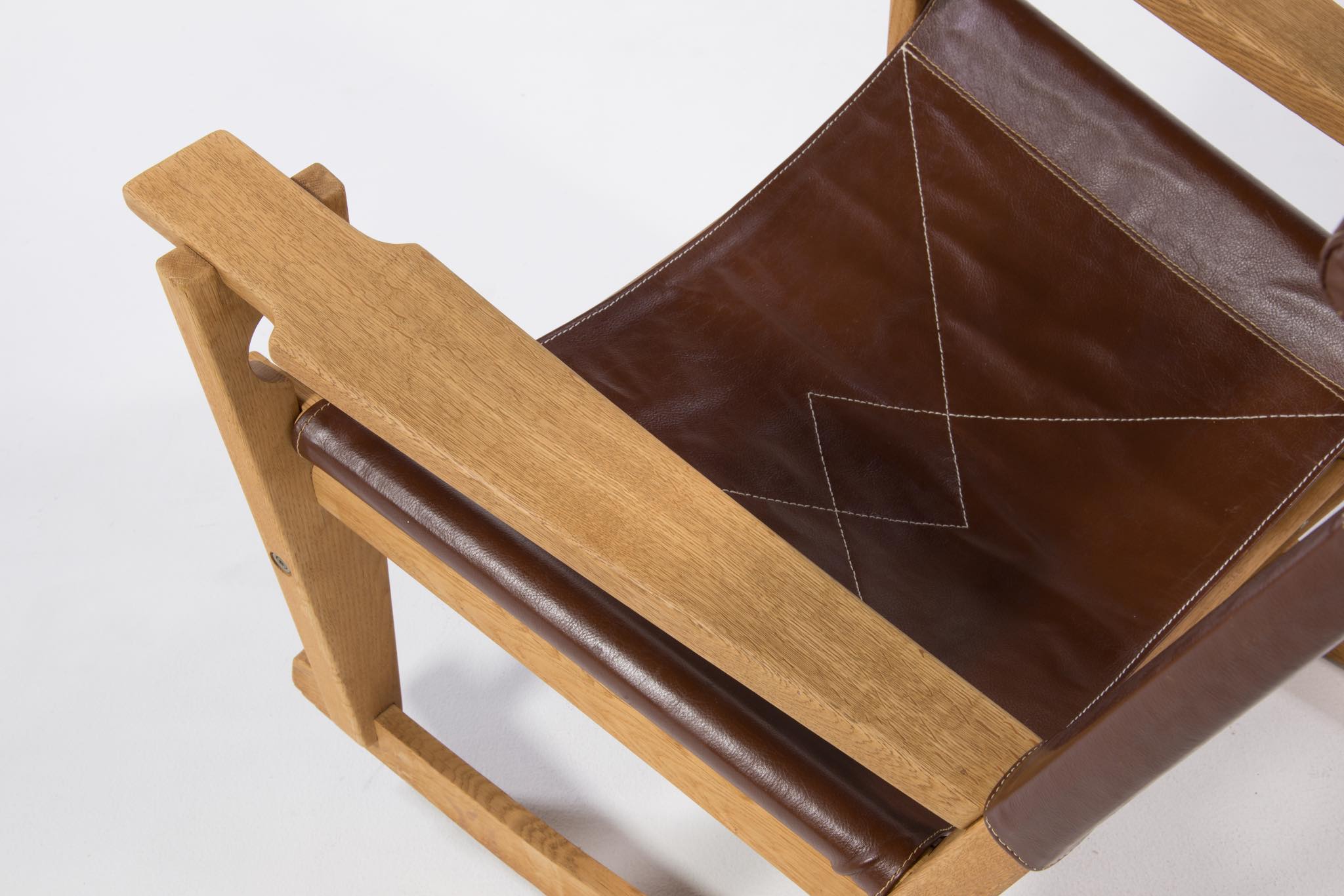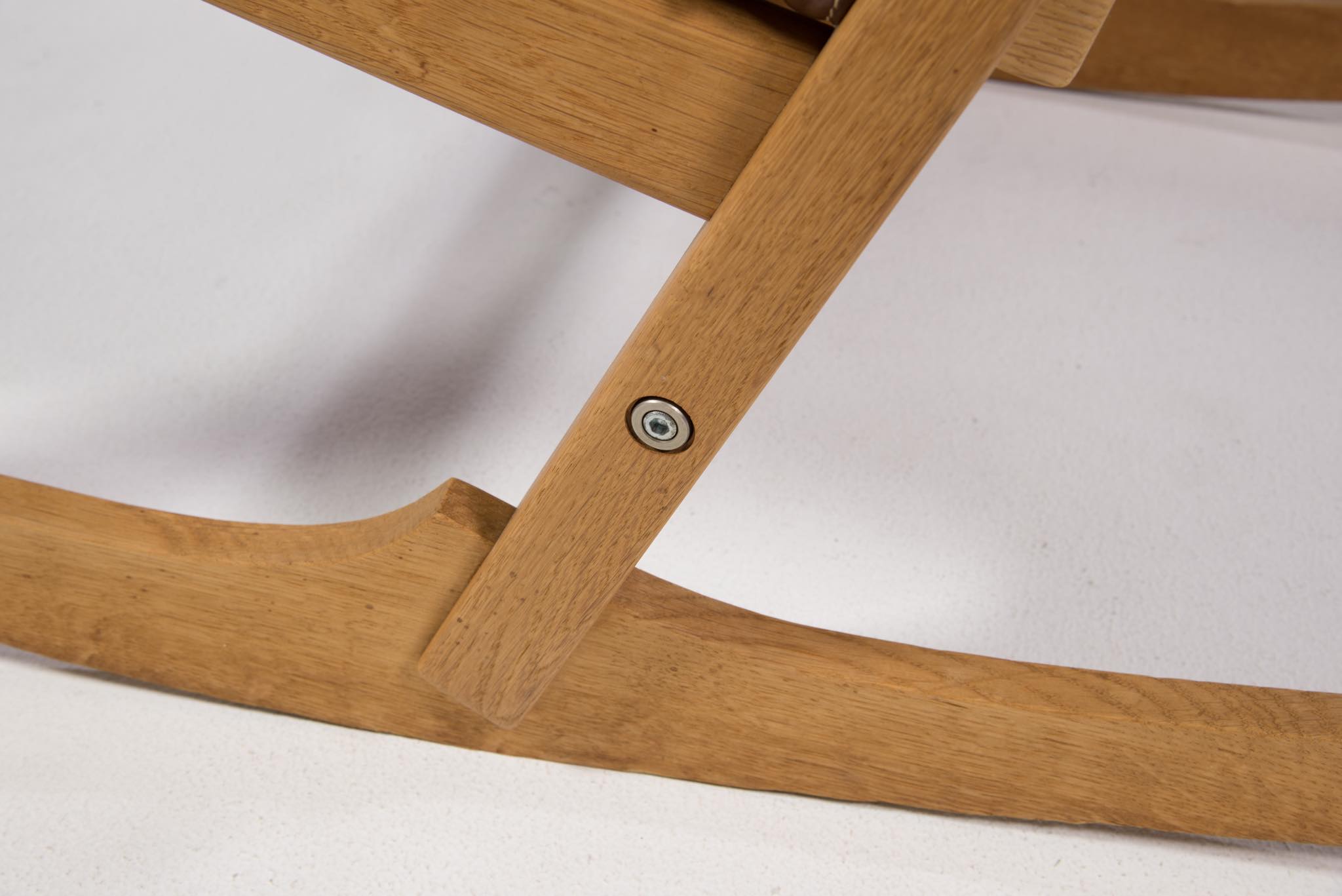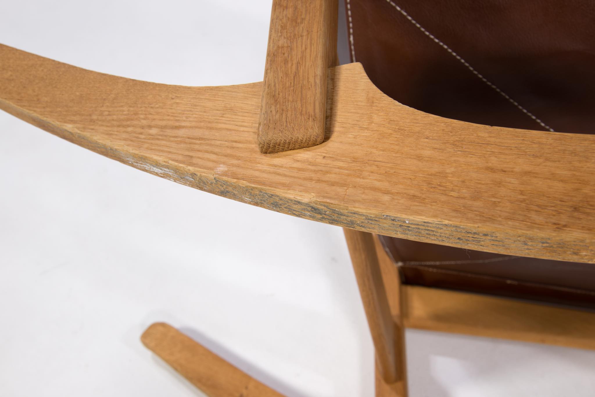 Hans J. Wegner/ハンス・ウェグナーによる、1967年にデザインされたロッキングチェアです。その構造の様子が鍵穴に似ている所から通称、Keyhole chair/キーホールチェアの名で親しまれています。フレームはオーク材、やや大振りで、とても安楽性の高いロッキングチェアです。向かって左アーム裏に欠け、木部に小傷、座面皮革のステッチに補修がございます。また、座面の皮革に経年による伸びが見られます。皮革の張替え等のご相談も承ります。