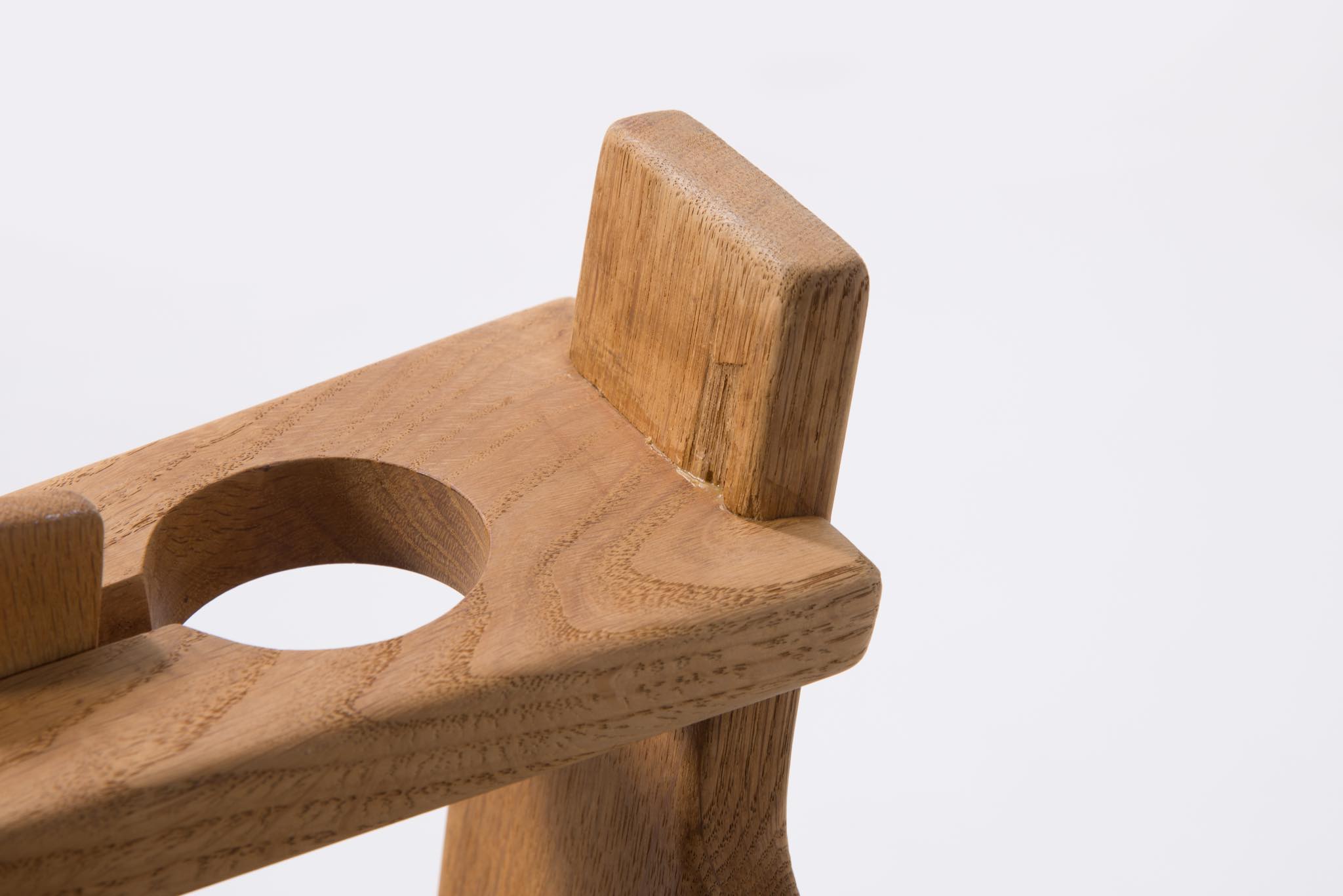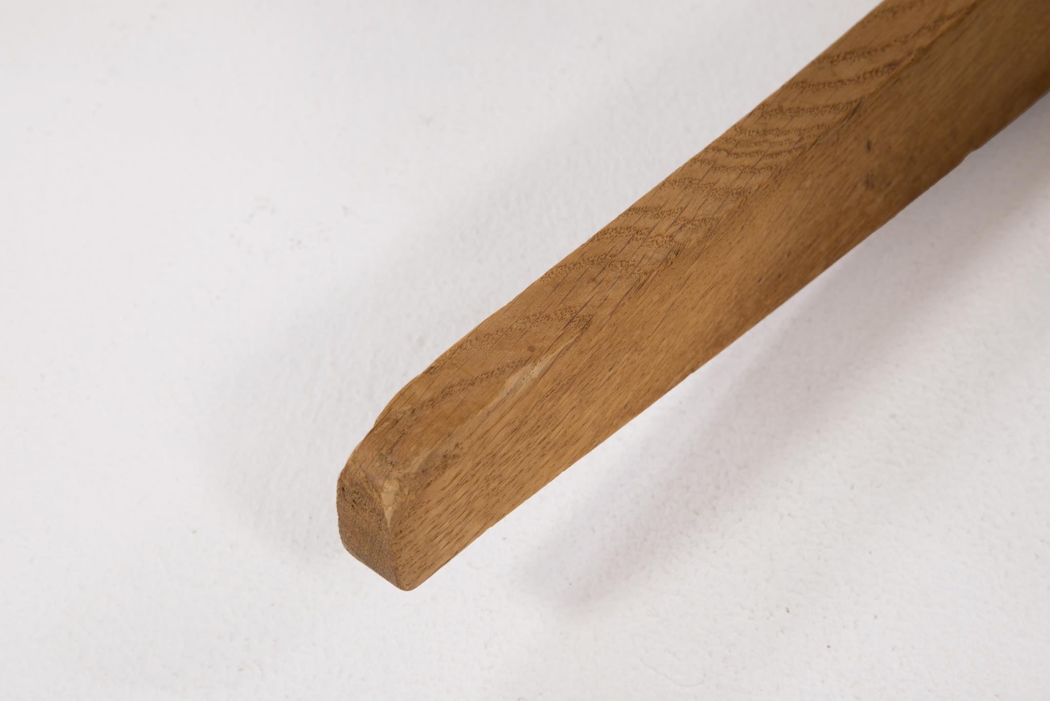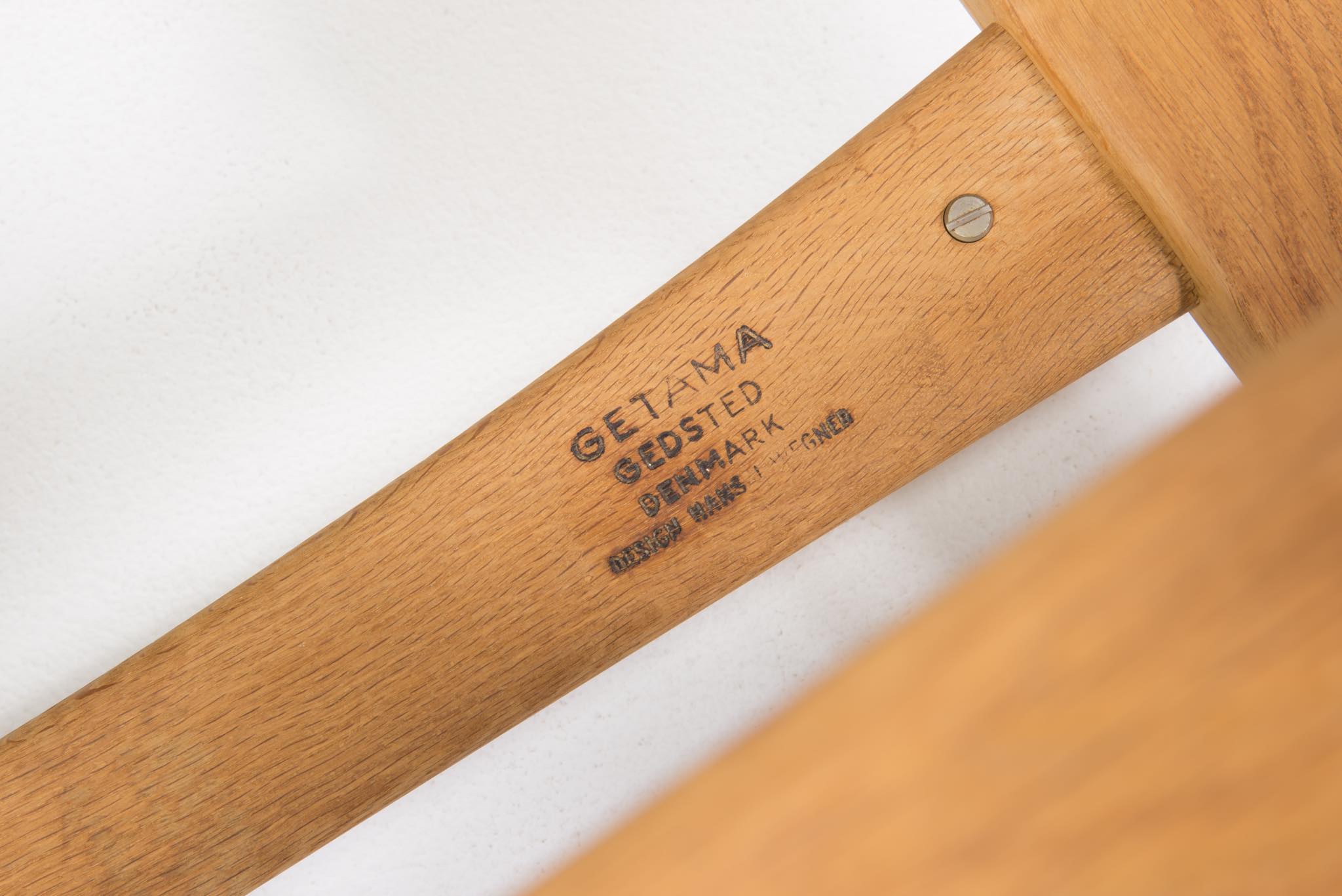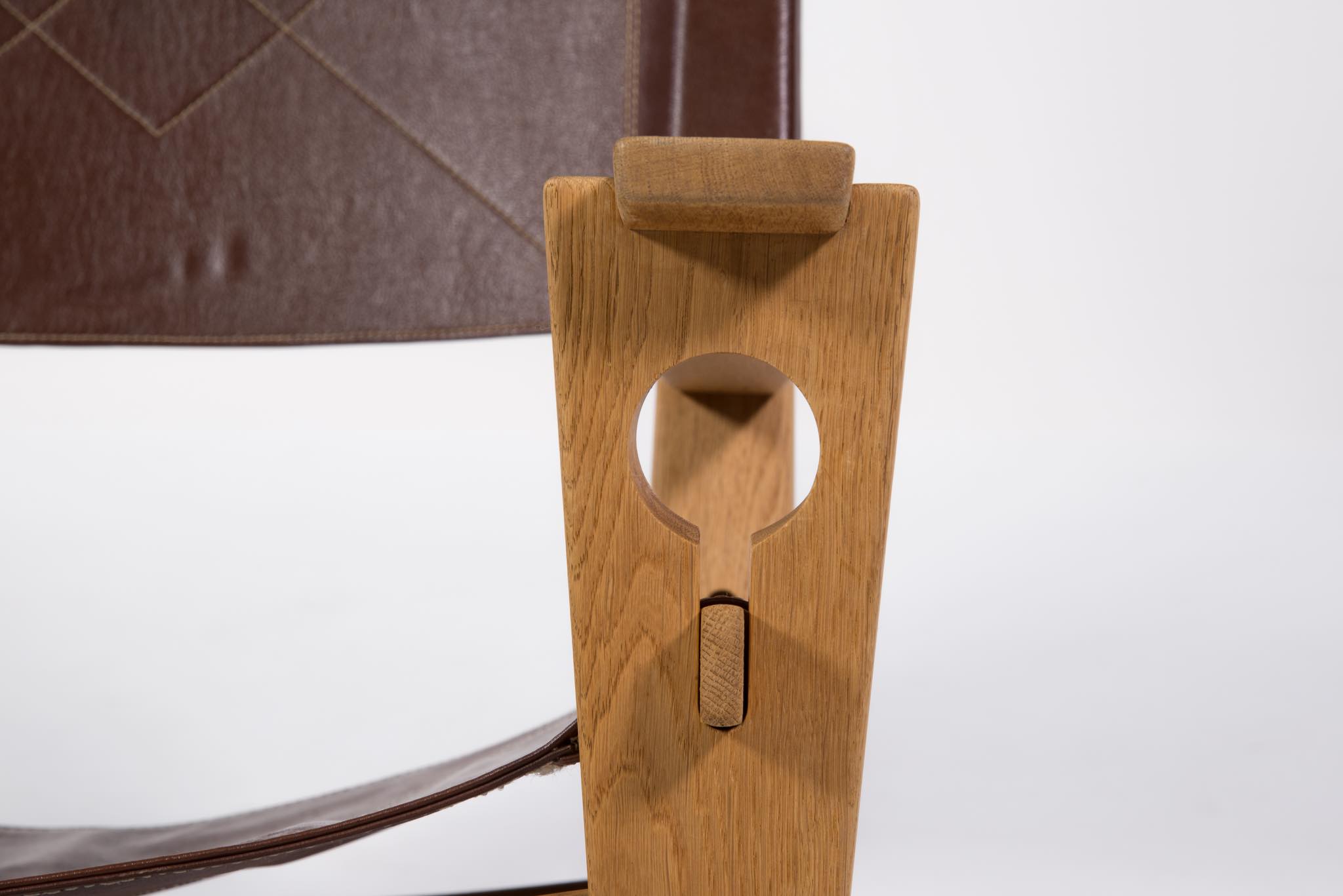 Hans J. Wegner/ハンス・ウェグナーによる、1967年にデザインされたロッキングチェアです。その構造の様子が鍵穴に似ている所から通称、Keyhole chair/キーホールチェアの名で親しまれています。フレームはオーク材、やや大振りで、とても安楽性の高いロッキングチェアです。向かって左アーム裏に欠け、木部に小傷、座面皮革のステッチに補修がございます。また、座面の皮革に経年による伸びが見られます。皮革の張替え等のご相談も承ります。
