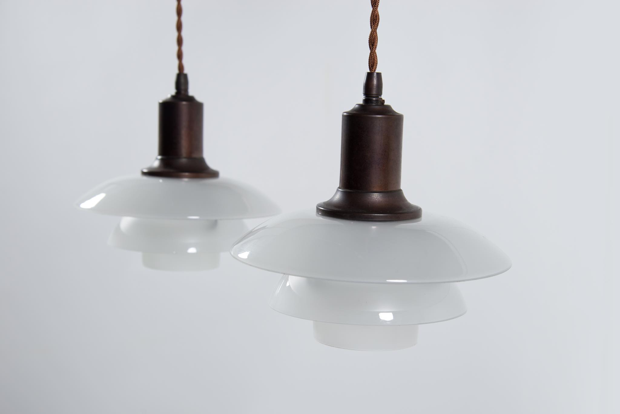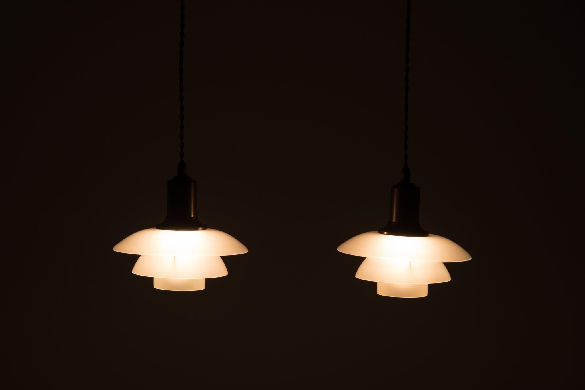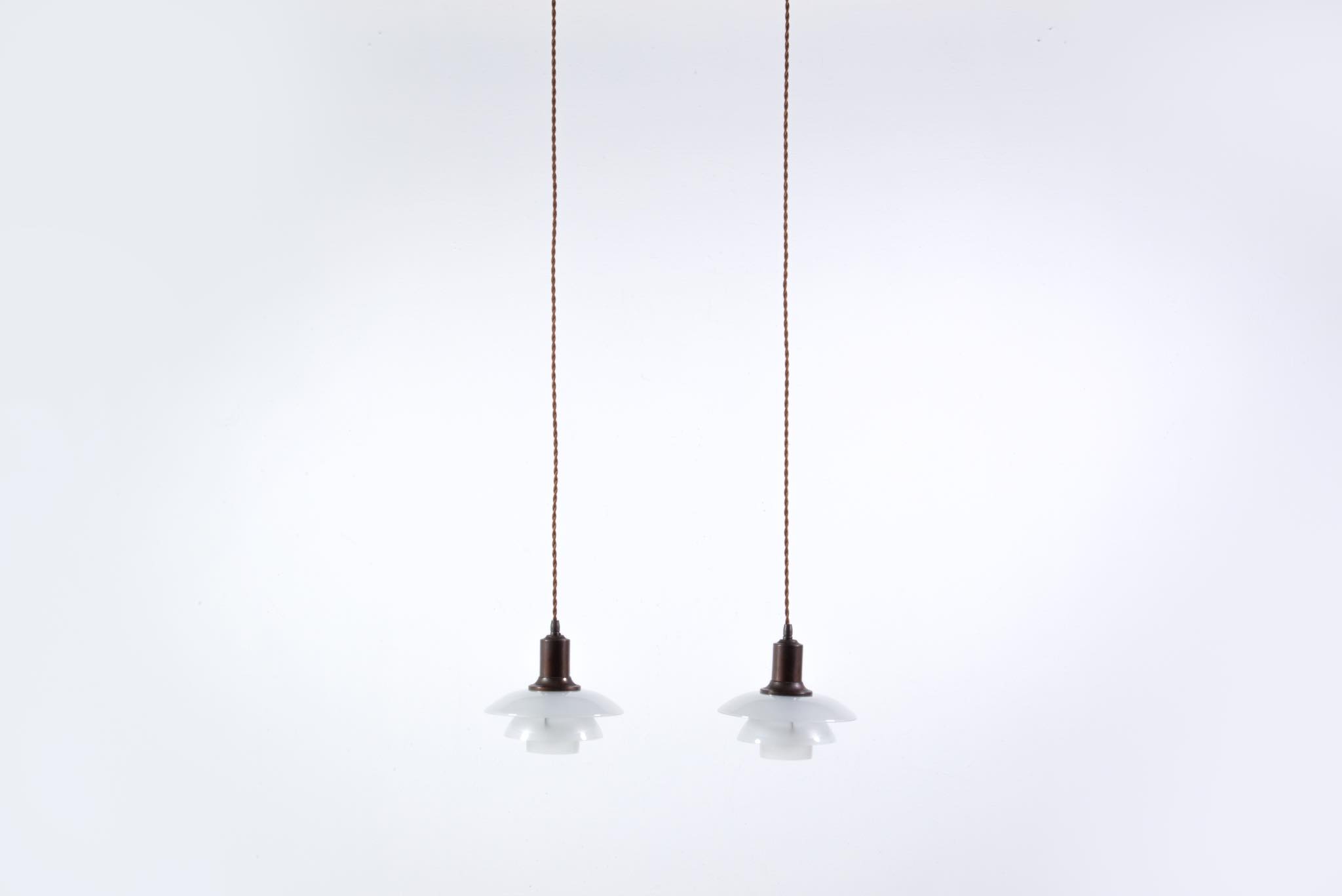 Poul Henningsen/ポール・ヘニングセンによってデザインされた、PH2/2ペンダントランプ一対です。1931年に発表されたモデルで、こちらはその頃に作られたものでしょう。銅製のソケットハウスにフロストガラスのシェードが伴います。綺麗な状態を保っており、配線などの消耗部品は新しいものに交換済みです。こちらは一対での販売となります。